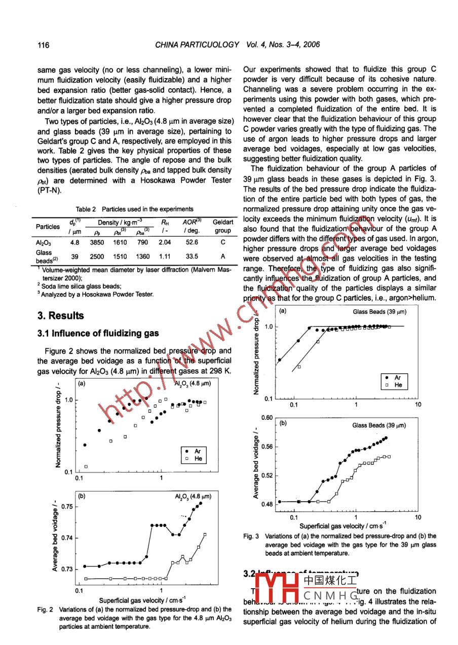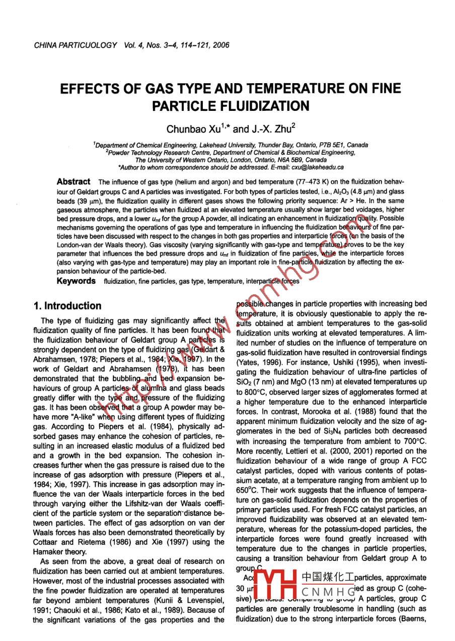 CHINA PARTICUOLOGY Vol 4. Nos 3-4 114-121, 2006EFFECTS OF GAS TYPE AND TEMPERATURE ON FINEPARTICLE FLUIDIZATIONChunbao xu'. and J -xZhuDepartment of Chemical Engineering, Lakehead University, Thunder Bay Ontario, P78 5E1, CanadaTechnology Research Centre, Department of Chemical&tem Ontario, London, ontario, N6AAuthor to whom correspondence should be addressed. E-mail.Abstract The influence of gas type(helium and argon) and bed temperature(77-473 K)on the fluidization behav-iour of Geldart groups C and A particles was investigated. For both types of particles tested, i. e, Al O3(4.8 um) and glassbeads(39 um), the fluidization quality in different gases shows the following priority sequence: Ar He. In the samegaseous atmosphere the particles when fluidized at an elevated temperature usually show larger bed voidages, higherbed pressure drops, and a lower umt for the group A powder, all indicating an enhancement in fluidization quality Possibleechanisms governing the operations of gas type and temperature in influencing the fluidization behaviours of fine particles have been discussed with respect to the changes in both gas properties and interparticle forces(on the basis of theLondon-van der Waals theory). Gas viscosity (varying significantly with gas-type and temperature)proves to be the keyparameter that influences the bed pressure drops and Umm in fluidization of fine particles, while the interparticle forces(also varying with gas-type and temperature)may play an important role in fine-particle fluidization by affecting the ex-pansion behaviour of the particle-bedKeywords fluidization, fine particles, gas type, temperature, interparticle forces1. Introductionpossible changes in particle properties with increasing bedtemperature, it is obviously questionable to apply the re-The type of fluidizing gas may significantly affect the sults obtained at ambient temperatures to the gas-solidfluidization quality of fine particles. It has been found that fluidization units working at elevated temperatures. a lim-the fluidization behaviour of Geldart group A particles is ited number of studies on the influence of temperature onstrongly dependent on the type of fluidizing gas(Geldart& gas-solid fluidization have resulted in controversial findingsAbrahamsen, 1978; Piepers et a., 1984;Xie, 1997). In the (Yates, 1996). For instance, Ushiki(1995). when investi-work of Geldart and Abrahamsen (1978), it has beengating the fluidization behaviour of ultra-fine particles ofdemonstrated that the bubbling and bed expansion be- SiO2(7 nm)and Mgo(13 nm)at elevated temperatures uphaviours of group A particles of alumina and glass beads to 800C, observed larger sizes of agglomerates formed atgreatly differ with the type and pressure of the fluidizing a higher temperature due to the enhanced interparticlegas. It has been observed that a group A powder may be- forces. In contrast, Morooka et al. (1988)found that thehave more"A-like"when using different types of fluidizinggas. According to Piepers et al. (1984), physically ad- apparent minimum fluidization velocity and the size of ag-sorbed gases may enhance the cohesion of particles, re- glomerates in the bed of SiNa particles both decreasedsulting in an increased elastic modulus of a fluidized bed with increasing the temperature from ambient to 700Cand a growth in the bed expansion. The cohesion in. More recently, Lettieri et al. (2000, 2001)reported on thecreases further when the gas pressure is raised due to thefluidization behaviour of a wide range of group A FCCincrease of gas adsorption with pressure(Piepers et al., catalyst particles, doped with various contents of potas1984: Xie, 1997). This increase in gas adsorption may in-sium acetate, at a temperature ranging from ambient up tofluence the van der Waals interparticle forces in the bed 650C. Their work suggests that the influence of tempera-through varying either the Lifshitz-van der Waals coeff- ture on gas-solid fluidization depends on the properties ofcient of the particle system or the separatio distance be. primary particles used. For fresh FCC catalyst particles, anWaals forces has also been demonstrated theoretically by perature, whereas for the potassium-doped particles, theCottaar and Rietema(1986)and Xie(1997)using the interparticle forces were found greatly increased withHamaker theorytemperature due to the changes in particle properties,As seen from the above, a great deal of research on causing a transition behaviour from Geldart group a touidization has been carried out at ambient temperatures. grouHowever, most of the industrial processes associated with中國(guó)煤化工 particles, approximatethe fine powder fluidization are operated at temperatures 30CNMH Ged as group C(cohe-far beyond ambient temperatures(Kunii& Levenspiel, sive)pHHuI y w y uup a particles, group1991: Chaouki et al., 1986; Kato et al., 1989). Because of particles are generally troublesome in handling(suchthe significant variations of the gas properties and the fluidization)due to the strong interparticle forces (Baerns,Xu& Zhu: Effects of Gas Type and Temperature on Fine Particle Fluidization1151966: Chaouki et al. 1985: Pacek& Nienow, 1990: Ushiki periments it needs to be noted here that a small-diameter1995: Horio et alOn the other hand, because of and shallow fluidized bed is employed in this work, al-the high surface-area to volume ratio and other special though much wider and deeper beds are commonly usedcharacteristics, these group C particles are very attractive in other fluidization work. In the earlier work such as byin the chemical industry and other industries such as ad. Rowe et al. ( 1978), mostly much larger particles were usedvanced materials, food and pharmaceuticals. So far how- and the study was mainly on bubbling behaviors in the bedever, little attention has been paid on the influence of the where enough bed height must be provided to allow thetype of fluidizing gas and bed temperature on the fluidiz