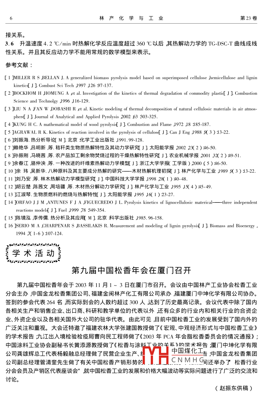 第23卷第4期林產(chǎn)化學(xué)與工業(yè)Vol 23 No2003年12月Chemistry and Industry of Forest ProductsDec.2003生物質(zhì)熱解動力學(xué)的研究蔣劍春,沈兆邦〔中國林業(yè)科學(xué)研究院林產(chǎn)化學(xué)工業(yè)研究所,江蘇南京210042)JIANGJC摘要:對木屑在不同的升溫速度下的熱解反應(yīng)動力學(xué)進行了研究。測試結(jié)果表明不同的升溫速度使生物質(zhì)的熱解反應(yīng)機理和過程發(fā)生了變化。在4.2和40℃/min的升溫速度下兩者反應(yīng)的TG-DSCT曲線有相似之處均岀現(xiàn)明顯的吸熱峰而在390℃以后升溫速度為4.2℃/min時熱解反應(yīng)動力學(xué)模型已經(jīng)不能用傳統(tǒng)的數(shù)學(xué)模型表示其反應(yīng)速率與升溫速度顯示了一個線性關(guān)系。40℃/min升溫速度時在3854φ0℃拐點范圍內(nèi)亦不能用通常使用的數(shù)學(xué)模型公式描述在490~700℃的范圍內(nèi)用數(shù)學(xué)模型可以表示,且線性回歸的相關(guān)性很好。其反應(yīng)活化能為29.53kJ/mol,大大低于人們通常試驗的數(shù)據(jù)(一般為70110 kI/mol)。10和20℃/min的升溫速度時其熱解反應(yīng)TG-DSC-T曲線相近且它們的反應(yīng)動力學(xué)數(shù)學(xué)模型基本符合傳統(tǒng)的表示方法。研究表明不同升溫速度決定了反應(yīng)的過程。研究結(jié)果可以推論快速熱解反應(yīng)的機理將不同于人們通常描述的步騾進行相應(yīng)的反應(yīng)活化能這一重要的物理參數(shù)會發(fā)生很大變化關(guān)鍵詞:生物質(zhì)熱解動力學(xué)中圖分類號Q351.2文獻標識碼文章編號0253-24172003)4-0001-06STUDY ON REACTION KINETICS OF BIOMASS PYROLYSISJIANG Jian-chun, shen Zhao-bangInstitute of Chemical Industry of Forest Products CAF Nanjing 210042 hinaAbstract: This paper deals with the test results of the study on the reaction kinetics of sawdust pyrolysis Under thedition of different temperature rising rate the reaction mechanism and process of biomass pyrolysiFor temperature rising rate of 4. 2 and 40C/min both TG-DSC-T curves are similar in their endothermal peaks. Fortemperature rising rate of 4. 2C/min over 390C chemical reactid by traditionalmathematical model and the reaction rate appears to be in a linear relation with reaction temperature. For heating rateof 40C/min within the scope of turning point( at 385-490C the reaction kinetics also can not be expressed withthe mathematical model formula used usually. However for reaction temperature in the scope of 490-700C the reac-tion kinetics can be expressed by mathematical model with very good correlation of linear regression, The reaction activation energy of E =29. 53 kJ/ mol is greatly lower than the data of the usual trial generally E=70-110 kJ/molFor temperature rising rate of 10 and 20 C/min both TG-DSC-T curves of pyrolysis reaction are similar and theirreaction kinetics mathematical models comform to the traditional expression method basically. These research resultsdicated that different heating rates detere the processhe deduced from test results that themechanism and process of fast pyroleaction are differer中國煤化工 lysis react,andorrespondingly the reaction activation energy an important phyYHCNMHGchange significantlyKey words biomass pyrolysis reaction kinetics*收稿日期2003-06-1作者簡介蔣劍春(1955-)男江蘇溧陽人研究員博士從事林產(chǎn)化學(xué)加工研究。產(chǎn)化學(xué)與工業(yè)生物質(zhì)熱解動力學(xué)是表征生物質(zhì)在熱分解反應(yīng)過程中反應(yīng)溫度、反應(yīng)時間等參數(shù)對物料或反應(yīng)產(chǎn)物轉(zhuǎn)化率的影響的一個十分重要的特性。動力學(xué)特性直接關(guān)系到生物質(zhì)熱化學(xué)利用。通過動力學(xué)分析可深入地了解反應(yīng)過程或機理還可預(yù)測反應(yīng)速率以及反應(yīng)的難易程度。生物質(zhì)是由纖維素、半纖維素和木質(zhì)素組成,它們的熱解過程十分復(fù)雜往往在進行動力學(xué)和熱解機理研究時需要進行一些假設(shè)將復(fù)雜的物理過程用較明了的動力學(xué)模型來表示。國內(nèi)外學(xué)者在生物質(zhì)熱解機理、反應(yīng)動力學(xué)和應(yīng)用技術(shù)方面做了大量的研究工作131Kung等對木材的熱解過程進行了理論研究采用一級反應(yīng)動力學(xué)的假設(shè)實驗計算得出數(shù)學(xué)模型。Klose等對山毛櫸和落葉松木材用鋅、鎂、鈣等金屬乙酸鹽預(yù)處理用熱重儀硏究了其熱解過程催化劑對熱解行為的影響并實驗確定相應(yīng)的動力學(xué)參數(shù)。 Janez等研究了木片在固定床氣化反應(yīng)器中氣化床層高度對氣體中CO和CO2組分的影響因素。 Kulla等研究了木屑的熱解動力學(xué)木屑進行熱化學(xué)分解的溫度為250~450℃反應(yīng)活化能大約在111~68.7kJ/mol。我國在非等溫動力學(xué)的研究方面起步較晚直到1980年前后才出現(xiàn)這方面的綜述文獻報道6]有關(guān)生物質(zhì)熱解和氣化動力學(xué)的研究工作更晚直至20世紀90年代才開始有少量的文獻報道11華南理工大學(xué)對幾種南方典型產(chǎn)品加工剩余物進行了工業(yè)分析和干燥、熱解實驗研究得到不同溫度下隨時間變化的失重曲線圖擬合岀相應(yīng)的干燥、熱解動力學(xué)曲線得到干燥、熱解反應(yīng)動力學(xué)參數(shù)。胡云楚等人3研究了木材熱解動力學(xué)分別研究和測定了在特定的升溫速度下木材的TG曲線并測定計算了熱解動力學(xué)參數(shù)。江叔琴等對4種生物質(zhì)原料的熱解過程進行了實驗研究,認為生物