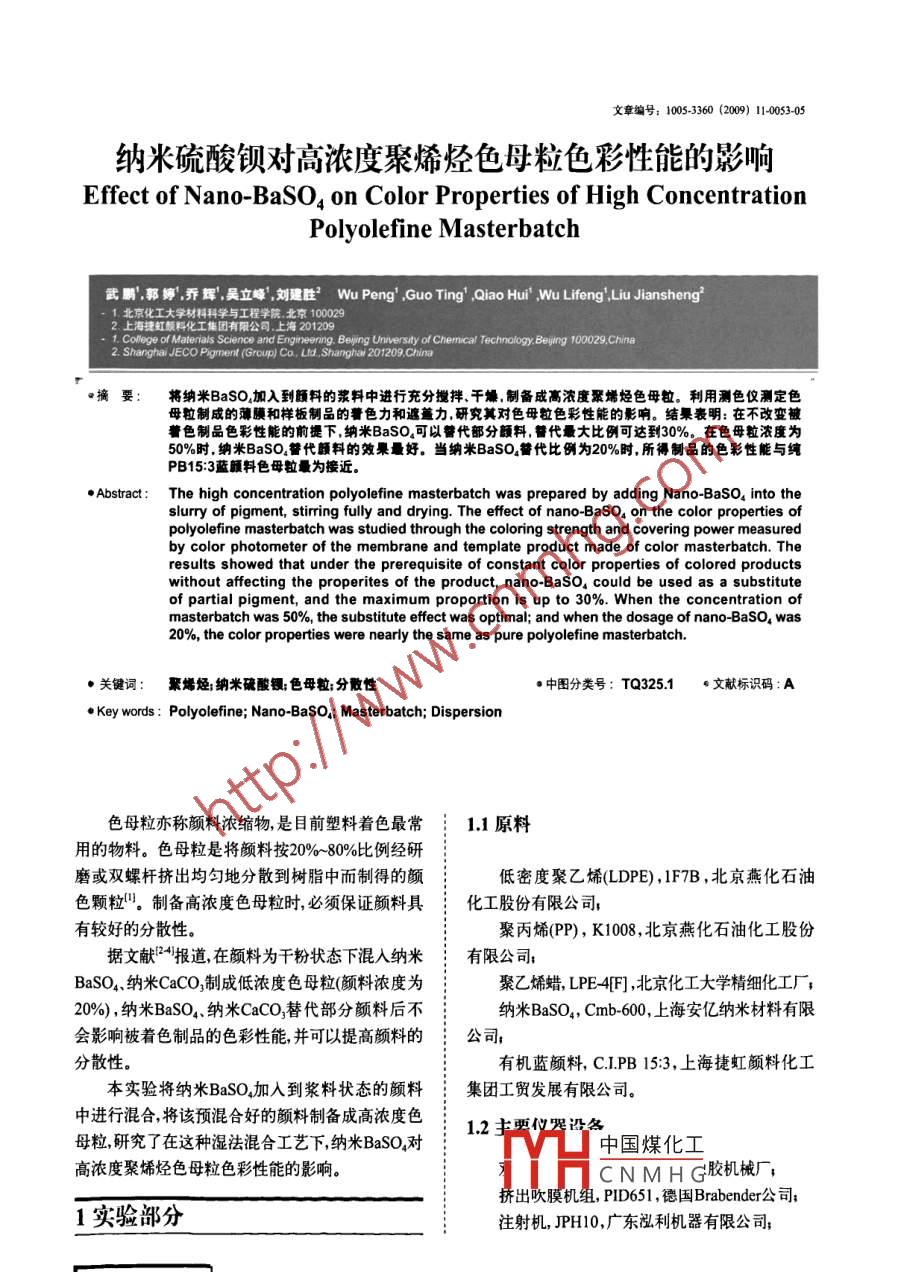 文章編號:1005-3360(2009)11005305納米硫酸鋇對高濃度聚烯烴色母粒色彩性能的影響Effect of Nano-BaSO4 on Color Properties of High ConcentrationPolyolefine masterbatch武鵬郭婷,喬輝,吳立峰劉建勝2 Wu Peng’, Guo Ting, Qiao Hui, Wu Lifeng', Liu Jiansheng2京化工大學(xué)材料科學(xué)與工程lege of Materials Science and Engineenng. Beyrng University of Chemical Technology. Bejing 100029. China2. Shanghai JECO Pigment (Group) Co. Ltd. Shanghal 201209, China將納米Baso加入到額料的漿料中進行充分?jǐn)嚢韪杀?制備成高濃度聚烯烴色母粒。利用測色儀測定色母粒制成的薄膜和樣板制品的著色力和遽力,研究其對色母粒色彩性能的影響。結(jié)果表明:在不改變被著色制品色彩性能的前提下,納米BaSO4可以譬代部分顏料,代最大比例可達到30%。在色母粒濃度為50%時,納米BaSO替代顏料的效果最好。當(dāng)納米BaSO替代比例為20%時,所得制品的色彩性能與純PB15:3藍顧料色母粒最為接近Abstract: The high concentration polyolefine masterbatch was prepared by adding Nano-BaSo into theslurry of pigment, stirring fully and drying. The effect of nano-Basoa on the color properties ofpolyolefine masterbatch was studied through the coloring strength and covering power measuredby color photometer of the membrane and template product made of color masterbatch. Theresults showed that under the prerequisite of constant color properties of colored productswithout affecting the properites of the product, nano- Baso, could be used as a substituteof partial pigment, and the maximum proportion is up to 30%. when the concentration of20%, the color properties were nearly the same as pure polyolefine masterbatch nano-BaSo, wasmasterbatch was 50%, the substitute effect was optimal; and when the dosage of關(guān)鍵詞:聚烯烴;納米硫酸鋇色母粒;分散性中圖分類號:TQ325.1·文獻標(biāo)識碼:Ae Key words: Polyolefine; Nano-BaSO4: Masterbatch; Dispersion色母粒亦稱顏料濃縮物是目前塑料著色最常11原料用的物料。色母粒是將顏料按20%~80%比例經(jīng)研磨或雙螺杄擠岀均勻地分散到樹脂中而制得的顏低密度聚乙烯LDPE),F7B,北京燕化石油色顆粒叫。制備高濃度色母粒時,必須保證顏料具化工股份有限公司有較好的分散性聚丙烯(PP),K1008,北京燕化石油化工股份據(jù)文獻2“報道在顏料為干粉狀態(tài)下混入納米:有限公司BaSO4納米CaCO3制成低濃度色母粒(顏料濃度為;聚乙烯蠟LPE4F],北京化工大學(xué)精細化工廠;20%),納米BaSO4、納米CaCO替代部分顏料后不:納米BaSO,Cmb-600,上海安億納米材料有限會影響被著色制品的色彩性能,并可以提高顏料的:公司分散性。有機藍顏料,CIPB15:3,上海捷虹顏料化工本實驗將納米BaSO加入到漿料狀態(tài)的顏料集團工貿(mào)發(fā)展有限公司中進行混合將該預(yù)混合好的顏料制備成高濃度色1.2主要似凸各母粒硏究了在這種濕法混合工藝下,納米BaSO2對中國煤化工高濃度聚烯烴色母粒色彩性能的影響。CNMHG膠機械廠擠出吹膜機組,PID651,德國 Brabender公司實驗部分注射機,JPH0,廣東泓利機器有限公司;毫悟把070分光光度計,722,上海精密儀器廠測試;并直接用注射樣板在測色儀上進行著色力、積分球式測色儀, Color i5,愛色麗有限公司反射率測試。1.3實驗步驟2結(jié)果與討論首先,將納米BaSO按照色母粒配方(表1)定量加入到顏料的漿料中高速攪拌1h,經(jīng)抽濾干燥后色彩性能是色母粒有別于其他功能母粒最重粉碎,用于制備高濃度聚烯烴色母粒。色母粒的制:要的性能可以通過研究其制品的遮蓋力、反射率備實驗工藝流程如圖1所示。L、a、b‘值及色差等指標(biāo)對色彩性能做出較為全載體樹脂擠出吹膜→遮蓋力面的評價圓料十區(qū)輥造注射樣板→色彩性21納米BaSO對溥膜透光率的影響份散劑▲田1色母粒制備工藝流透光率反映薄膜的透光能力透光率越大薄Fig. 1 The process of preparaton of color masterbatch膜的透光能力越強,薄膜中顏料的遮蓋力就越低。用雙輥塑煉機將含有不同比例納米BaSO的氵薄膜的透光率越小薄膜中顏料的遮蓋力就越好。顏料按配方制備色母粒。雙輥塑煉機溫度保持:圖2為不同比例納米BSO替代顏料制成薄膜的透在105℃左右,首先加入載體樹脂混合2~3min,均光率。勻分散后加入分散劑,混合3min左右,加入顏料,8min左右后收料并用剪刀將物料剪成粒狀制得氵色母粒。其中色母粒中顏料和BaSO的總含量為40%(1)和50%(2)。具體配方如表所示▲豪1制備色母粒實驗配方Tab. 1 The formula of preparation of color masterbatch分散劑顏料Bas050400450500506006070波長/m00000000862080502468(a)1配方00000400004000125(b)2配方1一不加BaSO:2替代10%:3替代20%:4—替代30%▲圖2不同比例納米BaSO管代服料對原透光率的影響注:用納米BaSO分別替代5%、10%、15%、20%、25%、30%的顏料ig. 2 The effect of different ratio nano-Baso, on the hght transmittance將制好的色母粒分別加入到150gPE中吹膜,由圖(a)可以看出,納米BaSO替代比例為使薄膜中顏料和納米BaSO4總含量為1%10%的薄膜透光率略低于純PB15:3藍膜的透光率,將制好的色母粒分別加入到150gPP中注射樣:其他比例均高于PB5:3藍膜的透光率板使樣板中顏料和納米BaSO總含量為04%。中國煤化工比例為30%薄膜透14性能測試光CNMHG率其他替代比例下膜透光率均低十純PB5:3膜的透光率用分光光度計對吹塑薄膜進行透光率、遮蓋率22納米BaSO4對薄膜遮蓋力的影響B(tài)aSO的加入可以有效地改善色母粒中顏料的分:散性,從而使薄膜的透光率下降,光密度值提髙。對制備色母粒而言顏料分散的