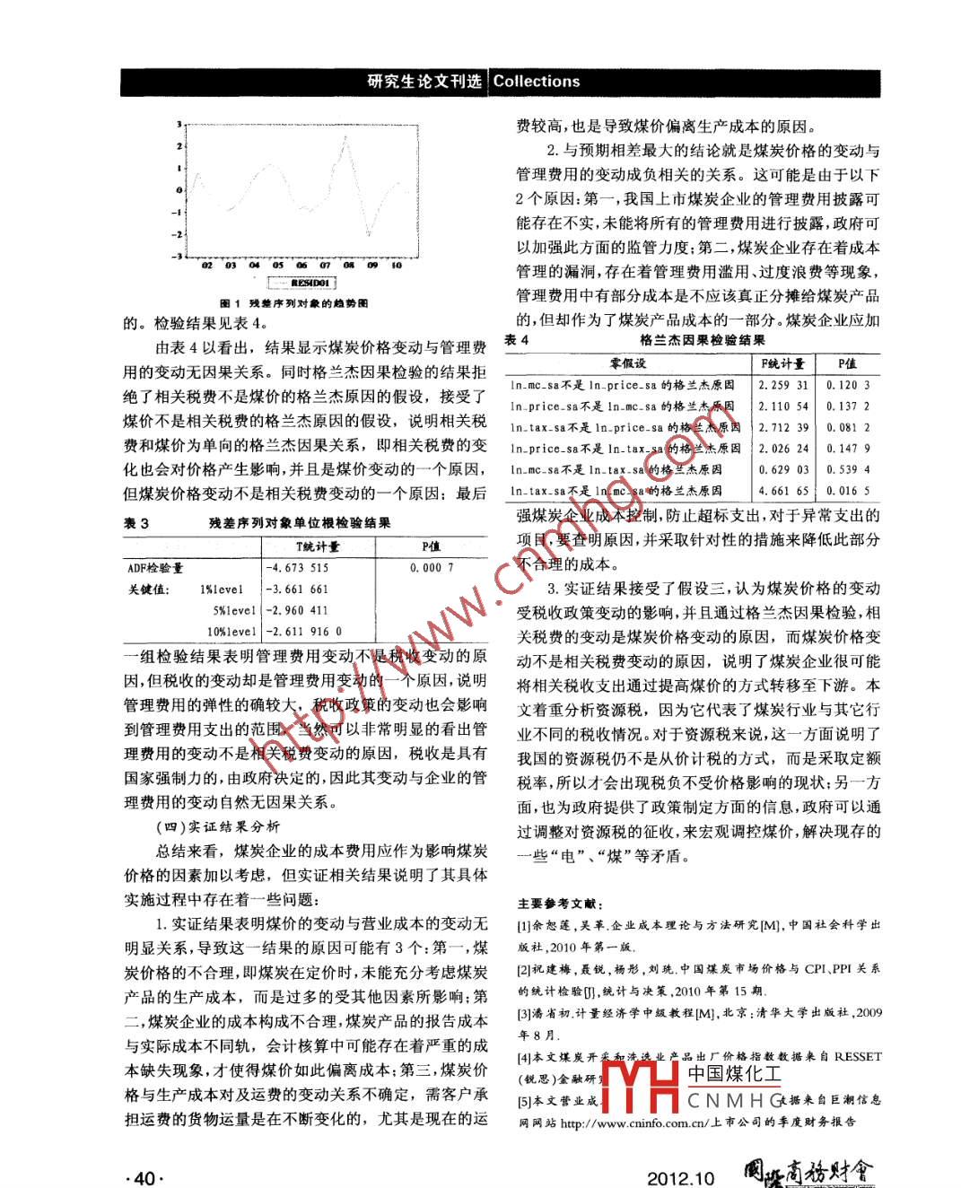 研究生論文刊選Collections本費(fèi)用變動(dòng)與煤價(jià)變動(dòng)情況之間關(guān)系,也可作為非上表130家樣本公司表市股份公司的研究典范,從而為煤炭企業(yè)成本核算、國股票代碼|股栗簡(jiǎn)稱股票代碼股票簡(jiǎn)稱000159國際實(shí)業(yè) 16 600403大有能源家的宏觀政策、煤炭企業(yè)自身成本管理提供決策參考。000552靖遠(yuǎn)煤電| 1600408安泰集團(tuán)(一)樣本的選擇000723美錦能源600508上海能源煤炭行業(yè)是指從事煤田地質(zhì)勘探、設(shè)計(jì)、基本建000835 ,,四川圣達(dá)J600546山煤國際設(shè)、生產(chǎn)、設(shè)備制造、采購銷售以及其他與煤炭相關(guān)的000933神火股份I600652愛使股份科研、教育、檢測(cè)鑒定等活動(dòng)的企事業(yè)單位統(tǒng)稱四。本文000937冀中能源F600971恒源煤電的樣本期間涵蓋了2000年6月~2011年6月所有季000968煤氣化2600997開 灤股份度報(bào)告,樣本公司取自我國滬、深兩市所有的煤炭行業(yè)000983西山煤電 2601001大同煤業(yè)002128露天煤業(yè)601699潞 安環(huán)能上市公司。在初步選擇樣本公司后,本文剔除了一些煤600121鄭州煤電1601088中國神華炭行業(yè)的上市公司:第- ,剔除了ST公司,因?yàn)榇蠖鄶?shù)1 600123蘭花科創(chuàng)1 26 601666 平 煤股份ST.上市公司和一般的公司相比,因財(cái)務(wù)狀況和業(yè)績(jī)較2 600188 兗州煤業(yè)27 601898| 中煤能源差而不具代表性,且該類上市公司容易出現(xiàn)財(cái)務(wù)狀況600348601918國投新集或其他狀況異常:第二,剔除了部分?jǐn)?shù)據(jù)缺失、數(shù)據(jù)無14 T 600395 盤江殷份 I 29 002068 黑貓股份法獲得的上市公司:第三,考忠煤炭企業(yè)的上市時(shí)間跨600397安源股份30 600780通寶能源度,剔除剛上市的煤炭企業(yè),保證能實(shí)現(xiàn)本文對(duì)煤炭企殊性,煤炭市場(chǎng)價(jià)格的季度變動(dòng)難以獲得,本文的煤炭業(yè)長期狀態(tài)的研究,具體結(jié)果如表1所示:市場(chǎng)價(jià)格由《2011年中國統(tǒng)計(jì)年鑒》的分行業(yè)工業(yè)品(二)數(shù)據(jù)來源及預(yù)處理出廠價(jià)格指數(shù)中的煤炭開采和洗選業(yè)產(chǎn)品出廠價(jià)格指本文數(shù)據(jù)來源主要通過國泰安CSMAR金融經(jīng)濟(jì)數(shù)數(shù)代表,通過對(duì)月度數(shù)據(jù)處理后得到煤炭?jī)r(jià)格相對(duì)上據(jù)庫、RESSET (銳思)金融研究數(shù)據(jù)庫和巨潮信息網(wǎng)網(wǎng)年該季度的季度變動(dòng)情況。其中,營業(yè)成本包括材料、站;所使用的數(shù)據(jù)處理和分析軟件包括EXCEL、E-工資、電力、折舊、井巷 、維簡(jiǎn)、修理費(fèi)、塌陷費(fèi)、安全生VIEWS6. 0等,其中,基本數(shù)據(jù)由EXCEL軟件處理,平穩(wěn)產(chǎn)費(fèi)用等;管理費(fèi)用主要包括職工薪酬社保及福利費(fèi),性檢驗(yàn)、格蘭杰因果檢驗(yàn)以及協(xié)整回歸模型的建立等差旅 、辦公、會(huì)議及招待費(fèi),攤銷、租賃費(fèi)等。營業(yè)稅金使用EVIEWS6. 0統(tǒng)計(jì)軟件。及附加主要核算企業(yè)經(jīng)營活動(dòng)發(fā)生的營業(yè)稅、消費(fèi)稅、煤炭?jī)r(jià)格應(yīng)與煤炭產(chǎn)品的生產(chǎn)成本息息相關(guān),其城市維護(hù)建設(shè)稅、資源稅和教育費(fèi)附加等相關(guān)稅費(fèi).營中營業(yè)成本代表了產(chǎn)品的主要制造成本,且在成本費(fèi)業(yè)成本、管理費(fèi)用、相關(guān)稅費(fèi)的數(shù)據(jù)來自上市公司的季用中,大部分是可以追溯至煤炭產(chǎn)品,形成營業(yè)成本度財(cái)務(wù)報(bào)告,計(jì)算得到每個(gè)季度期間的營業(yè)成本、管理的;余恕蓮(2010)指出煤炭企業(yè)的期間費(fèi)用中,管理費(fèi)用、營業(yè)稅金及附加的金額相對(duì).上年該季度期間的費(fèi)用和財(cái)務(wù)費(fèi)用占了主要的部分。由于財(cái)務(wù)費(fèi)用變動(dòng)變動(dòng)情況。不是很大,本文著重分析管理費(fèi)用,且管理費(fèi)用支出的為了消除時(shí)間序列中季節(jié)變動(dòng)因素,顯示出序列大小,直接影響著煤炭企業(yè)的經(jīng)濟(jì)效益,可以衡量出一潛 在的趨勢(shì)循環(huán)分量,較真實(shí)反映經(jīng)濟(jì)時(shí)間序列的客個(gè)煤炭企業(yè)成本控制水平的高低:目前我國礦山企業(yè)觀規(guī)律 ,本文應(yīng)用eviews6軟件,采用Census X12 方應(yīng)繳的稅費(fèi)主要包括增值稅、所得稅、資源稅和礦產(chǎn)資法對(duì)price,oc,mc及tax進(jìn)行季節(jié)調(diào)整,分別記為源補(bǔ)償費(fèi)。其中,增值稅和資源稅占據(jù)了主要部分,且price_ sa,oc_ sa,mc_ sa,tax_ sa同時(shí),為了消除數(shù)據(jù)資源稅是煤炭行業(yè)有別于其他行業(yè)的稅收,故營業(yè)稅的異 方差性,本文對(duì)經(jīng)過季節(jié)調(diào)整的數(shù)據(jù)再取對(duì)數(shù),分金及附加的變動(dòng)可以反映出我國煤炭行業(yè)的相關(guān)稅收別記為 1n price_ sa,1n. _oc_ sa,In _mc sa,ln tax. sa.政策變動(dòng)情況。本文涉及的變量為:煤炭市場(chǎng)價(jià)格變動(dòng)(簡(jiǎn)記為二、研究假設(shè)price).營業(yè)成本變動(dòng)(簡(jiǎn)記為oc)、管理費(fèi)用變動(dòng)本文通過探空媒歲價(jià)格夯動(dòng)與我國煤炭企業(yè)成本(簡(jiǎn)記為mc)、相關(guān)稅費(fèi)變動(dòng)(簡(jiǎn)記為tax)。選取了費(fèi)用變動(dòng)之間中國煤化工于煤炭行業(yè)相.2000