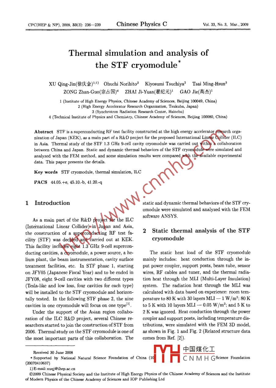 CPC(HEP & NP), 2009, 33(3): 236- -239Chinese Physics CVol. 33, No. 3, Mar., 2009Thermal simulation and analysis ofthe STF cryomodule'XU Qing Jin(徐慶金)") Ohuchi Norihito2 Kiyosumi Tsuchiya2Tsai Ming-Hsun3ZONG Zhan-Guo(宗占因)4 ZHAI Ji-Yuan(翟紀(jì)元) GAO Jie(高杰)'1 (Institute of High Energy Physics, Chinese Academy of Sciences, Beiing 100049, China)2 (High Energy Accelerator Research Organization, Tsukuba, Japan)3 (Synchrotron Radiation Research Center, Hsinchu)4 (Technical Intitute of Physics and Chemistry, Chinese Academy of Sciences, Beijing 10080, China)Abstract STF is a superconducting RF test facility constructed at the high energy accelerator research orga-nization of Japan (KEK), as a main part of a R&D project for the proposed International Linear Collider (LC)in Asia. Thermal study of the STF 1.3 GHz 9-cell cavity cryomodule was carried out within a collaborationbetween China and Japan. Static and dynamic thermal behaviors of the STF cryomodule were simulated andanalyzed with the FEM method, and some simulation results were compared with the available experimentaldata. This paper presents the details.Key words STF cryomodule, thermal simulation, ILCPACS 44.05.+e, 45.10.-b, 41.20.-q1 Introductionstatic and dynamic thermal behaviors of the STF cry-omodule were simulated and analyzed with the FEMAs a main part of the R&D project for the ILCsoftware ANSYS.(International Linear Collider) in Japan and Asia,2 Static thermal analysis of the STFthe construction of a superconducting RF test fa-cility (STF) was decided and carried out at KEK.cryomoduleThis facility includes eight 1.3 GHz 9-cell supercon-ducting cavities, a cryomodule, a power source, a he-The static heat load of the STF cryomodulelium plant, the beam instrumentation, cavity surfacemainly includes: heat conduction through the in-treatment facilities, etc. In STF phase 1, startingput power coupler, support posts, beam tube, sensoron JFY05 (Japanesc Fiscal Year) and to be endcd inwires, RF cables and tuner, and the thermal radia-JFY08, eight 9-cell cavities with two diferent types tion heat through the MLI (Multi-Layer Insulation)(Tesla-like and low loss, four cavities for cach type)system. The radiation heat through the MLI waswill be installed to the STF cryomodule and horizon-calculated with data based on experience: room tem-tally tested. In the fllowing STF phase 2, the nineperature to 80 K with 30 layers MLI- 1 W/m2; 80 Kcavities in onc cryomodule will focus on one typel1.to5 K with 10 layers MLI- 0.05 W/m2; and5K toUnder the support of the Asian region collabo-2 K was ignored. Hcat conduction through the powerration of the ILC R&D project, several Chinese re-coupler and support posts, including temperature dis-searchers started to join the construction of STF fromtributions, were simulated with the FEM 3D model,2006. Thermal study on the STF cryomodule is oneof as shown in Fig. 1 and Fig. 2 (Rclated structure datathe most important parts of this collaboration. Thecomes from Ref. [2).中國(guó)煤化工Received 30 June 2008●Supported by National Natural Science Foundation of China.MYHC N M H GScience Foundation(20070410637)1)E-mail: xuqj@ihep.c.cn@2009 Chinese Physical Society and the Institute of High Encrgy Physics of the Chinese Academy of Sciences and the Instituteof Modern Physics of the Chinese Academy of Sciences and IOP Publishing LtdNo. 3XU Qing Jin et al; Thermal simulation and analysis of the STF cryomodule_237AN,四=品Fig, 1. Static temperature field of 35 MV and 45 MV power couplers (Unit: K).281.893 .253.901225.912197.923169.934141.945113.95685.96757.97829. 989“(0.028 0.056 0.084 0112 0.140vertical dretion of the posts/mFig. 2. Static temperature field and temperature distribution along the vertical direction of the fixed post ofthe STF cryomodule (Unit: K).Figure 1 shows the static temperature fields of thepcrature variation along the vertical direction of the35 MV and 45 MV power couplers. For each coupler,posts is shown in Fig. 2.two thermal anchors (separately conncting with twoFigure 3 shows the static temperature distribu-radiation shields of the cryomodule) were added totions of the 5 K and 80 K radiation shields (with 1decrease the heat loads to the cryogenic system. Fopower coupler for each shield). The mass fow rate ofthe 35 MV coupler, the measured data of the roomhelium for the 5 K shield is 1 g/s, and the inlet tem-temperature, first thermal anchor tempcrature, sec-perature is 5 K. With a radiation heat fux of 0.05ond thermal anchor temperature and the cavity tem-W/m2, the simulation results show that the outletperature are 299 K, 83 K, 4.5 K and 2 K, respectively.temperature of the helium is about 5.25 K, and theWith these experimental data, and the ANSYS 3Dhot spot temperature of the shield (around the cou-model, the calculated heat loads of the coupler arepler port) is 5.91 K. For the 80 K shield, the mass2.41 W to the 80 K radiation shield, 1.08 W to the :flow of nitrogen is 1 g/s, and the inlet temperature(5 K) radiation shield and 0.03 W to the 2 K system.is 80 K. With the radiation heat fAux 1 W/m2, theIt is also found from the results that the copper coat-simulation result of the outlet temperature of the ni-ing with a thickness of only several microns at thetrogen is 86.8 K, and the hot spot temperature of theinner surface of the coupler plays a very importantshield (around the coupler port) is about 91.05 K.role in the heat conduction.A vacuum barrier structure was designed and fab-The materials of the support posts are G10 andricated to separate the vacuum of the cryomodule andstainless steel. From the upper side to the lower side,the valve box into two independent parts, to decreasethe posts are connected with the vacuum vessel, thethe vacuum failure possibility of the cryomodule (see80 K radiation shield, the 5 K radiation shield andFig.4). The materials of the barrier are stainless steelthe 2 K system. Fig. 2 shows the simulation results(SS316中國(guó)