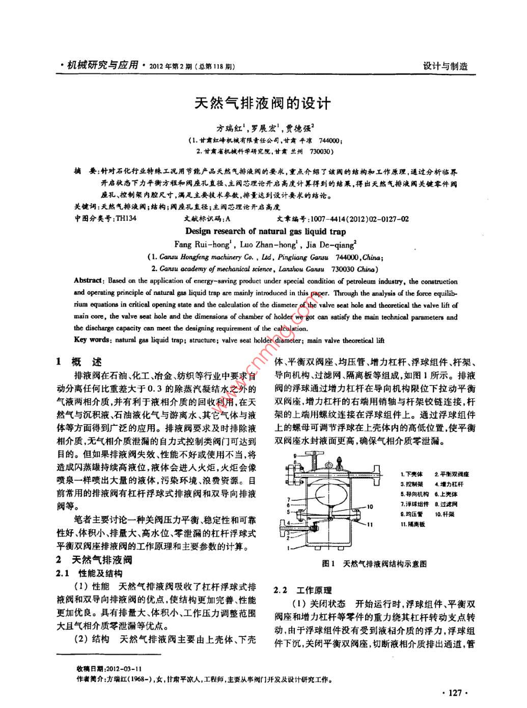 機(jī)械研究與應(yīng)用·2012年第2期(總第118期)設(shè)計(jì)與制造天然氣排液閥的設(shè)計(jì)方瑞紅!,羅展宏!,賈德強(qiáng)2(1.甘肅紅峰機(jī)械有限責(zé)任公司,甘肅平?jīng)?44000;2,甘肅省機(jī)械科學(xué)研究院,甘肅蘭州730030)摘要:針對(duì)石化行業(yè)特殊工況用節(jié)能產(chǎn)品天然氣排液閥的要求,重點(diǎn)介紹了該閾的結(jié)構(gòu)和工作原理,通過分析臨界開啟狀態(tài)下力平衡方程和閥座孔直徑、主閥芯理論開啟高度計(jì)算得到的蛄果,得出天然氣排液閥關(guān)鍵零件閥座孔、控制架內(nèi)腔尺寸,滿足主要技術(shù)參數(shù),神量達(dá)到設(shè)計(jì)要求的結(jié)論。關(guān)鍵調(diào):天然氣排液閥;結(jié)構(gòu);閥座孔直徑;主閥芯理論開啟高度中圖分類號(hào):TH34文獻(xiàn)標(biāo)識(shí)碼:A文拿編號(hào):1007-4414(2012)02-0127-02Design research of natural gas liquid trapFang Rui-hong, Luo Zhan-hong, Jia De-qiang(l. Cansu Hongfeng machinery Co., Ltd, Pingliang Gansu 744000, China2. Gansu academy of mechanical science, Lanzhou Cansu 730030 ChinaAbstract: Based on the application of energy-saving product under special condition of petroleum industry, the constructionperating principle of natural gas liquid trap are mainly introduced in this paper. Through the analysis of the foree equilib-rium equations in critical opening state and the calculation of the diameter of the valve seat hole and theoretical the valve lift ofmain core, the valve seat hole and the dimensions of chamber of holder we got can satisfy the main technical parameters andthe discharge capacity can meet the designing requirement of the calculation.Key words: natural gas liquid trap; structure; valve seat holder diameter; main valve theoretical lift1概述體、平衡雙閥座、均壓管、增力杠桿、浮球組件、桿架、排液閥在石油化工、冶金、紡織等行業(yè)中要求自導(dǎo)向機(jī)構(gòu)過濾網(wǎng)隔離板等組成,如圖1所示。排液動(dòng)分離任何比重差大于0.3的除蒸汽凝結(jié)水之外的閥的浮球通過增力杠桿在導(dǎo)向機(jī)構(gòu)限位下拉動(dòng)平衡氣液兩相介質(zhì)并有利于液相介質(zhì)的回收利用,在天雙閥座,增力杠桿的右端用銷軸與桿架鉸鏈連接,桿然氣與沉積液、石油液化氣與游離水、其它氣體與液架的上端用螺紋連接在浮球組件上。通過浮球組件體等方面得到廣泛的應(yīng)用。排液閥要求及時(shí)排除液上的螺母可調(diào)節(jié)浮球在上殼體內(nèi)的高低位置,使平衡相介質(zhì),無氣相介質(zhì)泄漏的自力式控制類閥門可達(dá)到雙閥座水封液面更高,確保氣相介質(zhì)零泄漏目的。但如果排液閥失效、性能不好或使用不當(dāng),將造成閃蒸罐持續(xù)髙液位,液體會(huì)進(jìn)入火炬,火炬會(huì)像噴泉一樣噴出大量的液體,污染環(huán)境浪費(fèi)資源。目1.下亮體2平雙閥3控制4增力杠桿前常用的排液閥有杠桿浮球式排液閥和雙導(dǎo)向排液5.導(dǎo)向機(jī)構(gòu)6上亮體閥等7浮球組件8過濾網(wǎng)筆者主要討論一種關(guān)閥壓力平衡穩(wěn)定性和可靠.均壓管10.軒架性好體積小排量大高水位、零泄漏的杠桿浮球式平衡雙閥座排液閥的工作原理和主要參數(shù)的計(jì)算天然氣排液閥1天然氣排液閥結(jié)構(gòu)示意圖2.1性能及結(jié)構(gòu)(1)性能天然氣排液閥吸收了杠桿浮球式排2.2工作原理液閥和雙導(dǎo)向排液閥的優(yōu)點(diǎn),使結(jié)構(gòu)更加完善性能()關(guān)閉狀態(tài)開始運(yùn)行時(shí),浮球組件、平衡雙更加優(yōu)良。具有排量大、體積小、工作壓力調(diào)整范圍閥座和增力杠桿等零件的重力繞其杠桿轉(zhuǎn)動(dòng)支點(diǎn)轉(zhuǎn)大且氣相介質(zhì)零泄漏等優(yōu)點(diǎn)。動(dòng),由于浮球組件沒有受到液相介質(zhì)的浮力,浮球組(2)結(jié)構(gòu)天然氣排液閥主要由上殼體、下殼件下沉,關(guān)閉平衡雙閥座切斷液相介質(zhì)排出通道管收稿日期:2012-03-11作者簡(jiǎn)介:方瑞紅(1968-),女,甘肅平?jīng)鋈?工程師,主要從事惻開發(fā)及設(shè)計(jì)研究工作。設(shè)計(jì)與制造2012年第2期(總第118期)·機(jī)械研究與應(yīng)用道內(nèi)的空氣或不凝結(jié)氣體及氣相介質(zhì)可通過均壓管到的凈浮力為流入總管,閥門處于關(guān)閉狀態(tài)。Q=Fr-G=(2)轉(zhuǎn)入開啟狀態(tài)液相介質(zhì)在閥內(nèi)開始聚集T(D-d)y隨著大量液相和氣相介質(zhì)通過過濾網(wǎng)、隔離板迅速流M(D'Y'-2Dy+ 2Dir)(3)入閥內(nèi)下殼體,在殼體內(nèi)兩相介質(zhì)自動(dòng)分離,氣相介質(zhì)通過均壓管流入總管,當(dāng)液面上升到一定高度時(shí),介質(zhì)作用在閥座上的壓力Q1為:浮球組件所受浮力大于浮球和增力杠桿等重力時(shí)上ltD升,通過增力杠桿在導(dǎo)向機(jī)構(gòu)限位下打開平衡雙閥座液相介質(zhì)通過閥座排出閥門處于排量排水狀態(tài)。式中:p為凝結(jié)水壓力,MPao(3)轉(zhuǎn)入關(guān)閉狀態(tài)殼體里的積液排出后,浮球因此,當(dāng)閥座處于臨界開啟狀態(tài)時(shí),對(duì)閥進(jìn)行受組件失去浮力下降,這時(shí)增力杠桿通過桿架、導(dǎo)向機(jī)力分析(見圖2),力平衡方程。Qn=Q1m(5)構(gòu)帶動(dòng)閥芯關(guān)閉閥座孔,閥門轉(zhuǎn)入關(guān)閉狀態(tài)。當(dāng)Qn>Q1m時(shí)閥門開啟。2.3分析若考慮計(jì)算杠桿重量,則上式為:10使用平衡雙閥座杠桿浮球排液閥,可通過增加排4 pm+G,k(6)水孔的流通面