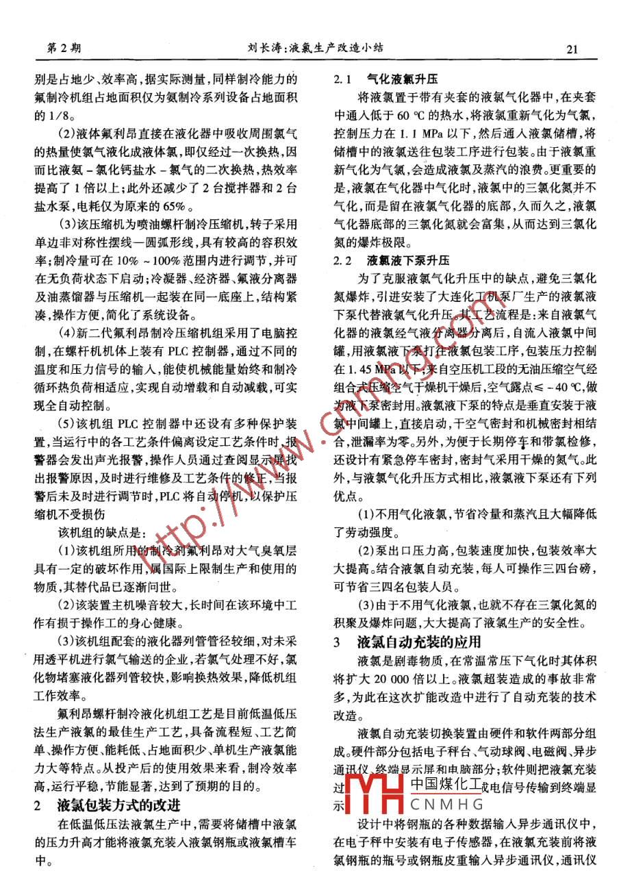 第2期中國氟堿202005年2月China Chlor-AlkalFeb.,2005液氯生產(chǎn)改造小結(jié)劉長濤(濟(jì)寧中銀電化有限公司,山東濟(jì)寧272121)摘要:介紹了液氣生產(chǎn)和充裝的技術(shù)改造情況,通過擴(kuò)產(chǎn)改造,提高了生產(chǎn)能力及效率,降低了生產(chǎn)成本。關(guān)鍵詞:液氯;氟利昂;冷凍鹽水;液下泵;自動充裝Summary on production innovation of liquid chlorine(Jining Zhongyin Electrochemical Co, Ltd, Jining 272121, China)Abstract: Technical innovation status of filling and liquid chlorine production was introduced. Afterxtending production and innovation, production capacity and efficiency were improved. Production costswere also reducedKey words: liquid chlorine; freon; chilled brine; submerged pump; automatic filling濟(jì)寧中銀電化有限公司已形成10萬t/a燒堿爆物質(zhì)NCl,影響安全生產(chǎn)。制冷周期較長,一般需生產(chǎn)能力,聯(lián)產(chǎn)氯氣達(dá)到8萬t/a以上。原有液氯裝要提前8h降溫。活塞式壓縮機(jī)維修工作量大,易損置已經(jīng)不能滿足生產(chǎn)需要,因此,決定對液氯工段進(jìn)件多,安全性差。行擴(kuò)能改造。改造主要有4個(gè)方面:用氟利昂螺桿式1.2氟利昂螺桿式氯氣液化機(jī)直接液化法生產(chǎn)液氯氯氣液化機(jī)直接液化法代替氨一氯化鈣鹽水間接冷制冷劑R-22在液化器內(nèi)吸收氯氣冷凝熱量凍法生產(chǎn)液氯;用液氯液下泵代替液氯氣化器包裝而蒸發(fā),氯氣被液化液化后的液氯通過氣液分離罐液氯自動充裝的運(yùn)用;大型槽車充裝站。分離后進(jìn)入液氯儲槽,通過液下泵將液氯輸送到液液氯生產(chǎn)方式的改進(jìn)氯包裝崗位進(jìn)行包裝供用戶使用,未被液化的尾氣1.1氨-氯化鈣鹽水間接冷凍法生產(chǎn)液氯稱為尾氯,在氯氣預(yù)冷器中與原氯進(jìn)行熱交換后,尾使用氨-氯化鈣鹽水間接冷凍法生產(chǎn)液氯,使氯進(jìn)入尾氯分配臺,再分配給各耗氯部門一鹽酸、高用設(shè)備為8ASJ-17和丿zKA20C-1型螺桿壓縮機(jī)純酸、漂粉精、氯化苯等部門使用。不斷蒸發(fā)后的氟各6臺,其中用氨(R717)作為制冷劑,用氯化鈣鹽咧昂過熱蒸氣由螺桿壓縮機(jī)吸入,壓縮后的氟利昂水作為載冷劑。-30~-35℃的鹽水通過鹽水泵輸蒸氣經(jīng)氟油分離器分離后進(jìn)入氟利昂冷卻器經(jīng)冷送到液氯工段的液化器,與來自氯干燥的氯氣在液卻后變成液氟進(jìn)入氟貯槽存放,從液氟貯槽出來F化器內(nèi)進(jìn)行熱交換使氯氣降溫至-25℃左右,大液氟分成2路,路經(jīng)膨脹閥進(jìn)入經(jīng)濟(jì)器冷卻吸人部分氯氣變成液氯進(jìn)入液氯貯槽,然后用液下泵將的過熱氟蒸氣,另一路液氟通過氟經(jīng)濟(jì)器的蛇管被液氯輸送到液氯包裝崗位進(jìn)行鋼瓶或槽車充裝,供節(jié)流閥截留冷卻后進(jìn)入氯氣液化器,吸收用戶使用。過氯氟中國煤化工夜體氯,自身氣化為氣該工藝的缺點(diǎn)是采用氯化鈣鹽水作為冷媒,經(jīng)CNMH1個(gè)制冷循環(huán)。過二次傳熱,加上管路上的冷量損失和熱量損失較該機(jī)組的優(yōu)點(diǎn)是:大。裝置結(jié)構(gòu)龐大,設(shè)備多,占地面積大,不適合生產(chǎn)(1)該機(jī)組與用氨作為制冷劑的8ASJ-17活塞的發(fā)展。鹽水腐蝕性較大液化器腐蝕泄露會生成易縮機(jī)以及JZKA-20C螺桿壓縮機(jī)相比,最大的區(qū)第2期劉長濤:液氯生產(chǎn)改造小結(jié)21別是占地少、效率高,據(jù)實(shí)際測量,同樣制冷能力的2.1氣化液氯升壓氟制冷機(jī)組占地面積僅為氨制冷系列設(shè)備占地面積將液氯置于帶有夾套的液氯氣化器中,在夾套的1/8中通入低于60℃的熱水,將液氯重新氣化為氣氯,(2)液體氟利昂直接在液化器中吸收周圍氯氣控制壓力在1.IMPa以下,然后通入液氯儲槽,將的熱量使氯氣液化成液體氯,即僅經(jīng)過一次換熱,因儲槽中的液氯送往包裝工序進(jìn)行包裝。由于液氯重而比液氨-氯化鈣鹽水一氯氣的二次換熱熱效率新氣化為氣氯,會造成液氯及蒸汽的浪費(fèi)。更重要的提高了1倍以上;此外還減少了2臺攪拌器和2臺是,液氯在氣化器中氣化時(shí),液氯中的三氯化氮并不鹽水泵,電耗僅為原來的65%。氣化,而是留在液氯氣化器的底部,久而久之,液氯(3)該壓縮機(jī)為噴油螺桿制冷壓縮機(jī),轉(zhuǎn)子采用氣化器底部的三氯化氮就會富集,從而達(dá)到三氯化單邊非對稱性擺線一圓弧形線,具有較高的容積效氮的爆炸極限。率;制冷量可在10%~100%范圍內(nèi)進(jìn)行調(diào)節(jié),并可2.2液氯液下泵升壓在無負(fù)荷狀態(tài)下啟動;冷凝器、經(jīng)濟(jì)器氟液分離器為了克服液氯氣化升壓中的缺點(diǎn),避免三氯化及油蒸餾器與壓縮機(jī)一起裝在同一底座上,結(jié)構(gòu)緊氮爆炸,引進(jìn)安裝了大連化工機(jī)泵廠生產(chǎn)的液氯液湊,操作方便,簡化了系統(tǒng)設(shè)備。下泵代替液氯氣化升壓。其工藝流程是:來自液氯氣(4)新二代氟利昂制冷壓縮機(jī)組采用了電腦控化器的液氯經(jīng)氣液分離器分離后,自流入液氯中間制,在螺桿機(jī)機(jī)體上裝有PLC控制器,通過不同的罐,用液氯液下泵打往液氯包裝工序,包裝壓力控制溫度和壓力信號的輸入,能使機(jī)械能量始終和制冷在1.45MPa以下;來自空壓機(jī)工段的無油壓縮空氣經(jīng)循環(huán)熱負(fù)荷相適應(yīng),實(shí)現(xiàn)自動增載和自動減載,可實(shí)組合式壓縮空氣干燥機(jī)干燥后,空氣露點(di