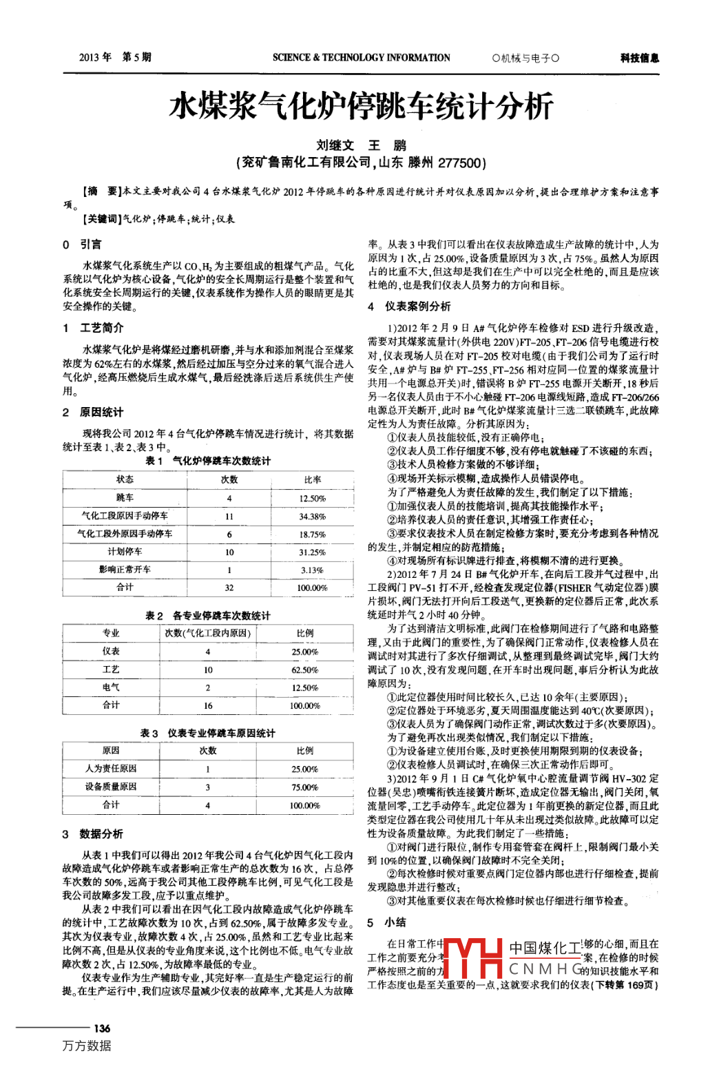 2013年第5期SCIENCE TECHNOLOGY INFORMATION○機(jī)械與電子O科技信息水煤漿氣化爐停跳車統(tǒng)計(jì)分析劉繼文王鵬(兗礦魯南化工有限公司,山東滕州277500)【摘要】本文主要對(duì)我公司4臺(tái)水煤漿氣化爐2012年停跳車的各種原因進(jìn)行統(tǒng)計(jì)并對(duì)儀表原因加以分析,提出合理維護(hù)方案和注意事【關(guān)鍵詞】氣化爐;停跳車;統(tǒng)計(jì);儀表0引言率。從表3中我們可以看出在儀表故障造成生產(chǎn)故障的統(tǒng)計(jì)中,人為水煤漿氣化系統(tǒng)生產(chǎn)以COH為主要組成的粗煤氣產(chǎn)品。氣化占的比重不大但這卻是我們?cè)谏a(chǎn)中可以完全杜絕的而且是應(yīng)該系統(tǒng)以氣化爐為核心設(shè)備氣化爐的安全長(zhǎng)周期運(yùn)行是整個(gè)裝置和氣杜絕的,也是我們儀表人員努力的方向和目標(biāo)?;到y(tǒng)安全長(zhǎng)周期運(yùn)行的關(guān)鍵,儀表系統(tǒng)作為操作人員的眼睛更是其安全操作的關(guān)鍵4儀表案例分析工藝簡(jiǎn)介1)2012年2月9日A#氣化爐停車檢修對(duì)ESD進(jìn)行升級(jí)改造需要對(duì)其煤漿流量計(jì)(外供電220V)FT-205、FT-206信號(hào)電纜進(jìn)行校水煤漿氣化爐是將煤經(jīng)過(guò)磨機(jī)研磨并與水和添加劑混合至煤漿對(duì)儀表現(xiàn)場(chǎng)人員在對(duì)F-205校對(duì)電纜(由于我們公司為了運(yùn)行時(shí)濃度為6%左右的水煤漿然后經(jīng)過(guò)加壓與空分過(guò)來(lái)的氧氣混合進(jìn)人安全,A爐與B爐F-25T-256相對(duì)應(yīng)同一位置的煤漿流量計(jì)氣化爐,經(jīng)高壓燃燒后生成水煤氣最后經(jīng)洗滌后送后系統(tǒng)供生產(chǎn)使共用一個(gè)電源總開(kāi)關(guān))時(shí)錯(cuò)誤將B爐F-25電源開(kāi)關(guān)斷開(kāi),18秒后用另一名儀表人員由于不小心觸碰FT-206電源線短路,造成FT-2062662原因統(tǒng)計(jì)電源總開(kāi)關(guān)斷開(kāi),此時(shí)B#氣化爐煤漿流量計(jì)三選二聯(lián)鎖跳車,此故障定性為人為責(zé)任故障。分析其原因?yàn)楝F(xiàn)將我公司2012年4臺(tái)氣化爐停跳車情況進(jìn)行統(tǒng)計(jì),將其數(shù)據(jù)統(tǒng)計(jì)至表1表2、表3中①儀表人員技能較低沒(méi)有正確停電;②儀表人員工作仔細(xì)度不夠沒(méi)有停電就觸碰了不該碰的東西;表1氣化爐停跳車次數(shù)統(tǒng)計(jì)③技術(shù)人員檢修方案做的不夠詳細(xì)狀態(tài)次數(shù)比率④現(xiàn)場(chǎng)開(kāi)關(guān)標(biāo)示模糊造成操作人員錯(cuò)誤停電跳12.50%為了嚴(yán)格避免人為責(zé)任故障的發(fā)生,我們制定了以下措施:①加強(qiáng)儀表人員的技能培訓(xùn),提高其技能操作水平氣化工段原因手動(dòng)停車34.38%②培養(yǎng)儀表人員的責(zé)任意識(shí),其增強(qiáng)工作責(zé)任心氣化工段外原因手動(dòng)停車160③要求儀表技術(shù)人員在制定檢修方案時(shí),要充分考慮到各種情況的發(fā)生,并制定相應(yīng)的防范措施;④對(duì)現(xiàn)場(chǎng)所有標(biāo)識(shí)牌進(jìn)行排查,將模糊不清的進(jìn)行更換影響正常開(kāi)車3.13%2)2012年7月24日B#氣化爐開(kāi)車,在向后工段并氣過(guò)程中合計(jì)3210000%工段閥門PV-51打不開(kāi),經(jīng)檢查發(fā)現(xiàn)定位器( FISHER氣動(dòng)定位器)膜片損壞,閥門無(wú)法打開(kāi)向后工段送氣,更換新的定位器后正常,此次系表2各專業(yè)停跳車次數(shù)統(tǒng)計(jì)統(tǒng)延時(shí)并氣2小時(shí)40分鐘。專業(yè)次數(shù)(氣化工段內(nèi)原因)比例為了達(dá)到清潔文明標(biāo)準(zhǔn),此閥門在檢修期間進(jìn)行了氣路和電路整儀表理,又由于此閥門的重要性,為了確保閥門正常動(dòng)作,儀表檢修人員在2500%調(diào)試時(shí)對(duì)其進(jìn)行了多次仔細(xì)調(diào)試,從整理到最終調(diào)試完畢,閥門大約工藝62.50%調(diào)試了10次,沒(méi)有發(fā)現(xiàn)問(wèn)題,在開(kāi)車時(shí)出現(xiàn)問(wèn)題,事后分析認(rèn)為此故電氣12.50%障原因?yàn)棰俅硕ㄎ黄魇褂脮r(shí)間比較長(zhǎng)久,已達(dá)10余年(主要原因);合計(jì)②定位器處于環(huán)境惡劣,夏天周圍溫度能達(dá)到40℃(次要原因);③儀表人員為了確保閥門動(dòng)作正常調(diào)試次數(shù)過(guò)于多(次要原因)。表3儀表專業(yè)停跳車原因統(tǒng)計(jì)為了避免再次出現(xiàn)類似情況,我們制定以下措施:原因次數(shù)比例①為設(shè)備建立使用臺(tái)賬,及時(shí)更換使用期限到期的儀表設(shè)備;人為責(zé)任原因②儀表檢修人員調(diào)試時(shí),在確保三次正常動(dòng)作后即可。設(shè)備質(zhì)量原3)2012年9月1日C#氣化爐氧中心腔流量調(diào)節(jié)閥Hv-302定7500%位器(吳忠)噴嘴銜鐵連接簧片斷壞,造成定位器無(wú)輸出,閥門關(guān)閉,氧合計(jì)000流量回零,工藝手動(dòng)停車。此定位器為1年前更換的新定位器而且此類型定位器在我公司使用幾十年從未出現(xiàn)過(guò)類似故障。此故障可以定3數(shù)據(jù)分析性為設(shè)備質(zhì)量故障。為此我們制定了一些措施:從表1中我們可以得出2012年我公司4臺(tái)氣化爐因氣化工段內(nèi)①對(duì)閥門進(jìn)行限位,制作專用套管套在閥桿上,限制閥門最小關(guān)故障造成氣化爐停跳車或者影響正常生產(chǎn)的總次數(shù)為16次,占總到10%的位置以確保閥門故障時(shí)不完全關(guān)閉;②每次檢修時(shí)