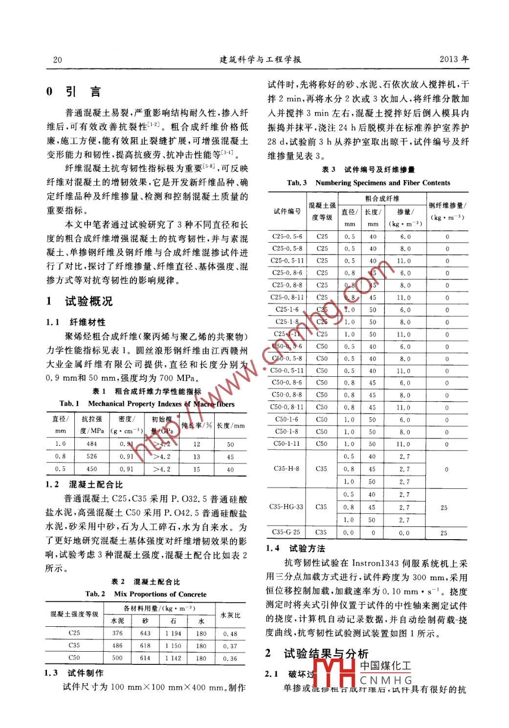 第30卷第1期建筑科學(xué)與工程學(xué)報Vol 30 No. 12013年3月Journal of architecture and Civil engineeringMar.2013文章編號:1673-2049(2013)01-0019-06聚烯烴粗合成纖維混凝土抗彎韌性試驗鄧宗才,師亞軍,曹煒(北京工業(yè)大學(xué)城市與工程防災(zāi)減災(zāi)省部共建教育部重點實驗室,北京100124)摘要:為了解新型粗合成纖維對改善混凝土抗彎韌性的效果,試驗研究了纖維摻量、基體強度、纖維直徑等因素對混凝土抗彎韌性的影響規(guī)律。結(jié)果表明:單摻或混摻不同幾何尺寸粗合成纖維后,試件具有很妤的韌性,呈延性破壞;抗彎韌性指數(shù)隨纖維摻量的増加而增大;基體強度提高時,抗彎韌性指數(shù)略有上升;纖維直徑不同時,抗彎韌性指數(shù)變化不明顯;3種合成纖維與鋼纖維混摻后,其抗彎韌性指標大于單摻鋼纖維或3種合成纖維混摻的試件;混摻粗合成纖維可有效改善梁裂后行為,即峰值荷載后仍保持較高荷載;而單摻鋼纖維梁在峰值荷栽后,荷載下降較快;新的抗彎韌性評價方法能夠準確地反映粗合成纖維混凝土裂后阻裂能力高、變形大的特點。關(guān)鍵詞:粗合成纖維;抗彎韌性;剩余強度;混凝土;配合比;纖維摻量中圖分類號:TU528.58文獻標志碼:AExperiment on Flexural Toughness of Polyolefin Macro-fiberReinforced ConcreteDENG Zong-cai, SHI Ya-jun, CAO WeiKey Laboratory of Urban Security and Disaster Engineering of Ministry of EducationBeijing University of Technology, Beijing 100124, ChinaAbstract: In order to grip the flexural toughness impact of new type synthetic macro-fiber onreinforced concrete, the effects of the fiber content, the matrix strength of reinforced concreteand the diameter of fiber on the flexural toughness were studied. The results show that theaddition of synthetic macro-fiber changes the failure mode of reinforced concrete from brittlenessto ductility. The flexural toughness index increases with the fiber content, it also increases whenthe matrix strength increases; and it has't evidently changed when the diameter of fiber changesThe flexural toughness of reinforced concrete with steel fiber and three synthetic macro-fiberhigher than those of steel fiber or three synthetic macro-fiber, and synthetic macro-fiber canincrease the toughness of reinforced concrete. The synthetic macro-fiber reinforced concrete canhave a higher load after the peak load, but the load of concrete with steel fiber decreases quicklyafter the peak load, the characteristic of reinforced concrete with synthetic macro-fiber can beproved by the new toughness evaluation method.Key words: synthetic macro-fiber; flexural toughness; residual strength; reinforced concretemix proportion; fiber content收稿日期:2012-10-20基金項目:國家自然科學(xué)基金項目(50678011)中國煤化工作者簡介:鄧宗才(1961-),男陜西扶風(fēng)人,教授博士研究生導(dǎo)師,工學(xué)博土, E-mail: deHiCNMHG20建筑科學(xué)與工程學(xué)報2013年0引言試件時,先將稱好的砂、水泥、石依次放入攪拌機,干拌2min,再將水分2次或3次加入,將纖維分散加普通混凝土易裂,嚴重影響結(jié)構(gòu)耐久性,摻入纖人并攪拌3min左右,混凝土攪拌好后倒入模具內(nèi)維后,可有效改善抗裂性121。粗合成纖維價格低振搗并抹平,澆注24h后脫模并在標準養(yǎng)護室養(yǎng)護廉,施工方便,能有效阻止裂縫擴展,可增強混凝土28d試驗前3h從養(yǎng)護室取出晾干,試件編號及纖變形能力和韌性,提高抗疲勞、抗沖擊性能等31維摻量見表3纖維混凝土抗彎韌性指標極為重要58,可反映表3試件編號及纖維摻量纖維對混凝土的增韌效果,它是開發(fā)新纖維品種、確Tab 3 Numbering Specimens and Fiber Contents定纖維品種及纖維摻量、檢測和控制混凝土質(zhì)量的粗合成纖維重要指標凝土強試件編號直徑/長度/摻量/鋼纖維摻量/度等級本文中筆者通過試驗研究了3種不同直徑和長g·m-3mmmm(kg·m-3)度的粗合成纖維增強混凝土的抗彎韌性,并與素混C25-0.5-6C25凝土、單摻鋼纖維及鋼纖維與合成纖維混摻試件進C25-0.58C250.540行了對比,探討了纖維摻量、纖維直徑、基體強度、混C25-0.5-11C25C25-0.8-6摻方式等對抗彎韌性的影響規(guī)律。00000C25-0.8-80.8458.01試驗概況C25-0.8-11C250.811.0C251-6C251.0506.01.1纖維材性C251-8聚烯烴粗合成纖維(聚丙烯與聚乙烯的共聚物)C2511c25.05301.0力學(xué)性能指標見表1。圓絲浪形鋼纖維由江西贛州C50-0.56C50大業(yè)金屬纖維有限公司提供,直徑和長度分別為C500.5-8C50C50-0.5-11C5011.00.9mm和50mm,強度均為700MPa。C50-0.8-6C50表1粗合成纖維力學(xué)性能指標C500.88c508.0Tab 1 Mechanical Property Indexes of Macro-fibersC50-0.8-11500.84511.0直徑/抗拉強密度/初始模C50-1-6伸長率/%長度/000000000度/MPa(g·cm-)量/GPa484C50-1-11C50526415C35-H8C352混凝土配合比1.052,7普通混凝土C25,C35采用P.O32.5普通硅酸鹽水泥,高強混凝土C50采用P.O42.5普通硅酸鹽C35HG33C350.8451.02.7水泥砂采用中砂,石為人工碎石,水為自來水。為C35G25C350.000.0了更好地研究混凝土基體強度對纖維增韌效果的影響,試驗考慮3種混凝土強度,混凝土配合比如表21.4試驗方法所示抗彎韌性試驗在 Instron1343伺服系統(tǒng)機上采表2混凝土配合比用三分點加載方式進行,試件跨度為300mm,采用Tab 2 Mix Proportions of Concrete恒位移控制加載,加載速率為0.10mm·s-1。撓度各材料用量/(kg·m-3)測定時將夾式引伸儀置于試件的中性軸來測定試件混凝土強度等級水灰比水泥的撓度,計算機自動記錄數(shù)據(jù),并自動繪制荷載撓64311941800.48度曲線,抗彎韌性試驗測試裝置如圖1所示186618115018C5050061411421800.362