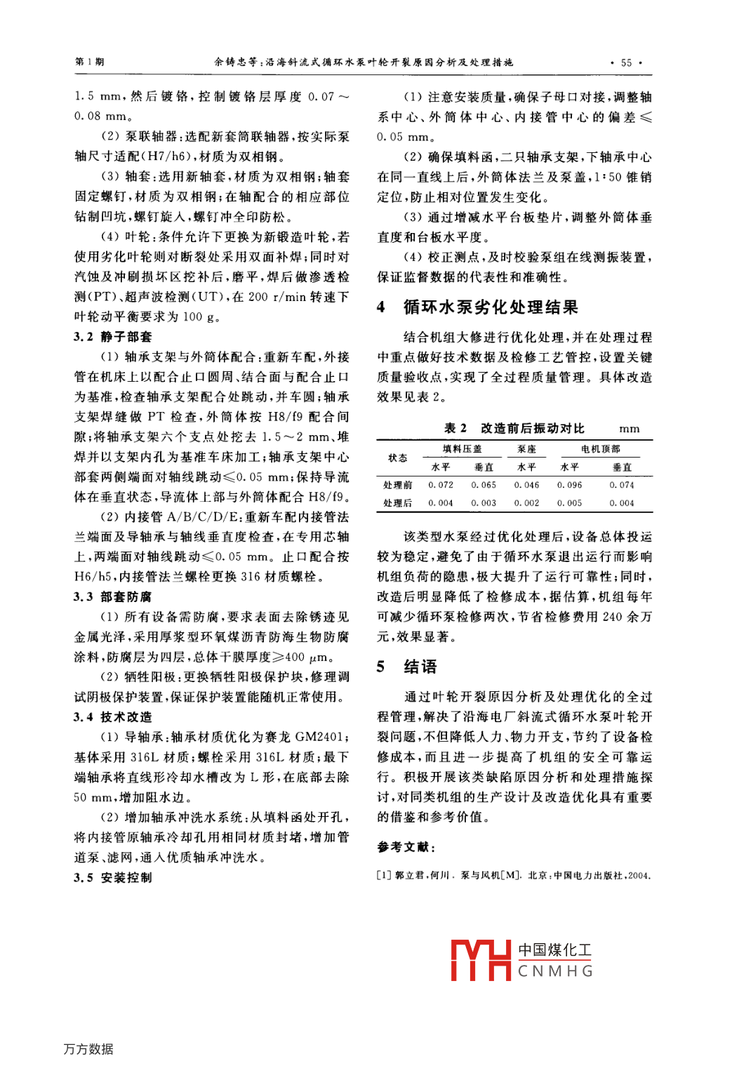 第29卷第1期.發(fā)電沒備Vol. 29, No.12015年1月POWER EQUIPMENTJan. 2015沿海斜流式循環(huán)水泵葉輪開裂原因分析及處理措施;(浙江大唐烏沙山發(fā)電有限責(zé)任公司,浙江寧波315722)摘要:以某沿海電廠600MW超臨界機(jī)組循環(huán)水泵葉輪開裂分析及處理的全過程管理為基礎(chǔ),根據(jù)解體現(xiàn)象及相關(guān)數(shù)據(jù),分析了葉輪開裂的原因;同時,結(jié)合同類水泵的處理方法和效果,總結(jié)了斜流式循環(huán)水泵葉輪開裂的處理措施,為機(jī)組的安全可靠、經(jīng)濟(jì)穩(wěn)定運行提供了重要的參考。關(guān)鍵詞:斜流式;循環(huán)水泵;葉輪;開裂;處理措施中圖分類號:TH31文獻(xiàn)標(biāo)志碼:A文章編號:1671-086X(2015)01-0053-03Cause Analysis and Handling of Impeller Cracking Failurein a Coastal Inclined-flow Circulating Water PumpYu Zhuzhong(Zhejiang Datang Wushashan Power Generation Co., Ltd, Ningbo 315722 , Zhejiang Province, China)Abstract: Cause analysis was conducted to the impeller cracking failure occurring in a coastal circulatingwater pump of a 600 MW supercritical power unit according to the cracking phenomenon and relevant data,after which corresponding countermeasures were proposed and taken. In combination with the handlingmethod and effect for similar water pumps, specific treatment measures for impeller cracking of inclined-flow circulating water pumps were summarized, which may serve as a reference for safe, reliable and stableoperation of similar units.Keywords: inclined-flow type; circulating water pump; impeller; cracking; handling measures近年來,我國沿海各大容量、高參數(shù)火力發(fā)水,其工作特點是冷卻水量大、壓力低,故要求循電機(jī)組持續(xù)投產(chǎn),極大支撐和保證了沿海地域的環(huán)水泵具有大流量、低揚(yáng)程的特性,屬高比轉(zhuǎn)速經(jīng)濟(jì)發(fā)展;同時,由于安裝質(zhì)量、部件材質(zhì)和結(jié)構(gòu)泵[1。88LKXB-19型立式單級單吸導(dǎo)葉式、內(nèi)體設(shè)計等原因產(chǎn)生的循環(huán)水泵葉輪開裂等缺陷,造可抽出式斜流泵(見圖1)有以下特點:(1)體積成機(jī)組限負(fù)荷甚至非正常停機(jī)的現(xiàn)象也在逐年小、質(zhì)量輕,水泵占地面積小,啟動前無需灌水;增多,很大程度上決定著機(jī)組運行的可靠性,甚(2)效率高,泵效率可達(dá)到83% ~90%;(3)水泵至影響著電網(wǎng)供電的穩(wěn)定性。為單支座布置,水泵與電機(jī)直連,安裝在同一基沿海電廠循環(huán)水泵目前較為常見的是采用礎(chǔ)上,泵體安裝在濕式泵坑內(nèi);(4)水泵轉(zhuǎn)動部件典型的88LKXB-19型立式單級單吸導(dǎo)葉式、內(nèi)為可抽芯式,且具有互換性,在維護(hù)或更換轉(zhuǎn)動體可抽出式斜流泵,冬季一用一備,夏季同時開部件時無需拆卸水泵外殼;(5)汽蝕性能好,安全啟,提供充足循環(huán)水量,保證機(jī)組的安全可靠和可靠,使用壽命長。鑒于以上特點,當(dāng)前沿海較經(jīng)濟(jì)穩(wěn)定運行。筆者通過該類型循環(huán)水泵運行多電廠選用該類型循環(huán)水泵。狀況和解體現(xiàn)象的論證分析,歸納葉輪開裂的主要原因,總結(jié)消除葉輪開裂的具體措施。重號5其田、年田二特1設(shè)備概況循環(huán)水泵的作用是向凝汽器、閉式循環(huán)冷卻圖188LKXB-19 型立式單級單吸導(dǎo)葉式、水熱交換器和水環(huán)機(jī)械真空泵冷卻器供給冷卻內(nèi)體可抽出式斜流泵簡圖收稿日期:2014-04-23中國煤化工作者簡介:余鑄忠(1986-).男,工程師,從事發(fā)電廠設(shè)備技術(shù)管理工作。MYHCNMH GE-mail: datangyuzhuzhong@ 163. com第1期余鑄忠等:沿海斜流式循環(huán)水泵葉輪開裂原因分析及處理措施1.5 mm,然后鍍鉻,控制鍍鉻層厚度0.07 ~(1)注意安裝質(zhì)量,確保子母口對接,調(diào)整軸0.08mm。.系中心、外簡體中心、內(nèi)接管中心的偏差≤(2)泵聯(lián)軸器:選配新套簡聯(lián)軸器,按實際泵0.05 mm.軸尺寸適配(H7/h6),材質(zhì)為雙相鋼。(2)確保填料函,二只軸承支架,下軸承中心(3)軸套:選用新軸套,材質(zhì)為雙相鋼;軸套在同-直線上后,外簡體法蘭及泵蓋,1:50錐銷固定螺釘,材質(zhì)為雙相鋼;在軸配合的相應(yīng)部位定位,防止相對位置發(fā)生變化。鉆制凹坑,螺釘旋人,螺釘沖全印防松。(3)通過增減水平臺板墊片,調(diào)整外筒體垂(4)葉輪:條件允許下更換為新鍛造葉輪,若直度和臺板水平度。使用劣化葉輪則對斷裂處采用雙面補(bǔ)焊;同時對(4)校正測點,及時校驗泵組在線測振裝置,汽蝕及沖刷損壞區(qū)挖補(bǔ)后,磨平,焊后做滲透檢保證監(jiān)督數(shù)據(jù)的代表性和準(zhǔn)確性。測(PT)、超聲波檢測(UT),在200 r/min轉(zhuǎn)速下4循環(huán)水泵劣化處理結(jié)果葉輪動平衡要求為100 g。3.2靜子部套結(jié)合機(jī)組大修進(jìn)行優(yōu)化處理,并在處理過程(1)軸承支架與外簡體配合:重新車配,外接中重點做好技術(shù)數(shù)據(jù)及檢修工藝管控,設(shè)置關(guān)鍵管在機(jī)床上以配合止口圓周、結(jié)合面與配合止口質(zhì)量驗收點,實現(xiàn)了全過程質(zhì)量管理。具體改造為基準(zhǔn),檢查軸承支架配合處跳動,并車圓;軸承效果見表2。支架焊縫做PT檢查,外簡體按H8/f9 配合間表2改造前后振動對比隙;將軸承支架六個支點處挖去1.5~2 mm、堆填料壓蓋泵座電機(jī)頂部焊并以支架內(nèi)孔為基準(zhǔn)車床加工;軸承支架中心狀態(tài)水平垂直 水平水平垂直部套兩側(cè)端面對軸線跳動≤0.05mm;保