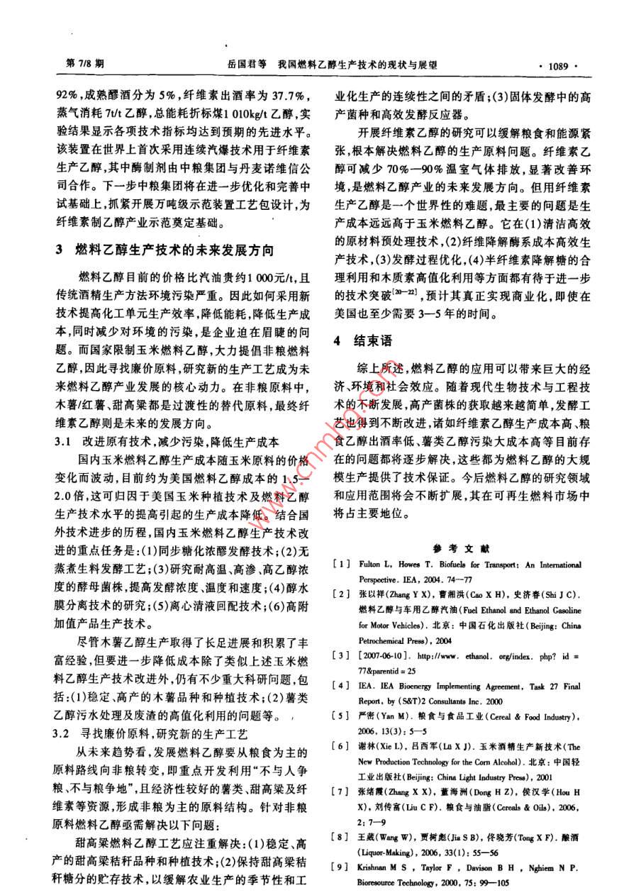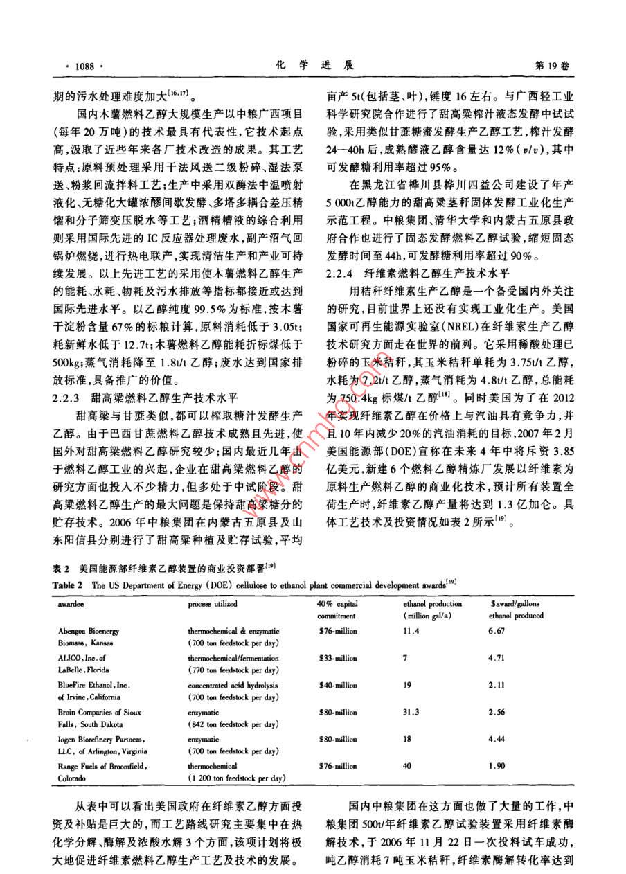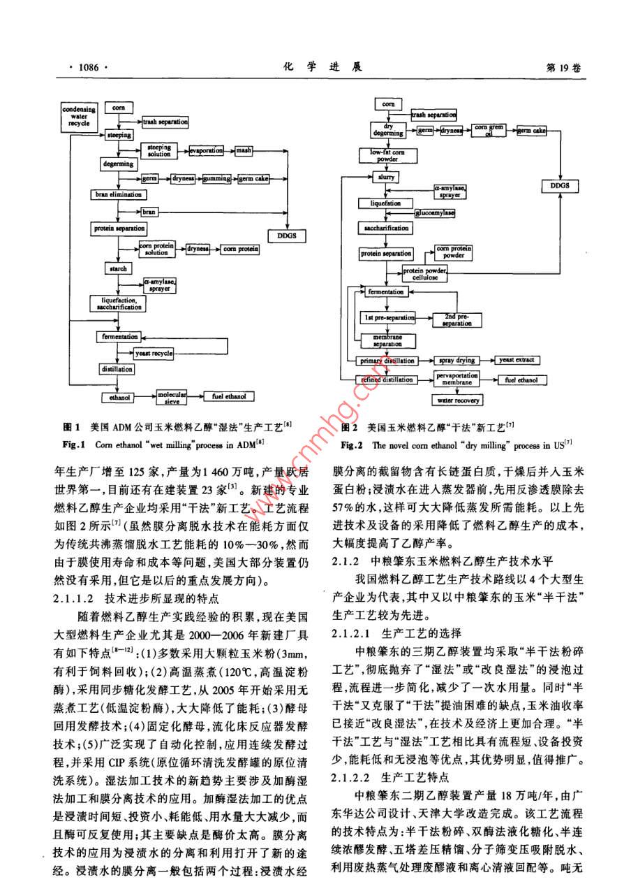 第19卷第7/8期化學(xué)進(jìn)展Vol 19 No. 7/8200年8月PROGRESS IN CHEMISTRYAug.2007我國燃料乙醇生產(chǎn)技術(shù)的現(xiàn)狀與展望岳國君武國慶郝小明(中糧集團(tuán)有限公司生化能源事業(yè)部北京100080)摘要概述了目前國內(nèi)外燃料乙醇產(chǎn)業(yè)現(xiàn)狀。結(jié)合我國中糧生化能源(肇東)有限公司燃料乙醇裝置,重點(diǎn)介紹了我國日前的燃料乙醇生產(chǎn)工藝技術(shù)水平、特點(diǎn)以及與國外的差距。本文從提高燃料乙醇生產(chǎn)技術(shù)水平、降低生產(chǎn)成本、尋找廉價非糧原料和開發(fā)新生產(chǎn)工藝等幾個方面,對燃料乙醇生產(chǎn)技術(shù)的發(fā)展作了展望。關(guān)鍵詞燃料乙醇生產(chǎn)技術(shù)玉米非糧原料中圖分類號:TK6;S216.2文獻(xiàn)標(biāo)識碼:A文章編號:1005-281X(2007)07/8-108407The Status Quo and Prospects of Fuel Ethanol ProcessTechnology in ChinaBio-chemical and Bio-energy Division, China National Cereals, Oils, Foodstuffs ImportExport Corporation Limited, Beijing 100080, China)Abstract The status quo of fuel ethanol industry in the world is reviewed. In this paper, referring to the presentluction situation of fuel ethanol plants, owned by COFCO limited, at Zhao Dong City in Heilongjiang Province,com ethanol process technology in China is highlighted. The difference of com ethanol process technology betweendomestic and abroad is compared. Additionally, the processing technology of fuel ethanol in China using non-grainfeedsocks such as cassava, sorghum and cellulose have been emphasized. The future development of fuel ethanoltechnology is also discussed based on improvement of the fuel ethanol processing technology, reduction of the fuel ethanolhigh cost, and exploitation of new processing technology using cheap feedstocksKey words fuel ethanol; process technology com, non-grain feedsocks近年來,隨著我國經(jīng)濟(jì)的高速發(fā)展,社會與經(jīng)濟(jì)油,推廣使用乙醇汽油狀況最好的國家是巴西和美可持續(xù)發(fā)展所面臨的能源、環(huán)境、農(nóng)業(yè)等問題將日益國。巴西是世界上唯一不使用純汽油作為汽車燃料凸顯,而借鑒國外經(jīng)驗,推廣使用乙醇汽油是國家著的國家。巴西從1975年開始實施“燃料乙醇計劃力緩解能源、環(huán)境、農(nóng)業(yè)問題的一項戰(zhàn)略性舉措。目以甘蔗為原料生產(chǎn)燃料乙醇。1975-1989年政府為前國內(nèi)各地擬建燃料乙醇項目積極性高漲,但產(chǎn)業(yè)發(fā)展燃料乙醇項目投資了492億美元,提高了生產(chǎn)發(fā)展面臨著提高產(chǎn)業(yè)技術(shù)發(fā)展水平,降低生產(chǎn)成本,燃料乙醇各個環(huán)節(jié)的效率,技術(shù)的發(fā)展使巴西燃料開發(fā)非糧原料,研究新的生產(chǎn)工藝等諸多挑戰(zhàn)。乙醇生產(chǎn)成本在世界上最低,約合每升0.200.211燃料乙醇產(chǎn)業(yè)的國內(nèi)外發(fā)展現(xiàn)狀美元,具有很強(qiáng)的市場競爭力1。至2001年巴西政府取消了對燃料乙醇的補(bǔ)貼,完全實現(xiàn)了商業(yè)化1.1國外發(fā)展現(xiàn)狀美國推廣玉米乙醇汽油近30年,2006年燃料乙目前世界上已有近20個國家推廣使用乙醇汽醇產(chǎn)量首次超過巴西(1380萬噸),達(dá)到收稿:2007年6月通訊聯(lián)系人emal:yueg@cofo,com第7/8期岳國君等我國燃料乙醇生產(chǎn)技術(shù)的現(xiàn)狀與展望10851460萬噸。主要原因首先在于政府的大力支持。醇需要消耗大量的糧食,為此國家燃料乙醇產(chǎn)業(yè)堅1979年,美國制定了聯(lián)邦政府的“乙醇發(fā)展計劃”,持發(fā)展非糧燃料乙醇,原料的選擇遵循“因地制宜,并制定了積極的經(jīng)濟(jì)激勵政策。雖然目前美國燃料非糧為主”的原則。作為國內(nèi)燃料乙醇行業(yè)的龍頭乙醇生產(chǎn)成本已具備與汽油競爭的實力,但政府仍企業(yè),中糧集團(tuán)承建的中糧廣西20萬噸/年木薯乙然給燃料乙醇進(jìn)行補(bǔ)貼。其次在過去的近20年中,醇項目順應(yīng)了這一趨勢。該裝置是國家審批的第5先進(jìn)技術(shù)的應(yīng)用使生產(chǎn)燃料乙醇的成本降低了2/3,個燃料乙醇生產(chǎn)裝置,也是唯一的非糧作物燃料乙約為每升0.24-034美元1240,這也是燃料乙醇在醇裝置,預(yù)計200年底可望投產(chǎn)。美國獲得成功的重要原因。2國內(nèi)燃料乙醇生產(chǎn)技術(shù)水平1.2國內(nèi)發(fā)展現(xiàn)狀我國燃料乙醇起步較晚,但是發(fā)展迅速,已成為2.1玉米燃料乙醇生產(chǎn)技術(shù)水平繼巴西、美國之后世界第三大燃料乙醇生產(chǎn)國。“十玉米燃料乙醇按照生產(chǎn)工藝可分為“濕法”與五”期間,國家發(fā)改委先后建設(shè)了4套燃料乙醇生產(chǎn)“干法”°。對于專業(yè)的乙醇生產(chǎn)企業(yè),采用技術(shù)手裝置核準(zhǔn)生產(chǎn)102萬噸年燃料乙醇,即中糧生段分離出胚芽生產(chǎn)玉米油是必要的,并且工業(yè)生產(chǎn)化能源(肇東)有限公司(10萬噸年)吉林乙醇(一乙醇時,只要求玉米淀粉脂肪含量低于1.0%即期30萬噸/年),安徽豐原生化(32萬噸年),河南天可。因此,“半干法”工藝或“改良濕法”工藝均為冠(30萬噸/年),其中除河南天冠使用部分小麥,中可選方案。表1為幾種玉米燃料乙醇生產(chǎn)工藝的優(yōu)糧肇東使用部分陳化水稻為原料生產(chǎn)燃料乙醇外,劣比較其余全部使用玉米。由于用糧食為原料生產(chǎn)燃料乙表1玉米燃料乙醇生產(chǎn)工藝的綜合比較Table 1 The comparation of different com fuel ethanol proc