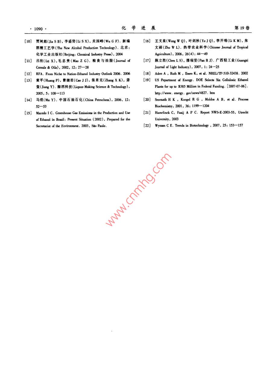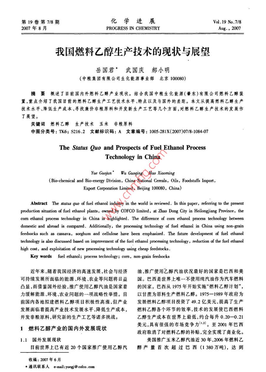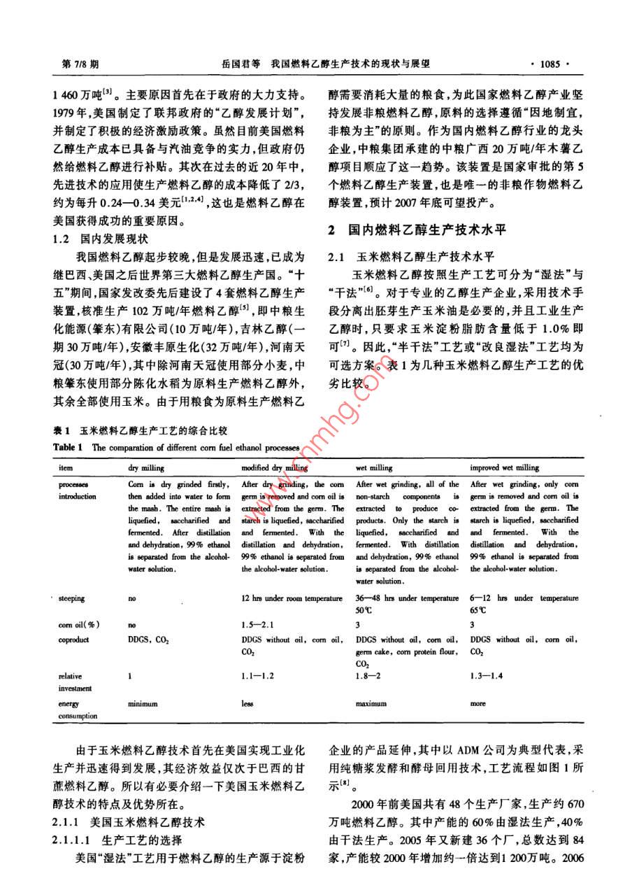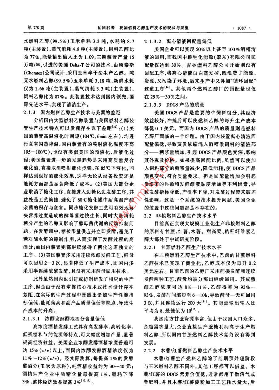 第19卷第7/8期化學(xué)進(jìn)展Vol 19 No. 7/8200年8月PROGRESS IN CHEMISTRYAug.2007我國燃料乙醇生產(chǎn)技術(shù)的現(xiàn)狀與展望岳國君武國慶郝小明(中糧集團(tuán)有限公司生化能源事業(yè)部北京100080)摘要概述了目前國內(nèi)外燃料乙醇產(chǎn)業(yè)現(xiàn)狀。結(jié)合我國中糧生化能源(肇東)有限公司燃料乙醇裝置,重點(diǎn)介紹了我國日前的燃料乙醇生產(chǎn)工藝技術(shù)水平、特點(diǎn)以及與國外的差距。本文從提高燃料乙醇生產(chǎn)技術(shù)水平、降低生產(chǎn)成本、尋找廉價非糧原料和開發(fā)新生產(chǎn)工藝等幾個方面,對燃料乙醇生產(chǎn)技術(shù)的發(fā)展作了展望。關(guān)鍵詞燃料乙醇生產(chǎn)技術(shù)玉米非糧原料中圖分類號:TK6;S216.2文獻(xiàn)標(biāo)識碼:A文章編號:1005-281X(2007)07/8-108407The Status Quo and Prospects of Fuel Ethanol ProcessTechnology in ChinaBio-chemical and Bio-energy Division, China National Cereals, Oils, Foodstuffs ImportExport Corporation Limited, Beijing 100080, China)Abstract The status quo of fuel ethanol industry in the world is reviewed. In this paper, referring to the presentluction situation of fuel ethanol plants, owned by COFCO limited, at Zhao Dong City in Heilongjiang Province,com ethanol process technology in China is highlighted. The difference of com ethanol process technology betweendomestic and abroad is compared. Additionally, the processing technology of fuel ethanol in China using non-grainfeedsocks such as cassava, sorghum and cellulose have been emphasized. The future development of fuel ethanoltechnology is also discussed based on improvement of the fuel ethanol processing technology, reduction of the fuel ethanolhigh cost, and exploitation of new processing technology using cheap feedstocksKey words fuel ethanol; process technology com, non-grain feedsocks近年來,隨著我國經(jīng)濟(jì)的高速發(fā)展,社會與經(jīng)濟(jì)油,推廣使用乙醇汽油狀況最好的國家是巴西和美可持續(xù)發(fā)展所面臨的能源、環(huán)境、農(nóng)業(yè)等問題將日益國。巴西是世界上唯一不使用純汽油作為汽車燃料凸顯,而借鑒國外經(jīng)驗,推廣使用乙醇汽油是國家著的國家。巴西從1975年開始實施“燃料乙醇計劃力緩解能源、環(huán)境、農(nóng)業(yè)問題的一項戰(zhàn)略性舉措。目以甘蔗為原料生產(chǎn)燃料乙醇。1975-1989年政府為前國內(nèi)各地擬建燃料乙醇項目積極性高漲,但產(chǎn)業(yè)發(fā)展燃料乙醇項目投資了492億美元,提高了生產(chǎn)發(fā)展面臨著提高產(chǎn)業(yè)技術(shù)發(fā)展水平,降低生產(chǎn)成本,燃料乙醇各個環(huán)節(jié)的效率,技術(shù)的發(fā)展使巴西燃料開發(fā)非糧原料,研究新的生產(chǎn)工藝等諸多挑戰(zhàn)。乙醇生產(chǎn)成本在世界上最低,約合每升0.200.211燃料乙醇產(chǎn)業(yè)的國內(nèi)外發(fā)展現(xiàn)狀美元,具有很強(qiáng)的市場競爭力1。至2001年巴西政府取消了對燃料乙醇的補(bǔ)貼,完全實現(xiàn)了商業(yè)化1.1國外發(fā)展現(xiàn)狀美國推廣玉米乙醇汽油近30年,2006年燃料乙目前世界上已有近20個國家推廣使用乙醇汽醇產(chǎn)量首次超過巴西(1380萬噸),達(dá)到收稿:2007年6月通訊聯(lián)系人emal:yueg@cofo,com第7/8期岳國君等我國燃料乙醇生產(chǎn)技術(shù)的現(xiàn)狀與展望10851460萬噸。主要原因首先在于政府的大力支持。醇需要消耗大量的糧食,為此國家燃料乙醇產(chǎn)業(yè)堅1979年,美國制定了聯(lián)邦政府的“乙醇發(fā)展計劃”,持發(fā)展非糧燃料乙醇,原料的選擇遵循“因地制宜,并制定了積極的經(jīng)濟(jì)激勵政策。雖然目前美國燃料非糧為主”的原則。作為國內(nèi)燃料乙醇行業(yè)的龍頭乙醇生產(chǎn)成本已具備與汽油競爭的實力,但政府仍企業(yè),中糧集團(tuán)承建的中糧廣西20萬噸/年木薯乙然給燃料乙醇進(jìn)行補(bǔ)貼。其次在過去的近20年中,醇項目順應(yīng)了這一趨勢。該裝置是國家審批的第5先進(jìn)技術(shù)的應(yīng)用使生產(chǎn)燃料乙醇的成本降低了2/3,個燃料乙醇生產(chǎn)裝置,也是唯一的非糧作物燃料乙約為每升0.24-034美元1240,這也是燃料乙醇在醇裝置,預(yù)計200年底可望投產(chǎn)。美國獲得成功的重要原因。2國內(nèi)燃料乙醇生產(chǎn)技術(shù)水平1.2國內(nèi)發(fā)展現(xiàn)狀我國燃料乙醇起步較晚,但是發(fā)展迅速,已成為2.1玉米燃料乙醇生產(chǎn)技術(shù)水平繼巴西、美國之后世界第三大燃料乙醇生產(chǎn)國。“十玉米燃料乙醇按照生產(chǎn)工藝可分為“濕法”與五”期間,國家發(fā)改委先后建設(shè)了4套燃料乙醇生產(chǎn)“干法”°。對于專業(yè)的乙醇生產(chǎn)企業(yè),采用技術(shù)手裝置核準(zhǔn)生產(chǎn)102萬噸年燃料乙醇,即中糧生段分離出胚芽生產(chǎn)玉米油是必要的,并且工業(yè)生產(chǎn)化能源(肇東)有限公司(10萬噸年)吉林乙醇(一乙醇時,只要求玉米淀粉脂肪含量低于1.0%即期30萬噸/年),安徽豐原生化(32萬噸年),河南天可。因此,“半干法”工藝或“改良濕法”工藝均為冠(30萬噸/年),其中除河南天冠使用部分小麥,中可選方案。表1為幾種玉米燃料乙醇生產(chǎn)工藝的優(yōu)糧肇東使用部分陳化水稻為原料生產(chǎn)燃料乙醇外,劣比較其余全部使用玉米。由于用糧食為原料生產(chǎn)燃料乙表1玉米燃料乙醇生產(chǎn)工藝的綜合比較Table 1 The comparation of different com fuel ethanol proc