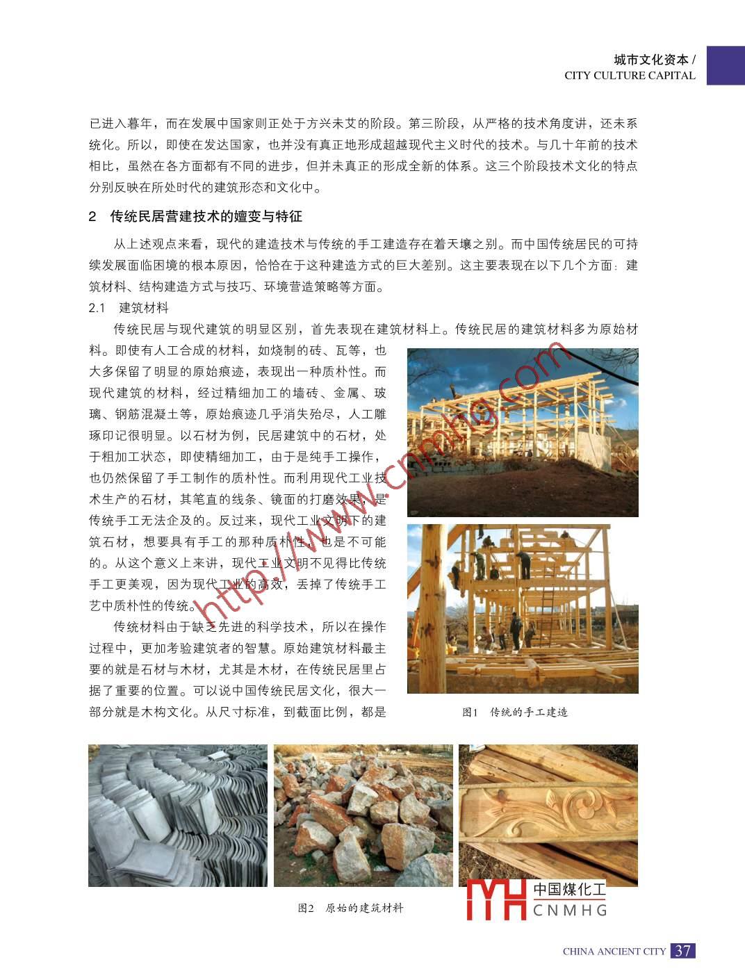 CAC中國名城CHINA ANCIENT CITY傳統(tǒng)民居的技術(shù)文化王丹邵明胡文薈摘要: 技術(shù)與文化的形成有著密不可分的關(guān)系。特定的技術(shù)會產(chǎn)生特定的文化。傳統(tǒng)民居中的營建技術(shù)以及由營建技術(shù)而產(chǎn)生的文化特征是民居建筑文化的重要組成,其中表現(xiàn)出的低技術(shù)文化具有過程的復雜性、原理的簡單性和地域的特征性。關(guān)鍵詞:傳統(tǒng)民居;技術(shù)文化;復雜性;簡單性Abstract: The formation of culture is related to technology, special technology creates a specialculture. Construction techniques of traditional house and corresponding culture make an important partof architecture culture of the old. And this culture characterized by“l(fā)ow- skilled -technique”, shows acomplex construction process, a simply principle and a regional feature.Key words:中圖分類號: TU-021文 獻標識碼: A文章編號: 1674-4144 (2010) 12-36 (4)作者簡介:王丹大連理工大學建筑與藝術(shù)學院 講師邵明大連理工大學建筑與藝術(shù)學院講師胡文薈大連理工大學建筑與藝術(shù)學院 教授特定的技術(shù)會產(chǎn)生特定的文化。傳統(tǒng)民居的文化除了受生產(chǎn)生活方式、家庭結(jié)構(gòu)以及社會變遷的影響而面臨改變外,傳統(tǒng)營建技術(shù)也是其中非常重要的一環(huán)。1建筑歷史的技術(shù)文化觀技術(shù)與文化的形成有著密不可分的關(guān)系。不同時代,因為技術(shù)的不同而產(chǎn)生出風格迥異的產(chǎn)品。從技術(shù)的角度可以將世界上的建筑文化發(fā)展進程分為三個階段。第-階段為傳統(tǒng)技術(shù)階段,主要指工業(yè)革命以前的歷史階段。第二階段為現(xiàn)代技術(shù)階段,主要是指工業(yè)革命以來,在全球掀起的現(xiàn)代主義浪潮。第三階段是指二十世紀末至今出現(xiàn)的一些不同與現(xiàn)代主義浪潮的苗頭。第-階段在發(fā)達國家基本上都已經(jīng)結(jié)束,而在發(fā)展中國家的欠發(fā)達地區(qū)還局部的存在。第二階段,在發(fā)達國家表1技術(shù)文化視角 下的建筑分期建筑材料技術(shù)時間原始材料原始低技術(shù)質(zhì)樸文化工業(yè)革命以前,在中國為20世紀初以前現(xiàn)代工業(yè)化材料中、高科技.現(xiàn)代主義工業(yè)革命至今中國煤化工-設計中的建筑材料未來技術(shù)超現(xiàn)實的將來MYHCNM HG36 | CHINA ANCIENT CITY.城市文化資本ICITY CULTURE CAPITAL已進入暮年,而在發(fā)展中國家則正處于方興未艾的階段。第三階段,從嚴格的技術(shù)角度講,還未系統(tǒng)化。所以,即使在發(fā)達國家,也并沒有真正地形成超越現(xiàn)代主義時代的技術(shù)。與幾十年前的技術(shù)相比,雖然在各方面都有不同的進步,但并未真正的形成全新的體系。這三個階段技術(shù)文化的特點分別反映在所處時代的建筑形態(tài)和文化中。2傳統(tǒng)民居營建技術(shù)的嬗變與特征從上述觀點來看,現(xiàn)代的建造技術(shù)與傳統(tǒng)的手工建造存在著天壤之別。而中國傳統(tǒng)居民的可持續(xù)發(fā)展面臨困境的根本原因,恰恰在于這種建造方式的巨大差別。這主要表現(xiàn)在以下幾個方面:建筑材料、結(jié)構(gòu)建造方式與技巧、環(huán)境營造策略等方面。2.1建筑材料傳統(tǒng)民居與現(xiàn)代建筑的明顯區(qū)別,首先表現(xiàn)在建筑材料上。傳統(tǒng)民居的建筑材料多為原始材料。即使有人工合成的材料,如燒制的磚、瓦等,也大多保留了明顯的原始痕跡,表現(xiàn)出一種質(zhì)樸性。而現(xiàn)代建筑的材料,經(jīng)過精細加工的墻磚、金屬、玻璃、鋼筋混凝土等,原始痕跡幾乎消失殆盡,人工雕.E琢印記很明顯。以石材為例,民居建筑中的石材,處于粗加工狀態(tài),即使精細加工,由于是純手工操作,也仍然保留了手工制作的質(zhì)樸性。而利用現(xiàn)代工業(yè)技術(shù)生產(chǎn)的石材,其筆直的線條、鏡面的打磨效果,是傳統(tǒng)手工無法企及的。反過來,現(xiàn)代工業(yè)文明下的建筑石材,想要具有手工的那種質(zhì)樸性,也是不可能的。從這個意義。上來講,現(xiàn)代工業(yè)文明不見得比傳統(tǒng)手工更美觀,因為現(xiàn)代工業(yè)的高效,丟掉了傳統(tǒng)手工藝中質(zhì)樸性的傳統(tǒng)。傳統(tǒng)材料由于缺乏先進的科學技術(shù),所以在操作過程中,更加考驗建筑者的智慧。原始建筑材料最主要的就是石材與木材,尤其是木材,在傳統(tǒng)民居里占據(jù)了重要的位置。可以說中國傳統(tǒng)民居文化,很大一部分就是木構(gòu)文化。從尺寸標準,到截面比例,都是圖1傳統(tǒng)的 手工建造O中國煤化工圖2原始的建筑材料TYHCNMHGCHINA ANCIENTCITY 37.CAC中國名城CHINA ANCIENT CITY對木材深度利用的結(jié)果。這不僅解決了營造中具體的問題,而且最終形成了特定的風格,成為傳統(tǒng)民居文化中的精髓。2.2結(jié)構(gòu)建造方式與技巧 .這方面最典型的例子莫過于斗拱。在傳統(tǒng)結(jié)構(gòu)技術(shù)下,為了實現(xiàn)特定的美學和實用追求,建造者就必須想方設法利用手中普通的建筑材料,達到他們的目的。而現(xiàn)代工業(yè)體系的建造者,利用他們的發(fā)明創(chuàng)造,比如說對鋼筋混凝土的使用,就相對簡單得多。在以前看來難以克服的困難,現(xiàn)在都變得容易了。從這個角度來看,現(xiàn)代設計師的思維廣度已經(jīng)遠遠不如先前的