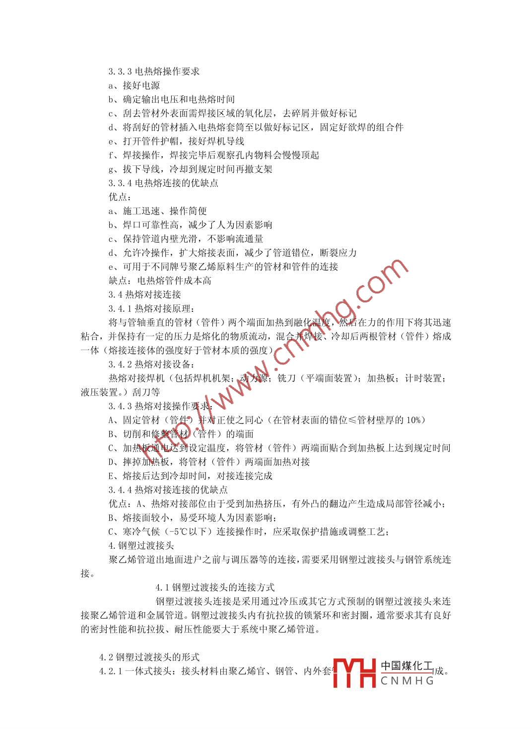 聚乙烯管道在燃氣輸配上的應用杜曉波齊齊哈爾市港華燃氣有限公司黑龍江 齊齊哈爾161000摘要:聚乙烯管道在國內(nèi)外取得相當好的社會經(jīng)濟效益,應用廣泛。其在燃氣輸配上的應用技術以相當成熟,本文就聚乙烯管道在燃氣輸配上的應用問題進行了探討。關鍵詞:聚乙烯管道;燃氣輸配;應用Abstract: polyethylene pipes madegood social and economic benefits at homeand abroad, a wide range of applications. In gas transmission and distributiontechnology is quite mature, polyethylene pipeline in gas transmission anddistribution applications.Keywords: polyethylene pipes; gas transmission and distribution; application中圖分類號: TU96. 7文獻標識碼: A文章編號: 2095- -2104 (2012)我國現(xiàn)行的《燃氣用埋地聚乙烯管材》(GB15558. 1-95)《燃氣用埋地聚乙烯管件)(GB15558.2- -95) 國家標準和《聚乙烯燃氣管道工程技術規(guī)程》(CJJ63- -95) 行業(yè)標準是針對目前國際上較多采用的第二代(PE-80) 聚乙烯燃氣管道專用料制定的。目前已有國家采用了第三代(PE-100) 聚乙烯管專用料。1.聚乙烯燃氣管材的特點聚乙烯管道用于燃氣輸配.上始于- -九五六年的美國,在此前后淘汰了醋酸一丁 酸纖維素管道、硬聚乙烯管道、環(huán)氧玻璃鋼管道、滌綸管道和尼龍管道,這是因為:1.1聚乙烯有很好的柔韌性,加工的管材可以盤管成卷,從而能使管網(wǎng)中的接頭數(shù)量減少。1.2聚乙烯可蛇行銷設,可輕易繞過障礙物進一步減少接頭數(shù)量。1. 3聚乙烯屬熱朔性所朔料,可多次加工成型、使熱熔和電熔成為可能。1.4聚乙烯有很好的耐腐蝕性,因此聚乙烯管埋地不需要防腐。1.5聚乙烯抗沖擊性能好,具有較高的斷裂伸長率。1. 6聚乙烯管具有較好的氣密性環(huán)節(jié)之一。由于燃氣管的特殊用途,使用普通的聚乙烯材質(zhì)是不能滿足特殊用途的需要,應此必須加路一定的添加劑、抗氧劑、紫外線穩(wěn)定劑是為了增強聚乙烯管道抗老性能,使其在五十年中保持良好的特性;加著色劑是為了便與其它管道區(qū)別。隨著石華工業(yè)的發(fā)展,燃氣因聚乙烯原料的發(fā)展經(jīng)歷了第一一代、第二代、第三代等,聚乙烯燃氣管道專用料的分類下表:類型長期靜液壓強度(Mpa)最低要求強度(MRS )(LTH20C 50年97. 5%)(Mpa)PE 63 (第一 -代)6.30~ 7. 996.3PE 80 (第二代)8.00^ 9.998.0PE 100 (第三代)10.0~11.1910.0PE112 (第四代)≥111.211.22.聚乙烯燃氣管材的生產(chǎn)2.1生產(chǎn)設備:2.1.1單螺桿擠出機(長經(jīng)比L/D=28、自動計量上料、溫度自動控制、壁后超聲波監(jiān)測)。2. 1.2真空定經(jīng)裝置。中國煤化工2.1.3噴淋冷卻。MYHCNMH G2. 1.4牽引裝置。2.1.5打印標準裝置。2.1.6計量卷取切割裝置。2.2工藝流程2.2.1原料準備(洪干);2. 2.2投料擠出;2.2.3冷卻定型;2.2.4牽引2. 2.5打印標記;2. 2.6計量切割;2.2. 7檢驗;2.2.8包裝。2. 3聚乙烯燃氣管的規(guī)格尺寸(mm):公稱外經(jīng)Dn壁厚e基本尺寸允許偏差SDR11工作壓力《0. 4MPaSDR11工作壓力<0. 2MPa5(+0. 44. 6+0.62.9+0.465.8+0.73.6+0.576.898.2+1.0125+0.6.11.4 .+1.37.1+0.93.聚乙烯燃氣管件的生產(chǎn)3.1電熱熔管件電熱熔管件是用某種方法將電熱絲布置與管件內(nèi)表面,施工時將管材與管件配合后,用專用的加熱溶制電源將管件的電熱絲通電加熱,使管材與管件的接觸表面熔化結合,冷卻后使管材和管件牢固緊密地結合在一起。由于施工方便快捷,焊接效果好,電熱熔管件是目前世界上聚乙烯管材連接件中最廣泛的一種。 缺點是成本高。電熱熔管件是由注塑生產(chǎn)工藝制造,各廠家都采用專利技術將電熱絲布置嵌入管件中,在使用時選擇與之匹配的焊機才能達到最佳焊接效果。3. 2熱熔對接管件熱熔對接管件是指用于加熱板對接焊的管件,對于小口徑的對接管件(DN110mm以下)-般為注射生產(chǎn),而對于大口徑管件不宜注塑生產(chǎn),-一般采用焊接方法制造以降低成本。注射管件的生產(chǎn)工藝流程:(1)原料準備(2)模具準備(3) 注射機準備..... (4)注射成型(5)檢驗(6) 包裝入庫。四、聚乙烯燃氣管道的連接方式目前聚乙烯燃氣管道的連接方式主要采用電熱熔連接和熱熔對接連接。3. 3電熱熔連接3.3.1電熱熔原理電熱熔連接是將所需的連接的管端插入埋有電熱絲的電熱熔管件中,將電阻絲通以電流,電阻絲產(chǎn)生的熱能使管采外表面和管件內(nèi)表面融化成--體,固定直至接口冷卻,從而形成牢固緊密的接頭。3.3.2電熱熔設備中國煤化工電熱熔焊機、刮到和支架等專用工具。MHCNMH G3. 3.3電熱熔操作要求a、接好電源b、確定輸出電壓和電熱熔時間c、刮去管材外表面需焊接區(qū)域的氧化層,去碎屑并做好標記d、將刮好的管材插入電熱熔套筒至以做好標記區(qū),固定好欲焊的組合件e、打開管件護帽,接好焊機導線f、焊接操作,焊接完畢后觀察孔內(nèi)物料會慢慢頂起g、拔下導線,冷卻到規(guī)定時間再撤支架3.3.4電熱熔連接的優(yōu)缺點優(yōu)點:a、施工迅速、操作簡便b、焊口可靠性高,減少了人為因素影響c、保持管道內(nèi)壁光滑,不影響流通量d、允許冷操作,擴大熔接表面,減少了管道錯位,斷裂應力e、可用于不同牌號聚乙烯原料生產(chǎn)的管材和管件的連接缺點:電熱熔管件成本高3.4熱熔對接連接3. 4.1熱熔對接原理:將與管軸垂直的管材(管件)兩個端面加熱到融化溫度,然后在力的作用下將其迅速粘合,并保持有一定的壓力是熔化的物質(zhì)流動,混合并焊接、冷卻后