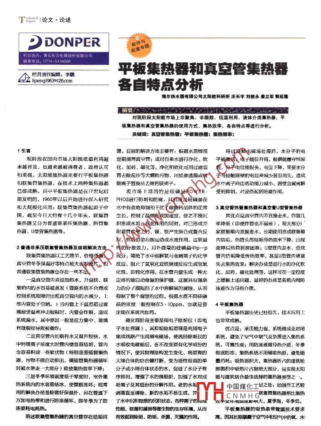 T論文·論述2DONPER件與配套專題配欄目協(xié)辦:黃石東貝電器股份有限公司聯(lián)系電話:0714-541668欄目責(zé)任編輯:李鵬平板集熱器和真管集熱器peng 963 126co備自特點(diǎn)分析海爾熱水器有限公司太陽能科研所莊長宇劉桂永姜立軍郭延隆對(duì)現(xiàn)階段太陽能市場上非聚焦、非跟蹤、低溫利用、液體介質(zhì)集熱器,平板集熱器和真空管集熱器的使用方式、集熱效率、各自特點(diǎn)等進(jìn)行分析。關(guān)鍵詞:真管集熱器;平板集熱器;集熱效率;1引言題,目前的解決方法主要有:根據(jù)水質(zhì)情況經(jīng)過高頻電磁場處理后,水分子的電現(xiàn)階段在國內(nèi)市場太陽能低溫利用越定期清理真空管;或?qū)ψ詠硭M(jìn)行凈化、軟子被激活,電子能位升高,根據(jù)能量守恒原來越普及,也越來越被消費(fèi)者、政府認(rèn)可化、加約、磁化等。凈化和軟化可用過濾裝理,分子電位能損失,電位下降,至使水分和重視。太陽能集熱器主要冇平板集熱器置去除泥沙等大顆粒污物,用反滲透膜或樹子與接觸器璧的電位斧減少甚至消失。造成和聯(lián)集管集熱器,在技術(shù)上兩種集熱器都脂離子置換法去除鈣鎂閼子。水中離子山活動(dòng)能力減小,器壁金屬閼解已很成熟。其屮平板集熱器是在7世紀(jì)后現(xiàn)市場上常用的是硅磷品 POWER受到抑制,對(duì)設(shè)備起到防腐作用。期發(fā)明的,1960年以后開始進(jìn)行深入硏究PHOS進(jìn)行防垢和防腐,其機(jī)理是砫磷晶在和大規(guī)?;瘧?yīng)用;聯(lián)集管集熱器起源于中水中有效地和制和千擾了碳酸鈣旵體的正常3真空管熱簣集熱器和真空管U型管集熱器國,截至今日大約有十幾個(gè)年頭,聯(lián)集管生長,控制了晶核形成的逑度,使之不能沉其優(yōu)點(diǎn)是真空普內(nèi)不直接走水,炸管幾集熱器又分為普通非承壓集熱器、熱管集積形成水垢;在此作用的同時(shí),對(duì)已形成并率降低(即使炸管也不漏液),現(xiàn)大部分熱器、U型曾集熱器等。附著管內(nèi)壁上鈣、鎂、鐵產(chǎn)生絡(luò)合或螯合反家聯(lián)集箱內(nèi)直接走水,長期使用造成聯(lián)集箱應(yīng),然后借助布朗運(yùn)動(dòng)或水流作用,達(dá)到最內(nèi)結(jié)垢,熱管頭部結(jié)垢導(dǎo)熱效率下降,出現(xiàn)2蓍通非承壓聯(lián)集管集熱器及緒垢解決方法終的分散效力。另外微的硅磷品中p一p故障后熱管拆卸困難;U型管內(nèi)走水,造成聯(lián)集餼集熱器以工藝簡單、價(jià)格低廉、成分,隔絕了水屮溶解氧與金屬離f的化學(xué)管內(nèi)結(jié)垢降低傳熱效率,甚至U型管內(nèi)堵塞真空臂冬季保溫好等特點(diǎn)被大面積推廣,但反應(yīng),阻止了氫氧化亞鐵繼續(xù)反應(yīng)生成氫氧失去集熱效果;解決辦法是進(jìn)行水的凈化軟普通聯(lián)集管集熱器也存在一些不足化鐵,即鈍化作用。在水管內(nèi)壁生成種無化、加藥、磁化處理等,這樣可在一定程度是真空管內(nèi)直接加熱水,升溫快,聯(lián)定形的能自動(dòng)修復(fù)的保擴(kuò)膜,這層具有強(qiáng)親上級(jí)解上述問題,最好的辦法是系統(tǒng)內(nèi)用防集粕內(nèi)的水容易被蒸發(fā)(管路系統(tǒng)不合理或力的分f膜阻擋了水中溶解氧的腐蝕,從而凍液作為導(dǎo)熱介質(zhì)??刂葡到y(tǒng)故障時(shí)出現(xiàn)真空管內(nèi)的水減少,上抑制了整個(gè)腐蝕的過程。根據(jù)水質(zhì)不同硅磷部內(nèi)管處于空曬。)當(dāng)內(nèi)眢上下溫差超過玻品的濃度般控制在5-ppm,也就是要4平板集熱器璃耐受溫差沖山極限時(shí),內(nèi)管會(huì)炸裂,造成定期在系統(tǒng)內(nèi)加藥。平板集熱器歷史已經(jīng)很久,技術(shù)應(yīng)用上系統(tǒng)漏水,其中原因一般是應(yīng)力集中、玻璃磁化現(xiàn)階段主要是用電子除垢儀(即電也非常成熟。有微裂紋導(dǎo)致被激炸;子水處理器),其抑垢除垢原理是利用電子優(yōu)點(diǎn)是:承壓能力強(qiáng),系統(tǒng)做成全封閉是真空管內(nèi)長期有水又溫升較快,水集成線路產(chǎn)生高頻電磁場,使流經(jīng)除垢儀的系統(tǒng),避免了空氣中氧氣及雜質(zhì)進(jìn)入集熱系中鈣鎂離子濃度大時(shí)管內(nèi)壁容易結(jié)垢,曾內(nèi)水吸收電磁能后,在不改變?cè)谢瘜W(xué)成份的統(tǒng),可靠性高;用防凍液做導(dǎo)熱介質(zhì),冬季也容易積淀一些絮狀物(特別是豎插管集熱情況下,使其物理結(jié)構(gòu)發(fā)生變化,將原有的徹底防凍,集熱系統(tǒng)不用輔助熱源,避免能器,污物不能自動(dòng)排出,橫插管集熱器循環(huán)大締合體的結(jié)合鍵打斷,變?yōu)榛钚院芨叩膯瘟肯?吸熱面積大,集熱器所占的建筑輪時(shí)被水帶走一大部分)致使集熱效率下降;分子或小締合體狀態(tài)的水,促進(jìn)了水分子有廓面積中吸熱片占據(jù)絕大部分,是實(shí)現(xiàn)太陽三是冬季環(huán)境溫度低于零度時(shí),室外集序排列,增強(qiáng)了水的偶極距,加強(qiáng)了水對(duì)成能與建筑結(jié)合最佳選擇的集熱器類型之一。熱系統(tǒng)內(nèi)的水容易結(jié)冰,使管路凍壞;現(xiàn)特垢離子及其組份的分解作用。老的水垢V凵中國煤化工足之處:如制作工藝較用的解決辦法是除做好保溫外,另在管道下剝落直至清除、新的水垢不易生成,并CNMHG聯(lián)集管集熱器相比集熱方加電熱帶和進(jìn)行防凍循環(huán),即冬季為了防了水中