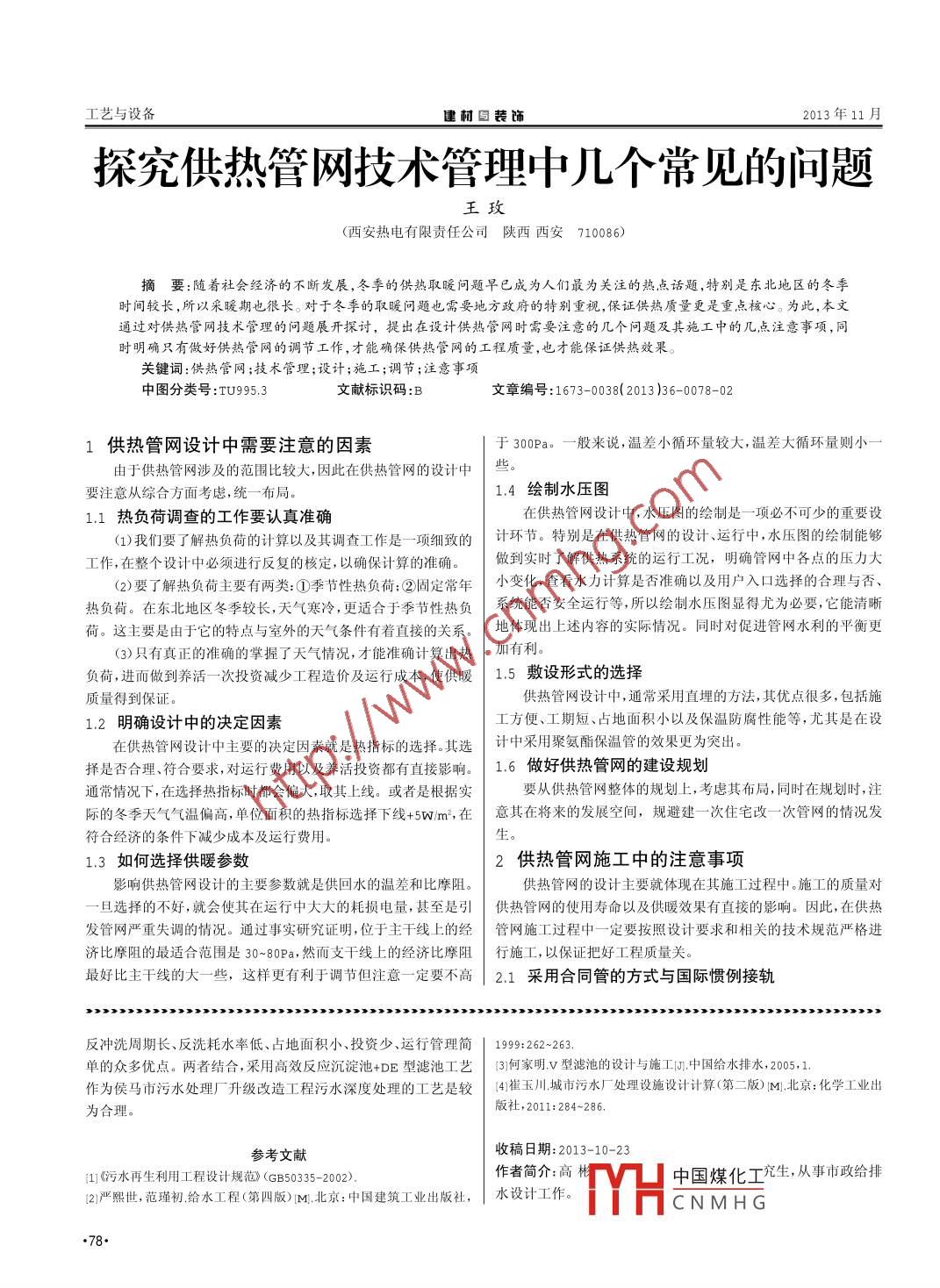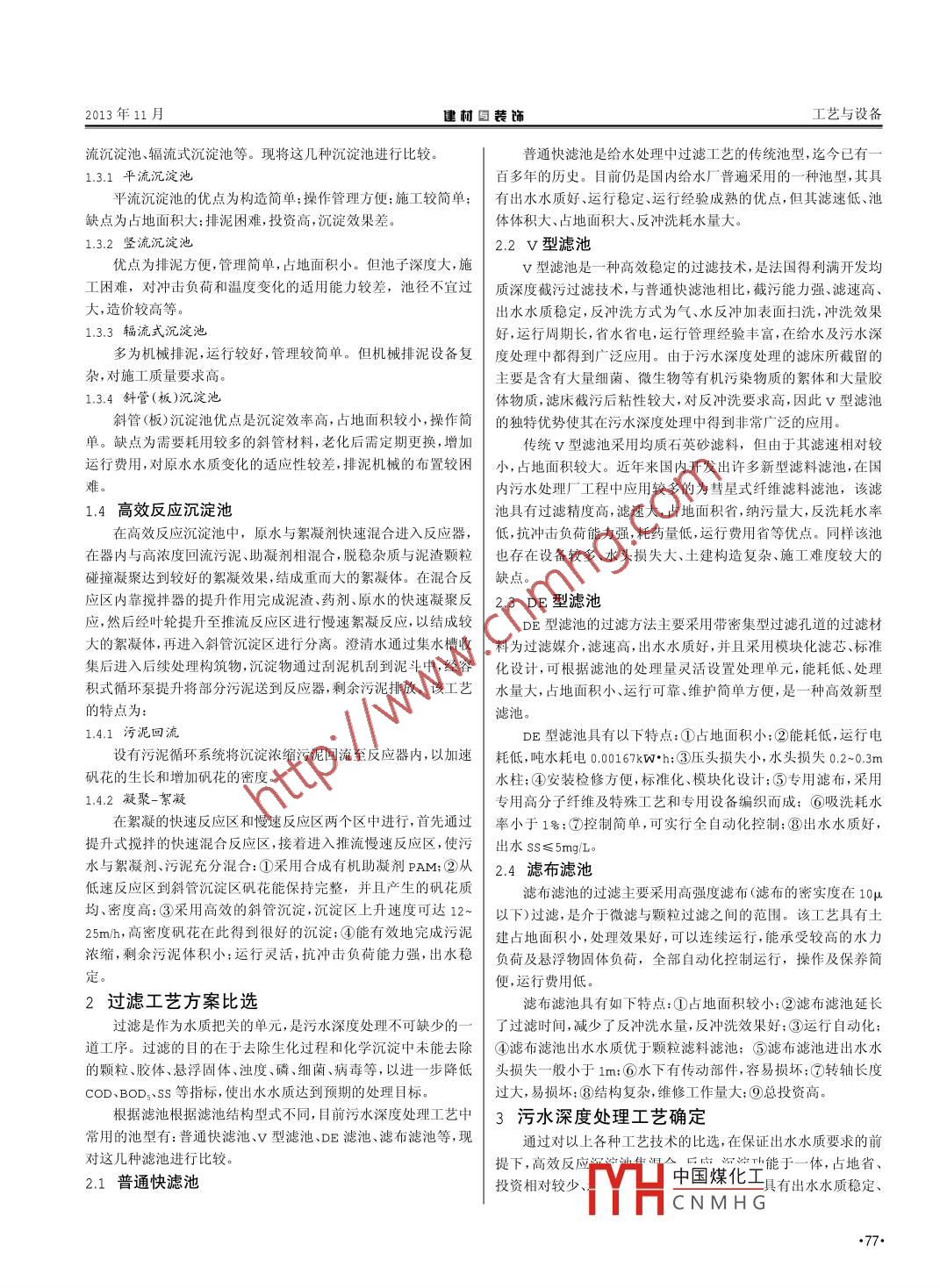 工藝與設(shè)備建材與裝飾2013年11月談侯馬市污水廠污水深度處理工藝的選擇高彬(太原市市政工程設(shè)計(jì)研究院山西 太原030002)摘要:通過對(duì)污水深度處理中混凝-沉淀-過濾工藝各種類型的比選,選擇高效反應(yīng)沉淀池+DE型濾池做為侯馬市污水廠污水深度處理的工藝。關(guān)鍵詞:污水;深度處理;沉淀;過濾中圖分類號(hào):x703.1文獻(xiàn)標(biāo)識(shí)碼:B文章編號(hào):1673-0038(2013 )36-0076-03侯馬是山西省南部一一個(gè)縣級(jí)市,位于山西南部臨汾盆地南|量變化,能使藥劑迅速而均勻的擴(kuò)散至水體中,同時(shí)使膠體顆粒端、汾河、澮河交匯處,是山西南部的商貿(mào)中心、物流中心、交通|脫穩(wěn),具有節(jié)約投藥量等特點(diǎn);需建混合池,機(jī)械維修、消耗動(dòng)樞紐和重要的區(qū)域性中心城市。侯馬市污水處理廠設(shè)計(jì)規(guī)模為|能40000m2/d, 其中一期規(guī) 模2000m/d,已于2008年10月建成并| 1.1.2 管式靜態(tài)混合器投產(chǎn)。-期工程處理工藝采用曝氣生物濾池作為核心工藝,出水設(shè)備簡單,維護(hù)管理方便,不需要土建構(gòu)筑物,不需要另加動(dòng)水質(zhì)標(biāo)準(zhǔn)執(zhí)行《城鎮(zhèn)污水處理廠污染物排放標(biāo)準(zhǔn)》(GB18918-|力設(shè)備,混合效果好:運(yùn)行水量變化影響混合效果,水頭損失較2002)中的二級(jí)標(biāo)準(zhǔn)。大為落實(shí)山西省委省政府“藍(lán)天碧水”和“汾河流域生態(tài)治理修| 1.2 絮凝復(fù)”工程部署,山西省環(huán)保廳要求汾河流域城鎮(zhèn)污水處理廠建設(shè)絮凝過程就是使具有絮凝性能的微絮粒相互碰撞,從而形成執(zhí)行(城鎮(zhèn)污水處理廠污染物排放標(biāo)準(zhǔn)》(GB18918-2002)中-級(jí)|較大的絮粒, 以適應(yīng)沉淀分離的要求。根據(jù)水質(zhì)、水量及沉淀池標(biāo)準(zhǔn)的A標(biāo)準(zhǔn)。為確保域內(nèi)汾河、澮河水質(zhì)達(dá)標(biāo),侯馬污水處理|形式 等因索確定絮凝的方式,常用的絮凝形式有旋流絮凝、折板廠需進(jìn)行升級(jí)改造,執(zhí)行-級(jí)A標(biāo)準(zhǔn)。絮凝、機(jī)械絮凝、隔板絮凝等?,F(xiàn)將這幾種絮凝形式進(jìn)行比較。在侯馬市污水處理廠升級(jí)改造中,污水生物處理部分采用了| 1.2.1 旋流絮凝改良A:/O+二級(jí)BAF濾池(DN生物濾池+C/N曝氣生物濾池)工優(yōu)點(diǎn)為池體容積小,水頭損失較小:其缺點(diǎn)為池體較深,在地藝。污水經(jīng)生物處理后,出水中COD。、BOD,SS、TP等污染物指|。下 水位較高處施工較困難,絮凝效果較差, 它適用于中小型工標(biāo)仍不能滿足目標(biāo)水質(zhì)要求,需在生物處理后增加深度處理工|程 。藝。深度處理工藝的選擇主要是根據(jù)進(jìn)水水質(zhì)及出水水質(zhì)指標(biāo)| 1.2.2 折板絮凝要求來確定。本工程深度處理進(jìn)水水質(zhì)和出水水質(zhì)指標(biāo)見表1。它是利用在池中加設(shè)-.些折流單元以達(dá)到絮凝所要求的紊表1污水深度處理進(jìn)、出水水質(zhì)指標(biāo)流狀態(tài),使能量損失得到充分利用,能耗與藥耗有所降低,停留項(xiàng)目COD BODs ss TN NHJ-N Tl時(shí)間縮短。折板絮凝池的缺點(diǎn)為造價(jià)較高,只適用于水量變化不設(shè)計(jì)進(jìn)水水質(zhì)(mg/L)≤60|_≤20 ≤20 ≤15|≤5_ 1.設(shè)計(jì)出水水質(zhì)(mg/L)≤50|≤10| ≤10| ≤15|_ ≤ 5|≤ 0.5大的工程。根據(jù)污水再生利用工程設(shè)計(jì)規(guī)范》(GB50335 2002)給出的1.2.3 機(jī)械絮凝深度處理單元技術(shù)的處理效率及目標(biāo)水質(zhì)要求,混凝沉淀-過優(yōu)點(diǎn)為反應(yīng)效果好,水頭損失小,絮凝時(shí)間約為12~15min。濾工藝即可滿足深度處理出水水質(zhì)要求。以下對(duì)混凝-沉淀過|由于增加了 機(jī)械設(shè)備,攪拌漿的轉(zhuǎn)速調(diào)整可適應(yīng)不同的水量和濾的各單元技術(shù)進(jìn)行比選。水質(zhì),但對(duì)機(jī)械設(shè)備質(zhì)量要求較高,機(jī)械設(shè)備維護(hù)量大,管理比1混合、反應(yīng)及沉淀工藝單元比選較復(fù)雜,機(jī)械設(shè)備投資高,運(yùn)行費(fèi)用大。1.2.4網(wǎng)格絮凝1.1混合混合是將混凝劑的水解產(chǎn)物迅速混合到水體的每--個(gè)細(xì)部,網(wǎng)格絮凝是應(yīng)用紊流理論的絮凝池。絮凝池分成許多面積相并使水中膠體顆粒脫穩(wěn)的過程?;旌鲜沁M(jìn)行絮凝和沉淀的重要等的方格,水流.上下交錯(cuò)流動(dòng),直至出口,在全池約213的分格內(nèi),垂直水流方向放置網(wǎng)格,通過網(wǎng)格時(shí)水流收縮,過網(wǎng)孔后水前提。混合方式分為水力和機(jī)械兩大類,前者無需機(jī)械維修,后者流擴(kuò)大,形成了良好的絮凝條件,從而降低凝聚劑量并縮短絮凝能適應(yīng)各種流量的變化?;旌戏绞接性S多種,如機(jī)械混合、管式時(shí)間。1.3沉淀靜態(tài)混合器.水泵混合、混凝池混合等,現(xiàn)對(duì)常用的兩種混合方.沉淀工藝是指在重力作用下懸浮固體從水中沉降分離的過式進(jìn)行比較。1.1.1機(jī)械混合程,它擔(dān)負(fù)著去' 中國煤化工作用,是主要的水處混合均勻,基本不受流量變化影響,水頭損失小,適應(yīng)各種流理工藝之-THCNMHG斜管(板)沉淀池、豎.76.2013年11月建材⑤裝飾工藝與設(shè)備流沉淀池.輻流式沉淀池等?,F(xiàn)將這幾種沉淀池進(jìn)行比較。普通快濾池是給水處理中過濾