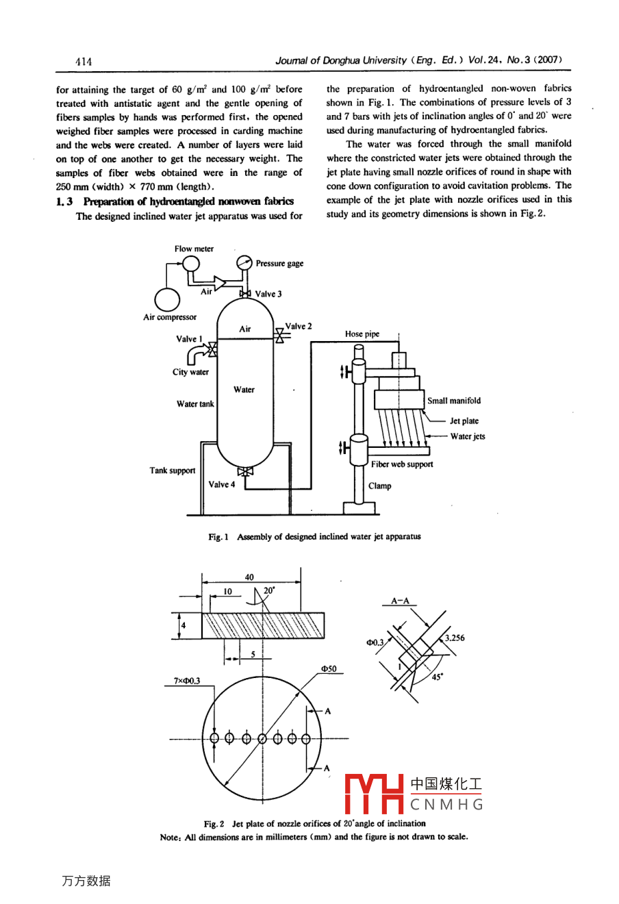 Joumal of Donghua University (Eng. Ed.) Vol.24. No.3 (2007) 4 13Effect of Inclined Water Jets on Tensile Strength of BicomponentHydroentangled Nonwoven FabricsMBWANA Suleiman Ndaro, JIN Xiang-yu(靳向煜), CHEN Ting(陳廷), YU Chong-wen (郁崇文)College of Tertiles, Donghua University, Shanghai 201620, ChinaAstract: The efects of inclined water jets on bicomponentydroentanglement efficiencyu. Many works have been donehydroentangled fabrics were investigated. The PET/COPETby reserches'1-1-]-1) to improve the flow charusterstics ofand PA6/PET hydroentangled fabrics were made by usingwater jets, which gives impact on the increase ofdesigned inclined water jet apparatus. Effects of basishydroentangled fabrics strength. Hwo C C and Shiffler Dweight, water jets inclination angle and water jet pressureA[I4 conducted the study on the mechanical properties ofwere discussed. The comparison was made o the averagepolytrimethylene terephthalete ( PTT ) hydroentangledtensile strength of fabrics made by perpendicular water jetsbonded fabrics and they concluded that break strength,(0° inclination angle) and inclined water jets of 20° withbreak elongation, tear strength have been developed atpressure levels of 3 bars and 7 bars. It was found thatvery low specific energy levels at 40 kJ/kg due to finenessincreases of water jet pressure, the fabrics tensile strengthof PTT fiber. Berkalp 0 B, Pourdeyimi B, and Seyami Awere increased. Furthermore, increases of water jets[15] made a study on texturing of the polyesterinclination angle, fabric tensile strength of 60 g/m2 fabricshydroentangled fabrics and concluded that water jetdecreased while for 100 g/m2 fabrics tensile strengthpressure has a marked effect and there are optimumincreased.pressures, passes, and energy to be considered duringKey words: inclined wuter jets; tensile strength ; hyxlrvemungledhydroentanglement. However studies mentioned abovefabrics; pie segmented fibers; isuands- in - the - seu fiberswere used perpendicular vertical water jets. Recently, withCLC number; TS 174.1 Document code: Athe high quality, diversity of fiber products, anddevelopment of nonwovens applications demand forArticle ID: 1672 - 5220(2007)03 - 0413- 06bicomponent fibers in the fields of synthetic fibers and non-woven fabrics have been increasing. While previousIntroductionresearch addressed the effect of pressure, specific energy,forming wire and web velocity on fabric performance nowork in public domain has been reported in the use ofHydroentanglement is basically an energy transfer processand water jets are acting perpendicularly to the fiber web.inclined water jets for hydroentanglement of bicomponentfibers. In this study we have tested the tensile strength ofHigh velocity water jets insert fibers from the surface into thehydroentangled fabrics and make a comparison betweenbodly of the fibrous web and entangle the inserted fibers aroundother fibers and themselves due to local turbulent energyfabrics produced by perpendicular and inclined water jets.To attain this goal the inclined water jet apparatus wasreleased by the deflection and interruption of the jets [1-5]。Theorigin of hydroentanglement technique dutes back to the latedesigned and used to make hydroentangled nonwovenfabrics.1960's when DuPont showed samples of their proprietary workdone in their research center.In 1974 DuPont launched their first hydroentanglementExperimentalproduction line in Tennessee of USA1L148]. Hydroentangledfabrics are being characterized by relatively high strength,1.1 MaterialThe fibers used in this study were islands in-the-seasoftness, drape, conformability and aesthetic closelyapproaching woven and knitted fabrisl-.,0]. The strengthbicomponent fiber (70% PET/30% COPET) of 37 PETof hydroentangled nonwovens depends on fiber types andislands and linear density of 4 dtex and the second is pietheir properties, web formation, web consolidation ansegmented bicomponent fiber (70% PA6/30% PET) of 8finishing technique while their weakness are due to bondsegments and linear density of 2.77 dtex.failure, fiber rupture and fiber sippag.1.3.10. Tensile1.2 Preparation of carded fiber websstrength has been considered to be the main property forThe_ carded webs. were. produced using conventionalhydroentangled fabrics and it has been used as a measure of samp中國煤化工amples were weighedTYHCNMHGReceived date; 2006- 06 -21.Biography: Mbwana Sulciman Ndaro, male, Ph. D Candidate, E-mail: mbwanasul @ yahoo. co. uk414Joumal of Donghua University (Eng. Ed.) Vol. 24, No.3 (2007)for attaining the target of 60 g/m2 and 100 g/m2 beforethe preparation of hydroentiangled non-woven fabricstreated with antistatic agent and the gentle opening ofshown in Fig. 1. The combinations of pressure levels of 3fibers samples by hands was performed first, the openedand 7 bars with jets of inclination anglesof0" and 20^ wereweighed fiber samples were processed in carding machineused during manufacturing of hydroentangled fabrics.and the webs were created. A number of layers were laidThe water was forced through the small manifoldon top of one another to get the necessary weight. Thewhere the constricted water jets were obtained through thesamplcs of fiber webs obtained were in the range ofjet plate having small nozzle orifices of round in shape with250 mm (width) x 770 mm (length).cone down configuration to avoid cavitation problems. The1.3 Preparation of hydroentangled nonwoven fabricsexample of the jet plate with nozzle orifices used in thisThe designed inclined water jet apparatus was used forstudy and its geometry dimensions is shown in Fig.2.Flow meter) Pressure gageirh業(yè)Valve 3Air compressorir, Valve 2Hose pipeValve I岳City waterWaterWater tank| Small manifldJet plateWater jetsI Fiber web supportTank supporValve 4ClampFig.1 Assembly of designed inclined water jet apparatus400( 20°_A-A|43.256φ5015°7x中0.3φφ由如由由白中國煤化工MHCNMHGFig.2 Jet plate of nozzle orifices of 20 angle o