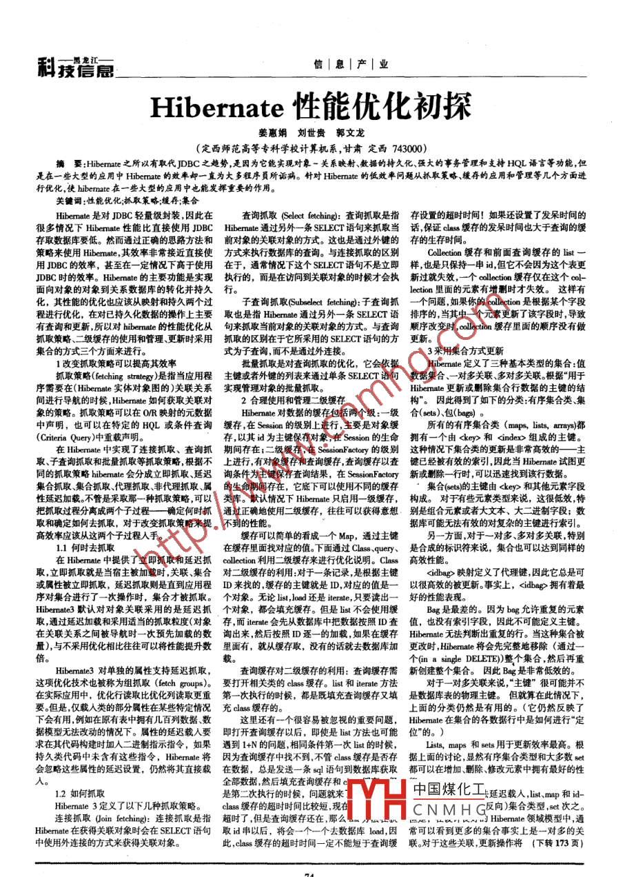 科技信息.信|息|產(chǎn)|業(yè)Hibernate性能優(yōu)化初探姜惠娟劉世貴郭文龍(定西師范高等??茖W(xué)校計(jì)算機(jī)系,甘肅定西743000)摘要:Hibemate 之所以有取代JDBC之趨勢(shì),是因?yàn)樗軐?shí)現(xiàn)對(duì)象-關(guān)系映射、數(shù)據(jù)的持久化、強(qiáng)大的事務(wù)管理和支持HQL語(yǔ)言等功能,但是在一些大型的應(yīng)用中Hibermate的效率卻-直為大多程序員所詬病。針對(duì)Hibermate的低效率問題從抓取策略、緩存的應(yīng)用和管理等幾個(gè)方面進(jìn)行優(yōu)化,使hibenate在一些大型的應(yīng)用中也能發(fā)揮重要的作用。關(guān)鍵詞:性能優(yōu)化;抓取策略;緩存;集合Hibernate 是對(duì)JDBC輕量級(jí)封裝,因此在查詢抓取(Selet feching): 查詢抓取是指存設(shè)置的超時(shí)時(shí)間! 如果還設(shè)置了發(fā)呆時(shí)間的很多情況下Hibermate性能比直接使用JDBC Hibermate 通過(guò)另外一條SELECT語(yǔ)句來(lái)抓取當(dāng)話 ,保證chass 緩存的發(fā)呆時(shí)間也大于查詢的緩存取數(shù)據(jù)庫(kù)要低。然而通過(guò)正確的思路方法和前對(duì)象的關(guān)聯(lián)對(duì)象的方式。 這也是通過(guò)外鍵的存的生存時(shí)間。策略來(lái)使用Hibermate ,其效率非常接近直接使方式來(lái)執(zhí)行數(shù)據(jù)庫(kù)的查詢。 與連接抓取的區(qū)別Collectionn 緩存和前面查詢緩存的list一用JDBC的效率,甚至在-定情況下高于使用在于, 通常情況下這個(gè)SELECT語(yǔ)句不是立即樣 ,也是只保持- -申 id,但它不會(huì)因?yàn)檫@個(gè)表更JDBC時(shí)的效率。Hibemate 的主要功能是實(shí)現(xiàn)執(zhí)行的, 而是在訪問到關(guān)聯(lián)對(duì)象的時(shí)候才會(huì)執(zhí)新過(guò)就失效,- -個(gè)clletieol緩存僅在這個(gè)col-面向?qū)ο蟮膶?duì)象到關(guān)系數(shù)據(jù)庫(kù)的轉(zhuǎn)化并持久行。lection里面的元素有增刪時(shí)才失效。這樣有化,其性能的優(yōu)化也應(yīng)該從映射和持久兩個(gè)過(guò)子查淘抓取(Subselect feching): 子查詢抓一個(gè)問題,如果你的clctienl是根據(jù)某個(gè)字段程進(jìn)行優(yōu)化,在對(duì)已持久化數(shù)據(jù)的操作上主要取也是指 Hibernate通過(guò)另外-條SELECT語(yǔ)排序的, 當(dāng)其中- -個(gè)元素更新了該字段時(shí),導(dǎo)致有查詢和更新,所以對(duì)hibernate的性能優(yōu)化從句來(lái)抓取 當(dāng)前對(duì)象的關(guān)聯(lián)對(duì)象的方式。與查詢順序 改變時(shí),lctio緩存里面的順序沒有做抓取策略、二級(jí)緩存的使用和管理、更新時(shí)采用抓取的區(qū)別在于它所采用的 SELECT語(yǔ)句的方更新。集合的方式三個(gè)方面來(lái)進(jìn)行。式為子查詢,而不是通過(guò)外連接。3采用集合方式更新1改變抓取策略可以提高其效率批量抓取是對(duì)查詢抓取的優(yōu)化,它會(huì)依據(jù)Hibenate 定義了三種基本類型的集合:值抓取策略(elching strategy )是指當(dāng)應(yīng)用程主鍵或者外鍵的列表來(lái)通過(guò)單條 SELECT語(yǔ)句數(shù)據(jù)集合 .- -對(duì)多關(guān)聯(lián)多對(duì)多關(guān)聯(lián)。根據(jù)“用于序需要在( Hibernate實(shí)體對(duì)象圖的)關(guān)聯(lián)關(guān)系實(shí)現(xiàn)管理對(duì)象的批量抓取。Hibernate 更新或刪除集合行數(shù)據(jù)的主鍵的結(jié)間進(jìn)行導(dǎo)航的時(shí)候, Hibenate如何獲取關(guān)聯(lián)對(duì)2合理使用和管理二級(jí)緩存構(gòu)”。因此得到了如下的分類:有序集合類、集象的策略。抓取策略可以在O/R映射的元數(shù)據(jù)Hibernate 對(duì)數(shù)據(jù)的緩存包括兩個(gè)級(jí):- -級(jí)合(sets)、包(begs) 。中聲明,也可以在特定的HQL或條件查詢緩存 ,在Sesion的級(jí)別上進(jìn)行,主要是對(duì)象緩所有的有序集合類 (maps, lists, aray)都(Criteria Query)中重載聲明。存,以其id為主鍵保存對(duì)象,在Session的生命擁有一 個(gè)由