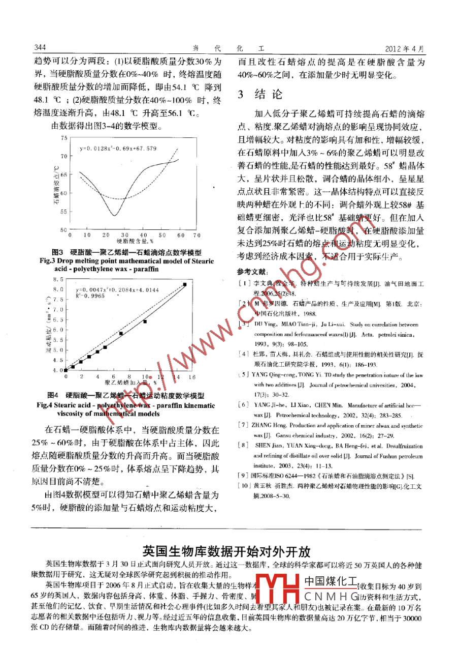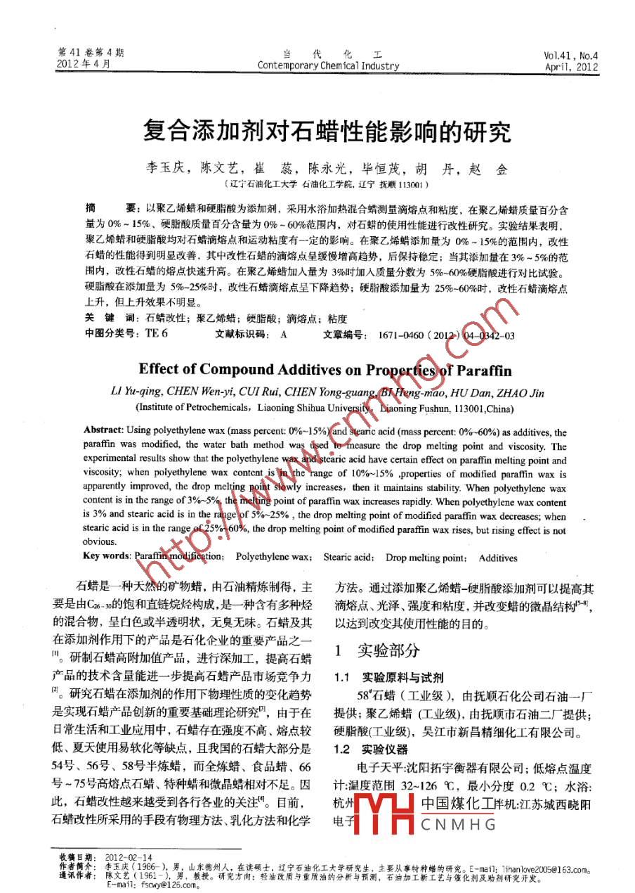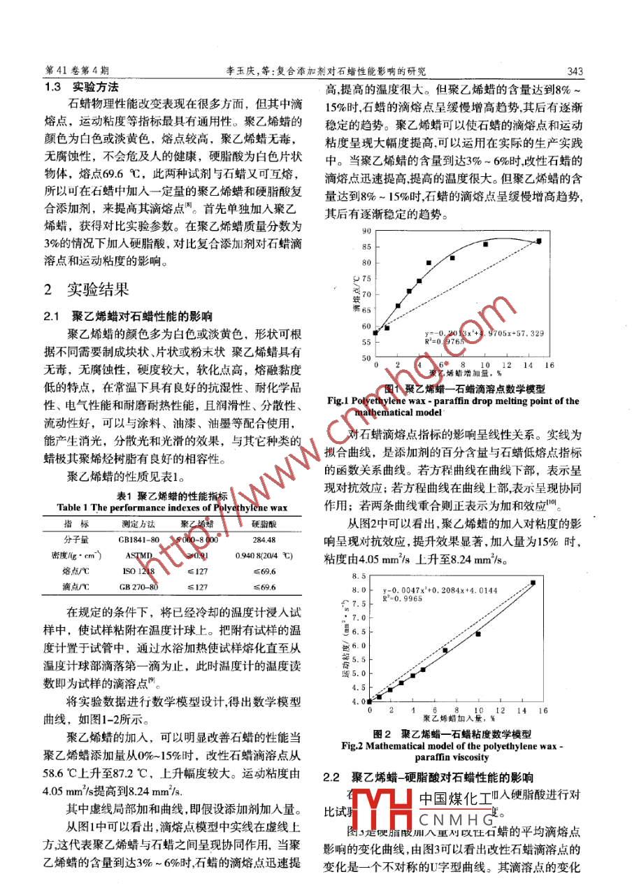 第41卷第4期Vvo1.41, No.4 .2012年4月Contemporary Chemical IndustryApril, 2012復(fù)合添加劑對石蠟性能影響的研究李玉慶,陳文藝,崔蕊,陳永光,畢恒茂,胡丹,趙金(遼寧石油化工大學(xué)石油化工學(xué)院,遼寧撫順1001 )要:以聚乙烯蠟和硬脂酸為添加劑,采用水浴加熱混合蠟測量滴熔點和粘度,在聚乙烯蠟質(zhì)量百分含量為0%- 15%、硬脂酸質(zhì)量百分含量為0% ~ 60%范圍內(nèi),對石蠟的使用性能進(jìn)行改性研究。實驗結(jié)果表明,聚乙烯蠟和硬脂酸均對石蠟滴熔點和運(yùn)動粘度有-定的影響。在聚乙烯蠟添加量為0% ~ 15%的范圍內(nèi),改性石蠟的性能得到明顯改善,其中改性石蠟的滴熔點呈緩慢增高趨勢,后保持穩(wěn)定;當(dāng)其添加量在3% ~ 5%的范圍內(nèi),改性石蠟的熔點快速升高。在聚乙烯蠟加入量為3%時加入質(zhì)量分?jǐn)?shù)為5%- 60%硬脂酸進(jìn)行對比試驗。硬脂酸在添加量為5% -25%時,改性石蠟滴熔點呈下降趨勢;硬脂酸舔加量為25%- 60%時,改性石蠟滴熔點上升,但上升效果不明顯。關(guān)鍵詞:石蠟改性;聚乙烯蠟;硬脂酸;滴熔點;粘度中圖分類號: TE 6文獻(xiàn)標(biāo)識碼: A文章編號: 1671-0460 (2012 ) 04- 0342-03Effect of Compound Additives on Properties of ParaffinLI Yu-qing, CHEN Wen-yi, CUI Rui, CHEN Yong guang, BI Heng mao, HU Dan, ZHAO Jin(Institute of Petrochemicals, Liaoning Shihua University, Liaoning Fushun, 113001,China)Abstract: Using polyethylene wax (mass percent: 0%~-15%) and stearic acid (mass percent: 0%-60%) as additives, theparafin was modified, the water bath method was used to measure the drop melting point and viscosity. Theexperimental results show that the polyethylene wax and stearic acid have certain effect on paraffin meling point andviscosity; when polyethylene wax contcnt is in the range of 10%~15% ,properties of moified paraffin wax isapparenty improved, the drop meling point slowly increases, then it maintains stabiliy. When polyethylene waxcontent is in the range of 3%~5%, the melting point of parafin wax increases rapidly. When polyethylene wax contentis 3% and stearic acid is in the range of 5%~ 25% , the drop melting point of modifed paraffin wax decreases; whenstearic acid is in the range of25%~ 60%, the drop melting point of modified paraffin wax rises, but rising efect is notobvious.Key words: Paraffn modictio; Polyethylene wax; Stearic acid: Drop meling point: Additives石蠟是-一種天然的礦物蠟,由石油精煉制得,主方法。 通過添加聚乙烯蠟-硬脂酸添加劑可以提高其要是由Cs- 3o的飽和直鏈烷烴構(gòu)成,是一種含有多種烴滴熔點、光澤、強(qiáng)度和粘度,并改變蠟的微晶結(jié)構(gòu)別,的混合物,呈白色或半透明狀,無臭無味。石蠟及其以達(dá)到改變其使用性能的目的。在添加劑作用下的產(chǎn)品是石化企業(yè)的重要產(chǎn)品之-1實驗部分"。研制石蠟高附加值產(chǎn)品,進(jìn)行深加工,提高石蠟產(chǎn)品的技術(shù)含量能進(jìn)-步提高石蠟產(chǎn)品市場競爭力1.1 實驗原料 與試劑風(fēng)。研究石蠟在添加劑的作用下物理性質(zhì)的變化趨勢58"石蠟(工業(yè)級),由撫順石化公司石油- -廠是實現(xiàn)石蠟產(chǎn)品創(chuàng)新的重要基礎(chǔ)理論研究",由于在提供;聚乙烯蠟(工業(yè)級),由撫順市石油二廠提供;日常生活和工業(yè)應(yīng)用中,石蠟存在強(qiáng)度不高、熔點較硬脂酸(工業(yè)級),吳江市新昌精細(xì)化工有限公司。低、夏天使用易軟化等缺點,且我國的石蠟大部分是1.2實驗儀器54號、56號、58號半煉蠟,而全煉蠟、食品蠟、66電子天平:沈陽拓宇衡器有限公司;低熔點溫度號~ 75號高熔點石蠟、特種蠟和微晶蠟相對不足。因計:溫度范圍32~126 C,最小分度0.2 C;水浴:此,石蠟改性越來越受到各行各業(yè)的關(guān)注'。目前,杭州中國煤化工伴機(jī):江蘇城西曉陽石蠟改性所采用的手段有物理方法.乳化方法和化學(xué)電子:YHCNMHG收稿日期: 2012-02-14作者簡介:本玉慶(1966 );男,山東德州人,在讀碩士。遼寧石油化工大學(xué)研究生,,主要從事特種蠟的研究。E-mi1: 1ninove00516.m.o通訊作者:陳文藝(1961-)男,教授。研究方向:輕油改質(zhì)與重質(zhì)油的分析與預(yù)測,石油加工新工藝與催化劑及助劑研究開發(fā)。com。第41卷第4期李玉慶,等:復(fù)合添加劑對石蠟性能影響的研究3431.3 實驗方法高,提高的溫度很大。但聚乙烯蠟的含量達(dá)到8% ~石蠟物理性能改變表現(xiàn)在很多方面,但其中滴15%時,石蠟的滴熔點呈緩慢增高趨勢,其后有逐漸熔點,運(yùn)動粘度等指標(biāo)最具有通用性。聚乙烯蠟的穩(wěn)定的趨勢。聚乙烯蠟可以使石蠟的滴熔點和運(yùn)動顏色為白色或淡黃色,熔點較高,聚乙烯蠟無毒,粘度呈現(xiàn)大幅度提高,可以運(yùn)用在實際的生產(chǎn)實踐無腐蝕性,不會危及人的健康,硬脂酸為白色片狀中。當(dāng)聚乙烯蠟的含量到達(dá)3% ~ 6%時,改性石蠟的物體,熔點69.6 C,此兩種試劑與石蠟又可互熔,滴熔點迅速提高提高的溫度很大。但聚乙烯蠟的含所以可在石蠟中加入- -定量的聚乙烯蠟和硬脂酸復(fù)量達(dá)到8% ~ 15%時,石蠟的滴熔點呈緩慢增高趨勢,合添加劑,來提高其滴熔點"。首先單獨加入聚乙其后有逐漸穩(wěn)定的趨勢。烯蠟,獲得對比實驗參數(shù)。在聚乙烯蠟質(zhì)量分?jǐn)?shù)為903%的情況下加入硬脂酸,對比復(fù)合添加劑對石蠟滴85溶點和運(yùn)動粘度的影響。ρ752實驗結(jié)果70 te 65'2.1 聚乙烯蠟對石蠟性能的影響聚乙烯蠟的顏色多為白色或淡黃色,形