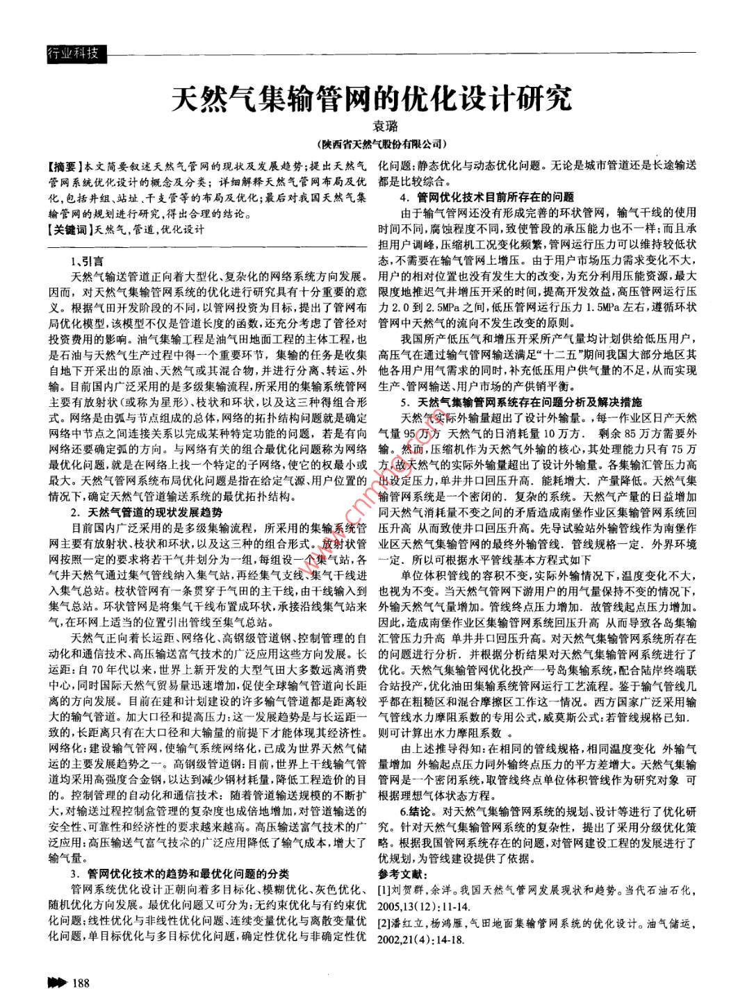 行業(yè)科技天然氣集輸管網(wǎng)的優(yōu)化設(shè)計研究袁璐(陜西省天然氣股份有限公司)[摘要]本文簡要敘述天然氣管網(wǎng)的現(xiàn)狀及發(fā)展趨勢;提出天然氣化問題: 靜態(tài)優(yōu)化與動態(tài)優(yōu)化問題。無論是城市管道還是長途輸送管網(wǎng)系統(tǒng)優(yōu)化設(shè)計的概念及分類;詳細解釋天然氣管網(wǎng)布局及優(yōu)都是比較綜合。化,包括井組.站址.干支管等的布局及優(yōu)化;最后對我國天然氣集4.管網(wǎng)優(yōu)化技術(shù)目前所存在的問題輸管網(wǎng)的規(guī)劃進行研究,得出合理的結(jié)論。由于輸氣管網(wǎng)還沒有形成完善的環(huán)狀管網(wǎng),輸氣干線的使用[關(guān)鍵詞]天然氣,管道,優(yōu)化設(shè)計時間不同,腐蝕程度不同,致使管段的承壓能力也不一樣;而且承擔(dān)用戶調(diào)峰,壓縮機工況變化頻繁,管網(wǎng)運行壓力可以維持較低狀1、引言態(tài),不需要在輸氣管網(wǎng)上增壓。由于用戶市場壓力需求變化不大,天然氣輸送管道正向著大型化、復(fù)雜化的網(wǎng)絡(luò)系統(tǒng)方向發(fā)展。用戶 的相對位置也沒有發(fā)生大的改變,為充分利用壓能資源,最大因而,對天然氣集輸管網(wǎng)系統(tǒng)的優(yōu)化進行研究具有十分重要的意限度地推遲氣井增壓開采的時間,提高開發(fā)效益,高壓管網(wǎng)運行壓義。根據(jù)氣田開發(fā)階段的不同,以管網(wǎng)投資為目標(biāo),提出了管網(wǎng)布力2.0到2.5MPa之間,低壓管網(wǎng)運行壓力1. 5MPa左右,遵循環(huán)狀局優(yōu)化模型,該模型不僅是管道長度的函數(shù),還充分考慮了管徑對管網(wǎng)中天然氣的流 向不發(fā)生改變的原則。投資費用的影響。油氣集輸工程是油氣田地面工程的主體工程,也我國所產(chǎn)低壓氣和增壓開采所產(chǎn)氣量均計劃供給低壓用戶,是石油與天然氣生產(chǎn)過程中得一個重要環(huán)節(jié),集輸?shù)娜蝿?wù)是收集高壓 氣在通過輸氣管網(wǎng)輸送滿足“十二五”期間我國大部分地區(qū)其自地下開采出的原油、天然氣或其混合物,并進行分離、轉(zhuǎn)運、外他各用戶用氣需求的同時,補充低壓用戶供氣量的不足,從而實現(xiàn)輸。目前國內(nèi)廣泛采用的是多級集輸流程,所采用的集輸系統(tǒng)管網(wǎng)生產(chǎn) 、管網(wǎng)輸送、用戶市場的產(chǎn)供銷平衡。主要有放射狀(或稱為星形)、枝狀和環(huán)狀,以及這三種得組合形5.天然氣集輸管網(wǎng)系統(tǒng)存在問題分析及解決措施式。網(wǎng)絡(luò)是由弧與節(jié)點組成的總體,網(wǎng)絡(luò)的拓撲結(jié)構(gòu)問題就是確定天然氣實際外輸量超出了設(shè)計外輸量。,每一-作業(yè)區(qū)日產(chǎn)天然網(wǎng)絡(luò)中節(jié)點之間連接關(guān)系以完成某種特定功能的問題,若是有向氣量95萬方天然氣的日消耗量10萬方,剩余 85萬方需要外網(wǎng)絡(luò)還要確定弧的方向。與網(wǎng)絡(luò)有關(guān)的組合最優(yōu)化問題稱為網(wǎng)絡(luò)輸。 然而,壓縮機作為天然氣外輸?shù)暮诵?其處理能力只有75萬最優(yōu)化問題,就是在網(wǎng)絡(luò)上找一個特定的子網(wǎng)絡(luò),使它的權(quán)最小或方,故天然氣的實際外輸量超出了設(shè)計外輸量。各集輸匯管壓力高最大。天然氣管網(wǎng)系統(tǒng)布局優(yōu)化問題是指在給定氣源、用戶位置的出設(shè)定壓力, 單井井口回壓升高,能耗增大,產(chǎn)量降低。天然氣集情況下,確定天然氣管道輸送系統(tǒng)的最優(yōu)拓撲結(jié)構(gòu)。輸管網(wǎng)系統(tǒng)是一個密閉的,復(fù)雜的系統(tǒng)。天然氣產(chǎn)量的日益增加2.天然氣管道的現(xiàn)狀發(fā)展趨勢同天然氣消耗量不變之間的矛盾造成南堡作業(yè)區(qū)集輸管網(wǎng)系統(tǒng)回目前國內(nèi)廣泛采用的是多級集輸流程,所采用的集輸系統(tǒng)管壓升高 從而致使井口回壓升高。先導(dǎo)試驗站外輸管線作為南堡作網(wǎng)主要有放射狀、枝狀和環(huán)狀,以及這三種的組合形式。放射狀管業(yè)區(qū)天然 氣集輸管網(wǎng)的最終外輸管線.管線規(guī)格- -定. 外界環(huán)境網(wǎng)按照一-定的要求將若干氣井劃分為一組, 每組設(shè)一一個集氣站,各 - -定,所以可根據(jù)水平管線基本方程式如下氣井天然氣通過集氣管線納入集氣站,再經(jīng)集氣支線、集氣干線進單位體積管線的容積不變,實際外輸情況下,溫度變化不大,入集氣總站。枝狀管網(wǎng)有一條貫穿于氣田的主干線,由干線輸入到也視為不變。 當(dāng)天然氣管網(wǎng)下游用戶的用氣量保持不變的情況下,集氣總站。環(huán)狀管網(wǎng)是將集氣干線布置成環(huán)狀,承接沿線集氣站來外輸天然氣氣量增加。 管線終點壓力增加.故管線起點壓力增加。氣,在環(huán)網(wǎng)上適當(dāng)?shù)奈恢靡龉芫€至集氣總站。因此,造成南堡作業(yè)區(qū)集輸管網(wǎng)系統(tǒng)回壓升高從而導(dǎo)致各島集輸天然氣正向著長運距、網(wǎng)絡(luò)化、高鋼級管道鋼、控制管理的自匯管壓力升高 單井井口回壓升高。對天然氣集輸管網(wǎng)系統(tǒng)所存在動化和通信技術(shù)、高壓輸送富氣技術(shù)的廣泛應(yīng)用這些方向發(fā)展。長的問題進行分析. 并根據(jù)分析結(jié)果對天然氣集輸管網(wǎng)系統(tǒng)進行了運距:自70年代以來,世界上新開發(fā)的大型