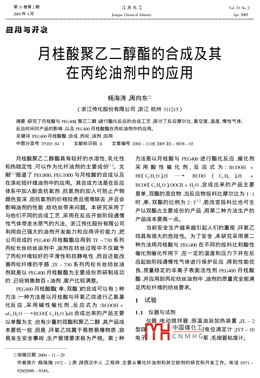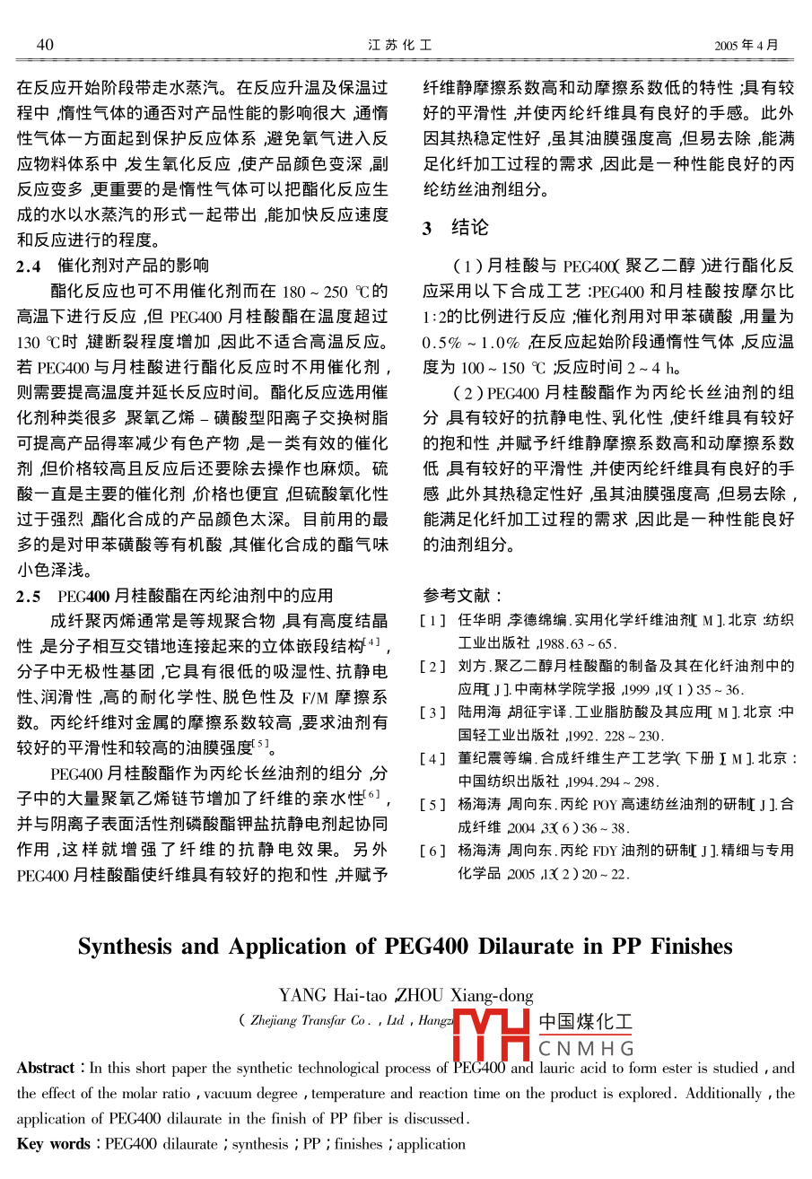 第33卷第2期江蘇化工Vol.33 No.22005年4月Jiangsu Chemical IndustryApr. 2005應(yīng)用與洴發(fā)月桂酸聚乙二醇酯的合成及其在丙綸油劑中的應(yīng)用.楊海濤,周向東①(浙江傳化股份有限公司浙江杭州311215)摘要研究了月桂酸與PEG400( 聚乙二醇)進(jìn)行酯化反應(yīng)的合成工藝探討了反應(yīng)摩爾比、真空度、溫度、惰性氣體、反應(yīng)時(shí)間對(duì)產(chǎn)品的影響以及PEC400月桂酸酯在丙綸油劑中的應(yīng)用。關(guān)鍵詞PEG400月桂酸酯合成丙綸油劑應(yīng)用中圖分類號(hào):TS103 .84* 1.文獻(xiàn)標(biāo)識(shí)碼A文章編號(hào):1002- 1116( 2005 )2- 0038-03.月桂酸聚乙二醇酯具有較好的水溶性、乳化性方法是以月桂酸與PEC400 進(jìn)行酯化反應(yīng),催化劑和熱穩(wěn)定性,可以作為化纖油劑的主要成份1。文采用酸性催化劑,反應(yīng)式為:RCOOH +獻(xiàn)2]報(bào)道了PEG800、PEG1000與月桂酸的合成以及HO( CH4O )HRC0O ( C2H )H在滌綸短纖維油劑中的應(yīng)用。其合成方法是在反應(yīng)RC0O( C;HO )00CR+ H2O ,合成出來的產(chǎn)品主要體系中加入酚類抗氧劑抗氧劑的加入可防止產(chǎn)物是單、雙酯的混合物,當(dāng)反應(yīng)物投料比摩爾比為1:1顏色變深,但抗氧劑的價(jià)格較貴且很難除去并且會(huì)時(shí)單、雙酯的比例為2:143] ,若改變投料比也可生影響油劑的性能,給紡絲帶來問題。本研究采用了產(chǎn)以雙酯占主要成份的產(chǎn)品用第二種方法生產(chǎn)的與他們不同的合成工藝,采用在反應(yīng)開始階段通惰產(chǎn)品成本要高一點(diǎn)。 ,性氣體帶走水蒸氣的方法。浙江傳化股份有限公司當(dāng)前安全生產(chǎn)越來越引起人們的重視環(huán)氧乙利用自己強(qiáng)大的油劑開發(fā)能力和應(yīng)用評(píng)價(jià)能力把烷具有很大的危險(xiǎn)性。為了安全,本研究采用第二公司合成的PEG400月桂酸酯應(yīng)用到TF- 730系列種方法用月桂酸與PEG400在不同的投料比和酸性丙綸長絲紡絲油劑中油劑在紡絲過程中不僅賦予催化劑催化作用下,在一定的溫度和壓力下并在反了丙綸纖維較好的平滑性和抗靜電性,而且還能改善丙綸纖維的手感,TF-730系列丙綸長絲紡絲油應(yīng)起始階段通惰性氣體進(jìn)行保護(hù)反應(yīng)得到性能優(yōu)劑就是以PEC400月桂酸酯為主要成份而研制成功良、質(zhì)量穩(wěn)定的非離子表面活性劑PEC400月桂酸的,已經(jīng)銷售數(shù)百t油劑客戶比較滿意。酯并應(yīng)用到丙綸紡絲油劑中油劑的質(zhì)量完全能滿PEC400月桂酸酯(單、雙酯)的合成可以有2種足丙綸纖維的紡絲要求。方法:一種方法是以月桂酸與環(huán)氧乙烷進(jìn)行乙氧基1試驗(yàn)化反應(yīng),采用堿性催化劑,反應(yīng)式為:RCOOH+nC2H40一>RCOO( C2H4O )nH合成出來的產(chǎn)品主要1.1儀器 與試劑以單酯為主,也有少量的雙酯和聚乙二醇其產(chǎn)品成儀器:電動(dòng)攪拌器恒溫油浴加熱裝置,ZL- 2本要低一些但是環(huán)氧乙烷屬于易燃易爆物質(zhì)容型自中國煤化工電位滴定計(jì);JYT- 10.易發(fā)生安全事故,生產(chǎn)管理要求極為嚴(yán)格。第2種電子YHCN M H G泵毛細(xì)管粘度計(jì)。①收稿日期2004-11- 29作者簡介楊海濤( 1972- )男陜西漢中人工程師主要從事化纖油劑和其它助劑的研究和開發(fā)工作。電話:0571 -82602688 - 8349。第33卷第2期楊海濤等:月桂酸聚乙二醇酯的合成及其在丙綸油劑中的應(yīng)用39試劑:PEG400 ,月桂酸,,對(duì)甲苯磺酸,三乙醇胺,表1PEC400月桂酸酯的質(zhì)量指標(biāo)以上原料都為工業(yè)級(jí)。目指標(biāo)1.2 PEC400月桂酸酯的合成u( 單酯)%52.01.2.1 PEC400月桂酸單酯的合成u(雙酯)%27.0安裝好反應(yīng)裝置將計(jì)量好的PEC400和月桂u(游離聚乙二醇)%20.6酸按摩爾比1:1的比例投入反應(yīng)瓶中再加入0.5%酸值( mgKOH g' )4.2~1.0%(質(zhì)量分?jǐn)?shù),以下同)的催化劑對(duì)甲苯磺酸,皂化值( mgKOH g')94.3升溫到100~ 150 C反應(yīng)2~4 h測酸值酸值達(dá)到pH(質(zhì)量分?jǐn)?shù)為1%的水溶液常溫)4.1規(guī)定要求后用三乙醇胺中和未反應(yīng)的游離月桂酸表面張力(質(zhì)量分?jǐn)?shù)為1%的水溶30.4液常溫)(10-'N m-')和催化劑對(duì)甲苯磺酸即可得到質(zhì)量合格的產(chǎn)品。黏度(質(zhì)量分?jǐn)?shù)為5%的水溶液)1.2.2 PEG400月桂酸雙酯的合成2.2.(10~m不s-')安裝好反應(yīng)裝置將計(jì)量好的PEG400和月桂注:n( PEC400): nd月桂酸)= 1:1。酸按摩爾比1:2的比例投入反應(yīng)瓶中再加入1.0%的催化劑對(duì)甲苯磺酸,升溫到100~ 150 C ,反應(yīng)2結(jié)果與討論2~4h測酸值酸值達(dá)到要求后,用 三乙醇胺中和2.1月桂酸與 PEC400不同摩爾比對(duì)產(chǎn)品性能的影響未反應(yīng)的游離月桂酸和催化劑對(duì)甲苯磺酸,即可得酯化反應(yīng)中,月桂酸與PEC400的摩爾比對(duì)產(chǎn)到質(zhì)量合格的PEC400月桂酸雙酯產(chǎn)品。品的成分影響很大若摩爾比為1:1時(shí)產(chǎn)品中單酯1.3 分析測試成分多產(chǎn)品水溶性好;若摩爾比為2:1時(shí)則雙酯1.3.1 酸值的測定含量多產(chǎn)品水溶性較差但具有較好的平滑性。因取2~3g樣品于150 mL三角瓶中用50 mL中此根據(jù)不同的使用情況選用不同的摩爾配比來進(jìn)性乙醇溶液溶解樣品滴入3~ 5滴酚酞試劑再用行合成反應(yīng)。不管反應(yīng)摩爾比是1:1或2:1生成的KOH標(biāo)準(zhǔn)溶液滴定,當(dāng)溶液變微粉紅色時(shí)即為滴定產(chǎn)品都