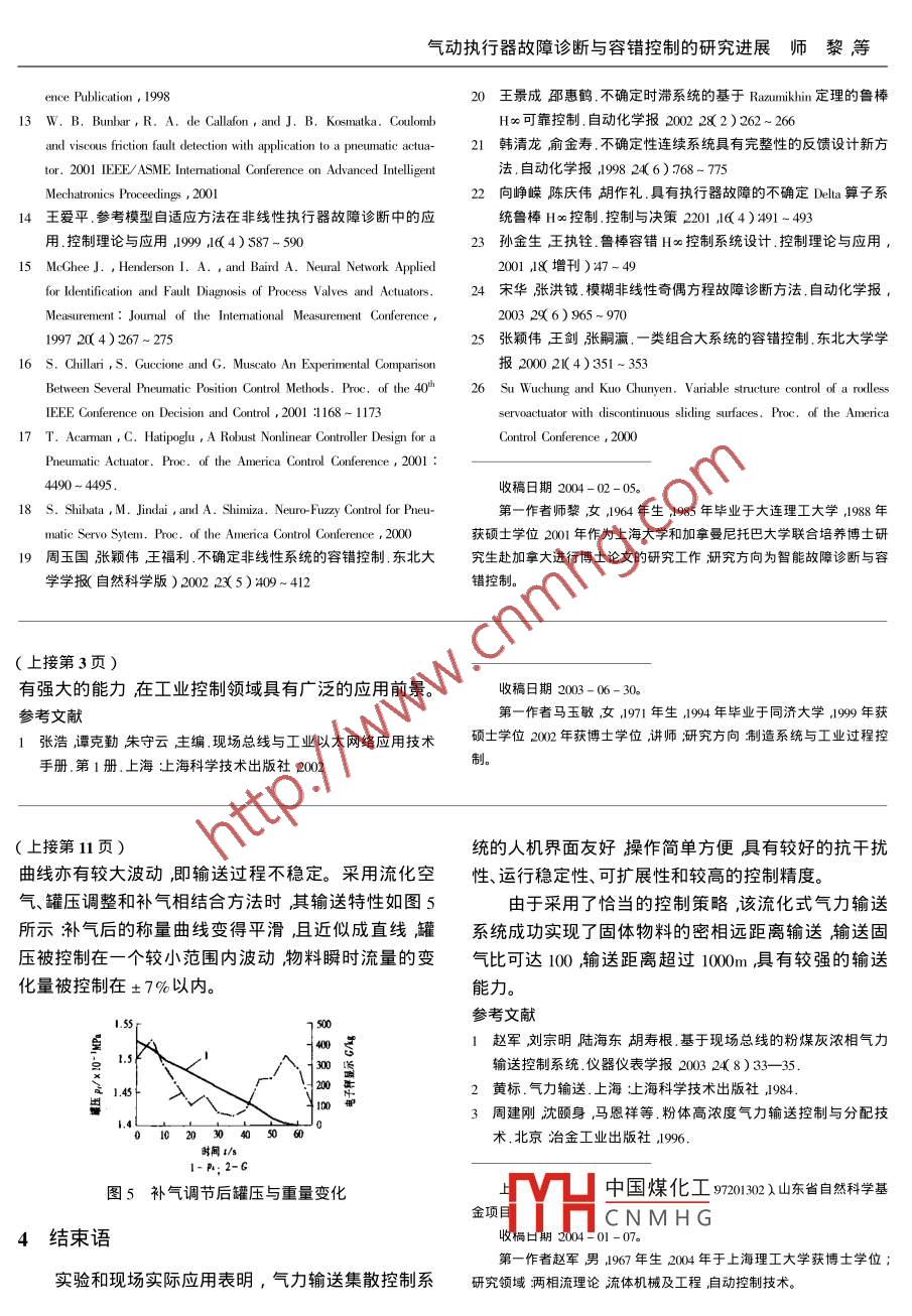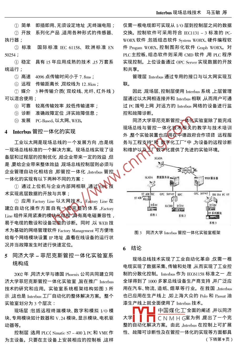 Interbus現(xiàn)場總線技術(shù)馬玉敏 等Interbus現(xiàn)場總線技術(shù)The Technology of Interbus Fieldbus馬玉敏張浩朱志浩陸劍峰樊留群(同濟(jì)大學(xué)CIMS研究中心上海200092)摘要Intebus現(xiàn)場總線是IEC61158 現(xiàn)場總線標(biāo)準(zhǔn)之一。 較詳細(xì)地介紹了Interbus 現(xiàn)場總線的拓?fù)浣Y(jié)構(gòu)、故障診斷能力、優(yōu)越性和實(shí)現(xiàn)管控-體化的方法。給出了同濟(jì)大學(xué)一菲尼克斯管控一體化實(shí)驗(yàn)室的系統(tǒng)框架結(jié)構(gòu)。關(guān)鍵詞現(xiàn)場總線Interbus 管控一 體化Abstract Interbus is one of the fieldbus standards of IEC61 158. The topologic structure , capability of fault diagnostics , and advantages of Intebus aswell as the implementation of integration of management and control are described in detail. The frame structure of the system of Tongji University-Phoenix Comprehensive Lab for Fieldbus and Integration of Managementand Control is given.Key words Fieldbus Intebus Integration of management and control現(xiàn)場總線是-種數(shù)字化的串行雙向通信系統(tǒng),它可塊BK總線終端模塊又稱中繼站。1 個(gè)Interbus總線系將所有的現(xiàn)場設(shè)備(傳感器、執(zhí)行機(jī)構(gòu)、驅(qū)動(dòng)器等與控制統(tǒng)可有255中繼站這個(gè)限制僅僅因?yàn)榭紤]Interbus協(xié)器用一根電纜相聯(lián)接形成設(shè)備層的數(shù)字化通信網(wǎng)絡(luò)可議長度( 4096位= 256x 16位)的原因。1 個(gè)遠(yuǎn)程總線完成現(xiàn)場狀態(tài)監(jiān)測、控制、遠(yuǎn)程傳輸?shù)裙δ?。?jù)統(tǒng)計(jì),目段的最大長度取決于所用的傳輸介質(zhì)如用銅纜則為前市場.上約有40種左右的現(xiàn)場總線,在2000年1月宣400m而整個(gè)系統(tǒng)的總長為12. 8kmo如果遠(yuǎn)程總線供布的IEC61158國際標(biāo)準(zhǔn)中將8種總線( FF H1、Control-電則稱為安裝遠(yuǎn)程總線,它的聯(lián)接電纜是-種混合電Net、Profibus、P-Net、FF HSE、Swif-Net. WorldFIP、Interbus )纜即既傳輸數(shù)據(jù)同時(shí)也傳輸電壓信號(hào)。列入了國際標(biāo)準(zhǔn)形成了多種總線共同競爭的局面。1.2 本地總線段作為IEC61158 標(biāo)準(zhǔn)之- -的Interbus 現(xiàn)場總線由德每個(gè)遠(yuǎn)程總線終端模塊BK引出一個(gè)由本地總線國Phoenix Contact 公司開發(fā),InterBus 俱樂部支持。它模塊組成的本地總線段本地總線的任務(wù)是傳輸短距是一種串行總線系統(tǒng)聯(lián)接傳感器/執(zhí)行器到計(jì)算機(jī)控離的信號(hào)主要運(yùn)用在控制柜里。本地總線段的模塊制站,廣泛地應(yīng)用于制造業(yè)的現(xiàn)場控制中。Interbus 已供電電源由遠(yuǎn)程終端中繼模塊提供。本地模塊只需要先后成為德國標(biāo)準(zhǔn)DIN19258和歐洲標(biāo)準(zhǔn)EN50254。在提供給變送器和執(zhí)行器的附加電源。按照采用不同類成為IEC61158 一員后,Interbus 將會(huì)得到更大的發(fā)展。型的本地總線模塊本地總線段主要可分ST-本地總線和Inline--本地總線。 本地總線可聯(lián)接的模塊1 Interbus 的拓?fù)浣Y(jié)構(gòu)數(shù)量由終端模塊BK的最大輸出電流及所聯(lián)接的本地Interbus總線系統(tǒng)是-個(gè)數(shù)據(jù)環(huán)結(jié)構(gòu)。此數(shù)據(jù)環(huán)模塊所消耗的功率決定。由一個(gè)總線適配控制板和帶有Interbus總線接口的I/O1.3 Interbus Loop段設(shè)備所組成。Interbus 總線系統(tǒng)是-個(gè)Master/Slave 結(jié)Interbus Loop本地總線段是具有IP65 等級(jí)的、可直構(gòu)總線適配控制板是數(shù)據(jù)環(huán)控制的中央設(shè)備控制數(shù)接應(yīng)用于現(xiàn)場的本地總線段。傳輸介質(zhì)是采用一根兩據(jù)與外設(shè)之間的交互。芯無屏蔽的導(dǎo)線。每個(gè)Loop模塊通過這根導(dǎo)線聯(lián)成Interbus 總線由互相聯(lián)接的總線段(最多255個(gè)一個(gè)環(huán)路。所有的數(shù)據(jù)信號(hào)和24V的模塊供電電源通段)所組成。按照數(shù)據(jù)傳輸?shù)奶匦?Interbus可劃分成過這根導(dǎo)線進(jìn)行傳輸與安裝遠(yuǎn)程總線相對應(yīng),Interbus三種不同的總線段,即遠(yuǎn)程總線段、本地總線段及Loop中國煤化工1個(gè)Loop 環(huán)路可帶63Interbus Loop段。個(gè)模HCNMHG塊之間的最大距離是1.1遠(yuǎn)程總線段20mo值得注意的是在遠(yuǎn)程總線和本地總線中數(shù)據(jù)除了第一個(gè)遠(yuǎn)程總線段與總線適配控制板相聯(lián)接的進(jìn)出線在同一根電纜中,而在Intebus Loop段中進(jìn)外其他每個(gè)遠(yuǎn)程總線段開始于-個(gè)遠(yuǎn)程總線終端模出線并不包含在同- -電纜中,因此需要連接成-個(gè)環(huán)《自動(dòng)化儀表》第25卷第8期2004 年8月路以形成數(shù)據(jù)環(huán)。找出故障點(diǎn)并予以排除。此外,DSC控制器還具有出根據(jù)工業(yè)控制系統(tǒng)以及工業(yè)現(xiàn)場的需要,利用以錯(cuò)歷史記錄統(tǒng)計(jì)的功能,記錄最新的10個(gè)故障。上不同的Interbus總線段可以構(gòu)成不同的能夠滿足實(shí)2.2軟件際要求的現(xiàn)場總線網(wǎng)絡(luò)結(jié)構(gòu)。圖1是一個(gè)典型的In-①CMD軟件terbus 拓?fù)鋱D。CMD軟件不僅具有總線組態(tài)的功能,而且還具有總線監(jiān)控和診斷的功能。通過RS- 232接口,CMD 可Interbus以實(shí)時(shí)采集到Interbus總線的運(yùn)作情況,包括運(yùn)行狀態(tài)總線適配控制板IBsS sT本地總線(ready、active,r