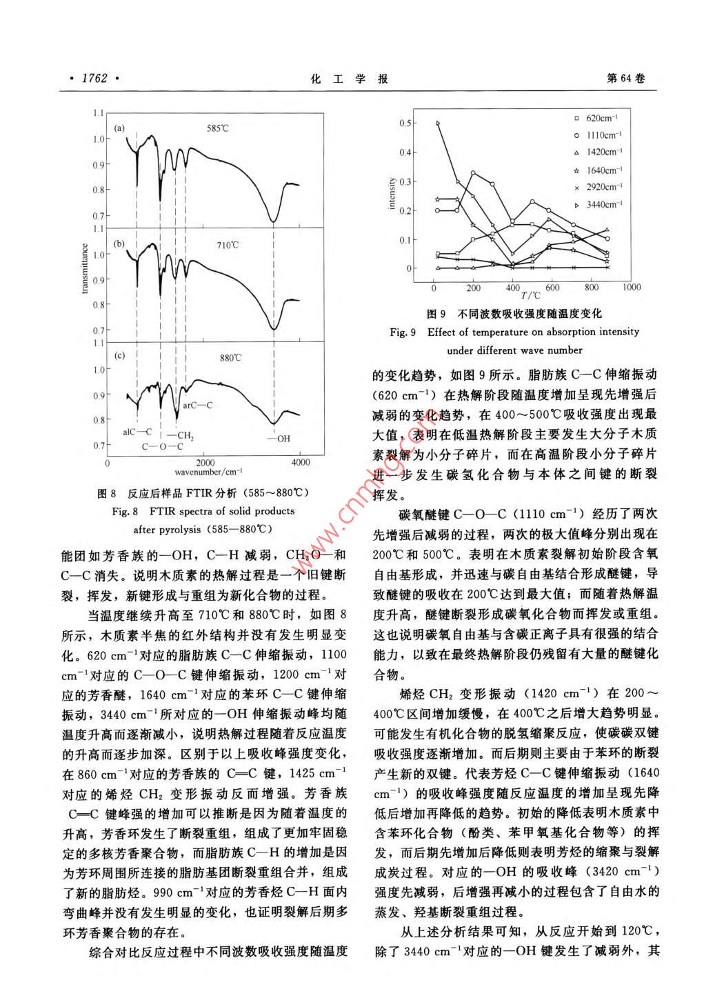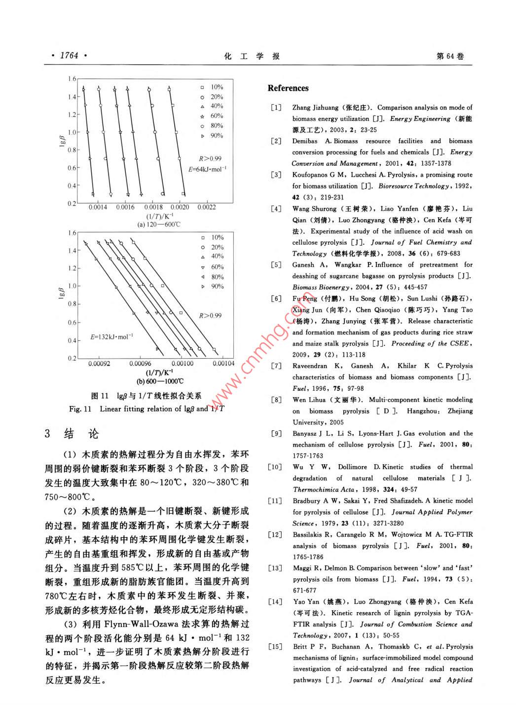 第64卷第5期化工學(xué)報(bào)Vol 64 No 52013年5月CIESC JournalMay 2013研究論文木質(zhì)素慢速熱解機(jī)理程輝1·,余劍,姚梅琴3,許光文1(中國(guó)科學(xué)院過(guò)程工程研究所,多相復(fù)雜系統(tǒng)國(guó)家重點(diǎn)實(shí)驗(yàn)室,北京100190中海油氣電集團(tuán)國(guó)際貿(mào)易有限公司,北京100027;3中國(guó)科學(xué)院研究生院,北京100039)摘要:利用熱重考察了不同升溫速率下木質(zhì)素的熱解特性,結(jié)合紅外光譜對(duì)木質(zhì)素?zé)峤獾牟煌A段生成的半焦的表征結(jié)果,分析了木質(zhì)素在慢速升溫條件下的熱裂解機(jī)理,表明:木質(zhì)素的熱解是一個(gè)舊鍵斷裂揮發(fā)、新鍵重組的過(guò)程。熱解過(guò)程隨著反應(yīng)時(shí)間的推移依次分為水分揮發(fā)、支鏈斷裂重組或揮發(fā)和芳環(huán)縮聚成碳3個(gè)階段采用 Flynn-Wall-Ozawa方法,根據(jù)不同升溫速率下測(cè)得的失重速率變化求算后兩個(gè)階段的活化能,結(jié)果分別為64kJ.mol-1和132kJ·mol-1,進(jìn)一步證明了木質(zhì)素?zé)峤獾姆侄翁卣?并表明芳環(huán)縮聚成碳所需活化能遠(yuǎn)大于與苯環(huán)相連的支鏈斷裂所需的能量關(guān)鍵詞:熱重分析;木質(zhì)素;熱解機(jī)理;紅外分析DoI:10.3969/j.issn.0438-157.2013.05.035中圖分類號(hào):TQ351.1文獻(xiàn)標(biāo)志碼:A文章編號(hào):0438-1157(2013)05-1757-09Mechanism analysis of lignin slow pyrolysisCHENG Hui, YU Jian, YAO Meiqin, XU Guangwen'( Institute of Process Engineering, China Academy of Science, Beijing 100190, China;2 CNOOC Gas & Power Group International Trade Company, Beijing 100027, ChinaGraduate University of Chinese Academy of Sciences, Beijing 100039, China)Abstract: The characteristics of lignin pyrolysis was investigated by tg at different heating ratecombined with FtiR characterization of the chars from different stages of slow pyrolysis of lignin toanalyze lignin pyrolysis mechanism at slow heating rate. The results show that pyrolysis of lignin is aprocess involving breakage of old chemical branched chains and recombination of new branchedchains. With time extending i. e. temperature rising, there are three successive stages in process of ligninpyrolysis: dewatering, breakage-recombination-volatilization of branched chains and polymerization ofaromatic rings and formation of carbon. Based on the weight loss rate at different heating rates, accordingto the Flynn-Wall-Ozawa equation, the calculation of kinetic parameters resulted in activation energies of64 kJ. mol and 132 kJ. mol for the latter two pyrolysis stages, respectively This indicates furtherthat the pyrolysis of lignin carried out in different stages and the breakage of the branded chains was easierthan the polymerization of aromatic rings.Key words thermo gravimetric analysis; lignin pyrolysis; mechanism; FTIR analysis2012-08-24收到初稿,2012-10-31收到修改稿Received date: 2012-08-24聯(lián)系人:余劍,許光文。第一作者:程輝(1984-),男,碩Corresponding author: Dr . YUhome ipe. ac cn;士研究生Prof. XU Guangwen, gwxu@ home. ipe ac cn基金項(xiàng)目:國(guó)家自然科學(xué)基金項(xiàng)目(21106156,21006110)Foundation item: supported by the National Natural ScienceFoundation of China (21106156, 21006110)1758·化工學(xué)報(bào)第64卷本實(shí)驗(yàn)利用熱重和紅外光譜儀,對(duì)木質(zhì)素的熱解行為和熱解機(jī)理進(jìn)行了研究。在熱重考察熱解失隨著石油等化石能源的日益緊缺以及對(duì)環(huán)境造重過(guò)程中木質(zhì)素的質(zhì)量變化規(guī)律的基礎(chǔ)上,結(jié)合不成的污染,作為對(duì)新型潔凈能源的生物質(zhì)的利用,同熱解階段半焦的紅外譜圖分析得出殘余半焦中有特別是熱解、氣化、發(fā)酵等過(guò)程越來(lái)越受到人們的機(jī)官能團(tuán)的變化規(guī)律,推測(cè)熱解過(guò)程中鍵斷裂機(jī)關(guān)注口。其中熱解是生物質(zhì)利用的重要組成部分,理。同時(shí)根據(jù)不同階段失重變化率,利用FW研究熱解反應(yīng)的機(jī)理對(duì)提高熱解效果意義重大。由O1方法求算不同熱解階段的活化能,從而佐證木于生物質(zhì)組成復(fù)雜,其熱解過(guò)程中所發(fā)生的諸多物質(zhì)素?zé)峤怄I斷裂的難易程度與復(fù)雜性。加。許多學(xué)者采用“黑箱法”將研究重點(diǎn)放在生1實(shí)驗(yàn)物質(zhì)熱解過(guò)程的原料和產(chǎn)物的物理化學(xué)性質(zhì)變化,1.1實(shí)驗(yàn)樣品借此推斷熱解反應(yīng)機(jī)理。也有研究者對(duì)生物質(zhì)實(shí)驗(yàn)所用原料是上海梯希愛(ài)化成公司購(gòu)買的高內(nèi)所含的某一成分的熱解反應(yīng)進(jìn)行研究,再將不同純度脫堿木質(zhì)素。為了消除內(nèi)擴(kuò)散的影響,粒徑選組分的熱解過(guò)程進(jìn)行比較綜合,借此來(lái)推斷生物質(zhì)為<75pm。樣品的元素分析、工業(yè)分析以及基本熱解過(guò)程的機(jī)理78結(jié)構(gòu)分析見(jiàn)表1。生物質(zhì)主要由纖維素、半纖維素、木質(zhì)素等組表1木質(zhì)素工業(yè)分析和元素分析結(jié)果成,它的熱解是這三種物質(zhì)熱解的綜合。纖維素是Table 1 Proximate and ultimate analyses of lignin生物質(zhì)的主要組成部分,由于其組成單一,故已有Proximate analysis大量文獻(xiàn)對(duì)其熱解過(guò)程進(jìn)行了報(bào)道1。而木質(zhì)素Material/%(mass)Ultimate analysis/%( mass)的含量相對(duì)較低,但其熱解過(guò)程較為復(fù)雜,且可能Va A FCd Cd H N Od+S,與其他組分發(fā)生反應(yīng)12,因此木質(zhì)素的熱解