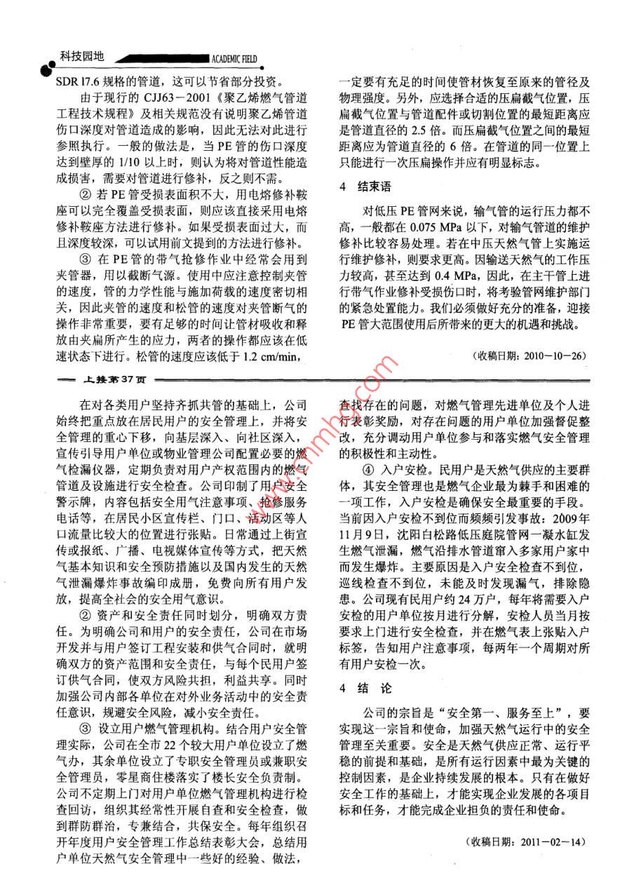 科技園地ACADEMIC FIELD城市天然氣安全管理之淺見寶雞中燃城市燃?xì)獍l(fā)展有限公司鳳廣科,楊鴻斌摘要介紹寶雞中燃城市燃?xì)獍l(fā)展有服公司的基本概況及實施燃?xì)獍踩芾淼闹饕悸芳熬唧w做法。關(guān)鍵詞:城市燃?xì)獍踩芾硖烊粴庾鳛橐环N新興能源,以其清潔、經(jīng)濟的優(yōu)勢和國家級主燃?xì)夤芫W(wǎng)的逐步建成投運,近2安全生產(chǎn)管理的重點十年來在我國得到了長足發(fā)展,以年均15%的速天然氣的安全管理,貫穿于天然氣供應(yīng)的整度增長,遠(yuǎn)高于全球4%的年均增長速度。天然個過程,從門站開始,到儲氣罐、調(diào)壓裝置,通氣產(chǎn)業(yè)的飛速發(fā)展,改變了我國能源消費結(jié)構(gòu),過管道,到終端用戶,每個環(huán)節(jié)都存在一定的安帶動了工業(yè)技術(shù)的升級,凈化了城市大氣環(huán)境,全風(fēng)險和隱患,必須對天然氣安全管理工作實施提高了居民的生活水平。但同時,天然氣具有易全過程控制,重點部位重點監(jiān)控。在這一過程中燃、易爆的特性,全國各地頻頻發(fā)生的天然氣安應(yīng)注重風(fēng)險因素的事前控制,做到未雨綢繆;事全事故提醒我們,城市天然氣的安全管理與用戶中控制是關(guān)鍵,應(yīng)采取積極主動態(tài)度,盡量做到的正確使用是燃?xì)庑袠I(yè)一根緊繃的弦。結(jié)合寶雞萬無一失;盡力減少危險因素的事后控制,以確中燃城市燃?xì)獍l(fā)展有限公司(以下簡稱公司)多保整個生產(chǎn)安全過程穩(wěn)定。年來的實際管理經(jīng)驗,筆者提出一點淺見,以期在整個過程中,公司重點抓好兩項工作,與同行探討。是安全生產(chǎn)過程的基礎(chǔ)工作;二是對各類用戶特城市燃?xì)獾膽?yīng)用就其本身而言是安全的,別是民用戶的安全教育。如果嚴(yán)格按照國家標(biāo)準(zhǔn)、技術(shù)規(guī)范、操作程序執(zhí)行,安全使用是完全有保障的。分析所發(fā)生的安全生產(chǎn)管理的措施各類城市燃?xì)獍踩鹿?基本都是在外界條件異3.1安全制度是安全運行的前提和保障常、人為疏忽甚至故意破壞等前提下出現(xiàn)的,如安全是燃?xì)馄髽I(yè)管理的重中之重,是永恒地震、雷擊等不可抗力導(dǎo)致的燃?xì)鈨Υ?、輸配系的主題。在安全工作中,公司始終堅持“安全第統(tǒng)的泄漏、爆炸;工程質(zhì)量缺陷、設(shè)備設(shè)施缺乏,預(yù)防為主,綜合治理”的方針,從完善安全養(yǎng)護(hù)失靈、工作人員操作失誤所造成的燃?xì)獍踩芾眢w系入手,狠抓安全責(zé)任目標(biāo)管理,強化各事故;以及各類人為破壞燃?xì)饣A(chǔ)設(shè)施而引發(fā)的項安全檢查、防范等措施,突出安全管理重點環(huán)燃?xì)馐鹿盛俨粩嗤晟坪吐鋵嵏黜棸踩贫取kS著公1公司基本概況司不斷發(fā)展,業(yè)務(wù)不斷增加,需要不斷健全完善公司目前運行4000m3球罐4座,高中低壓各項安全生產(chǎn)規(guī)章制度,并在實際安全管理工作燃?xì)夤艿兰s1100km,調(diào)壓器(箱、柜)2500中落實到位。全年堅持公司經(jīng)營層、中層管理人臺,閥門井850座,為寶雞市24萬戶民用戶員、重點崗位“三級”24小時值班制度;堅持32戶工業(yè)用戶、173戶鍋爐用戶、407戶餐飲用安全大檢查制度、月生產(chǎn)安全調(diào)度會制度、動戶提供管道天然氣,CNG汽車加氣站11座,日火作業(yè)審批制度等。每個節(jié)假日、重大活動日之均汽車加氣量近11萬m3。2010年,公司銷售氣前由公司總經(jīng)理帶隊,分管安全、生產(chǎn)的副總經(jīng)量12924萬m3。目前已安全運行超過8500天理,有關(guān)部門、單位負(fù)責(zé)人參加,對重點管位、公司共設(shè)置7個部門和單位從事安全、生產(chǎn)重點設(shè)備、施工現(xiàn)場等進(jìn)行重點檢查;對加氣運營及管理工作,從業(yè)人員341人,主要負(fù)責(zé)天工、壓力容器操作工等特種作業(yè)人員嚴(yán)格按照國然氣驗收供氣點火、輸配管理、計量管理、用戶家規(guī)定,按要求進(jìn)行相關(guān)培訓(xùn),合格后持證上崗安全教育及用戶安全監(jiān)督檢査、緊急事故的搶修操作。目前共有各種安全制度和操作規(guī)程69項搶險等工作②全面推行安全目標(biāo)管理責(zé)任制。每年年城市天然氣安全管理之淺見∠初,公司與各單位、各單位與班組、班組與個人發(fā)布停、供氣通知。同時,公司還利用 SCADA層層簽訂安全目標(biāo)管理責(zé)任書,使公司的每個部系統(tǒng)對門站、重要用戶、加氣站、管網(wǎng)重點壓力門、每個班組、每位員工明確自己的安全工作內(nèi)監(jiān)測點的壓力、流量、溫度進(jìn)行實時監(jiān)控。特別容和責(zé)任,將安全目標(biāo)貫穿于企業(yè)生產(chǎn)經(jīng)營管理是今年,公司承擔(dān)了國家“十一五”科技支撐計的各個階段,使責(zé)任落實到人,檢査考核到崗,劃“城市燃?xì)鈿庠磧ε浼皯?yīng)用關(guān)鍵技術(shù)”之燃?xì)猹剳蛢冬F(xiàn)到位。輸配系統(tǒng)模擬與智能調(diào)控技術(shù)示范工程,完成對32安全關(guān)口前移,把隱患消滅在萌芽狀態(tài)原 SCADA系統(tǒng)的升級改造,實現(xiàn)了燃?xì)夤芫W(wǎng)的①嚴(yán)把工程質(zhì)量關(guān),從源頭確保投入運行負(fù)荷預(yù)測和管網(wǎng)模擬等功能,一旦管網(wǎng)壓力出現(xiàn)管網(wǎng)安全。工程竣工后先由施工單位進(jìn)行自檢異常,能夠及時發(fā)現(xiàn)并發(fā)布