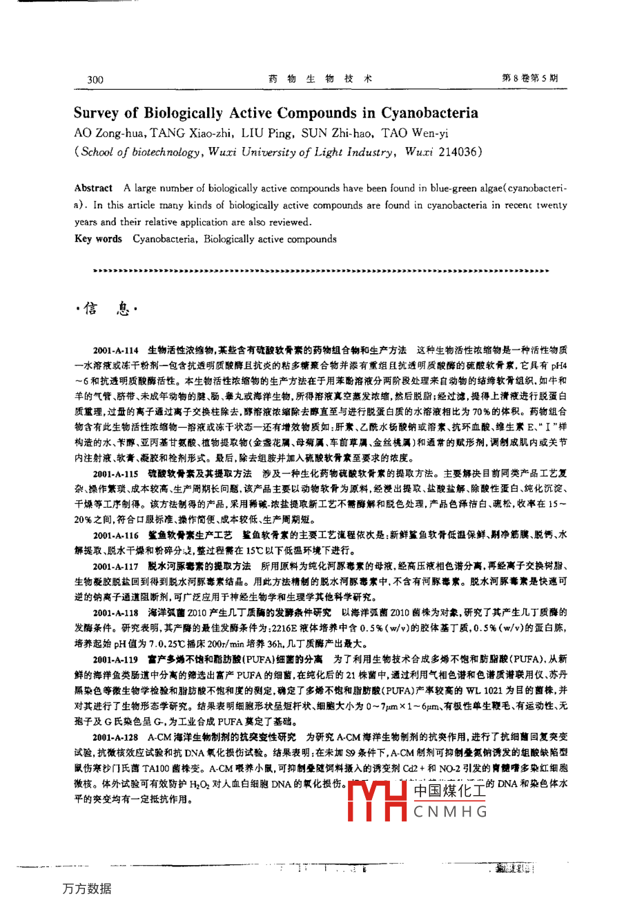 藥物生物技術(shù)Pharmaceutical Biotechnology 2001, 8(5): 296-300藍(lán)藻中生物活性物質(zhì)的研究概況敖宗華,湯曉智,劉萍,孫志浩,陶文沂(無錫輕工大學(xué)生物工程學(xué)院,無錫214036)要藍(lán)藻中含有大量的生物活性物質(zhì)。文章綜述了近20年來從藍(lán)藻中發(fā)現(xiàn)的各種生物活性物質(zhì)以及它們可能的相關(guān)應(yīng)用。關(guān)鍵詞藍(lán)藻;生物活性物質(zhì)中圖分類號(hào):S55+,6文獻(xiàn)標(biāo)識(shí)碼:A文章編號(hào):1005-8915(2001)05029605藍(lán)藻是一類古老的生物,早在30~40億年前,它是和釋放到周圍水中在世界范圍內(nèi)引起野生和家畜間歇性的細(xì)菌同時(shí)形成的。藍(lán)藻除具有自養(yǎng)性生活方式而歸并于紅但又是重復(fù)性的中毒致死。人們伙用或接觸到含有一定含藻、褐藻或綠藻等藻類此外幾乎無任何理由稱之為藻類。量毒素的水時(shí),可引起肝損傷胃腸炎、腹瀉、皮炎等2從細(xì)胞學(xué)觀點(diǎn)加以考慮,實(shí)際上它與細(xì)茵更為接近,它具有隨譽(yù)水體富營養(yǎng)化程度的提高,大量水華出現(xiàn),毒爆發(fā)流70S核糖體和含有胞壁質(zhì)的細(xì)胞壁并缺乏真正的細(xì)胞核。行,對(duì)人們的健康造成極大的威脅藍(lán)藻在地球上分布廣泛,無論在水體表面還是水體底藍(lán)藻的幾個(gè)屬能夠產(chǎn)生毒性次生代謝產(chǎn)物,它們可以層無論是湖沼中還是海洋內(nèi)皆有藍(lán)藻分布。藍(lán)藻極能耐歸納為兩類:一類為肽類肝毒素,包括七肽微囊藻毒京(受干燥、強(qiáng)的離子濃度改變、有機(jī)物分解過多而產(chǎn)生的物 crocystins, MCYST)、五肽節(jié)球藻素( nodularins)和motp質(zhì)、缺氧、溫度改變以及缺乏光照等不良的環(huán)境條件。水域un(3)。這些肽類毒素以不可逆轉(zhuǎn)的方式抑制蛋白磷酸酶中含氮和含彈化合物的增多通過異養(yǎng)作用導(dǎo)致水域變淺、的活性導(dǎo)致許多細(xì)胞機(jī)制發(fā)生紊亂,基于它們的生化作用變暖,以及死亡的有機(jī)體增加均構(gòu)成了利于藍(lán)藻大量繁殖方式,證明這些復(fù)合物具有癌促進(jìn)活性4。另一類為神經(jīng)的先決條件,從而形成了所謂的“水華"( waterbloom)。藍(lán)毒素,包括鈉通道阻斷劑蛤蚌寰( Saxitoxin)及其類似藻中的大部分種屬都可形成水華。物5后奕觸神經(jīng)肌肉阻斷因子類毒素a( anatoxin-a)和高藍(lán)藻在水中大量繁殖后,往往被風(fēng)吹至岸邊,從而使人類毒素( hotmaanatoxin-a)、有機(jī)磷膽堿降抑制類毒素類和牲畜可能與之接觸。早在1878年在溴大利亞就有有46。肝毒素代表為微囊藻毒素,神經(jīng)毒主要為魚腿藻毒毒藍(lán)藻致大量牲畜中毒的報(bào)道。藍(lán)藻中的有毒成分可導(dǎo)致紫大批牲畜、魚類和水鳥死亡,對(duì)人類亦有毒害作用。微囊藻毒素( microcystins)是藍(lán)藻產(chǎn)生的主要毒素,也此外藍(lán)藻中還有許多其它的具有生物活性的物質(zhì)其是研究最清楚的毒素,主要由 Microcystis, Anabaena,№中不乏在藥理上極具潛在價(jià)值的化合物toe, Oscillatoria等屬產(chǎn)生,結(jié)構(gòu)為一組環(huán)7肽復(fù)合物,相對(duì)分子質(zhì)量為100左右微囊藻事宗在結(jié)構(gòu)上不是很保守,1藍(lán)新親常在2位和4位的氨基酸位置和脫甲基或乙酰化氨基酸殘?jiān)谒械牡孱愔卸拘宰顝?qiáng)污染范圍最廣最嚴(yán)重基上發(fā)生變異。自從Bisp(1959)首次從 Microcystis為藍(lán)藻門。但也并不是所有的藍(lán)藻都是產(chǎn)毒的,目前肯 aruginosa中分離出肽類肝毒素以來,目前已鑒定有近的定有毒的藻類有銅銹微囊藻( Microcystis aeruginos)水華個(gè)微囊藻毒素變式,其中絕大多數(shù)具有較高毒性。在微囊魚腥藻( Anabaena ftos-aquae)、水華東絲藻( Athan·藻毒京的許多變式中存在最普遵含量相對(duì)較多毒性較zomenon fuas-aquae)阿氏顫藻( Oscillatoria agardh)、泡沫大的是微囊藻毒京 MCYST-LR, MCYST-RR和 MCYST節(jié)球藻( Nodularia spumigena)等。這些產(chǎn)毒藻類并不只產(chǎn)YR,LR、Y分別代表可變氨基酸為亮氨酸、精氨酸、酪氨生一種毒素,有時(shí)一種藻類含幾種毒素1。這些藻類在夏酸結(jié)構(gòu)式中Adda(3氨基9甲氧基2,2,6三甲基10苯秋季形成的水華中大量存在藻類死亡后將細(xì)胞內(nèi)的毒素基4,6二烯酸)對(duì)毒素的生物活性有很大影響,研究發(fā)現(xiàn),收稿日期:20001010基金項(xiàng)目:江蘇省社會(huì)發(fā)展項(xiàng)目作者簡介:湯曉智(1977年生),男(漢族)陜西漢中人,無錫輕工rYH中國煤化工CNMHG教宗華等:藍(lán)藻中生物活性物質(zhì)的研充慨況去除Ada后毒素毒性降低,證明Adda對(duì)微囊藻毒素的活 Rinehart等(1981)發(fā)現(xiàn)他們所篩選出來的藍(lán)藻培養(yǎng)物的提性是必藩的取物中,5%以上的都具有抗皰疹Ⅱ型病毒活性.另外也育魚邊藻毒素a( anatoxin a),它是相對(duì)分予質(zhì)量為1665%以上的具有抗呼吸道合胞病毒的活性1。La等的仲胺,結(jié)構(gòu)為帶鳥嘌呤的有機(jī)磷酸酯是最強(qiáng)烈的煙酰乙(1993)也對(duì)900株藍(lán)藻提墳物進(jìn)行了鳥類成髓細(xì)胞反轉(zhuǎn)錄酰膽堿受體拮抗劑,作為奕觸后去極化神經(jīng)肌肉阻斷劑,致酶病毒和人免疫缺陷病毒1型抑制實(shí)驗(yàn),發(fā)現(xiàn)2%以上的使呼吸停滯,動(dòng)物在幾分鐘內(nèi)死亡。小鼠LD0為250g/藻類具有預(yù)期的活性l。 Mundt s(1997)從15