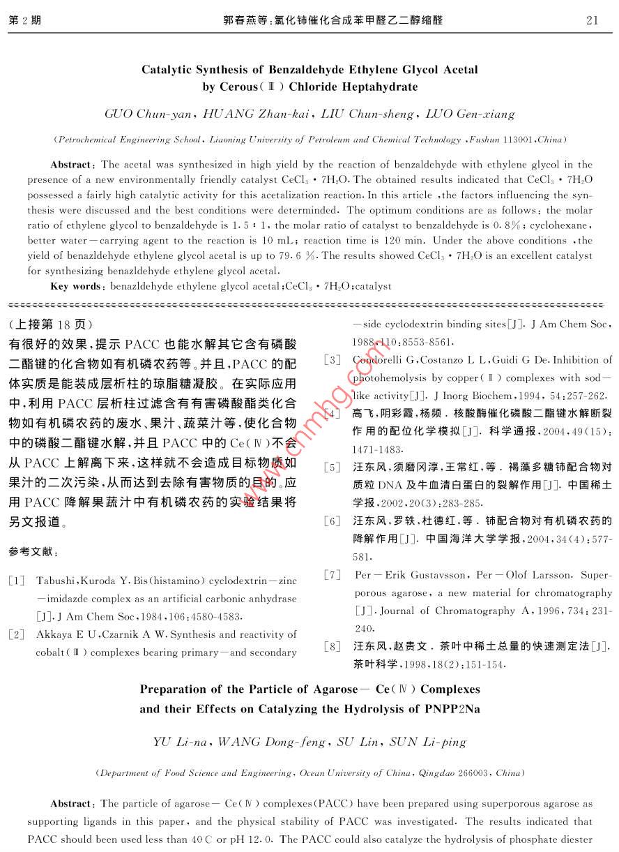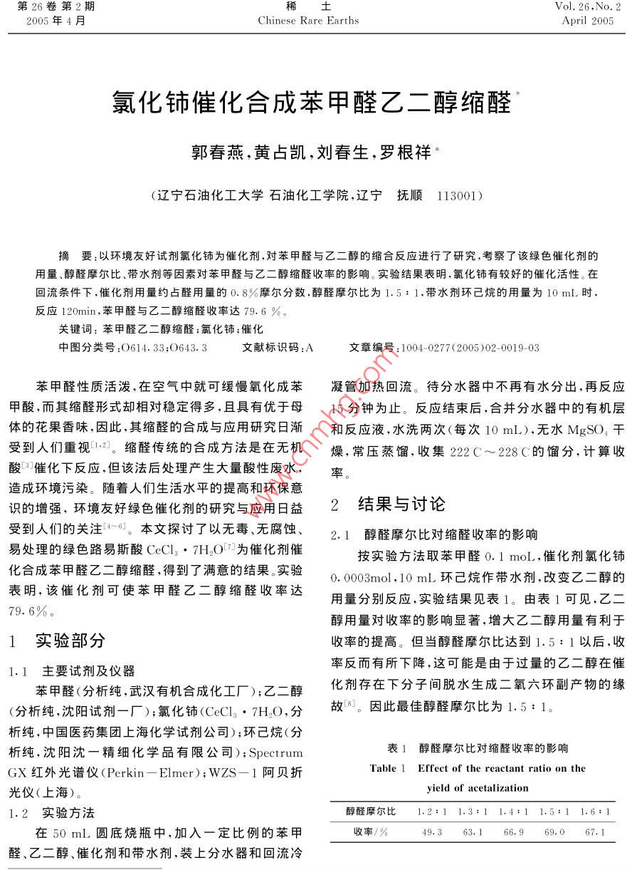 第26卷第2期稀 Vol. 26,No.22005年4月 Chinese Rare Earths April 2005氯化鈰催化合成苯甲醛乙二醇縮醛郭春燕,黃占凱,劉春生,羅根祥(遼寧石油化工大學(xué)石油化工學(xué)院,遼寧撫順113001)摘要:以環(huán)境友好試劑氯化鈰為催化劑,對苯甲醛與乙二醇的縮合反應(yīng)進行了研究考察了該綠色催化劑的用量、醇醛摩爾比、帶水劑等因素對苯甲醛與乙二醇縮醛收率的影響。實驗結(jié)果表明,氯化鈰有較好的催化活性。在回流條件下,催化劑用量約占醛用量的0.8%摩爾分?jǐn)?shù),醇醛摩爾比為1.5:1,帶水劑環(huán)己烷的用量為10mL時反應(yīng)120min,苯甲醛與乙二醇縮醛收率達79.6%關(guān)鍵詞:苯甲醛乙二醇縮醛氯化鈰;催化中圖分類號:O614.33;0643.3文獻標(biāo)識碼:A文章編號:1004-0277(2005)02-0019-03苯甲醛性質(zhì)活潑,空氣中就可緩慢氧化成苯凝管加熱回流。待分水器中不再有水分出,再反應(yīng)甲酸而其縮醛形式卻相對穩(wěn)定得多且具有優(yōu)于母15分鐘為止。反應(yīng)結(jié)束后,并分水器中的有機層體的花果香味,因此,其縮醛的合成與應(yīng)用研究日和反應(yīng)液,水洗兩次(每次10mL),無水MgSO4受到人們重視12??s醛傳統(tǒng)的合成方法是在無機燥,常壓蒸餾,收集222C~228C的餾分,計算收酸[3催化下反應(yīng),但該法后處理產(chǎn)生大量酸性廢水,率。造成環(huán)境污染。隨著人們生活水平的提高和環(huán)保意識的增強,環(huán)境友好綠色催化劑的研究與應(yīng)用日益2結(jié)果與討論受到人們的關(guān)注本文探討了以無毒無腐蝕、2.1醇醛摩爾比對縮醛收率的影響易處理的綠色路易斯酸CeCl3·7H2O7為催化劑催按實驗方法取苯甲醛0.1moL,催化劑氯化鈰化合成苯甲醛乙二醇縮醛,得到了滿意的結(jié)果。實驗.0003mol,10mL環(huán)己烷作帶水劑,改變乙二醇的表明,該催化劑可使苯甲醛乙二醇縮醛收率達用量分別反應(yīng),實驗結(jié)果見表1。由表1可見,乙二79.6%醇用量對收率的影響顯著,增大乙二醇用量有利于1實驗部分收率的提高。但當(dāng)醇醛摩爾比達到1.5:1以后,收1.1主要試劑及儀器率反而有所下降,這可能是由于過量的乙二醇在催苯甲醛(分析純,武漢有機合成化工廠);之二醇化劑存在下分子間脫水生成二氧六環(huán)副產(chǎn)物的緣(分析純,沈陽試劑一廠);氯化鈰(CeCl3·7H2O,分故因此最佳醇醛摩爾比為1.5:1析純,中國醫(yī)藥集團上?;瘜W(xué)試劑公司);環(huán)己烷(分析純,沈陽沈一精細化學(xué)品有限公司); Spectrum表1醇醛摩爾比對縮醛收率的影響GX紅外光譜儀(Perkin-Elmer-);wzs-1阿貝折 Table Effect of the reactant ratio on the光儀(上海)。 yield of acetalization1.2實驗方法醇醛摩爾比1.2:11.3:11.4:11.5:11.6:1在50mL圓底燒瓶中,加入一定比例的苯甲收率/%49.363.166.969.067.1醛、乙二醇、催化劑和帶水劑,裝上分水器和回流冷20稀土第26卷2.2催化劑用量對縮醛收率的影響件同2.4,結(jié)果見表5。由表5可知,隨反應(yīng)時間的增改變催化劑用量,選定醇醛摩爾比為1.5:1,加,縮醛產(chǎn)率隨之增加,但超過2h后變化不大故綜其余條件同上,實驗結(jié)果見表2由表2可見僅用合考慮反應(yīng)時間以2h為宜少量催化劑就可獲得較高收率,且隨著CeCl37H2O用量增加,縮醛收率提高。當(dāng)催化劑用量為苯表5反應(yīng)時間對縮醛收率的影響甲醛的0.8%(摩爾分?jǐn)?shù))時具有最佳的催化效果, Table 5 Effect of reaction time on the yield因此合適的催化劑摩爾分?jǐn)?shù)為0.8%。 of acetalization反應(yīng)時間/min6090120150表2催化劑用量對縮醛收率的影響收率/%72.873.579.675.9 Table 2 Effect of the amount of catalysis on the yield of acetalization2.6產(chǎn)品的表征催化劑用量/%0.30.40.60.81.0所得產(chǎn)品為無色透明液體,其折射率np20=收率/%69.070.176.777.967.71.5270(文獻值1.5268)。其IR(,cm-1)主要顯示:3038(其環(huán)CH),2963,2889(烴CH),1608,1459(苯2.3帶水劑用量對收率的影響環(huán)骨架),1225,1087(CO),757,702(一取代苯),未用量對縮醛的收率也有一定的影響,在10mL時收3結(jié)吸收峰。采用最佳醇醛摩爾比和催化劑摩爾分?jǐn)?shù),改變見羰基和羥環(huán)己烷用量,實驗結(jié)果見表3。由表3可見,環(huán)己烷率最大。若環(huán)己烷用量過少,起不到較好的帶水效1.稀土化合物CeCl·7H2O是一種合成苯甲果;過多則會降低反應(yīng)體系的回流溫度,率反而下醛環(huán)縮醛的良好催化劑具有反應(yīng)條件溫和,分離簡降。故帶水劑環(huán)己烷的用量以10mL為宜。單,產(chǎn)率高且無污染、無腐蝕等優(yōu)點,在綠色化學(xué)進程中具有良好的應(yīng)用前景。表3帶水劑用量對縮醛收率的影響2.以氯化鈰為催化劑合成苯甲醛乙二醇縮醛 Table 3 Effect of the amount of cyclohexane的最佳條件為:醇醛摩爾比為1.5:1,催化劑占苯 on the yield of acetalization甲醛摩爾分?jǐn)?shù)的0.8%,帶水劑環(huán)己烷的用量為環(huán)己烷用量/mL68910111210mL時,反應(yīng)120min后苯甲醛乙二醇縮醛收率達66.477.978.079.675.673.579.6%2.4不同帶水劑對縮醛收率的影響參考文獻:選定帶水劑用量10mL,醇醛摩爾比為1.5:[1]張克福,孫寶國苯甲醛正丁硫醇縮醛的合成研究1,催化劑摩爾分?jǐn)?shù)為0.8%,改變帶水劑的種類,分J].精細化工,1998,18(3):23-25.別考察環(huán)己烷、苯、甲苯、二甲苯對縮醛收率的影響,[2]田志新龔健,李菊仁,鈮酸催化縮醛反應(yīng)[]精細石油化工,2000,(2):23-25.實驗結(jié)果見表4由表4可見,該縮合反應(yīng)環(huán)己烷