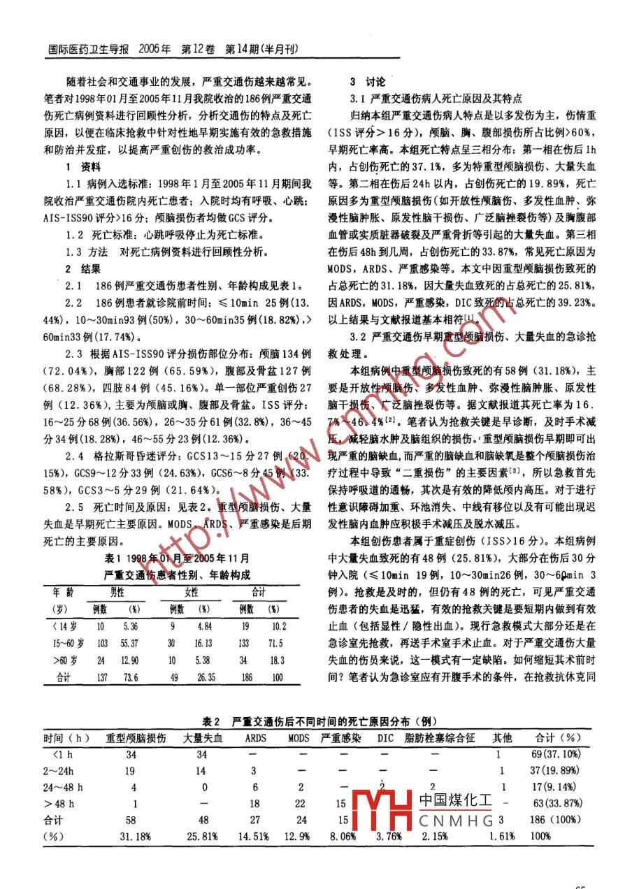 國際醫(yī)藥衛(wèi)生導(dǎo)報(bào)2006年第12卷第l4期(半月刊)BPH合并膀胱結(jié)石的安全有效方法,具有出血少、創(chuàng)傷小、[4] A sci r, Aybek Z, Sariaya S, et al The management康復(fù)快、住院時(shí)間短等優(yōu)點(diǎn)。of vesical calculi with combined optical mechanical參考文獻(xiàn)is it safe and effective? BJU Int, 1999, 84(1): 32-[1]吳階平.泌尿外科[M].濟(jì)南:山東科學(xué)技術(shù)出版社,1993:361260-1260[5]周長春前列腺增生癥并膀胱大結(jié)石的非開放手術(shù)治療[2] Sofer M, Kaver I, Greenstein A, et al. Refinements中國微創(chuàng)外科雜志,2002,2(3):182-183in treatment of large bladder calculi: Simultaneous[6]梅驊.泌尿外科手術(shù)學(xué)[M].北京:人民衛(wèi)生出版社,1996:percutaneous suprapubic and transurethral 823-824cystolithotripsy [J]. Urology, 2004, 64(4): 651-654 [7] Botto H, Lebret P, Holgrewe H, et al. Electovapor ization[]Richter S, Ringel A, Sluzker D. Combined cystolithotomy of prostate with the Gyrus Device Endourol, 2001,15and transurethral resection of prostate: best man319-322agement of infravesical obstruction and massiveormultiple bladder stones [J]. Urology, 2002, 59(5):688-691收稿日期:2006-05-12嚴(yán)重交通傷的死亡原因分析徐凡方丹青廣州醫(yī)學(xué)院第二附屬醫(yī)院急診外科廣東廣州510260摘要目的分析嚴(yán)重交通傷死亡病例的特點(diǎn)及死亡原因,方法對(duì)186例嚴(yán)重交通傷死亡病例臨床資料進(jìn)行回顧性分析,站果死亡時(shí)間呈三相分布,死亡原因:重型顱腦損傷60例(32.25%,大量失血49例(26.34%,成人呼吸窘迫綜合征(ARDS)27例(14.51%),多器官功能衰竭(M0DS)24例(12.%),嚴(yán)重感染15例(8.06%,DIC7例(3.76%)脂肪栓塞綜合征4例(2.15%).早期死亡原因:重型顱腦損傷、大量失血。后期死亡原因:M0DS、ARDS、嚴(yán)重感染,站論交通傷是城市嚴(yán)重創(chuàng)傷的主要原因,充分認(rèn)識(shí)交通傷的死亡原因及其特點(diǎn),針對(duì)性地予以早期有效的急救措施早期防治并發(fā)癥,以期降低嚴(yán)重創(chuàng)傷的死亡率,挽救生命,關(guān)鍵詞嚴(yán)重交通傷死亡原因 MODS ARDS嚴(yán)重感染Serious Traffic trauma the Death reason ana l yzesAbstract Objective Analysis the characteristics of serious traffic trauma death cases and Causes ofdeath. Methods The clicinal data of 186 patients death with serious traffic trauma treated in Emergencysurgical department from January 1998 to November 2005 was studied retrospectively. Results Distributionof a three-phase time of death. Causes of death: Heavy brain injuries 60(32. 5%), hemorrhagic shock 49(2634%),ARDS27(14.51%),MoDs24(12.9%), Serious infections15(8.06%),DIC7(3.76%),FES4(2.15%)Early causes of death: Heavy brain injuries, hemorrhagic shock. Late causes of deaths MODS, ARDS, Seriousinfections. Conclusion The traffic trauma is main reason of city serious wound, understand thecharacteristics of Traffic Patients deaths give the early中國煤化工 vent and care thecomplication in early day in hope of reducing th death rateKey words Serious traffic trauma Death reason MODSTHaCNMHG飛得中圖分類號(hào):R64文獻(xiàn)標(biāo)識(shí)碼:A文章編號(hào):1007-1245(2006)14-0064-036方數(shù)據(jù)國際醫(yī)藥衛(wèi)生導(dǎo)報(bào)2006年第12卷第14期(半月刊隨著社會(huì)和交通事業(yè)的發(fā)展,嚴(yán)重交通傷越來越常見3討論筆者對(duì)1998年01月至2005年11月我院收治的186例嚴(yán)重交通3.1嚴(yán)重交通傷病人死亡原因及其特點(diǎn)傷死亡病例資料進(jìn)行回顧性分析,分析交通傷的特點(diǎn)及死亡歸納本組嚴(yán)重交通傷病人特點(diǎn)是以多發(fā)傷為主,傷情重原因,以便在臨床搶救中針對(duì)性地早期實(shí)施有效的急救措施(ISS評(píng)分>16分),顱腦、胸、腹部損傷所占比例>60%和防治并發(fā)癥,以提高嚴(yán)重創(chuàng)傷的救治成功率。早期死亡率高。本組死亡特點(diǎn)呈三相分布:第一相在傷后Ih資料內(nèi),占創(chuàng)傷死亡的37.1%,多為特重型顱腦損傷、大量失血1.1病例入選標(biāo)準(zhǔn):1998年1月至2005年11月期間我等。第二相在傷后24h以內(nèi),占創(chuàng)傷死亡的19.89%,死亡院收治嚴(yán)重交通傷院內(nèi)死亡患者;入院時(shí)均有呼吸、心跳;原因多為重型顱腦損傷(如開放性顱腦傷、多發(fā)性血腫、彌AIS-ISs90評(píng)分》16分;顱腦損傷者均做GCS評(píng)分漫性腦腫脹、原發(fā)性腦干損傷、廣泛腦挫裂傷等)及胸腹部1.2死亡標(biāo)準(zhǔn):心跳呼吸停止為死亡標(biāo)準(zhǔn)。血管或?qū)嵸|(zhì)臟器破裂及嚴(yán)重骨折等引起的大量失血。第三相1.3方法對(duì)死亡病例資料進(jìn)行回顧性分析在傷后48h到幾周,占創(chuàng)傷死亡的3387%,常見死亡原因?yàn)?結(jié)果M0DS,ARDS、嚴(yán)重感染等。本文中因重型顱腦損傷致死的2.1186例嚴(yán)重交通傷患者性別、年齡構(gòu)成見表1。占總死亡的31.18%,因大量失血致死的占總死亡的25.81%2.2186例患者就診院前時(shí)間:≤10min25例(13.因ARDS,MODs,嚴(yán)重感染,DIC致死的占總死亡的3923%。44%),10~30min93例(50%),30~60min35例(18.82%),〉以上結(jié)果與文獻(xiàn)報(bào)道基本相符{l。60min33例(17.74%)。3.2嚴(yán)重交通傷早期重型顱腦損傷、大量失血的急診搶2.3根據(jù)AIS-ISS90評(píng)分損傷部位分布:顱腦134例救處理。(72.04%),胸部122例(65.59%),腹部及骨盆127例本組病例中重型顱腦損傷致死的有58例(31.18%),主(68.28%),四肢84例(45.16%)。單一部位嚴(yán)重創(chuàng)傷27要是開放性顱腦傷、多發(fā)性血腫、彌漫性腦