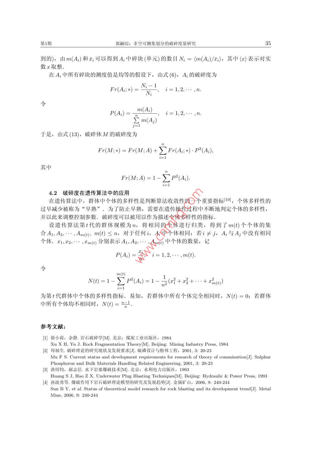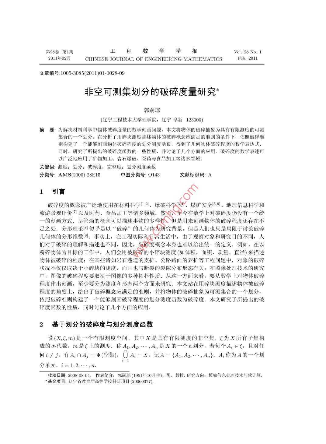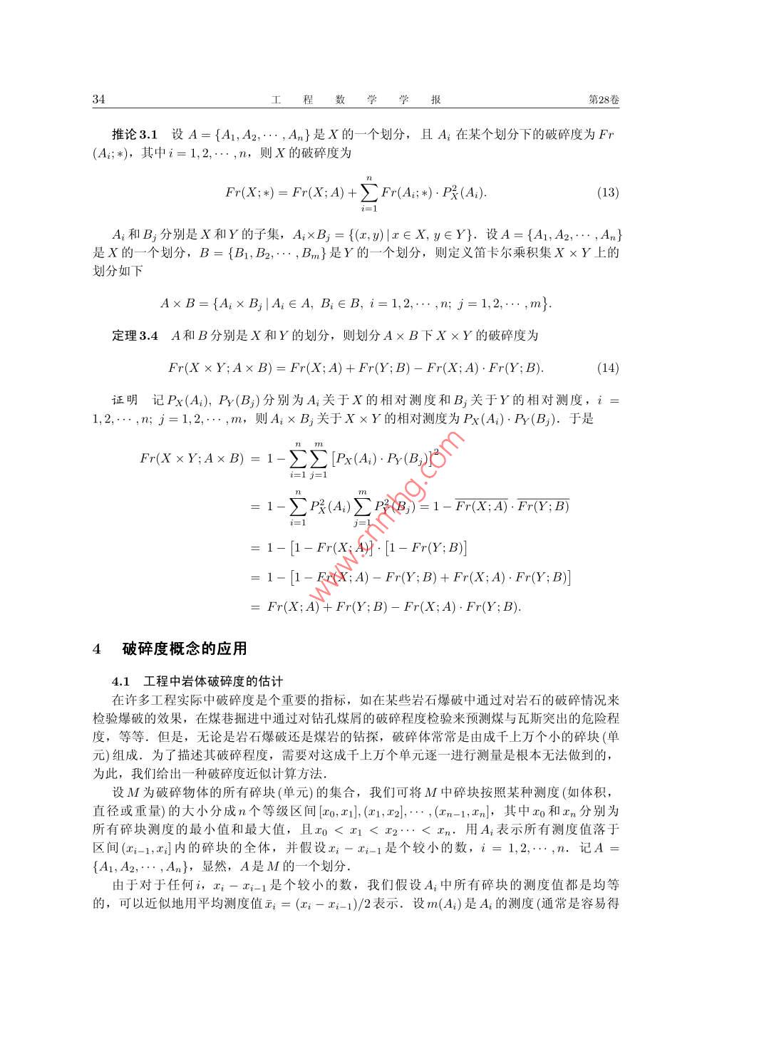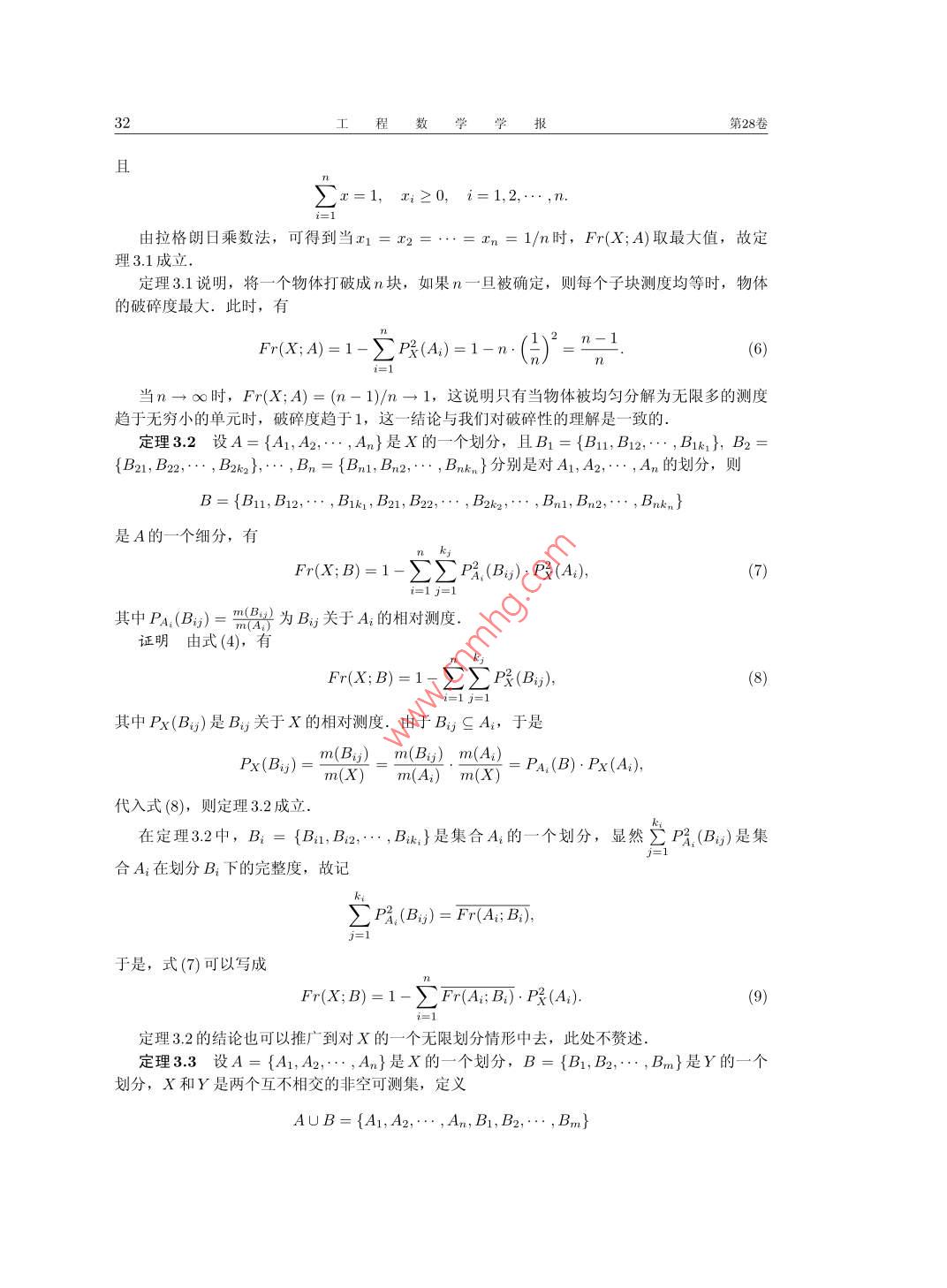 第28卷第1期工程數(shù)學(xué)學(xué)報Vol. 28 No. 1011年02月CHINESE JOURNAL OF ENGINEERING MATHEMATICSFeb.2011文章編號:1005-3085(2011)01-0028-09非空可測集劃分的破碎度量研究←郭嗣琮(遼寧工程技術(shù)大學(xué)理學(xué)院,遼寧阜新123000摘要:為解決材料科學(xué)中物體破碎度量的數(shù)學(xué)刻畫問題,本文將物體的破碎抽象為具有有限測度的可測集合的一個劃分,在分析了用碎塊測度描述物體的破碎概念應(yīng)滿足的準(zhǔn)則的條件下,依照破碎準(zhǔn)則構(gòu)建了一個能夠刻畫物體破碎程度的劃分測度函數(shù),得到了幾何物體破碎程度的數(shù)學(xué)表達(dá)式同時,研究了所提岀的破碎度函數(shù)的一些性質(zhì),并討論了幾個方面的應(yīng)用.破碎度的數(shù)學(xué)表述可以廣泛地應(yīng)用于礦物加工、巖石爆破、醫(yī)藥與食品加工等諸多領(lǐng)域.關(guān)鍵詞:測度;劃分:破碎度;完整度;劃分測度函數(shù)分類號:AMS(200028E15中圖分類號:O143文獻標(biāo)識碼:A1引言破碎度的概念被廣泛地使用在材料科學(xué),2、爆破科學(xué)β,、煤礦安全、地理信息科學(xué)和旅游景觀評價以及醫(yī)藥、食品加工等諸多領(lǐng)域.然而,至今在數(shù)學(xué)上對破碎度仍沒有一個統(tǒng)一的刻畫方式.盡管熵的概念可以描述事物的多樣性,但是用來刻畫物體的破碎程度還存在不足之處.分形理論S似乎是以“破碎”的幾何體為研究背景,但是人們也只是局限于討論破碎幾何體的分形維數(shù)⑨.事實上,在工程實際和日常生活中,由于觀察對象和研究目的不同,人們對于破碎的理解和描述也不同,因此,破碎度概念本身也難以給出統(tǒng)一的定義.例如,在以粉碎物體為目標(biāo)的工作中,人們會用被破碎的小碎塊測度(如體積,面積、質(zhì)量、直徑)來描述物體被破碎的程度;在某些諸如巖石巷道的支護、公路路面的養(yǎng)護等工程問題中,對象的破碎狀況不僅僅取決于小碎塊的測度,而且也與斷裂的裂隙分布形態(tài)有關(guān);在圖像處理技術(shù)的研究中,圖像的破碎程度要取決于圖像的多種拓?fù)湫再|(zhì).從這一方面來看,要從數(shù)學(xué)上對物體破碎程度作岀刻畫,至少要分為測度和形態(tài)兩個方面來硏究.本文站在用碎塊測度描述物體被破碎程度的角度上,給出了破碎概念應(yīng)滿足的準(zhǔn)則,并將物體的破碎抽象為可測集合的一個劃分,依照破碎準(zhǔn)則構(gòu)建了一個能夠刻畫破碎程度的劃分測度函數(shù)為破碎度.本文硏究了所提岀的破碎度函數(shù)的性質(zhì),同時討論了幾個方面的應(yīng)用2基于劃分的破碎度與劃分測度函數(shù)設(shè)(X,5,m)是一個有限測度空間,其中X是具有有限測度的非空集,為X所有子集構(gòu)成的a代數(shù),m是上的測度,稱A1,A2,…,An是X的一個n劃分,若每個A∈,且對任何i≠j,有A1∩A=重(空集),∪A2=X,記A={41,A2,…,An}.A1稱為A的一個劃分單元,i=1收稿日期:2008-08-04.作者簡介:郭嗣琮(1951年10月生),男,教授,研究方向:模糊信息處理技術(shù)與軟計算*基金項目:遼寧省教育廳高等學(xué)??蒲许椚?20060377郭嗣琮:非空可測集劃分的破碎度量研究又設(shè)B={B1,B2,…,Bm}是X的一個m劃分,m>n且對于任何i=1,2,…,m,B1要么是n劃分A的一個單元,要么是某個Ak(k=1,2,…,n)的劃分單元,則稱B是A的細(xì)分.例如,設(shè)A={A1,A2,A3},B={A1,A2,B1,B2},其中B1∩B2=重,B1UB2=A3則B是A的細(xì)分用C(X)表示非空可測集X的所有劃分的全體,顯然,X∈C(X)定義21設(shè)A,B∈C(X),如果B是A的細(xì)分,稱B細(xì)于A,記B2.2Px(A∑P(A1)由定義2.3,X在劃分B下的完整度為PX(Ai),即為在劃分A下的完整度的二分之綜上分析,我們給出一個可以表述可測集X劃分破碎度的數(shù)學(xué)表達(dá)式定義24設(shè)A={A1,A2,…,An}是具有有限測度的非空可測集X的一個劃分,劃分A的單元A關(guān)于X的相對測度為Px(A1),i=1,2,定義F(X;A)=∑Pk(4)[1-Px(A4=1-∑P(A為X在劃分A下的破碎度,并稱P為X在劃分A下的完整度對于X的一個無限劃分A={A1,A2,…,An,…},則定義Fr(X; A)=13破碎度的性質(zhì)定理31對于具有有限測度的非空可測集X的一個n劃分A={A1,A2,…,An當(dāng)m(A1)=m(A2)=…=m(An)時,Fr(x;A)達(dá)到最大證明由于m(A1)=m(A2)=…=m(An),意味著Px(A1)=Px(A2)=…=Px(An)1/n.記Px(A1)=x,i=1,2,…,n,則式(4)可寫成7(X;A)=1-∑32工程數(shù)學(xué)學(xué)報第28卷1,x;≥0,由拉格朗日乘數(shù)法,可得到當(dāng)r1=x2rn=1/n時,Fr(X;A)取最大值,故定理3.1成立定理3.1說明,將一個物體打破成n塊,如果n一旦被確定,則每個子塊測度均等時,物體的破碎度最大.此時,有F(X;A)=1-∑P當(dāng)n→∞時,Fr(X;A)=(n-1)/mn→1,這說明只有當(dāng)物體被均勻分解為無限多的測度趨于無窮小的單元時,破碎度趨于1,這一結(jié)論與我們對破碎性的理解是一致的.定理32設(shè)A={A1,A2,…,An}是X的一個劃分,且B1={B1,B12,…,B1k1},B2{B21,B2,…:,B2k2},…,Bn={Bn1,Bn2,…,Bnkn}分別是對A1,A2,…,An的劃分,則B={B1,B12,…,B1k1,B21,B2,…,B2kBnkny是A的一個細(xì)分,有F7(X;B)=1-∑∑PA(B21)P(A1)(7)其中PA、(B)=mBA為B關(guān)于A的相對測度明由式(4),有F(X;B)=1-∑∑P(B1其中Px(By)是B關(guān)于X的相對測度.由于B1≌A,于是Px(B,)=m(B)=m(B). m(A) =PA(B). Px(A,代入式(8),則定理32成立在定理32中,B2={B1,B2,…,B}是集合A的一個劃分,顯然∑P,(B)是集合A1在劃分B下的完整度,故記PA (Bii)= Fr(Ai; Bi),于是,式(7)可以寫成Pr(A;B)·P(A1)定理32的結(jié)論也可以推廣到對X的一個無限劃分情形中去,此處不