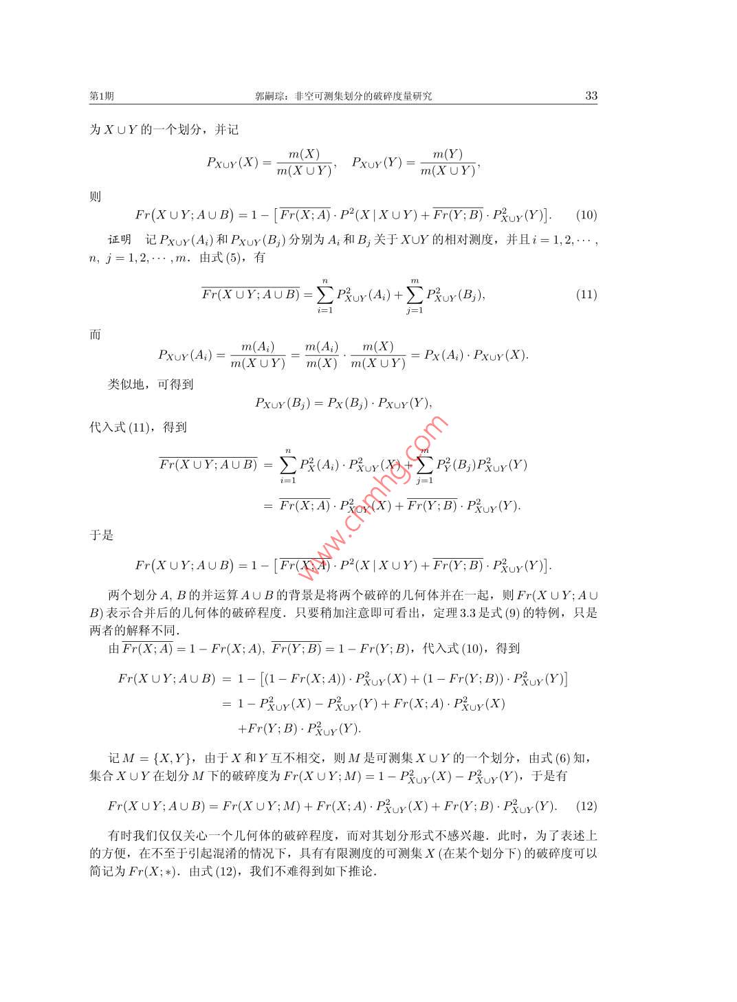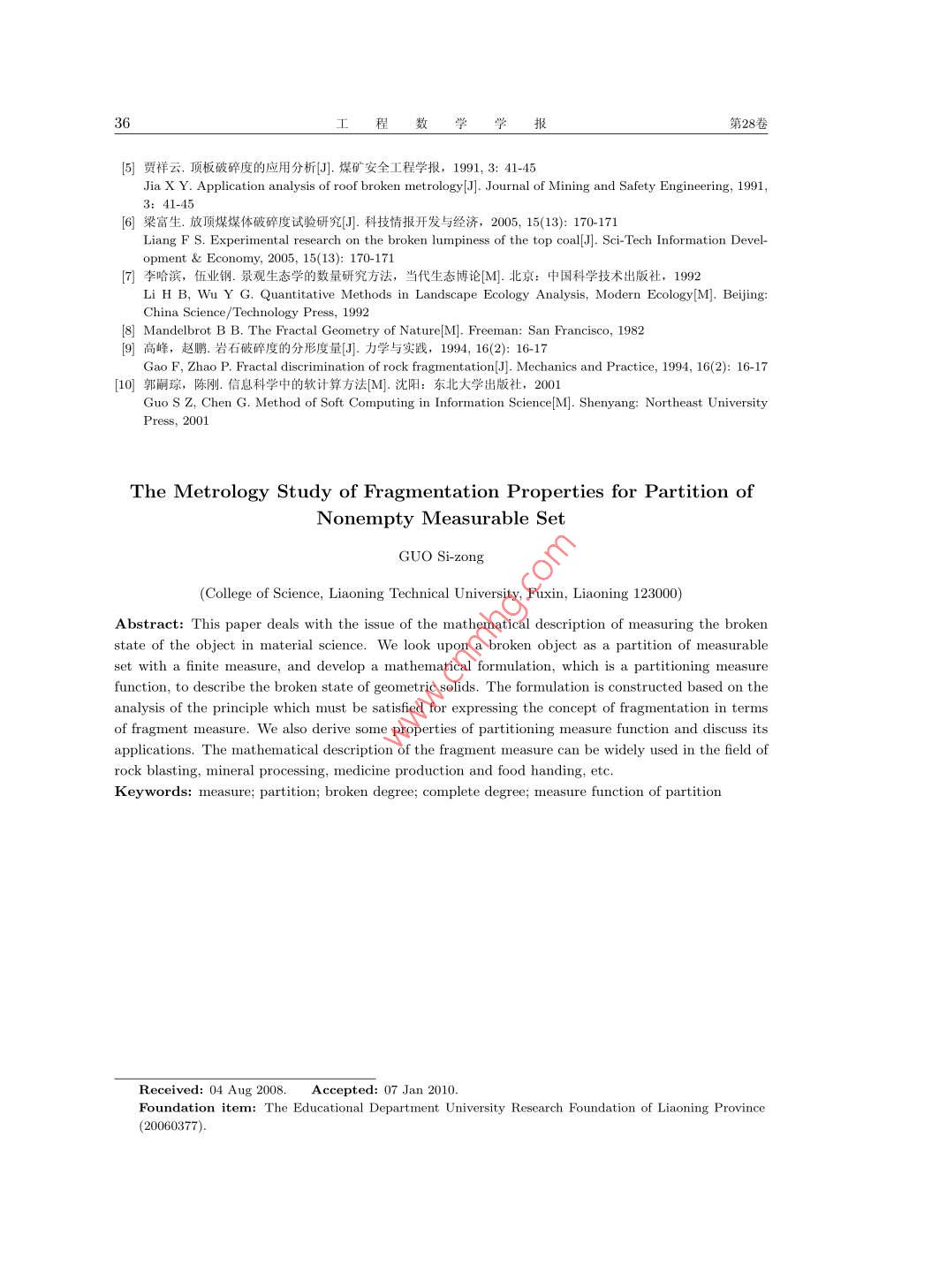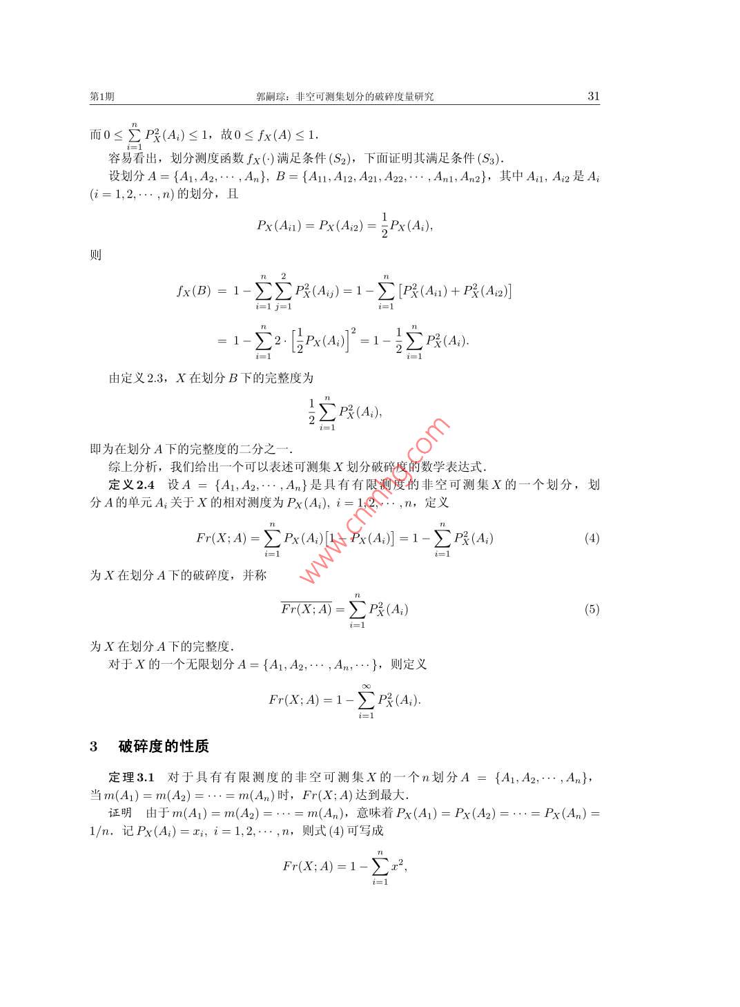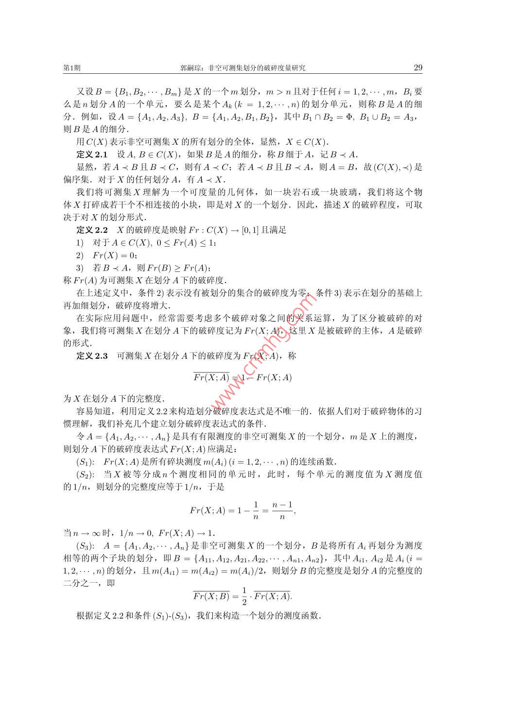 第28卷第1期工程數(shù)學(xué)學(xué)報Vol. 28 No. 1011年02月CHINESE JOURNAL OF ENGINEERING MATHEMATICSFeb.2011文章編號:1005-3085(2011)01-0028-09非空可測集劃分的破碎度量研究←郭嗣琮(遼寧工程技術(shù)大學(xué)理學(xué)院,遼寧阜新123000摘要:為解決材料科學(xué)中物體破碎度量的數(shù)學(xué)刻畫問題,本文將物體的破碎抽象為具有有限測度的可測集合的一個劃分,在分析了用碎塊測度描述物體的破碎概念應(yīng)滿足的準(zhǔn)則的條件下,依照破碎準(zhǔn)則構(gòu)建了一個能夠刻畫物體破碎程度的劃分測度函數(shù),得到了幾何物體破碎程度的數(shù)學(xué)表達(dá)式同時,研究了所提岀的破碎度函數(shù)的一些性質(zhì),并討論了幾個方面的應(yīng)用.破碎度的數(shù)學(xué)表述可以廣泛地應(yīng)用于礦物加工、巖石爆破、醫(yī)藥與食品加工等諸多領(lǐng)域.關(guān)鍵詞:測度;劃分:破碎度;完整度;劃分測度函數(shù)分類號:AMS(200028E15中圖分類號:O143文獻標(biāo)識碼:A1引言破碎度的概念被廣泛地使用在材料科學(xué),2、爆破科學(xué)β,、煤礦安全、地理信息科學(xué)和旅游景觀評價以及醫(yī)藥、食品加工等諸多領(lǐng)域.然而,至今在數(shù)學(xué)上對破碎度仍沒有一個統(tǒng)一的刻畫方式.盡管熵的概念可以描述事物的多樣性,但是用來刻畫物體的破碎程度還存在不足之處.分形理論S似乎是以“破碎”的幾何體為研究背景,但是人們也只是局限于討論破碎幾何體的分形維數(shù)⑨.事實上,在工程實際和日常生活中,由于觀察對象和研究目的不同,人們對于破碎的理解和描述也不同,因此,破碎度概念本身也難以給出統(tǒng)一的定義.例如,在以粉碎物體為目標(biāo)的工作中,人們會用被破碎的小碎塊測度(如體積,面積、質(zhì)量、直徑)來描述物體被破碎的程度;在某些諸如巖石巷道的支護、公路路面的養(yǎng)護等工程問題中,對象的破碎狀況不僅僅取決于小碎塊的測度,而且也與斷裂的裂隙分布形態(tài)有關(guān);在圖像處理技術(shù)的研究中,圖像的破碎程度要取決于圖像的多種拓?fù)湫再|(zhì).從這一方面來看,要從數(shù)學(xué)上對物體破碎程度作岀刻畫,至少要分為測度和形態(tài)兩個方面來硏究.本文站在用碎塊測度描述物體被破碎程度的角度上,給出了破碎概念應(yīng)滿足的準(zhǔn)則,并將物體的破碎抽象為可測集合的一個劃分,依照破碎準(zhǔn)則構(gòu)建了一個能夠刻畫破碎程度的劃分測度函數(shù)為破碎度.本文硏究了所提岀的破碎度函數(shù)的性質(zhì),同時討論了幾個方面的應(yīng)用2基于劃分的破碎度與劃分測度函數(shù)設(shè)(X,5,m)是一個有限測度空間,其中X是具有有限測度的非空集,為X所有子集構(gòu)成的a代數(shù),m是上的測度,稱A1,A2,…,An是X的一個n劃分,若每個A∈,且對任何i≠j,有A1∩A=重(空集),∪A2=X,記A={41,A2,…,An}.A1稱為A的一個劃分單元,i=1收稿日期:2008-08-04.作者簡介:郭嗣琮(1951年10月生),男,教授,研究方向:模糊信息處理技術(shù)與軟計算*基金項目:遼寧省教育廳高等學(xué)??蒲许椚?20060377郭嗣琮:非空可測集劃分的破碎度量研究又設(shè)B={B1,B2,…,Bm}是X的一個m劃分,m>n且對于任何i=1,2,…,m,B1要么是n劃分A的一個單元,要么是某個Ak(k=1,2,…,n)的劃分單元,則稱B是A的細(xì)分.例如,設(shè)A={A1,A2,A3},B={A1,A2,B1,B2},其中B1∩B2=重,B1UB2=A3則B是A的細(xì)分用C(X)表示非空可測集X的所有劃分的全體,顯然,X∈C(X)定義21設(shè)A,B∈C(X),如果B是A的細(xì)分,稱B細(xì)于A,記B2.2Px(A∑P(A1)由定義2.3,X在劃分B下的完整度為PX(Ai),即為在劃分A下的完整度的二分之綜上分析,我們給出一個可以表述可測集X劃分破碎度的數(shù)學(xué)表達(dá)式定義24設(shè)A={A1,A2,…,An}是具有有限測度的非空可測集X的一個劃分,劃分A的單元A關(guān)于X的相對測度為Px(A1),i=1,2,定義F(X;A)=∑Pk(4)[1-Px(A4=1-∑P(A為X在劃分A下的破碎度,并稱P為X在劃分A下的完整度對于X的一個無限劃分A={A1,A2,…,An,…},則定義Fr(X; A)=13破碎度的性質(zhì)定理31對于具有有限測度的非空可測集X的一個n劃分A={A1,A2,…,An當(dāng)m(A1)=m(A2)=…=m(An)時,Fr(x;A)達(dá)到最大證明由于m(A1)=m(A2)=…=m(An),意味著Px(A1)=Px(A2)=…=Px(An)1/n.記Px(A1)=x,i=1,2,…,n,則式(4)可寫成7(X;A)=1-∑32工程數(shù)學(xué)學(xué)報第28卷1,x;≥0,由拉格朗日乘數(shù)法,可得到當(dāng)r1=x2rn=1/n時,Fr(X;A)取最大值,故定理3.1成立定理3.1說明,將一個物體打破成n塊,如果n一旦被確定,則每個子塊測度均等時,物體的破碎度最大.此時,有F(X;A)=1-∑P當(dāng)n→∞時,Fr(X;A)=(n-1)/mn→1,這說明只有當(dāng)物體被均勻分解為無限多的測度趨于無窮小的單元時,破碎度趨于1,這一結(jié)論與我們對破碎性的理解是一致的.定理32設(shè)A={A1,A2,…,An}是X的一個劃分,且B1={B1,B12,…,B1k1},B2{B21,B2,…:,B2k2},…,Bn={Bn1,Bn2,…,Bnkn}分別是對A1,A2,…,An的劃分,則B={B1,B12,…,B1k1,B21,B2,…,B2kBnkny是A的一個細(xì)分,有F7(X;B)=1-∑∑PA(B21)P(A1)(7)其中PA、(B)=mBA為B關(guān)于A的相對測度明由式(4),有F(X;B)=1-∑∑P(B1其中Px(By)是B關(guān)于X的相對測度.由于B1≌A,于是Px(B,)=m(B)=m(B). m(A) =PA(B). Px(A,代入式(8),則定理32成立在定理32中,B2={B1,B2,…,B}是集合A的一個劃分,顯然∑P,(B)是集合A1在劃分B下的完整度,故記PA (Bii)= Fr(Ai; Bi),于是,式(7)可以寫成Pr(A;B)·P(A1)定理32的結(jié)論也可以推廣到對X的一個無限劃分情形中去,此處不