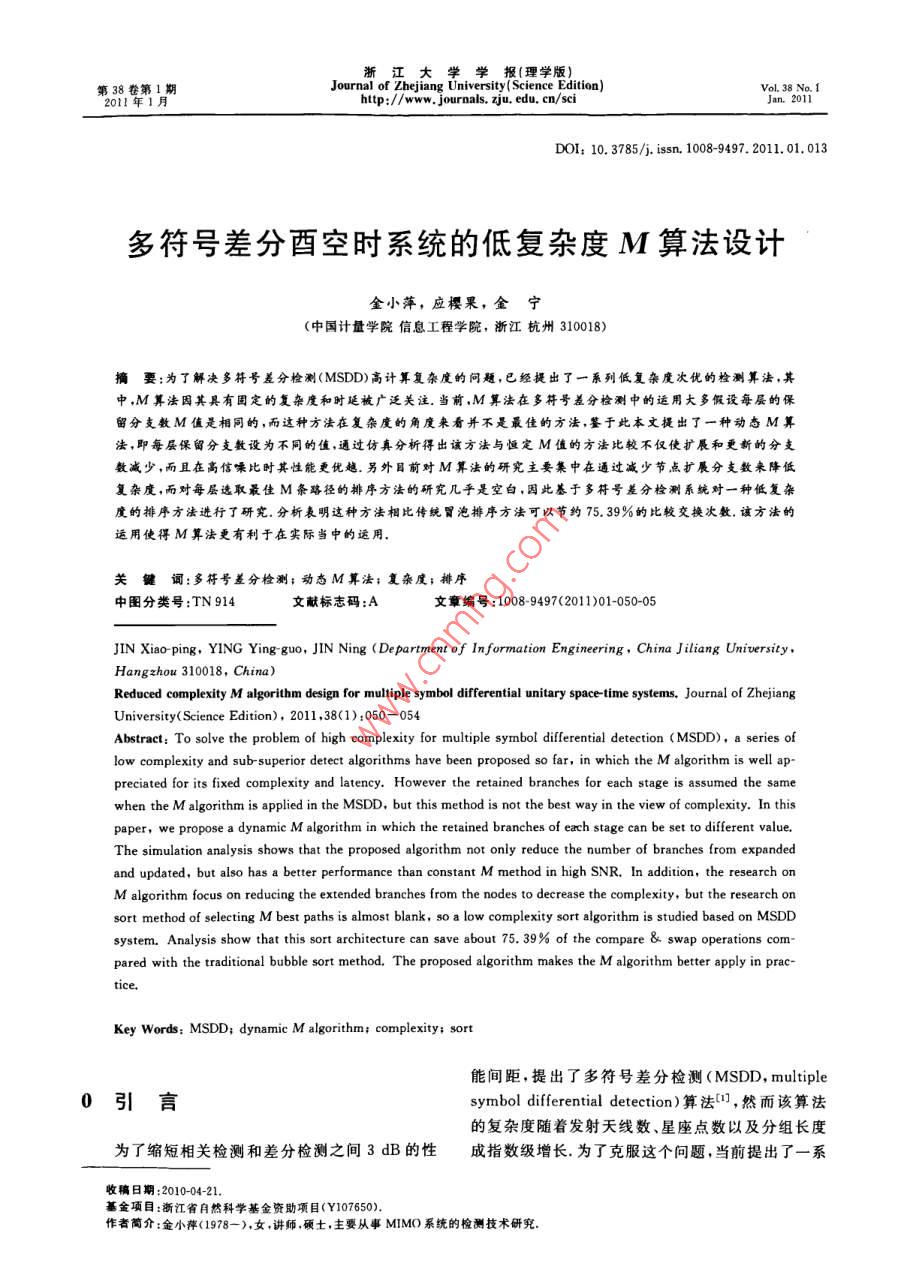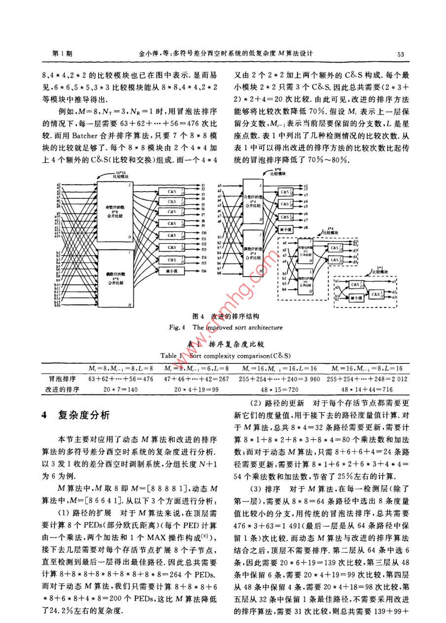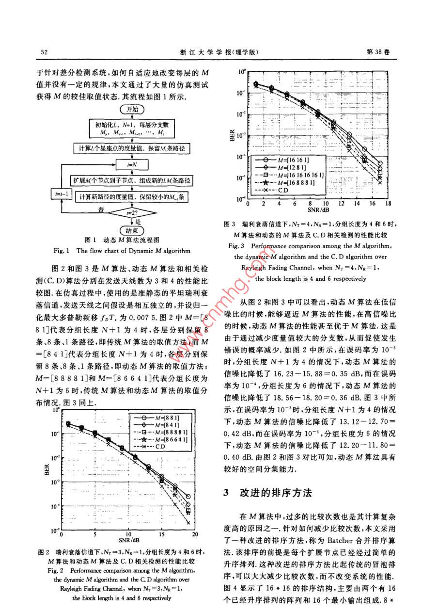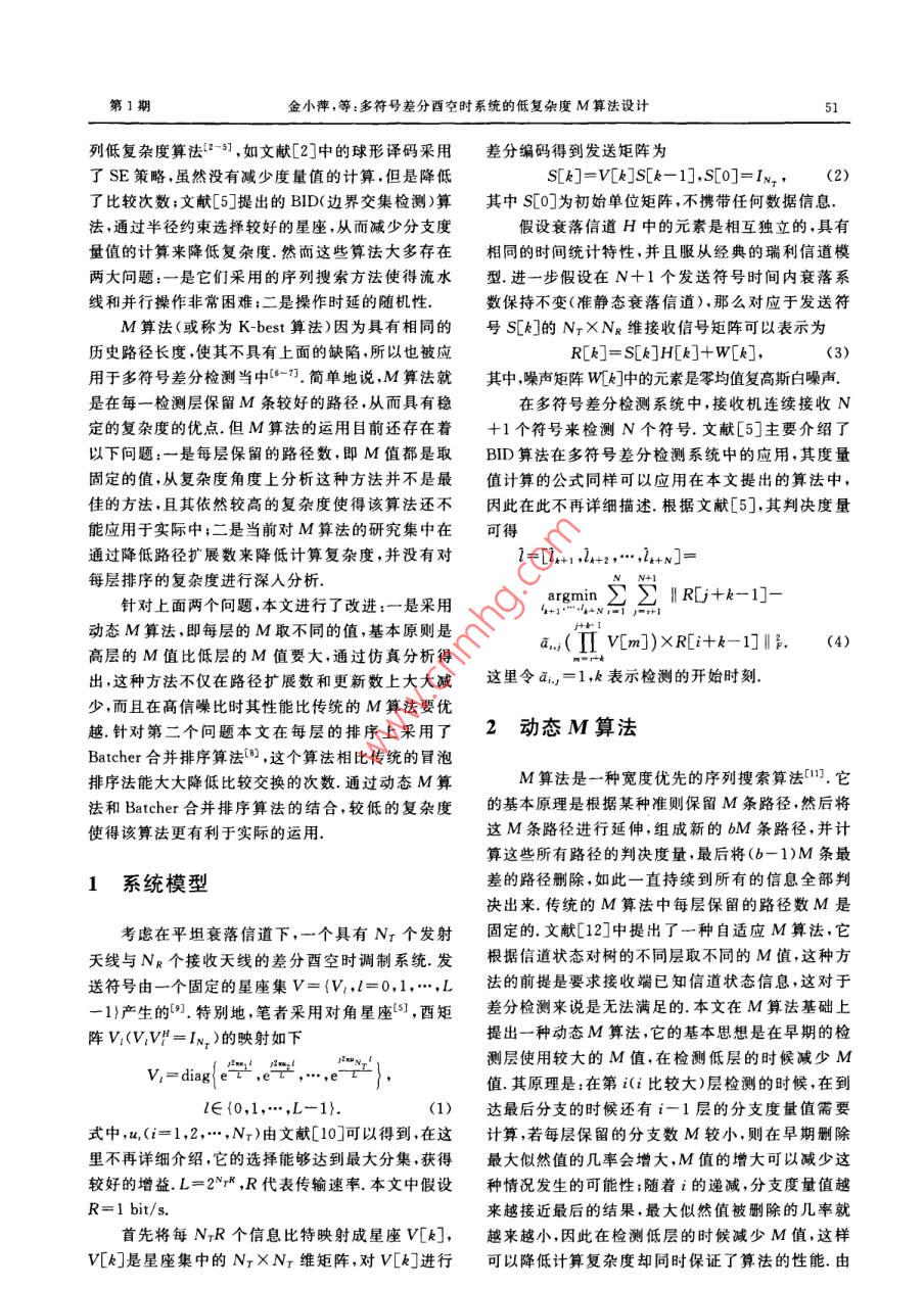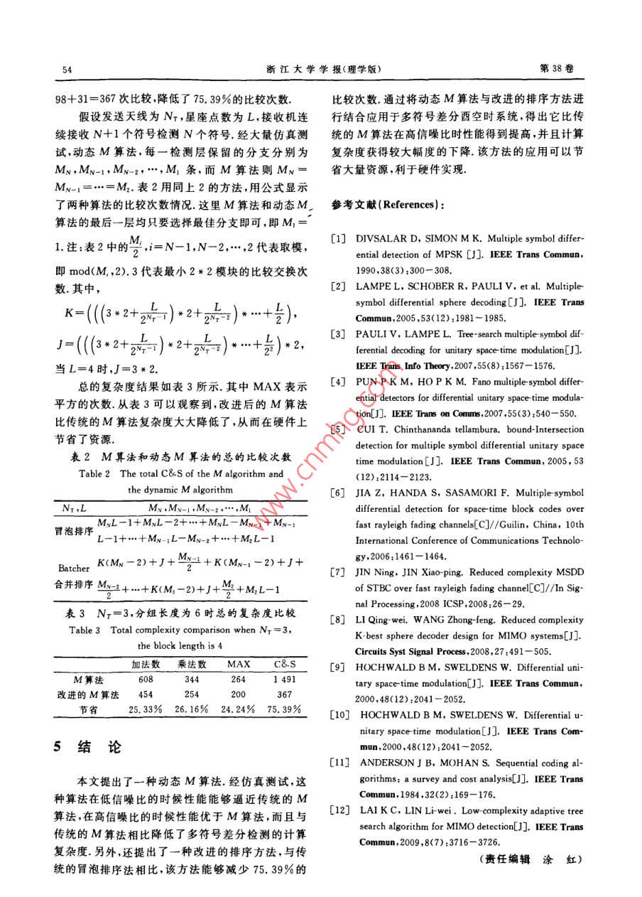 學報【理學版第38卷第1期Journal ofrsity( Science Edition)o11年1月ls zju. edu. cn/seiJan. 2011DOI:10.3785/j.isn.10089497.2011.01.013多符號差分酉空時系統(tǒng)的低復雜度M算法設(shè)計金小萍,應(yīng)櫻果,金寧(中國計量學院信息工程學院,浙江杭州310018)摘要:為了解決多符號差分檢測(MSDD)高計算復雜度的問題,已經(jīng)提出了一系列低復雜度次優(yōu)的檢測算法,其中,M算法因其具有固定的復雜度和時延被廣泛關(guān)注.當前,M算法在多符號差分檢測中的運用大多假設(shè)每層的保留分支數(shù)M僬是相同的,而這種方法在復雜度的角度來看并不是最佳的方法,鑒于此本文提出了一種動態(tài)M算法,即每層保留分支數(shù)設(shè)為不同的僬,通過仿真分析得出該方法與恒定M值的方法比較不僅使擴展和更新的分支數(shù)減少,而且在高信噪比時其性能更優(yōu)越.另外目前對M算法的研究主要集中在通過減少節(jié)點擴展分支數(shù)來降低復雜度,而對每層選取最佳M條路徑的排序方法的研究凡乎是空白,因此基于多符號差分檢測系統(tǒng)對一種低復雜度的排序方法進行了研究。分析表明這種方法相比傳統(tǒng)冒泡排序方法可以節(jié)約75.39%的比較交換次數(shù),該方法的運用使得M算法更有利于在實際當中的運用關(guān)鍵詞:多符號差分檢測;動態(tài)M算法;復雜度;排序中圖分類號:TN914文獻標志碼:A文章編號:10089497(2011)01-050-05JIN Xiao-ping, YING Ying-guo, JIN Ning( Department of In formation Engineering, China Jiliang UniversityHangzhou 310018, China)Reduced complexity M algorithm design for multiple symbol differential unitary space-time systems. Journal of ZhejiangUniversity(Science Edition), 2011, 38(1): 050-054Abstract: To solve the problem of high complexity for multiple symbol differential detection (MSDD), a series oflow complexity and sub-superior detect algorithms have been proposed so far, in which the M algorithm is well appreciated for its fixed complexity and latency. However the retained branches for each stage is assumed the samewhen the m algorithm is applied in the MSDD, but this method is not the best way in the view of complexity. In thispaper, we propose a dynamic M algorithm in which the retained branches of each stage can be set to different value.The simulation analysis shows that the proposed algorithm not only reduce the number of branches from expandedand updated, but also has a better performance than constant M method in high SNR. In addition, the research onM algorithm focus on reducing the extended branches from the nodes to decrease the complexity, but the research onsort method of selecting M best paths is almost blank, so a low complexity sort algorithm is studied based on MSDDsystem. analysis show that this sort architecture can save about 75. 39% of the compare swap operations com-pared with the traditional bubble sort method. The proposed algorithm makes the M algorithm better apply in prKey Words: MSDD: dynamic M algorithm: complexity: sort能間距,提出了多符號差分檢測(MSDD, multiple0引言symbol differential detection)算法(,然而該算法的復雜度隨著發(fā)射天線數(shù)、星座點數(shù)以及分組長度為了縮短相關(guān)檢測和差分檢測之間3dB的性成指數(shù)級增長為了克服這個問題,當前提出了一系收稿日期:201004-21基金項目:浙江省自然科學基金資助項目(Y107650)作者簡介:金小萍(1978-),女,講師碩土,主要從事MIMO系統(tǒng)的檢測技術(shù)研究第1期金小萍,等:多符號差分酉空時系統(tǒng)的低復雜度M算法設(shè)計51列低復雜度算法2-51,如文獻[2]中的球形譯碼采用差分編碼得到發(fā)送矩陣為了SE策略,雖然沒有減少度量值的計算,但是降低S[k]=V[k]S[k-1],S[0]=Ix,(2)了比較次數(shù);文獻[5]提出的BID(邊界交集檢測)算其中S[0]為初始單位矩陣,不攜帶任何數(shù)據(jù)信息法,通過半徑約束選擇較好的星座,從而減少分支度假設(shè)衰落信道H中的元素是相互獨立的,具有量值的計算來降低復雜度.然而這些算法大多存在相同的時間統(tǒng)計特性,并且服從經(jīng)典的瑞利信道模兩大問題:一是它們采用的序列搜索方法使得流水型.進一步假設(shè)在N+1個發(fā)送符號時間內(nèi)衰落系線和并行操作非常困難;二是操作時延的隨機性數(shù)保持不變(準靜態(tài)衰落信道),那么對應(yīng)于發(fā)送符M算法(或稱為 K-best算法)因為具有相同的號Sk]的NXNk維接收信號矩陣可以表示為歷史路徑長度,使其不具有上面的缺陷,所以也被應(yīng)RCk]=SCk]HLk]+W[k]用于多符號差分檢測當中6-.簡單地說,M算法就其中噪聲矩陣Wk]中的元素是零均值復高斯白噪聲是在每一檢測層保留M條較好的路徑,從而具有穩(wěn)在多符號差分檢測系統(tǒng)中,接收機連續(xù)接收N定的復雜度的優(yōu)點但M算法的運用目前還存在著+1個符號來檢測N個符號.文獻[5]主要介紹了以下問題:一是每層保留的路徑數(shù),即M值都是取BID算法在多符號差分檢測系統(tǒng)中的應(yīng)用,其度量固定的值,從復雜度角度上分析這種方法并不是最值計算的公式同樣可以應(yīng)用在本文提出的算法中佳的方法,且其依然較高的復雜度使得該算法還不因此在此不再詳細描述根據(jù)文獻[5],其判決度量能應(yīng)用于實際中;二是當前對M算法的研究集中在可得通過降低路徑擴展數(shù)來降低計算復雜度,并沒有對+N=每層排序的復雜度進行深入分析針對上面兩個問題,本文進行了改進:一是采用argmin‖R[+k-1動態(tài)M算法,即每層的M取不同的值,基本原則是高層的M值比低層的M值要大,通過