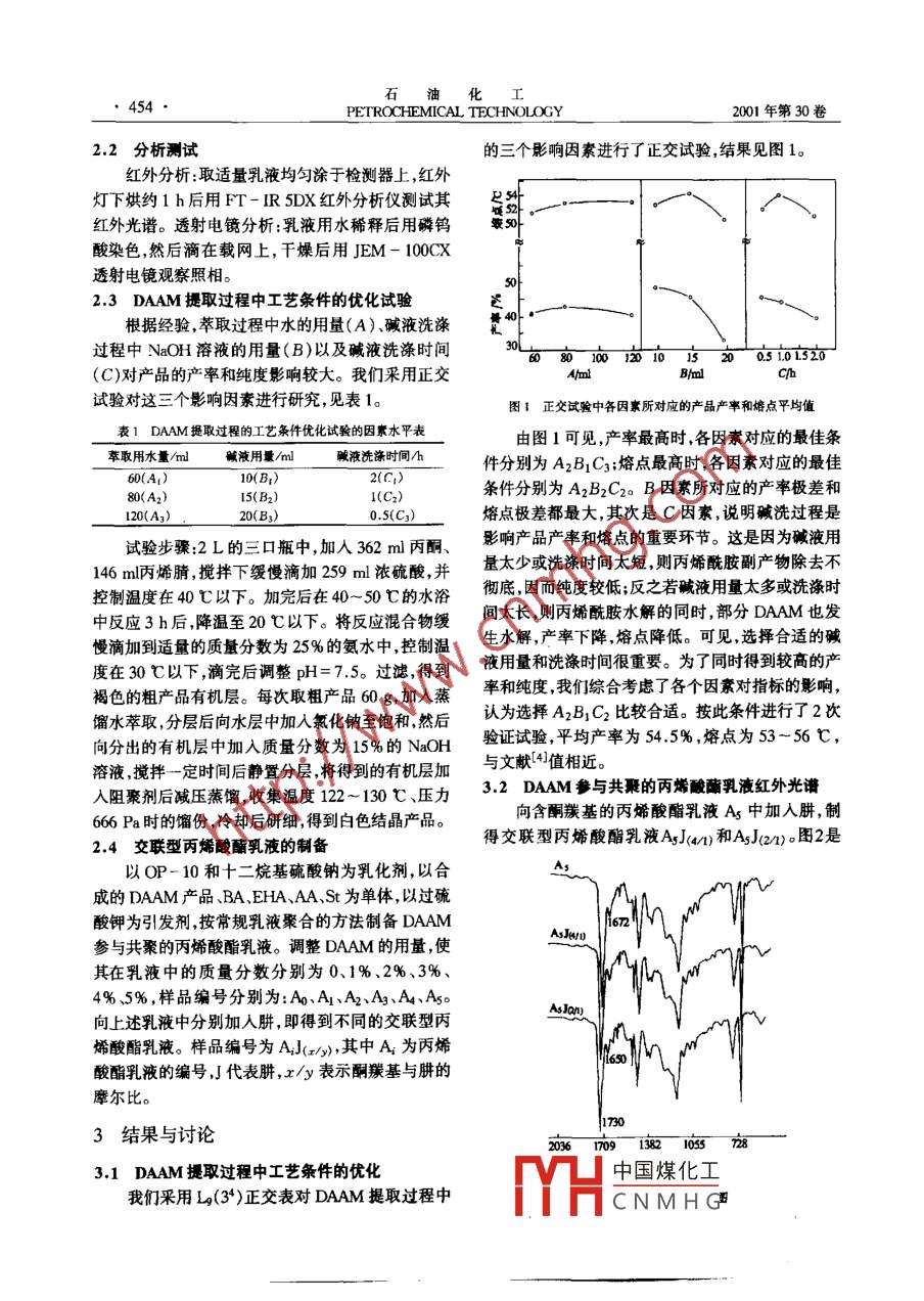200l年第30卷第6期PETROCHEMICAL TECHNOLOGY453雙丙酮丙烯酰胺的合成及應(yīng)用崔月芝,張慶思,段洪東,趙傳山,王世秦(山東輕工業(yè)學(xué)院化工系,山東濟(jì)南250100)摘要]采取一種新的提取產(chǎn)品的工藝方法使丙酮與丙烯睛在濃硫酸中生成雙丙酮丙烯酰胺后,產(chǎn)品的提取不必經(jīng)過重結(jié)晶,避免了揮發(fā)性溶劑對(duì)環(huán)境的污染;采用正交試驗(yàn)設(shè)計(jì)法對(duì)提取過程的三個(gè)主要影響因素(萃取用水囊堿洗過程中堿液的用量和堿洗時(shí)間)進(jìn)行了優(yōu)化,產(chǎn)品產(chǎn)率達(dá)54.5%,熔點(diǎn)53~56℃。以合成的產(chǎn)品為官能單體,以肼為交聯(lián)劑制備了交聯(lián)型的丙烯酸乳液利用紅外光譜技術(shù)證實(shí)了交聯(lián)反應(yīng)的發(fā)生,并對(duì)該交聯(lián)型乳液的膜性能進(jìn)行了關(guān)鵪調(diào)]雙丙翻丙烯酰胺;提取;丙烯酸酯;乳液;交聯(lián)文章編號(hào)]1000-8144(2001)06-0453-03[中圖分類號(hào)]0623.542[文獻(xiàn)標(biāo)識(shí)碼雙丙酮丙烯酰胺(DAAM作為一種新型的乙烯的提取方法進(jìn)行了改進(jìn)并以合成的產(chǎn)品為原料,制基單體,與其它乙烯基單體共聚后可向聚合物中引備了交聯(lián)型丙烯酸酯乳液,對(duì)乳液中酮羰基與肼的入酮羰基,利用酮羰基活潑的化學(xué)性質(zhì),可使聚合物交聯(lián)反應(yīng)及乳液的膜性能進(jìn)行了研究。發(fā)生交聯(lián)接枝等反應(yīng),因而在聚合物改性方面有重要意義。目前國外有關(guān)這方面的研究報(bào)道不斷出1原理部分現(xiàn)1-3),但合成DAAM的研究報(bào)道不多,已有DAAM合成反應(yīng)見式(1)。由于該反應(yīng)在濃硫的合成方法也不完善。本工作對(duì)合成過程中DAAM酸中進(jìn)行,難以避免地發(fā)生多種副反應(yīng),其中最主要CH3o CH OCHeCHCN2CH3OCH3地,CH2 CCH2C--OHCH2-CHCNHCCH2CCH3(1)濃H2SOCH3CH3(DAAM)的副產(chǎn)物是丙烯腈的水解產(chǎn)物——丙烯酰胺,另外需重結(jié)晶。DAAM與其它丙烯酸酯類單體共聚可還有各種乙烯基單體的聚合物丙酮的各種縮合體得到含有酮羰基的丙烯酸酯乳液向該乳液中加人等。通常提取DAAM的工藝流程為:肼,即得到一種交聯(lián)型丙烯酸酯乳液。在成膜過程DAAM粗產(chǎn)品一減壓蒸餾一→加苯溶解中,酮羰基與肼發(fā)生交聯(lián)使膜的耐水性、耐溶劑性在石油醚中結(jié)晶一→過濾一→產(chǎn)品和強(qiáng)度等得到提高。上述工藝流程的缺點(diǎn):(1)DAM在石油醚中2試驗(yàn)部分結(jié)晶速度過快,難以得到滿意的晶形,提純效果不住;(2)DAAM熔點(diǎn)較低,結(jié)晶和過濾均需在低溫下2,1原料與試劑進(jìn)行;(3)苯和石油醚揮發(fā)性大,對(duì)環(huán)境污染嚴(yán)重;丙酮丙烯腈濃硫酸、氫氧化鈉、過硫酸鉀、焦(4)粗產(chǎn)品中含有大量雜質(zhì),蒸餾過程中易聚合成粘磷酸鈉、水合肼氨水(氨質(zhì)量分?jǐn)?shù)為25%)均為化稠物,難以除去。為此我們采取以下改進(jìn)措施。學(xué)純;丙烯酸丁酯(BA)丙烯酸異辛酯(EHA)丙烯DAAM粗產(chǎn)品一用水萃取一→鹽析酸(AA)、苯乙烯(S)、十二烷基硫酸鈉、壬基酚聚氧堿液洗滌一減壓蒸餾一·產(chǎn)品乙烯醚(OP-10)、氯化鈉均為工業(yè)級(jí)。DAAM是一種水溶性物質(zhì)用水萃取和鹽析分別除去了大部分的油狀物和水溶性大的雜質(zhì)堿液[收稿日期洗滌使大部分丙烯酰胺水解而除去。由于在減壓蒸作者筒中國煤化工人,土,講電話餾前已除掉了大部分雜質(zhì)因而蒸餾后產(chǎn)品較純,無[菖金項(xiàng)YHCNMHG簧助課題454PETROCHEMICAL TECHNOLOGY2001年第30卷2.2分析測試的三個(gè)影響因素進(jìn)行了正交試驗(yàn),結(jié)果見圖1。紅外分析:取適量乳液均勻涂于檢測器上,紅外燈下烘約1h后用FT-R5DX紅外分析儀測試其紅外光譜。透射電鏡分析:乳液用水稀釋后用磷鎢劉酸染色,然后滴在載網(wǎng)上,干燥后用JEM-100CX透射電鏡觀察照相23DAAM提取過程中工藝條件的優(yōu)化試驗(yàn)根據(jù)經(jīng)驗(yàn),萃取過程中水的用量(A)堿液洗滌踅過程中NaOH溶液的用量(B)以及堿液洗滌時(shí)間(C)對(duì)產(chǎn)品的產(chǎn)率和純度影響較大。我們采用正交Biml試驗(yàn)對(duì)這三個(gè)影響因素進(jìn)行研究,見表1。圖I正交試驗(yàn)中各因素所對(duì)應(yīng)的產(chǎn)品產(chǎn)率和熔點(diǎn)平均值表1DAAM提取過程的工藝條件優(yōu)化試驗(yàn)的因素水平表由圖1可見,產(chǎn)率最高時(shí),各因素對(duì)應(yīng)的最佳條萃取用水量/ml堿液用量/ml液洗滌時(shí)間/h60(A1)10(件分別為A2B1C3;熔點(diǎn)最高時(shí),各因素對(duì)應(yīng)的最佳2(C1)80(A2)1(C2)條件分別為A2B2C20B因素所對(duì)應(yīng)的產(chǎn)率極差和0(c2)熔點(diǎn)極差都最大,其次是C因素,說明堿洗過程是試驗(yàn)步驟2L的三口瓶中加入362ml丙酮、影響產(chǎn)品產(chǎn)率和熔點(diǎn)的重要環(huán)節(jié)。這是因?yàn)閴A液用146m丙烯腈,攪拌下緩慢滴加259ml濃硫酸,并量太少或洗滌時(shí)間太短則丙烯酰胺副產(chǎn)物除去不控制溫度在40℃以下。加完后在40-50℃的水浴徹底因而純度較低;反之若堿液用量太多或洗滌時(shí)中反應(yīng)3h后,降溫至20℃以下。將反應(yīng)混合物緩間太長則丙烯酰胺水解的同時(shí),部分DAAM也發(fā)慢滴加到適量的質(zhì)量分?jǐn)?shù)為25%的氨水中控制溫生水解,產(chǎn)率下降,熔點(diǎn)降低??梢娺x擇合適