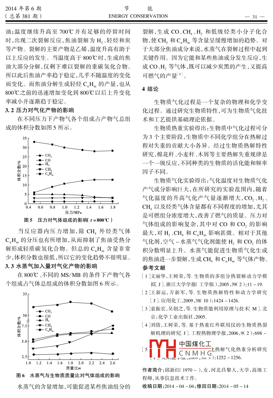 能2014年第6期ENERGY CONSERVATION(總第381期)生物質(zhì)熱解氣化特性分析邱新紅(唐山市科技情報(bào)研究所,河北唐山063000摘要:通過(guò)對(duì)玉米稈、小麥稈、棉花稈、稻草、松木屑等生物質(zhì)進(jìn)行熱重分析和差熱分析,分析了生物質(zhì)氣化過(guò)程的裂解機(jī)理。研究中采用松木屑作為氣化原料,得出了氣化溫度、壓力、水蒸氣加入量等反應(yīng)條件對(duì)氣化產(chǎn)物的產(chǎn)率、組成成分及焦油產(chǎn)率的影響規(guī)律,研究結(jié)杲表明,溫度對(duì)生物質(zhì)氣化的影響最大,當(dāng)溫度為800℃時(shí)氣體的產(chǎn)率最高。關(guān)鍵詞:生物質(zhì)氣化;熱解特性;動(dòng)力學(xué)中圖分類號(hào):TK6文獻(xiàn)標(biāo)識(shí)碼:A文章編號(hào):1004-7948(2014)6-0028-04doi:103969/j.issn.1004-7948.2014.06.007引言素分析儀測(cè)定。華北地區(qū)典型生物質(zhì)的元素分析結(jié)果如表2所示。在諸多生物質(zhì)利用方法中,生物質(zhì)氣化以其高表2生物質(zhì)元素分析及熱值效率、低成本、使用和運(yùn)輸方便等諸多優(yōu)點(diǎn)越來(lái)越LHV受到人們的關(guān)注。由于氣化過(guò)程是復(fù)雜的物理和物料%H%0%N%S/%/kJ·kg-1化學(xué)變化過(guò)程,生物質(zhì)原料的物理性質(zhì)、形狀的復(fù)雜草48.246.0544.800.750.1616897雜性決定了生物質(zhì)在氣化過(guò)程中熱傳導(dǎo)和不完全松木屑51.016.00420.080.01燃燒過(guò)程的復(fù)雜多變11氣化過(guò)程的復(fù)雜性使得稻草48.305.3045.500.810.0917636玉米稈49.306.0243.870.690.1217746生物質(zhì)氣化技術(shù)的開(kāi)發(fā)、后續(xù)氣化設(shè)備設(shè)計(jì)和制造棉花稈49.825.6843.620.670.2118089等存在一定的困難。為深入研究生物質(zhì)氣化機(jī)理小麥稈49.626.1143.590.620.0618563為生產(chǎn)和制造生物質(zhì)氣化設(shè)備提供參考,文中對(duì)我國(guó)典型生物質(zhì)的氣化特性進(jìn)行分析研究1.2熱重-差熱實(shí)驗(yàn)實(shí)驗(yàn)前,將樣品在自然條件下風(fēng)干,然后用粉1實(shí)驗(yàn)內(nèi)容碎機(jī)粉碎。粉碎后的原料顆粒直徑小于20μm。1.1生物質(zhì)基本燃料特性分析實(shí)驗(yàn)所用的儀器是德國(guó)耐馳儀器制造有限公司生1.1.1工業(yè)分析產(chǎn)的STA499C型常壓熱重分析儀。實(shí)驗(yàn)用生物質(zhì)選擇我國(guó)華北地區(qū)主要的農(nóng)作1.3生物質(zhì)氣化實(shí)驗(yàn)物秸稈、木屑、雜草等為研究對(duì)象,各種生物質(zhì)工業(yè)實(shí)驗(yàn)原料采用粉碎機(jī)粉碎成小于10mm,在分析的結(jié)果如表1所示。05℃溫度下烘干2h后備用。生物質(zhì)氣化反應(yīng)器表1生物質(zhì)工業(yè)分析值為實(shí)驗(yàn)室規(guī)模的加壓氣化裝置,如圖1所示物料揮發(fā)分固定碳灰分實(shí)驗(yàn)前,先將鼓風(fēng)干燥箱中的溫度設(shè)定為雜草(105±2)℃,并將物料放入其中干燥2h。實(shí)驗(yàn)過(guò)松木屑76.48程V凵中國(guó)煤化工的溫度和壓力后,進(jìn)料玉米稈器CNMHG穩(wěn)后在反應(yīng)器出口處棉花稈69.5518.25用氣袋收集氣體,此時(shí)的反應(yīng)參數(shù)等由計(jì)算機(jī)讀小麥稈5.44取。實(shí)驗(yàn)考察溫度在400~900℃對(duì)氣態(tài)產(chǎn)物組成1.1.2元素分析的影響,以50℃為增量,氣化劑為空氣,并考察在研究中實(shí)驗(yàn)物料的C、H、N、S、O含量采用元溫度不變(800℃),壓力分別為0.5MPa、0.8MPa2014年第6期(總第381期)ENERGY CONSERVATIONIMPa和1.7MPa時(shí),氣態(tài)產(chǎn)物組成的變化規(guī)律。1)第一進(jìn)程主要是將生物質(zhì)外的外在水分吸出,發(fā)生在150℃前,在此過(guò)程中,試樣均有一較大背壓閥的失重過(guò)程,并在DTG圖上形成一個(gè)小的失重峰。焦油轉(zhuǎn)鼓流量計(jì)2)溫度達(dá)到170℃后開(kāi)始進(jìn)入第二進(jìn)程,一直氣體采樣袋持續(xù)到400℃,此進(jìn)程主要為生物質(zhì)中揮發(fā)分的析溫度控制儀質(zhì)量流量計(jì)出過(guò)程,是熱解氣化過(guò)程失重最為強(qiáng)烈的進(jìn)程,也甲螺旋是熱解過(guò)程的主要進(jìn)程;由于生物質(zhì)的90%為纖維素、半纖維素、木質(zhì)素3種主要高聚物,它們?cè)谠撨M(jìn)程發(fā)生裂解生成氣體造成試樣質(zhì)量損失,因此,與第一進(jìn)程相比失重分解反應(yīng)更加強(qiáng)烈,表現(xiàn)在DTG圖上為失重峰更高。3)第三進(jìn)程,溫度超過(guò)400℃以后,由于生物圖1生物質(zhì)氣化裝置圖質(zhì)試樣已經(jīng)失去了70%~80%的質(zhì)量,之后是緩慢地失重過(guò)程。這熱失重過(guò)程中,玉米稈的重量2生物質(zhì)氣化過(guò)程動(dòng)力學(xué)研究變化最小,而鋸末的重量變化則最大,棉花稈和小麥稈居中。2.1生物質(zhì)的熱失重特性2.1.2差熱分析2.1.1熱重分析為研究生物質(zhì)氣化過(guò)程中吸熱或放熱現(xiàn)象對(duì)采用鋸末、小麥稈、棉花稈和玉米稈4種生物質(zhì)進(jìn)行熱重分析。4種不同生物質(zhì)各自的熱重TG原有的升溫或降溫速率的影響,對(duì)鋸末、小麥稈、棉花稈和玉米稈等生物質(zhì)氣化過(guò)程進(jìn)行了綜合熱分曲線和微商熱重DTG曲線分別如圖2、圖3所示。析,結(jié)果表明:生物質(zhì)失重的第一階段即外在水分鋸末的脫除,在100℃左右差熱曲線存在較明顯的吸熱小麥桿棉花桿峰。第二階段為150~240℃,生物質(zhì)中的纖維素大分子中某些葡萄糖基開(kāi)始脫水;240~400℃之g