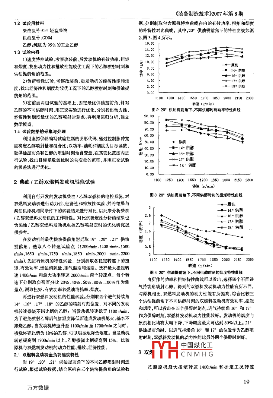 Equipment Manufactring Technology NO8, 2007乙醇/柴油雙燃料發(fā)動(dòng)機(jī)電控乙醇噴射正時(shí)試驗(yàn)與分析黃堅(jiān)(廣西職業(yè)技術(shù)學(xué)院電機(jī)系,廣西南寧530226)摘要;使用傳感器、數(shù)搢采集卡和虛擬儀器軟件改進(jìn)柴油/乙醇雙燃料發(fā)動(dòng)杌的乙醇噴射電子控制系兢,遞過(guò)三小供油提前角、四個(gè)供醇時(shí)刻組合的全因素試驗(yàn),比較了雙燃料發(fā)動(dòng)杌與原機(jī)相同工況下的性能。結(jié)杲表明,雙燃料發(fā)動(dòng)機(jī)的動(dòng)力性、經(jīng)濟(jì)性和煙度與原機(jī)相比均有不同程度的改善關(guān)鍵詞:雙燃料;電控系統(tǒng);供油提前角;乙醇噴射時(shí)刻中圖分類(lèi)號(hào):TK46文獻(xiàn)標(biāo)識(shí)碼:A文章編號(hào):1672-545X(2007080018-0傳統(tǒng)的內(nèi)燃機(jī),一方面作為汽車(chē)等的動(dòng)力來(lái)源,大量消耗1.1試驗(yàn)裝置與系統(tǒng)的改裝著非再生性能源——石油;另一方面,內(nèi)燃機(jī)燃燒產(chǎn)生的尾氣雙燃料發(fā)動(dòng)機(jī)試驗(yàn)儀器設(shè)備及布置如圖1所示,其中發(fā)動(dòng)中,碳煙、NO3CO、CO2等排放物是造成嚴(yán)重環(huán)境污染的主要機(jī)的主要技術(shù)參數(shù)如表1根源。日益嚴(yán)峻的能源危機(jī)和環(huán)境惡化是當(dāng)今世界范圍內(nèi)的兩乙醇箱大難題。以可再生的清潔能源作為內(nèi)燃機(jī)的代用燃料的開(kāi)發(fā)研究,目前已成為各國(guó)內(nèi)燃機(jī)研究的熱點(diǎn)乙醇電子泵燃料乙醇是液體清潔燃料中一種極具潛力的生物型替代燃料。其生產(chǎn)用原材料較為普遍,成本低廉,應(yīng)用在汽車(chē)發(fā)動(dòng)機(jī)儲(chǔ)能罐、壓力表上,不但可以改善能源結(jié)構(gòu)還可以降低汽車(chē)有害物的排放,具有廣闊的發(fā)展前景,意義深遠(yuǎn)。生產(chǎn)燃料乙醇的項(xiàng)目已經(jīng)列人乙醇噴射器「雙燃料電控單元國(guó)家“十五”示范工程重大項(xiàng)目。在廣西,大力發(fā)展乙醇燃料已提上了議事日程,用木薯作為原料生產(chǎn)燃料乙醇的項(xiàng)目也已上柴油箱乙醇噴射正時(shí)馬。推廣乙醇作為內(nèi)燃機(jī)的清潔代用燃料對(duì)于盛產(chǎn)木薯的廣西來(lái)講,不僅可以增加農(nóng)民收人,改善農(nóng)產(chǎn)品結(jié)構(gòu)還有利于乙醇油耗儀燃料技術(shù)的研究推廣,能夠收到較好的社會(huì)效益、經(jīng)濟(jì)效益和水力測(cè)功機(jī)Y柴油轉(zhuǎn)速信-;拉桿位移信環(huán)境效益。乙醇是富氧燃料,與汽油的密度相近,由于這兩種燃料能轉(zhuǎn)速表排氣溫度計(jì)直接混合互溶,故可以在不改變發(fā)動(dòng)機(jī)結(jié)構(gòu)的前提下,將添加定比例的乙醇汽油(又稱(chēng)汽油醇)直接應(yīng)用于汽油機(jī)上,且能機(jī)油溫度計(jì)機(jī)進(jìn)氣壓力計(jì)夠保持原有發(fā)動(dòng)機(jī)的性能。乙醇燃料在汽油機(jī)上的應(yīng)用技術(shù)已經(jīng)基本成熟煙度計(jì)排氣壓力計(jì)但是,乙醇在柴油機(jī)上的應(yīng)用要遠(yuǎn)遜于在汽油機(jī)上的應(yīng)用。其主要原因是柴油與乙醇不能互溶,同時(shí),由于柴油機(jī)本身圖1試驗(yàn)設(shè)備布置示意圖的結(jié)構(gòu)比較復(fù)雜,其雙燃料研究的進(jìn)程非常緩慢。本文結(jié)合廣表1發(fā)動(dòng)機(jī)主要技術(shù)參數(shù)西的實(shí)際,針對(duì)柴油機(jī)乙醇雙燃料研究的現(xiàn)狀,利用自行開(kāi)發(fā)立式雙缸、四沖程、水冷型號(hào)乙醇噴射控制系統(tǒng)研究嗩油提前角、噴射時(shí)刻及噴射量等缸徑/行程TY29D95mm/100mm因素的改變對(duì)雙燃料發(fā)動(dòng)機(jī)性能的影響,探索柴油/乙醇雙燃?jí)嚎s比料發(fā)動(dòng)機(jī)的動(dòng)力性、經(jīng)濟(jì)性和排放性能均較優(yōu)的工況下的乙醇噴射正時(shí)在此基礎(chǔ)上,分別建立有效功率、油耗率煙度的數(shù)供油前令806N·m/1750r1學(xué)模型,為柴油/乙醇雙燃料發(fā)動(dòng)機(jī)技術(shù)的研究與推廣應(yīng)用提配氣相位進(jìn)氣門(mén)開(kāi):上止點(diǎn)前8°,進(jìn)氣門(mén)關(guān):下止點(diǎn)后52°供參考排氣門(mén)開(kāi):下此點(diǎn)前52°,排氣門(mén)關(guān):上止點(diǎn)后8°中國(guó)煤化工刎的測(cè)量裝置并加以標(biāo)↑試驗(yàn)方案系,嗩醇脈沖寬度CNMHG收稿日期:2007-06-06作者簡(jiǎn)介:黃堅(jiān),工作單位:廣西職業(yè)技術(shù)學(xué)院電子機(jī)械工程系18《裝備制造技術(shù)》2007年第8期12試驗(yàn)用材料據(jù),分別制取包含原機(jī)特性曲線(xiàn)在內(nèi)的有效功率、扭矩和煙度柴油型號(hào):0#輕型柴油的外特性對(duì)比曲線(xiàn),其中,20°供油提前角下的特性曲線(xiàn)如圖機(jī)油型號(hào):CD042、圖3、圖4所乙醇:純度為95%的工業(yè)乙醇0013試驗(yàn)內(nèi)容1)速度特性試驗(yàn)考察改裝前、后發(fā)動(dòng)機(jī)的有效功率、扭矩和煙度,找出動(dòng)力性和排放性能較優(yōu)工況下的乙醇噴射時(shí)刻和10.00一原機(jī)供油提前角的范圍。2)負(fù)荷特性試驗(yàn),考察改裝前、后發(fā)動(dòng)機(jī)的經(jīng)濟(jì)性能和煙17。洪醇度,找出經(jīng)濟(jì)性和煙度均較優(yōu)工況下的乙醇噴射時(shí)刻和供油提一18°供前角的范圖110012501400155017001850200215023003)在前面兩組試驗(yàn)的基礎(chǔ)上,固定最優(yōu)供