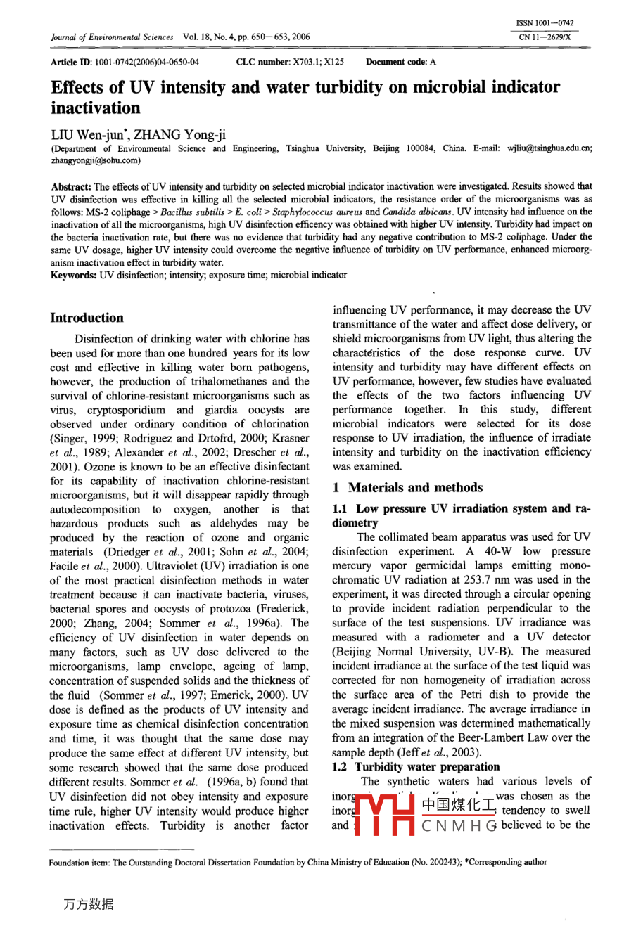 ISSN 1001-0742Journal of Enwironmental Seiences Vol. 18, No. 4, pp.650- 653, 2006CN11- -2629/XArticle D: 101-07420604-0650-04CLC number: X703.1; X125Document code: AEffects of UV intensity and water turbidity on microbial indicatorinactivationLIU Wen-jun", ZHANG Yong-ji(Department of Environmental Science and Engnering, Tsinghua University, Beijing 10084, China. E-mail: wjiliu@tsinghua.edu.cn;zhangyongji@sohu. com)UV disinfection was effective in klling all the selected microbial indicators, the resistance order of the microorganisms was asfllows: MS-2 coliphage > Bacillus subilis > E. coli > Staphylococcus aureus and Candida albicans. UV intensity had influence on theinactivation of all the microorganisms, high UV disinfection eficency was obtained with higher UV intensity. Turbidity had impact onthe bacteria inactivation rate, but there was no evidence that turbidity had any negative contribution to MS-2 coliphage. Under thesame UV dosage, higher UV intensity could overcome the negative influence of turbidity on UV performance, enhanced microorg-anism inactivation effect in turbidity water.Keywords: UV disinfection; intensity; exposure time; microbial indicatorinfluencing UV performance, it may decrease the UVIntroductiontransmitance of the water and afect dose delivery, orDisinfection of drinking water with chlorine hasshield microorganisms from UV light, thus altering thebeen used for more than one hundred years for its lowcharacteristics of the dose response curve. UVcost and effective in killing water born pathogens,intensity and turbidity may have different effects onhowever, the production of trihalomethanes and thUV performance, however, few studies have evaluatedsurvival of chlorine-resistant microorganisms such asthe effects of the two factors influencing UVvirus, cryptosporidium and giardia oocysts areperformance together. In this study, differentobserved under ordinary condition of chlorinationmicrobial indicators were selected for its dose(Singer, 1999; Rodriguez and Drtofrd, 2000; Krasnerresponse to UV irradiation, the influence of irradiateet al., 1989; Alexander et al, 2002; Drescher et al.,intensity and turbidity on the inactivation efficiency2001). Ozone is known to be an effective disinfectantwas examined.for its capability of inactivation chlorine-resistant1 Materials and methodsmicroorganisms, but it will disappear rapidly throughautodecomposition to oxygen, another is that1.1 Low pressure UV irradiation system and ra-hazardous products such as aldehydes may bediometryproduced by the reaction of ozone and organicThe collimated beam apparatus was used for UVmaterials (Driedger et al, 2001; Sohn et al, 2004;disinfection experiment. A 40-W low pressureFacile et al, 2000). Ultraviolet (UV) irradiation is onemercury vapor germicidal lamps emitting mono-of the most practical disinfection methods in waterchromatic UV radiation at 253.7 nm was used in the .treatment because it can inactivate bacteria, viruses,experiment, it was directed through a circular openingbacterial spores and oocysts of protozoa (Frederick,to provide incident radiation perpendicular to the2000; Zhang, 2004; Sommer et al, 1996a). Thesurface of the test suspensions. UV irradiance wasefficiency of UV disinfection in water depends onmeasured with a radiometer and a UV detectormany factors, such as UV dose delivered to the(Beijing Normal University, UV-B). The measuredmicroorganisms, lamp envelope, ageing of lamp,incident irradiance at the surface of the test liquid wasconcentration of suspended solids and the thickness ofcorrected for non homogeneity of irradiation acrossthe fluid (Sommer et al, 1997; Emerick, 2000). UVthe surface area of the Petri dish to provide thedose is defined as the products of UV intensity andaverage incident iradiance. The average iradiance inexposure time as chemical disinfection concentrationthe mixed suspension was determined mathematicallyand time, it was thought that the same dose mayfrom an integration of the Beer-Lambert Law over theproduce the same ffect at different UV intensity, busample depth (effet al., 2003).some research showed that the same dose produced1.2 Turbidity water preparationdifferent results. Sommer et al. (1996a, b) found thatThe synthetic waters had various levels ofUV disinfection did not obey intensity and exposureinor中國煤化工was chosen as thetime rule, higher UV intensity would produce highertendency to swellinactivation effects. Turbidity is another factorYHCNMHGbelievedtobetheFoundation item: The Outstanding Doctoral Dissertation Foundation by China Ministry of Education (No. 200243); *Coresponding authorNo.4Effects ofUV intensity and water turtbidity on microbial indicator inactivation651representative of many natural water turbidity2.1 UV irradiation on microorganism inactiva-particles and a potential worst particle for shielding.tionDifferent amount of kaolin clay was seeded to steriledThe dose response curve for UV irradiation onwater, turbidity was measured with a HANNAdifferent microorganisms at a UV intensity of 0.10turbidity meter, before each use, the turbidity metermW/cm2 was evaluated (Fig.1). MS-2 coliphage andwas calibrated according to the manufacturer'sBacillus subtilis were more resistant than otherinstructions.microorganisms, only 2.4 and 3.1 lg(NJN) reduction1.3 Test organismswas achieved respectively at a UV dose of 40 mJ/cm2,E. coli 1.3373, Bacillus subtilis (ATCC 9372),and MS-2 was more UV resistant than BacillusStaphylococcus aureus (ATCC 6538), Candidasubtilis. Staphylococcus aureus and Candida albicansalbicans (ATCC 10231) were obtained from Micro-were susceptible to UV irradiation and had nearly thebiology School of Chinese Academy of Sciences,same response to UV irradiation, nearly 4.6 ofMS-2 coliphage 15597-B, and its host strain E. colilg(N/N) reduction was achieved at a UV dose of 10(ATCC 15597) was provided by Canadian GAPmJ/cm?. E. coli was more resistant than the other two,Microorganism Company. The growth me