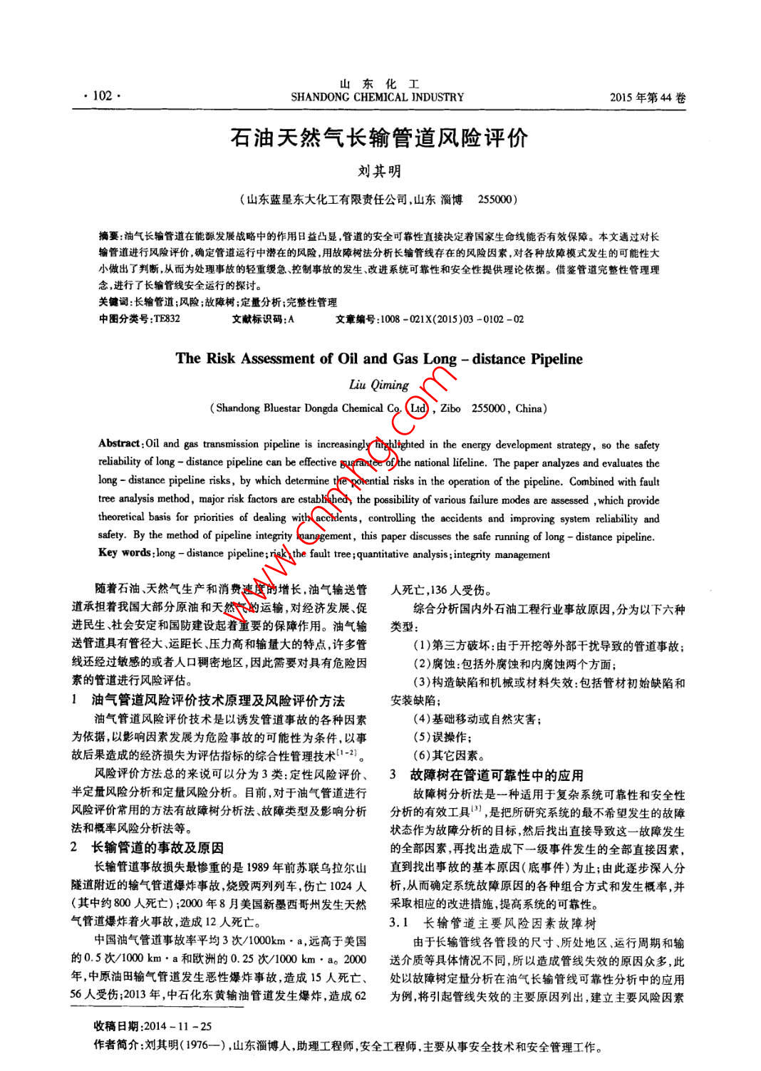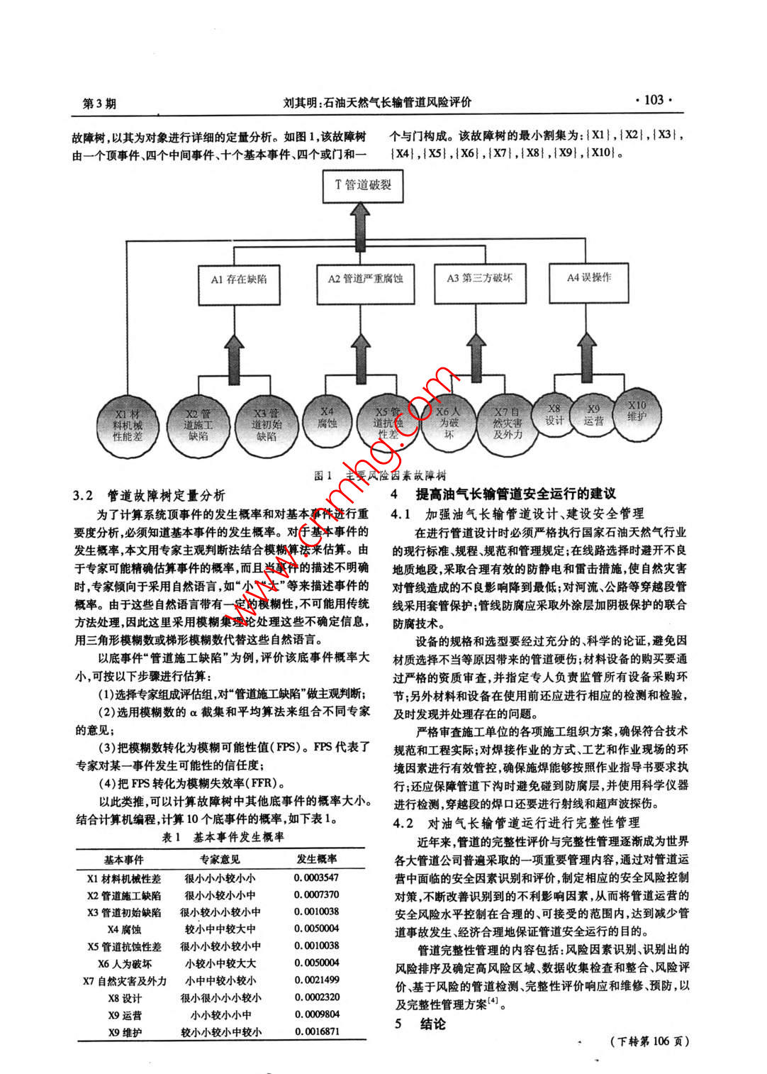 u東化工●102●SHANDONC CHEMICAL INDUSTRY2015年第44卷石油天然氣長(zhǎng)輸管道風(fēng)險(xiǎn)評(píng)價(jià)劉其明(山東藍(lán)星東大化工有限責(zé)任公司,山東淄博255000)摘要:油氣長(zhǎng)輸管道在能源發(fā)展戰(zhàn)略中的作用益凸顯,管道的安全可靠性直接決定著國(guó)家生命線能否有效保障。本文通過(guò)對(duì)長(zhǎng)輸管道進(jìn)行風(fēng)險(xiǎn)評(píng)價(jià),確定管道運(yùn)行中潛在的風(fēng)險(xiǎn),用故障樹(shù)法分析長(zhǎng)輸管線存在的風(fēng)險(xiǎn)因素.對(duì)各種故障模式發(fā)生的可能性大小做出了判斷,從而為處理事故的輕重縵急控制事故的發(fā)生、改進(jìn)系統(tǒng)可靠性和安全性提供理論依據(jù)。借鑒管道完整性管理理念,進(jìn)行了長(zhǎng)輸管線安全運(yùn)行的探討。關(guān)鍵詞:長(zhǎng)輸管道;風(fēng)險(xiǎn);故障樹(shù);定量分析;完整性管理中圖分類號(hào):TE832文獻(xiàn)標(biāo)識(shí)碼:A文章編號(hào)1008 -021X(2015)03 -0102 -02The Risk Assessment of Oil and Gas Long - distance PipelineLiu Qiming( Shandong Bluestar Dongda Chemical Co. ,Ltd. , Zibo 255000, China)Abstract:Oi and gas transmission pipeline is increasingly highlighted in the energy development stratesy, so the saferyreliability of long - distance pipeline can be efective guarantee of the national lifeline. The paper analyzes and evaluates thelong - distance pipeline risks, by which determine the potential risks in the operation of the pipeline. Combined with faulttree analysis method, major risk factors are established , the possibility of various failure modes are ssessed , which providetheoretical basis for prionties of dealing with ecients, contrlling the accidents and improring system rliability andsaety. By the method of pipeline integrity management, this paper discusses the safe running of long - distance pipeline.Key words;long - distance pipeline ;nisk ;the fault tree ;quantitative analysis ;ntegrity management隨著石油、天然氣生產(chǎn)和消費(fèi)速度的增長(zhǎng),油氣輸送管人死亡,136 人受傷。道承擔(dān)著我國(guó)大部分原油和天然氣的運(yùn)輸,對(duì)經(jīng)濟(jì)發(fā)展、促綜合分析國(guó)內(nèi)外石油工程行業(yè)事故原因,分為以下六種進(jìn)民生、社會(huì)安定和國(guó)防建設(shè)起著重要的保障作用。油氣輸類型:送管道具有管徑大運(yùn)距長(zhǎng)、壓力高和輸量大的特點(diǎn),許多管(1)第三方破壞:由于開(kāi)挖等外部干擾導(dǎo)致的管道事故;線還經(jīng)過(guò)敏感的或者人口稠密地區(qū),因此需要對(duì)具有危險(xiǎn)因(2)腐蝕:包括外腐蝕和內(nèi)腐蝕兩個(gè)方面;素的管道進(jìn)行風(fēng)險(xiǎn)評(píng)估。(3)構(gòu)造缺陷和機(jī)械或材料失效:包括管材初始缺陷和1油氣管道風(fēng)險(xiǎn)評(píng)價(jià)技術(shù)原理及風(fēng)險(xiǎn)評(píng)價(jià)方法安裝缺陷;油氣管道風(fēng)險(xiǎn)評(píng)價(jià)技術(shù)是以誘發(fā)管道事故的各種因素(4)基礎(chǔ)移動(dòng)或自然災(zāi)害;為依據(jù),以影響因素發(fā)展為危險(xiǎn)事故的可能性為條件,以事(5)誤操作;故后果造成的經(jīng)濟(jì)損失為評(píng)估指標(biāo)的綜合性管理技術(shù)1-2]。(6)其它因素。風(fēng)險(xiǎn)評(píng)價(jià)方法總的來(lái)說(shuō)可以分為3類:定性風(fēng)險(xiǎn)評(píng)價(jià)、3故障樹(shù)在管道可靠性中的應(yīng)用半定量風(fēng)險(xiǎn)分析和定量風(fēng)險(xiǎn)分析。目前,對(duì)于油氣管道進(jìn)行故障樹(shù)分析法是一種適用于復(fù)雜系統(tǒng)可靠性和安全性風(fēng)險(xiǎn)評(píng)價(jià)常用的方法有故障樹(shù)分析法故障類型及影響分析分析的有效工具” ,是把所研究系統(tǒng)的最不希望發(fā)生的故障法和概率風(fēng)險(xiǎn)分析法等。狀態(tài)作為故障分析的目標(biāo),然后找出直接導(dǎo)致這一故障發(fā)生2長(zhǎng)輸管道的事故及原因的全部因素,再找出造成下一級(jí)事件發(fā)生的全部直接因素,長(zhǎng)輸管道事故損失最慘重的是1989年前蘇聯(lián)烏拉爾山直到找出事 故的基本原因(底事件)為止;由此逐步深人分隧道附近的輸氣管道爆炸事故,燒毀兩列列車傷亡1024人析,從而確定系統(tǒng)故障原因的各種組合方式和發(fā)生概率,并.(其中約800人死亡) ;2000年8月美國(guó)新墨西哥州發(fā)生天然采取相應(yīng)的改進(jìn)措施,提高系統(tǒng)的可靠性。氣管道爆炸著火事故,造成12人死亡。3.1長(zhǎng)輸管道主要風(fēng)險(xiǎn)因素 故障樹(shù).中國(guó)油氣管道事故率平均3次/1000km . a,遠(yuǎn)高于美國(guó)由于長(zhǎng)輸管線各管段的尺寸、所處地區(qū)、運(yùn)行周期和輸?shù)?.5次/1000 km●a和歐洲的0. 25次/1000 km. ao 2000送介質(zhì)等具體情況不同,所以造成管線失效的原因眾多,此年,中原油田輸氣管道發(fā)生惡性爆炸事故,造成15人死亡、處以故障樹(shù)定量分析在油氣長(zhǎng)輸管線可靠性分析中的應(yīng)用56人受傷;2013年,中石化東黃輸油管道發(fā)生爆炸,造成62為例,將引起管線失效的主要原因列出,建立主要風(fēng)險(xiǎn)因素收稿日期:2014-11-25作者簡(jiǎn)介:劉其明( 1976- -) ,山東淄博人,助理工程師,安全工程師.主要從事安全技術(shù)和安全管理工作。第3期劉其明:石油天然氣長(zhǎng)輸管道風(fēng)險(xiǎn)評(píng)價(jià)●103●故障樹(shù),以其為對(duì)象進(jìn)行詳細(xì)的定量分析。如圖1,該