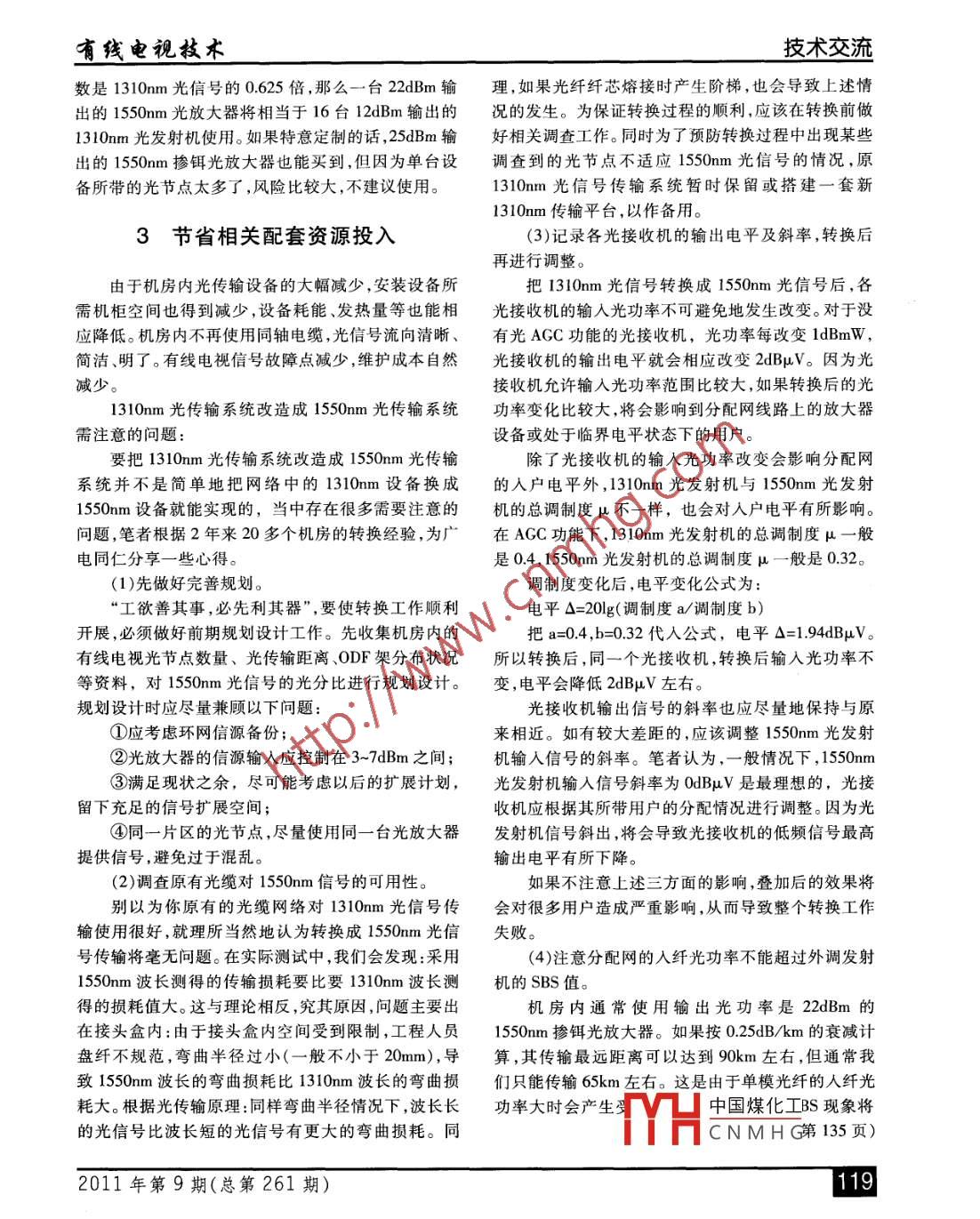 技術(shù)交流有線電視技術(shù)1550nm改造的經(jīng)驗之談周卓文番禺有線數(shù)字電視網(wǎng)絡(luò)有限公司自2008年,番禺有線已經(jīng)率先啟動有線電視信摻鉺光放大的普及,使得采用1550mm光傳輸技術(shù)比號光傳輸技術(shù)1550mm改造項目。經(jīng)過2年多的改造1310m光傳輸技術(shù)更有優(yōu)勢。工作,全區(qū)20多個分機房的有線電視信號光傳輸部分,基本上已經(jīng)順利完成從舊有的1310nm光傳輸技1形成真正的“全光網(wǎng)”術(shù)改造成1550nm光傳輸技術(shù)。13l0mm光傳輸技術(shù)與1550mm光傳輸技術(shù)的比傳統(tǒng)的1310m與1550nm光傳輸技術(shù)混合使較用,不可避免地在光傳輸?shù)闹虚g環(huán)節(jié)中插入光電轉(zhuǎn)換很早以前,廣電行業(yè)已經(jīng)利用光傳輸技術(shù)進行有的過程。因為1310m與1550mm的光傳輸設(shè)備都只線電視信號的傳輸。其使用原則一般是:骨干網(wǎng)采用能在各自波長窗口區(qū)域內(nèi)正常工作,兩者互不兼容。1550m光傳輸,接入網(wǎng)釆用1310mm光傳輸,即總機所以當1550mm的光信號傳輸?shù)椒謾C房時,需要使用房采用1550m光傳輸,分機房采用1310mm光傳輸。光接收機把其還原成電信號,再進入1310m光傳輸為什么會這樣應(yīng)用呢?其實很大程度是由成本決定設(shè)備進行傳輸。有線電視信號經(jīng)過這一轉(zhuǎn)換環(huán)節(jié)后,的。以前的1550m光傳輸設(shè)備比較昂貴,而1310nm將不可避免地發(fā)生指標劣化。全網(wǎng)采用150m光傳光傳輸設(shè)備相對低廉,因而得到較廣泛的應(yīng)用。但輸技術(shù),只需在分機房中安裝足夠數(shù)量的1550m光1310mm光信號的傳輸在沒有中繼的情況下最大傳輸放大器,直接對傳過來的1550mm光信號進行放大距離一般只能達到40km左右,不能滿足骨干網(wǎng)的距就能按照設(shè)計的分光比繼續(xù)傳輸?shù)焦饨邮諜C,使有線離要求或者分光比要求,所以骨干網(wǎng)上采用1550m電視網(wǎng)絡(luò)中的光傳輸部分真正形成“全光網(wǎng)”。光信號傳輸。1310nm與1550nm的光波有著不同的傳輸特2光傳輸設(shè)備數(shù)量大幅減少性:波長為1310nm的光波在普通單模光纖中傳播時,能夠達到零色散,而波長為1550m的光波則能有線電視機房內(nèi)需要安裝的用于有線電視信號達到最小衰耗。1550m光信號的色散會使信號不同傳輸?shù)墓鈧鬏斣O(shè)備數(shù)量一般由以下3個條件決定:(1)的成分在光纜中傳播的速度不同,使信號在目的端產(chǎn)該機房所轄光節(jié)點數(shù)量;(2)該機房所轄范圍大小;(3)生碼間干擾,造成失真。要使用1550m光傳輸信號,該機房內(nèi)設(shè)備輸出的光功率大小。前兩個條件一般是就要進行色散補償,克服失真。1550mm光信號最大的固定的,不能隨意改變,但第三個條件卻因為高光功應(yīng)用優(yōu)勢是衰耗低且擁有成熟商用的放大技術(shù),其傳率1550mm光放大器的使用而有明顯差距。現(xiàn)時市面輸衰耗系數(shù)為:025AB/km,而1310mm光信號的傳輸上最普遍使用的1310m光發(fā)射機,其輸出光功率是衰耗系數(shù)為:040dB/km12dBm(16mW),而市面上最常使用的150mm光放大隨著150m光傳輸技術(shù)的日益成熟,50m器,其輸出光功中國煤化工于131Onm光傳輸設(shè)備的價格不再昂貴,特別是高功率150m光發(fā)射機的101HCNMHG號的衰耗系2011年第9期(總第261期)有線電視技術(shù)技術(shù)交流數(shù)是1310m光信號的0625倍,那么一臺22dBm輸理,如果光纖纖芯熔接時產(chǎn)生階梯,也會導致上述情出的1550mm光放大器將相當于16臺12dBm輸出的況的發(fā)生。為保證轉(zhuǎn)換過程的順利,應(yīng)該在轉(zhuǎn)換前做13lnm光發(fā)射機使用。如果特意定制的話,25dBm輸好相關(guān)調(diào)查工作。同時為了預(yù)防轉(zhuǎn)換過程中出現(xiàn)某些出的1550mm摻鉺光放大器也能買到,但因為單臺設(shè)調(diào)查到的光節(jié)點不適應(yīng)150nm光信號的情況,原備所帶的光節(jié)點太多了,風險比較大,不建議使用。1310nm光信號傳輸系統(tǒng)暫時保留或搭建一套新1310mm傳輸平臺,以作備用3節(jié)省相關(guān)配套資源投入(3)記錄各光接收機的輸出電平及斜率,轉(zhuǎn)換后再進行調(diào)整。由于機房內(nèi)光傳輸設(shè)備的大幅減少,安裝設(shè)備所把1310nm光信號轉(zhuǎn)換成1550nm光信號后,各需機柜空間也得到減少,設(shè)備耗能發(fā)熱量等也能相光接收機的輸入光功率不可避免地發(fā)生改變。對于沒應(yīng)降低。機房內(nèi)不再使用同軸電纜,光信號流向清晰、有光AGC功能的光接收機,光功率每改變 1dBmW,簡潔、明了。有線電視信號故障點減少,維護成本自然光接收機的輸出電平就會相應(yīng)改變2dBμV。因為光減少。接收機允許輸入光功率范圍比較大,如果轉(zhuǎn)換后的光3l0nm光傳輸系統(tǒng)改造成1550nm光傳輸系統(tǒng)功率變化比較大,將會影響到分配網(wǎng)線路上的放大器需注意的問題:設(shè)備或處于臨界電平狀態(tài)下的用戶。要把1310nm光傳輸系統(tǒng)改造成1550m光傳輸除了光接收機的輸入光功率改變會影響分配網(wǎng)系統(tǒng)并不是簡單地把網(wǎng)絡(luò)中的1310mm設(shè)備換成的入戶電平外,1310nm光發(fā)射機與1550nm光發(fā)射1550nm設(shè)備就能實現(xiàn)的,當中存在很多需要注意的機的總調(diào)制度μ不一樣,也會對入戶電平有所影響問題,筆者根據(jù)2年來20多個機房的轉(zhuǎn)換經(jīng)驗,為