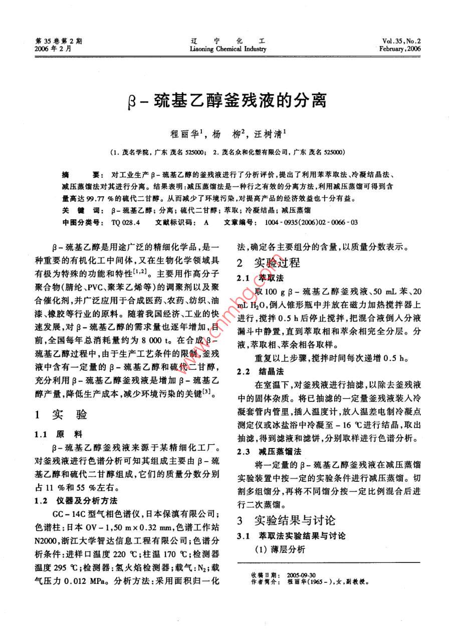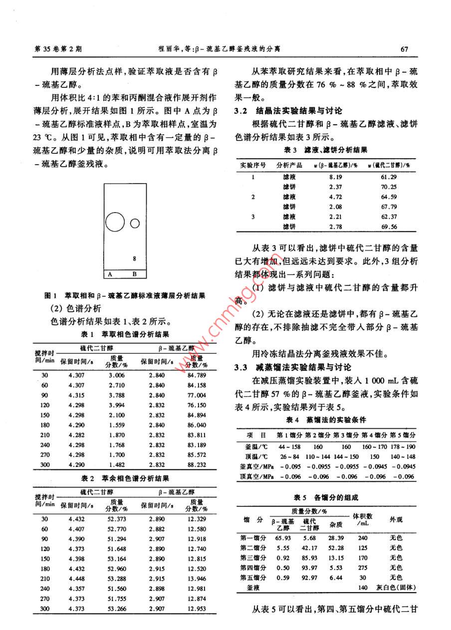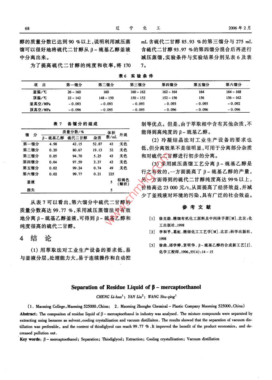 第35卷第2期寧化2006年2月遼工 Vol. 35, No.2 Liaoning Chemical Industry February, 2006-巰基乙醇釜殘液的分離程麗華1,楊柳2,汪樹清(1.茂名學院,廣東茂5250002.茂名眾和化塑有限公司,廣東茂名525000)摘要:對工業(yè)生產B-巰基乙醇的釜殘液進行了分析評價,提出了利用苯萃取法、冷凝結晶法、減壓蒸餾法對其進行分離。結果表明:減壓蒸餾法是一種行之有效的分離方法,利用減壓蒸餾可得到含量高達99.77%的硫代二甘醇。從而減少了環(huán)境污染,對提高產品的經濟效益也十分有益關鍵詞:-巰基乙醇;分離;硫代二甘醇;萃取;冷凝結晶;減壓蒸餾中圖分類號:TQ028.4文獻標識碼:A文章編號:1004-0935(2006)02-0066-03B-巰基乙醇是用途廣泛的精細化學品,是一法,確定各主要組分的含量,以質量分數表示。種重要的有機化工中間體,又在生物化學領域具2實驗過程有極為特殊的功能和特性[1,2。主要用作高分子2.1萃取法聚合物(腈綸、PVC、聚苯乙烯等)的調聚劑以及聚取100g-巰基乙醇釜殘液、50mL苯、20合催化劑,并廣泛應用于合成醫(yī)藥、農藥、紡織、油mLH2O,倒入錐形瓶中并放在磁力加熱攪拌器上漆、橡膠等行業(yè)的原料。隨著我國經濟、工業(yè)的快進行,攪拌0.5h后停止攪拌,把混合液倒入分液速發(fā)展,對-巰基乙醇的需求量也逐年增加,目漏斗中靜置,直到萃取相和萃余相完全分層。分前,全國每年總消耗量約為8000t。在合成液萃取相萃余相各取樣。巰基乙醇過程中,由于生產工藝條件的限制,釜殘重復以上步驟,攪拌時間每次遞增0.5h液中含有一定量的一巰基乙醇和硫代二甘醇,2.2結晶法充分利用β-巰基乙醇釜殘液是增加β-巰基乙在室溫下,對釜殘液進行抽濾,以除去釜殘液醇產量,降低生產成本,減少環(huán)境污染的關鍵31。中的固體雜質。將已抽濾的一定量釜殘液裝入冷1實驗凝套管內管里,插入溫度計,放入溫差電制冷凝點測定儀或冰鹽浴中冷凝至-16℃進行結晶,取出1.1原料抽濾,得到濾液和濾餅,分別取樣進行色譜分析。B-巰基乙醇釜殘液來源于某精細化工廠。2.3減壓蒸餾法對釜殘液進行色譜分析可知其組成主要由β-巰將一定量的B-巰基乙醇釜殘液在減壓蒸餾基乙醇和硫代二甘醇組成,它們的質量分數分別實驗裝置中按一定的實驗條件進行減壓蒸餾。切占11%和55%左右。割多組餾分,再將不同餾分按一定比例混合后進1.2儀器及分析方法行二次蒸餾。GC-14C型氣相色譜儀,日本保滇有限公司;3實驗結果與討論色譜柱:日本0V-1,50m×0.32mm,色譜工作站N2000,浙江大學智達信息工程有限公司;色譜分3.1萃取法實驗結果與討論析條件:進樣口溫度220℃;柱溫170℃;檢測器(1)薄層分析溫度295℃;檢測器:氫火焰檢測器;載氣:N2;載氣壓力0.012MPa。分析方法:采用面積歸一化收痛日期女第35卷第2期程麗華,等:-巰基乙醇釜殘液的分離67用薄層分析法點樣,驗證萃取液是否含有從苯萃取研究結果來看,在萃取相中β-巰巰基乙醇。基乙醇的質量分數在76%~88%之間,萃取效用體積比4:1的苯和丙酮混合液作展開劑作果一般。薄層分析,展開結果如圖1所示。圖中A點為3.2結晶法實驗結果與討論巰基乙醇標準液樣點,B為萃取相樣點,室溫為根據硫代二甘醇和β-巰基乙醇濾液、濾餅23℃。從圖1可見,萃取相中含有一定量的-色譜分析結果如表3所示。巰基乙醇和少量的雜質,說明可用萃取法分離β表3濾液濾餅分析結果巰基乙醇釜殘液。實驗序號分析產品(-基乙醇)/%(硫代二甘醇)/%濾液8.1961.29濾餅2.3770.252濾液4.7264.59濾餅2.0867.793濾液2.2162.37濾餅2.769.56從表3可以看出,濾餅中硫代二甘醇的含量8已大有增加,但遠遠未達到要求。此外,3組分析B結果都體現出一系列問題:(1)濾餅與濾液中硫代二甘醇的含量都升圖1萃取相和-巰基乙醇標準液薄層分析結果(2)色譜分析高。(2)無論在濾液還是濾餅中,都有-巰基乙色譜分析結果如表1、表2所示。醇的存在,不排除抽濾不完全帶入部分-巰基表1萃取相色譜分析結果乙醇。攪拌時硫代二甘醇-巰基乙醇間/min保留時間/分數%保留時間/分數/質量質量用冷凍結晶法分離釜殘液效果不佳。3.3減蒸餾法實驗結果與討論304.3073.0062.84084.7604.3072.7102.84084.158在減壓蒸餾實驗裝置中,裝入1000mL含硫904.3153.7882.84077.004代二甘醇57%的B-巰基乙醇釜液,實驗條件如1204.2983.9942.83276.150表4所示,實驗結果列于表5。1504.2982.1002.83284.8941804.2表4蒸餾法的實驗條件2104.28021.592.84086.0401.8702.83283.811項目第1餾分第2餾分第3餾分第4餾分第5餾分2404.2981.7682.83283.189釜溫/℃44-158160160160~170178-192704.2981.7002.83285.572頂溫/℃26-84110~144144-150150140~1483004.2901.4822.83288.232簽真空/MP-0.0950.09550955-0.050.0945表2萃余相色譜分析結果頂真空/MP-0.096-0.096-0.096-0.096-0.096攪拌時硫代二甘醇β-巰基乙醇表5各餾分的組成間/min保留時間/s分數保留時間/分數/%304.43252.3732.89012.329604.40752.7702.88212.580餾分-巰基代雜質m外觀乙醇二甘醇904.39051.2942.90712.918第一餾分65.935.6828.39240無色1204.37351.6482.89012.740第二餾分5.5542.1752.28125無色1504.39853.1642.89012.815第三餾分0.9285.9313.15170無色1804.43252.9602.91512.520第四餾分0.5093.975.53275無色2104.44853.2882.91513.946第五餾分0.5992.976.4430無色2404.35751.5602.89812.9釜液140灰白色(固體)2704.37351.7552.90712.8743004.37353.2662.90712.953從表5可以看出,第四、第五餾分中硫代二甘68遼寧化工2006年2月醇的質量分數已達到90%以上,說明利用減壓蒸mL含硫代二甘醇85.93%的第三餾分與275mL餾可以很好地將硫代二甘