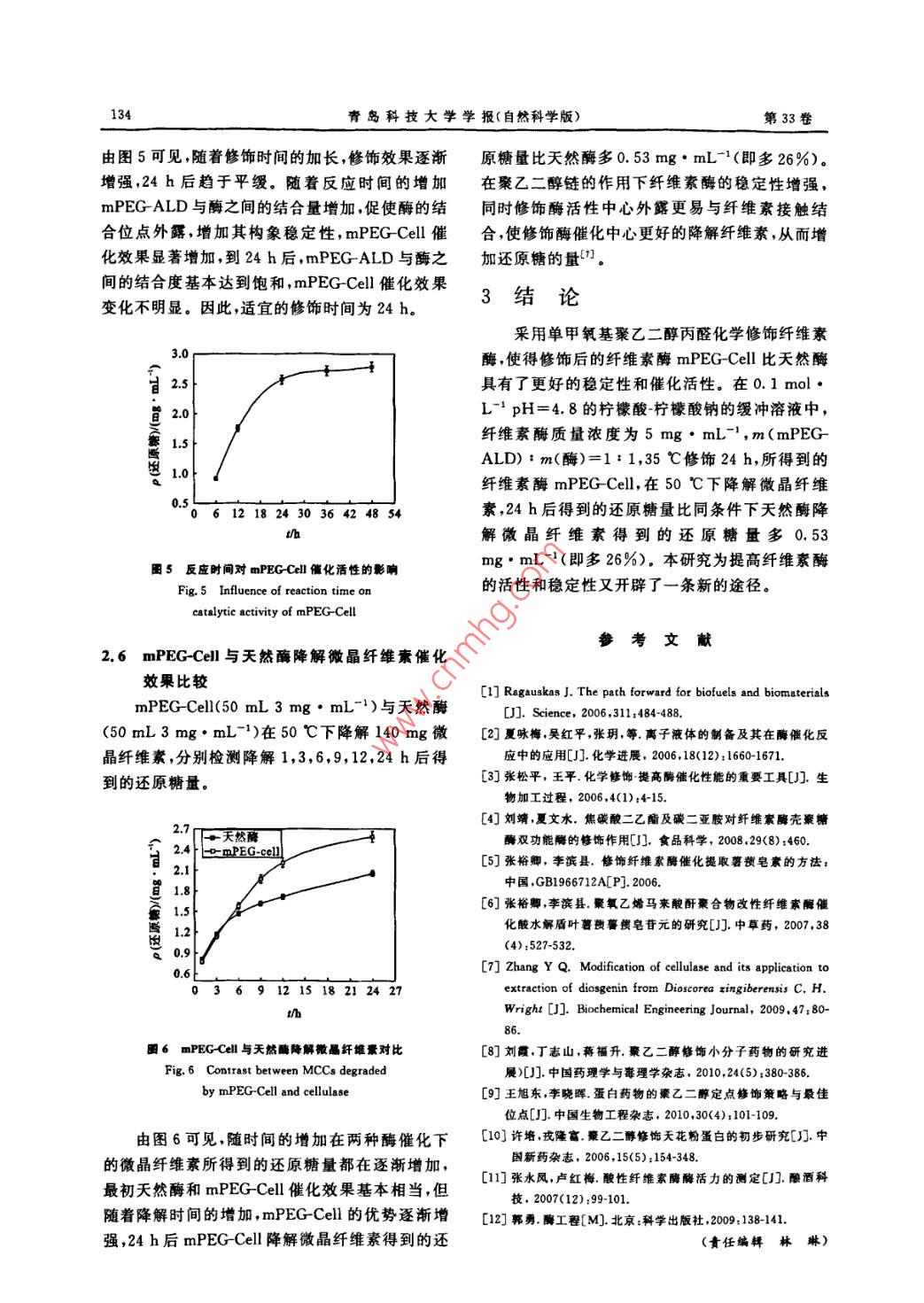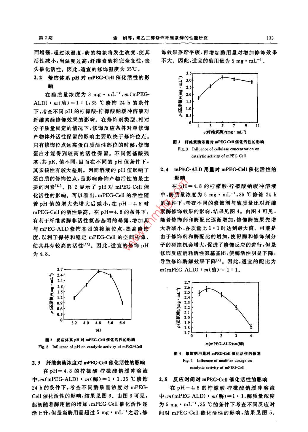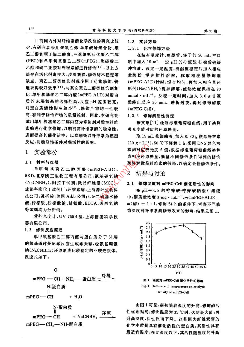 2012 Joumal期 of Qingdao Uni技大學學報自然科學 Vol. 33 No.2 nce and Technology( Natural Science Edition) Apr. 2012文章編號:1672-6987(2012)02-0131-04聚乙醇修飾纖維素酶的性能研究謝娟,李露蘇忠亮,于世濤(青島科技大學化工學院,山東青島266042)摘要:以單甲氧基聚乙二醇丙醛(mPEG-ALD5KD)為修飾劑,對纖維素酶進行化學修飾,得到修飾纖維素酶(mPEG-Cell)用mpe-Cll降解微晶纖維素,以所得還原糖量為標準(DNS比色法測定),考察各種因素對其催化性能的影響,確定最佳修飾條件。結果表明:在0.1mol·L-pH=4.8的檸檬酸-檸檬酸鈉的緩沖溶液中,纖維素酶質(zhì)量濃度為5mgmL-1,m(mPEG-ALD):m(酶)=1:1,35℃修飾24h,所得到的 mPEG-Cell具有最佳的催化性能,在50℃下降解微晶纖維素,24h后可得還原糖量達到2.58mg·mL,比同條件下天然酶降解微晶纖維素得到的還原糖量多0.53mgmL-,即多26%關鍵詞:纖維素酶;聚乙二醇丙醛;化學修飾中圖分類號:Q556文獻標志碼:A Chemical Modification of Cellulase with Polyethylene Glycol-aldehyde XIE Juan, LI Lu, SU Zhong-liang, YU Shi-tao (College of Chemical Engineering, Qingdao University of Science and Technology, Qingdao 266042. China) Abstract: The modified cellulase(mPEG-Cell)was obtained by using polyethylene glycol- aldehyde (mPEG-ALD) as modifier. The mPEG-Cell was used to degrade microcrystal- line cellulose and the effects of various factors on its catalytic properties were investiga- ted based on the amount of obtained reducing sugar( by DNS colorimetric analysis) The obtained optimum conditions were using 0. 1M citric acid-sodium citrate as buffer (pH=4.8), concentration of cellulase 5 mg.mL-I m(mPEG-ALD): m(Cellulase)= 1: 1, temperature 35 C and time 24 h. The mPEG-Cell obtained under above condi- tions was used to degrade microcrystalline cellulose at 50 C for 24 h, the amount of re- ducing sugar could reach 2. 58 mg. mL-', which was 0.53 mg. mL-I(26%)more than that obtained by using natural cellulase. Key words: cellulase; polyethylene glycol-aldehyde; chemical modification隨著石化資源的逐漸枯竭,利用可再生資源進而轉(zhuǎn)化成乙醇丙酮、丁醇等燃料和化工原生產(chǎn)生物能源的研究越來越受到國內(nèi)外研究者的料。但是纖維素酶降解纖維素存在酶活性低,關注纖維素作為世界上最豐富的天然可再生資與纖維素可及性差,酶穩(wěn)定性差,條件苛刻等問源,其開發(fā)與利用對解決人類面臨的資源和能源題阻礙了纖維素酶解的進一步發(fā)展,降低了對纖危機具有重要意義。作為纖維素資源化利用有效維素的利用率2,因此對纖維素酶進行化學改性途徑之一的酶解反應,可使纖維素降解為葡萄糖,成為改善其不足的有效手段之一收精日期:2011-10-17基金項目:國家自然科學基金項目(31070520)山東省高等學校科技計劃項目(J09LG16);華南理工大學制漿造紙工程國家重點實駿室項目200912作者簡介:謝娟(1986一),女,碩士研究生,通信聯(lián)系人132青島科技大學學報(自然科學版)第33卷目前國內(nèi)外對纖維素酶化學改性的研究比較1.3實驗方法少有研究者采用聚氧乙烯馬來酸酐聚合物聚1.3.1化學修飾方法乙二醇和順丁烯二酸酐、三聚氯氰活化聚乙二醇在裝有溫度計、冷凝管、轉(zhuǎn)子的50mL三口(PEG)和單甲氧基聚乙二醇(mPEG)焦碳酸二瓶中加入15mL一定pH的檸檬酸檸檬酸鈉緩乙酯和碳二亞胺對纖維素酶進行修飾,以上方?jīng)_溶液。設定一定溫度,待溫度穩(wěn)定后加入相應法存在活化劑毒性大、步驟繁瑣、修飾酶不穩(wěn)定等量酶粉,慢速攪拌溶解。稱取相應量修飾劑缺點。聚乙二醇類修飾劑現(xiàn)多用于藥物修飾,普(mpeg-ald)計時,混合均勻,再加入相應量還遍取得較好效果,與其它聚乙二醇類修飾劑相原劑(NaCNBH33)攪拌溶解,使終濃度保持在20比,單甲氧基聚乙二醇丙醛(mPEG-ALD)對蛋白mmol·ml-反應一定時間,加入3.0g甘氨質(zhì)N末端氨基的選擇性高,反應pH范圍較寬,酸終止反應30min透析過夜,得到修飾酶液對蛋白質(zhì)活性影響較小10,修飾產(chǎn)物均一性較(mpeg-Cell)高,有利于修飾產(chǎn)物的質(zhì)量控制。因此,本研究嘗1.3.2修飾酶活性測定試用單甲氧基聚乙二醇丙醛為修飾劑對酸性纖維按文獻[11]繪制標準葡萄糖曲線,用于換算素酶進行化學修飾,以期提高纖維素酶的穩(wěn)定性吸光度值對應的還原糖量進而提高其催化活性。以降解微晶纖維素為模型取15mL修飾酶液,加入0.30g微晶纖維素反應,明確修飾條件對酶活性的影響。(20gL-1),50℃下降解1h,采用DNS顯色法1實驗部分檢測對應吸光度A值,根據(jù)標準葡萄糖曲線換算成相應還原糖量,衡量不同修飾條件得到的修飾1.1材料與儀器酶降解微晶纖維素的效果,以確定最佳修飾條件。單甲氧基聚乙二醇丙醛(mPEG-ALD)5KD,北京凱正生物工程有限公司;氟基硼氫鈉2結果與討論(NaCNBH3),阿拉丁試劑;微晶纖維素(MCC),2.1修飾溫度對mpeg-cell催化活性的影響成都科隆化工試劑廠;纖維素酶,上海源葉生物科在pH=4.8的檸檬酸-檸檬酸鈉緩沖溶液技公司;透析袋,美國Aikb公司;3,5-二硝基水楊中,酶質(zhì)量濃度3mg·mL-1,m(mPEG-ALD):酸、檸檬酸、檸檬酸鈉、甘氨酸、EDTA、碳酸氫鈉m(酶)=1:1,修飾24h的條件下,考察不同修等試劑均為分析純。飾溫度對纖維素酶修飾效果的影響,結果見圖1.紫外光度計,UV755B型,上海精密科學儀器有限公司。2.71.2修飾反應原理2.42單甲氧基聚乙二醇丙醛與蛋白質(zhì)分子N端1.8的氨基通過曼尼希反應生成希夫堿,經(jīng)氰基硼氫151.2鈉(NaCNBH3)還原形成比較穩(wěn)定的亞胺連接體。畫09反應式如下:0.60
