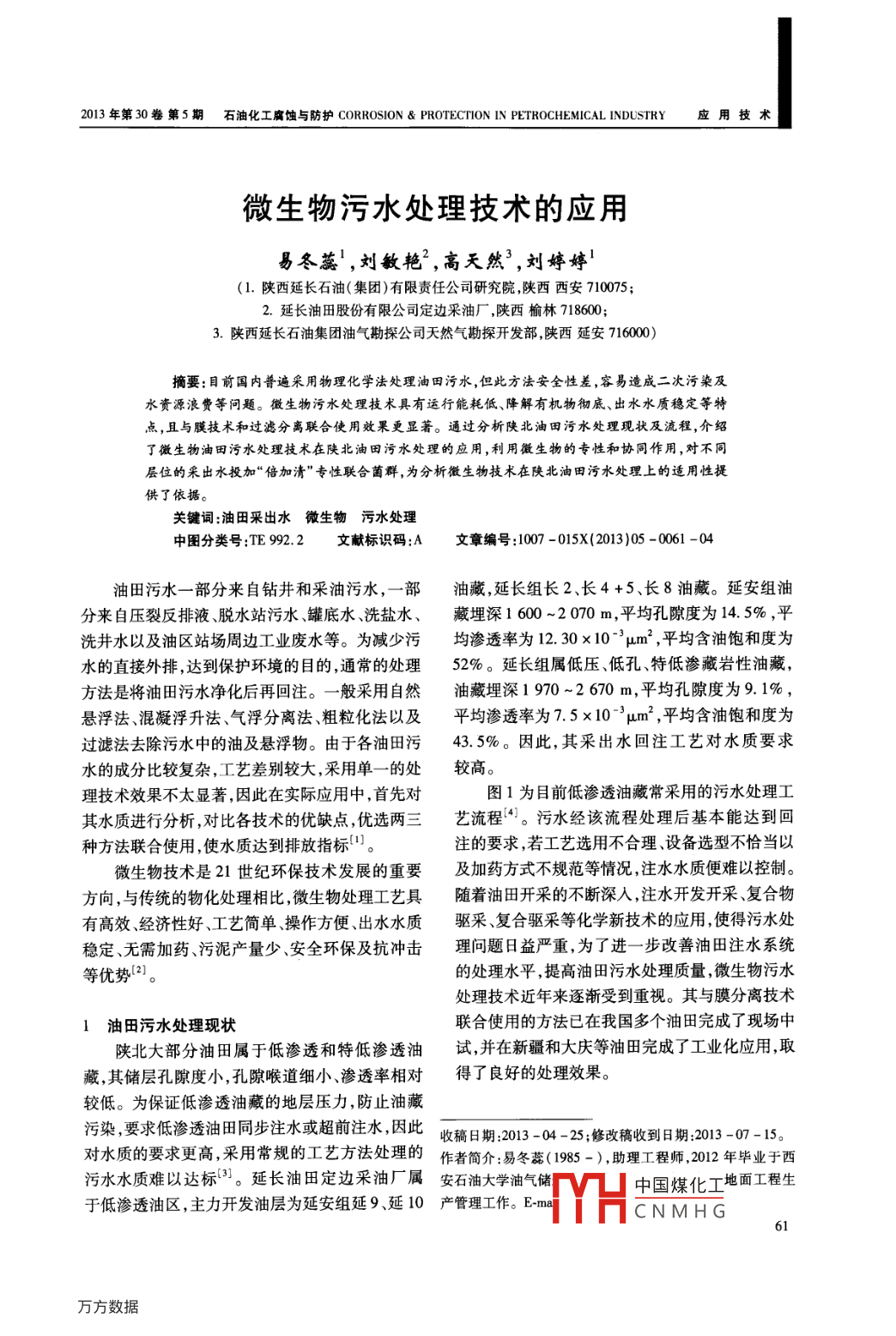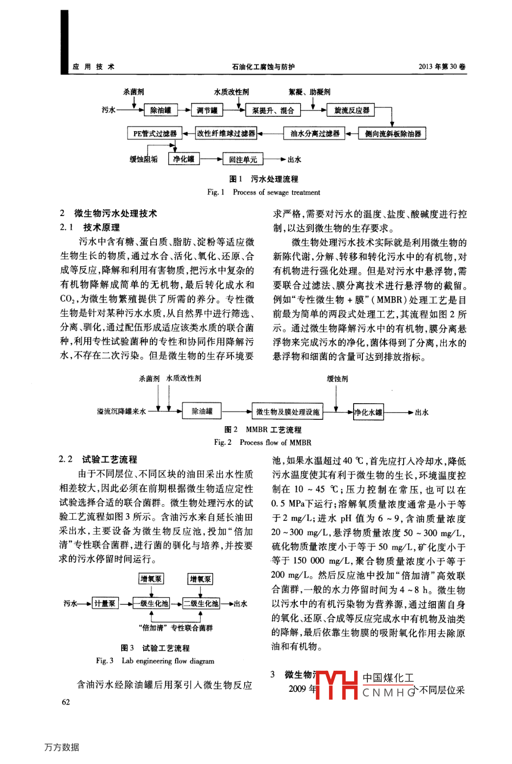 2013年第30卷第5期石油化工腐 蝕與防護(hù)CORROSION & PROTECTION IN PETROCHEMICAL INDUSTRY應(yīng)用技術(shù)微生物污水處理技術(shù)的應(yīng)用易冬蕊',劉敏艷”,高天然’,劉婷婷'(1.陜西延長(zhǎng)石油(集團(tuán))有限責(zé)任公司研究院,陜西西安710075;2.延長(zhǎng)油田股份有限公司定邊采油廠,陜西榆林718600;3.陜西延長(zhǎng)石油集團(tuán)油氣勘探公司天然氣勘探開(kāi)發(fā)部,陜西延安716000)摘要:目前國(guó)內(nèi)普遍采用物理化學(xué)法處理油田污水,但此方法安全性差,容易造成二次污染及水資源浪費(fèi)等問(wèn)題。微生物污水處理技術(shù)具有運(yùn)行能耗低、降解有機(jī)物徹底、出水水質(zhì)穩(wěn)定等特點(diǎn),且與膜技術(shù)和過(guò)濾分離聯(lián)合使用效果更顯著。通過(guò)分析陜北油田污水處理現(xiàn)狀及流程,介紹了微生物油田污水處理技術(shù)在陜北油田污水處理的應(yīng)用,利用微生物的專性和協(xié)同作用,對(duì)不同層位的采出水投加“倍加清”專性聯(lián)合菌群,為分析微生物技術(shù)在陜北油田污水處理上的適用性提供了依據(jù)。關(guān)鍵詞:油田采出水微生物污水處理中圖分類號(hào):TE 992.2文獻(xiàn)標(biāo)識(shí)碼;A文章編號(hào):1007 -015X(2013)05 -0061 -04油田污水一部分來(lái)自鉆井和采油污水, -部油藏,延長(zhǎng)組長(zhǎng)2、長(zhǎng)4 +5、長(zhǎng)8油藏。延安組油分來(lái)自壓裂反排液脫水站污水罐底水、洗鹽水、藏埋深1 600 ~2070 m,平均孔隙度為14. 5% ,平洗井水以及油區(qū)站場(chǎng)周邊工業(yè)廢水等。為減少污均滲透率為12.30x10-μm2,平均含油飽和度為水的直接外排,達(dá)到保護(hù)環(huán)境的目的,通常的處理52%。延長(zhǎng)組屬低壓、低孔、特低滲藏巖性油藏,方法是將油田污水凈化后再回注。- -般采用自然油藏埋深1970~2 670 m,平均孔隙度為9.1%,懸浮法、混凝浮升法、氣浮分離法、粗?;ㄒ约捌骄鶟B透率為7.5x 10 -3 μm2 ,平均含油飽和度為過(guò)濾法去除污水中的油及懸浮物。由于各油田污43. 5%。因此,其采出水回注工藝對(duì)水質(zhì)要求水的成分比較復(fù)雜,工藝差別較大,采用單- -的處較高。理技術(shù)效果不太顯著,因此在實(shí)際應(yīng)用中,首先對(duì)圖1為目前低滲透油藏常采用的污水處理工其水質(zhì)進(jìn)行分析,對(duì)比各技術(shù)的優(yōu)缺點(diǎn),優(yōu)選兩三藝流程[4)。污水經(jīng)該流程處理后基本能達(dá)到回種方法聯(lián)合使用,使水質(zhì)達(dá)到排放指標(biāo)”。注的要求,若工藝選用不合理、設(shè)備選型不恰當(dāng)以微生物技術(shù)是21世紀(jì)環(huán)保技術(shù)發(fā)展的重要及加藥方式不規(guī)范等情況,注水水質(zhì)便難以控制。方向,與傳統(tǒng)的物化處理相比,微生物處理工藝具隨著油田開(kāi)采的不斷深人,注水開(kāi)發(fā)開(kāi)采、復(fù)合物有高效、經(jīng)濟(jì)性好、工藝簡(jiǎn)單、操作方便、出水水質(zhì)驅(qū)采、復(fù)合驅(qū)采等化學(xué)新技術(shù)的應(yīng)用,使得污水處穩(wěn)定、無(wú)需加藥、污泥產(chǎn)量少、安全環(huán)保及抗沖擊理問(wèn)題日益嚴(yán)重,為了進(jìn)--步改善油田注水系統(tǒng)等優(yōu)勢(shì)[2]。的處理水平,提高油田污水處理質(zhì)量,微生物污水處理技術(shù)近年來(lái)逐漸受到重視。其與膜分離技術(shù)1油田污水處理現(xiàn)狀聯(lián)合使用的方法已在我國(guó)多個(gè)油田完成了現(xiàn)場(chǎng)中陜北大部分油田屬于低滲透和特低滲透油試,并在新疆和大慶等油田完成了工業(yè)化應(yīng)用,取藏,其儲(chǔ)層孔隙度小,孔隙喉道細(xì)小.滲透率相對(duì)得了良好的處理效果。較低。為保證低滲透油藏的地層壓力,防止油藏污染,要求低滲透油田同步注水或超前注水,因此收稿日期:2013 -04 -25 ;修改稿收到日期:2013-07-15。對(duì)水質(zhì)的要求更高,采用常規(guī)的工藝方法處理的作者簡(jiǎn)介: 易冬蕊(1985 -),助理工程師,2012年畢業(yè)于西污水水質(zhì)難以達(dá)標(biāo)3]。延長(zhǎng)油田定邊采油廠屬安石油大學(xué)油氣儲(chǔ)中國(guó)煤化工地面工程生于低滲透油區(qū),主力開(kāi)發(fā)油層為延安組延9、延10產(chǎn)管理工作。 E-malYHCNMH G61.應(yīng)用技術(shù)石油化工腐蝕與防護(hù)2013年第30卷殺菌劑水質(zhì)改性劑絮凝、助凝劑污水↓m[除油罐+[調(diào)節(jié)罐[泵提升、混合__ 旋沈反應(yīng)器PE管式過(guò)濾器t改性纖維球過(guò)濾器-油水分離過(guò)濾器←-[ 側(cè)向流斜板除油器緩蝕阻垢凈化罐←→ 回注單元一 → 出水圖1污水處理流程Fig. 1 Process of sewage treatment2微生 物污水處理技術(shù)求嚴(yán)格,需要對(duì)污水的溫度、鹽度、酸堿度進(jìn)行控2.1技術(shù)原理制,以達(dá)到微生物的生存要求。污水中含有糖、蛋白質(zhì)、脂肪、淀粉等適應(yīng)微微生物處理污水技術(shù)實(shí)際就是利用微生物的生物生長(zhǎng)的物質(zhì),通過(guò)水合、活化、氧化、還原、合新陳代謝,分解、轉(zhuǎn)移和轉(zhuǎn)化污水中的有機(jī)物,對(duì)成等反應(yīng),降解和利用有害物質(zhì),把污水中復(fù)雜的有機(jī)物進(jìn)行強(qiáng)化處理。但是對(duì)污水中懸浮物,需有機(jī)物降解成簡(jiǎn)單的無(wú)機(jī)物,最后轉(zhuǎn)化成水和要聯(lián)合過(guò)濾法、膜分離技