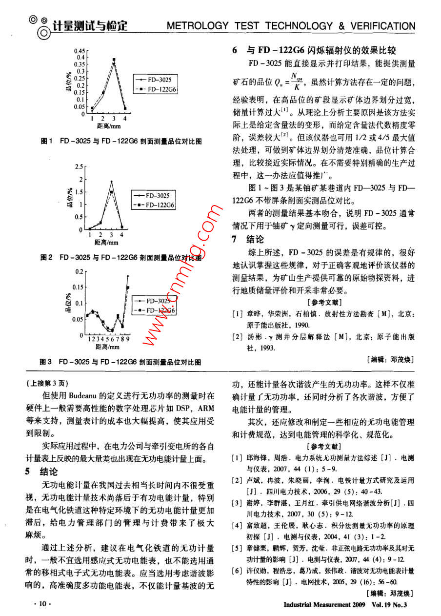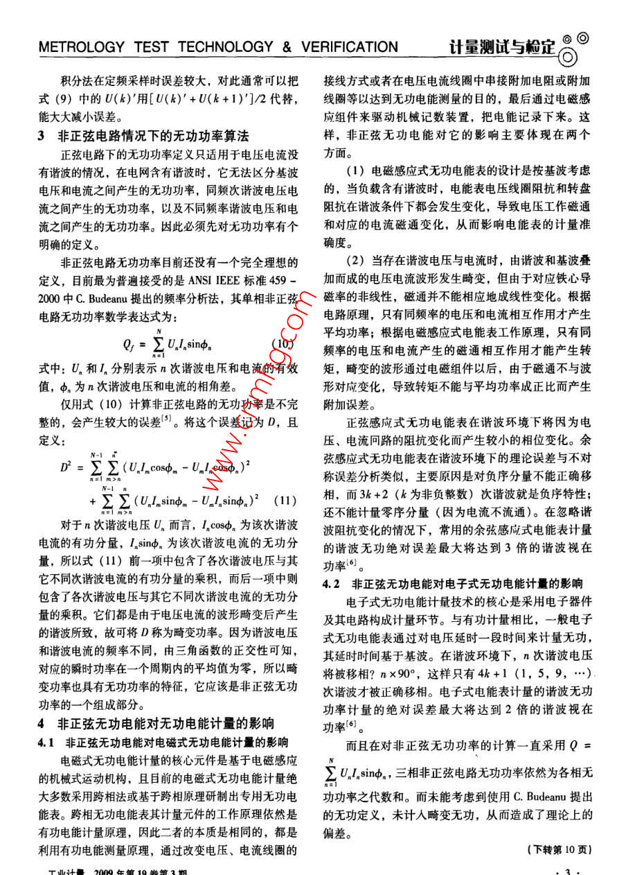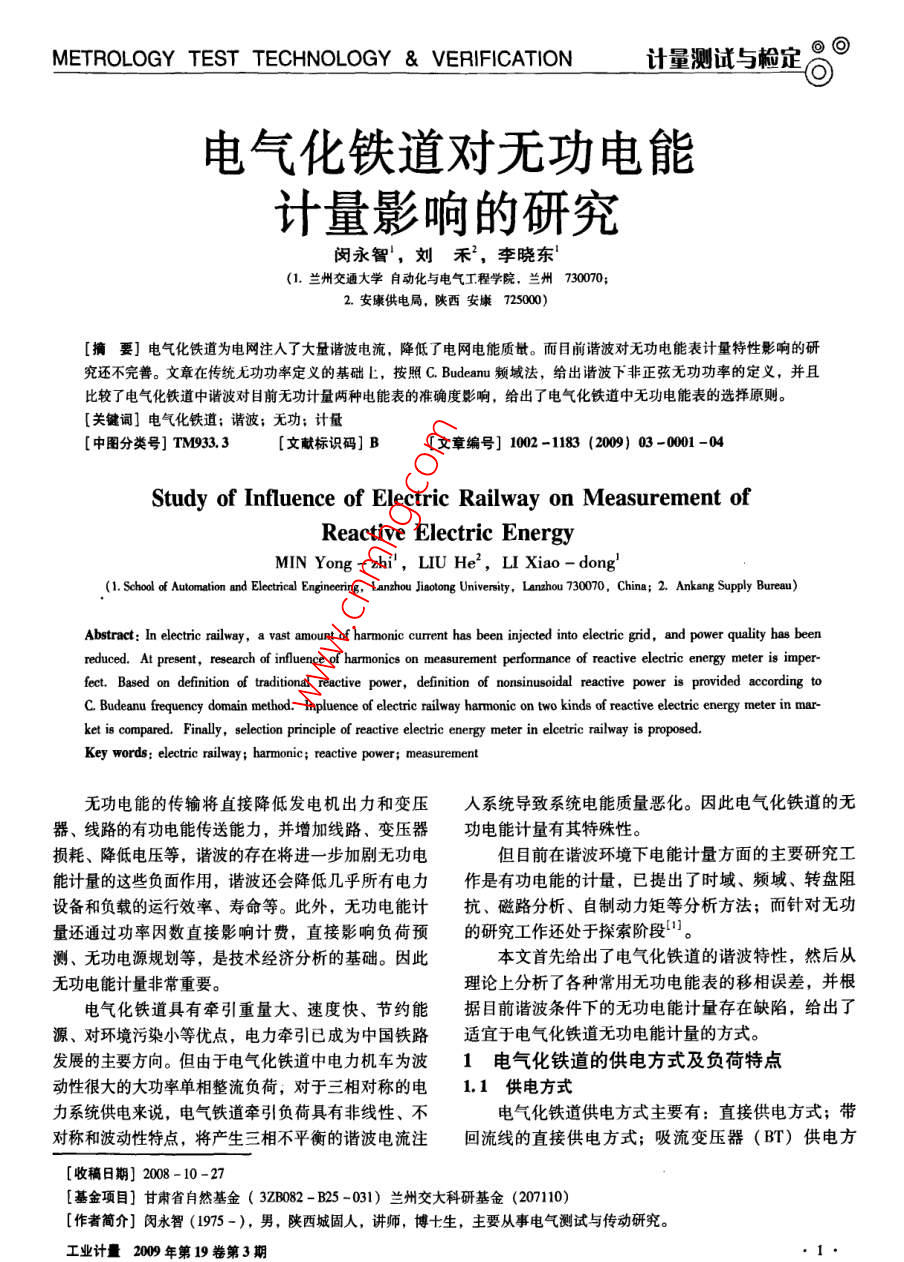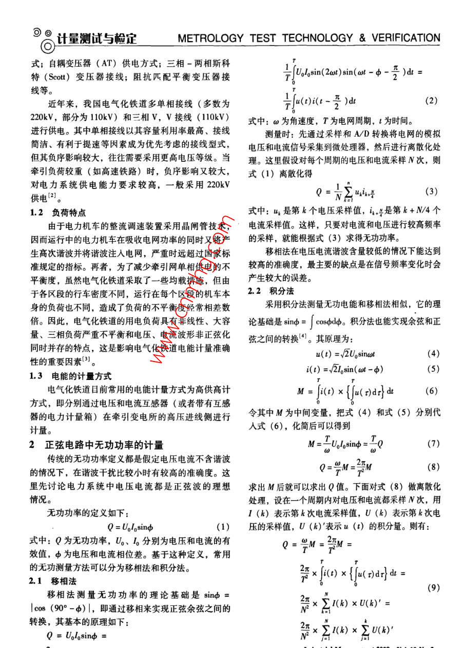 METROLOGY TEST TECHNOLOGY & VERIFICATION計量測試與檢定向電氣化鐵道對無功電能計量影響的研究閔永智',劉禾', 李曉東'(1.蘭州交通大學自動化與電氣工程學院,蘭州730070;2.安康供電局,陜西安嫌725000)[摘要] 電氣化鐵道為電網(wǎng)注入了大量諧波電流,降低了電網(wǎng)電能質(zhì)最。而目前諧波對無功電能表計量待性影響的研究還不完善。文章在傳統(tǒng)無功功率定義的基礎上,按照C.Budeanu頻域法,給出諧波下非正弦無功功率的定義,并且比較了電氣化鐵道中諧波對目前無功計量兩種電能表的準確度影響,給出了電氣化鐵道中無功電能表的選擇原則。[關鍵詞]電氣化鐵道;諧波;無功;計量[中圖分類號] TM933.3[文獻標識碼] B[文章編號] 1002 -1183 (2009) 03 -0001 -04Study of Influence of Electric Railway on Measurement ofReactive Electric EnergyMIN Yong -zhi', LIU He', LI Xiao - dong'(1. School of Automaion and Elctical Engineering, Lanzhou Jiaotong University, Lanzhou 730070, China; 2. Ankang Supply Bureau)Abstract: In eletrie railway, a vast amount of harmonic current has been injected into electrie grid, and power quality has beenreduced. At present, research of influence of harmonics on measurement performance of reactive electric energy meter is imper-fect. Based on definition of traditional reactive power, definition of nonsinusoidal reactive power is provided according toC Budeanu frequency domain method. Inpluence of electric railway harmonic on two kinds of reactive electrie energy meter in mar-ket is compared. Finally, selection principle of reactive electrie enengy meter in elcetric railway is proposed.Key words; eletric railway; harmonic; reactive power; measurement無功電能的傳輸將直接降低發(fā)電機出力和變壓人系統(tǒng)導致系統(tǒng)電能質(zhì)量惡化。因此電氣化鐵道的無器、線路的有功電能傳送能力,并增加線路、變壓器功電能計量有其特殊性。損耗、降低電壓等,諧波的存在將進一步加劇無功電但目前在諧波環(huán)境下電能計量方面的主要研究工能計量的這些負面作用,諧波還會降低幾乎所有電力作是有功電能的計量,已提出了時域、頻域、轉(zhuǎn)盤阻設備和負載的運行效率、壽命等。此外,無功電能計抗、磁路分析、自制動力矩等分析方法;而針對無功量還通過功率因數(shù)直接影響計費,直接影響負荷預的研究工作還處于探索階段川。測、無功電源規(guī)劃等,是技術經(jīng)濟分析的基礎。因此本文首先給出了電氣化鐵道的諧波特性,然后從無功電能計量非常重要。理論上分析了各種常用無功電能表的移相誤差,并根電氣化鐵道具有牽引重量大、速度快、節(jié)約能據(jù)目前諧波條件下的無功電能計量存在缺陷,給出了源、對環(huán)境污染小等優(yōu)點,電力牽引已成為中國鐵路適宜于電氣化鐵道無功電能計量的方式。發(fā)展的主要方向。但由于電氣化鐵道中電力機車為波1電氣化鐵道 的供電方式及負荷特點動性很大的大功率單相整流負荷,對于三相對稱的電1.1供電方式力系統(tǒng)供電來說,電氣鐵道牽引負荷具有非線性、不電氣化鐵道供電方式主要有:直接供電方式;帶對稱和波動性特點,將產(chǎn)生三相不平衡的諧波電流注回流線的直接供電方式;吸流變壓器(BT) 供電方[收稿日期] 2008 -10 -27[基金項目]甘肅省自然基金( 3ZB082 - B25 -031)蘭州交大科研基金(207110)[作者簡介]閔永智(1975-),男,陜西城固人,講師,博十生,主要從事電氣測試與傳動研究。工業(yè)計量2009年第19 卷第3期可◎計量測試與檢定METROLOGY TEST TECHNOLOGY & VERIFICATION式;自耦變壓器(AT) 供電方式;三相-兩相斯科17特(Scott) 變壓器接線;阻抗匹配平衡變壓器接fuoin(20m)sin(6ot-φ-氣)di =線等。近年來,我國電氣化鐵道多單相接線(多數(shù)為-(1)i(t-氣)di(2)220kV,部分為110kV)和三相V, V接線(110kV)式中: w為角速度,T為電網(wǎng)周期,l 為時間。進行供電。其中單相接線以其容量利用率最高、接線測量時:先通過采樣和A/D轉(zhuǎn)換將電網(wǎng)的模擬簡潔、有利于提速等因索成為優(yōu)先考慮的接線型式,電壓和電流信號采集到微處理器,然后進行離散化處但其負序影響較大,往往需要采用更高電壓等級。當理。這里假設對每個周期的電壓和電流采樣N次,則牽引負荷較重(如高速鐵路)時,負序影響又較大,式(1)離散化得對電力系統(tǒng)供電能力要求較高,一般采用220kV供電[0。Q=六客E uinf(3)1.2 負荷特點式中: un 是第h個電壓采樣值,ig是第k +N/4個由于電力機車的整流調(diào)速裝置采用晶閘管技術,電流采樣值。這樣,只要對電流和電壓進行較高頻率因而運行中的電力機車在吸收電網(wǎng)功率的同時又將產(chǎn)的采樣,就能根據(jù)式(3) 求得無功功率。生高次諧波并將諧波注入電網(wǎng),嚴重時遠超過國家標移相法在電壓電流諧波含量較低的情況下能達到準規(guī)定的指標。再者,為了減少牽引網(wǎng)單相供電的不較高的準確度,最主要的缺點是在信號頻率變化時會平衡度,雖然電氣化鐵道采取了一些均載措施,但由產(chǎn)生較大的誤差。于各區(qū)段的行車密度不同,運行在每個區(qū)段的機車本2.2積分法身的負荷也不同,造成了負荷的不平衡度經(jīng)常相差數(shù)采用積分法測量無功電能和移相法相似,它的理倍。因此,電氣化鐵道的用電負荷具有非線性、大容論基礎是sinφ=| cosφdφ。 積分法也能實現(xiàn)余弦和正量、三相負荷嚴重不平衡和電壓、電流波形非正弦化弦之間的轉(zhuǎn)換'4。其原理為:同