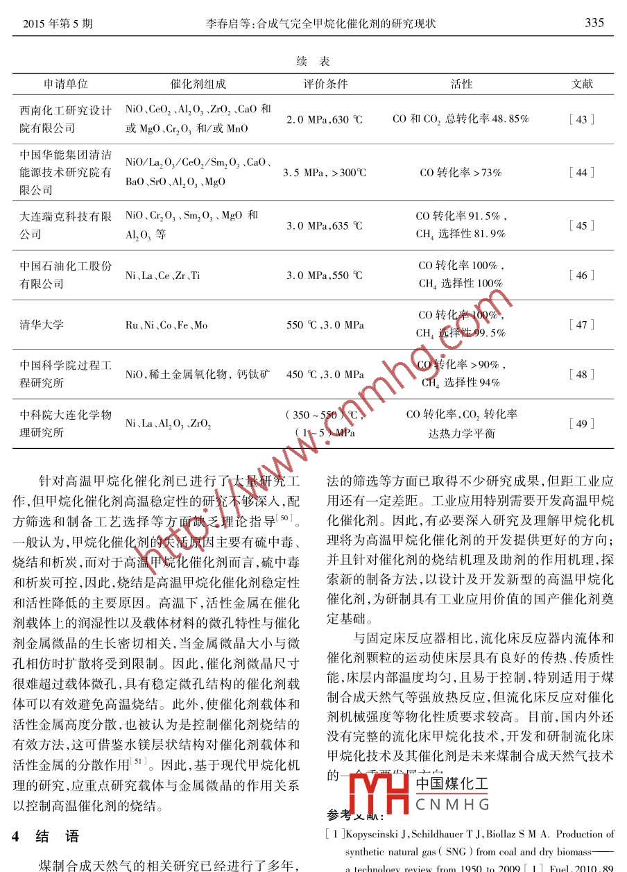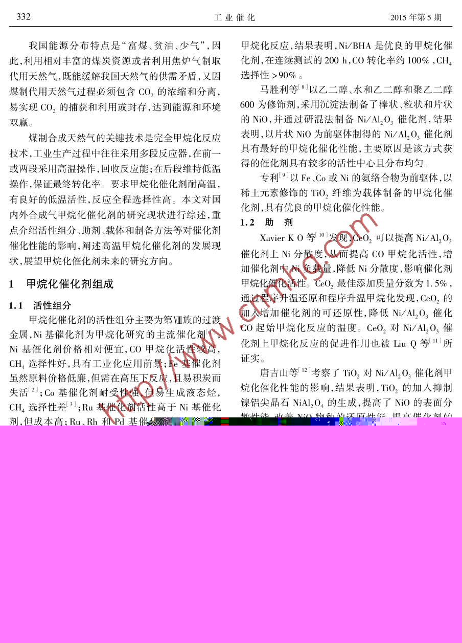 2015年5工業(yè)催化May 2015第23卷第5期INDUSTRIAL CATALYSISVol 23 No 5綜述與展望合成氣完全甲烷化催化劑的研究現(xiàn)狀李春啟*,張諾偉2,梅長松,陳愛平,周帥林,李安學(xué)!,陳秉輝2(1.大唐國際化工技術(shù)研究院有限公司,北京100070;2.廈門大學(xué)化學(xué)化工學(xué)院,福建廈門361005)摘要:以夭然氣供應(yīng)多元化和煤炭清潔高效利用為目標(biāo),煤制合成天然氣受到重視,合成氣完全甲烷化是煤經(jīng)合成氣制天然氣的關(guān)鍵技術(shù),而甲烷化催化劑是其核心要素。合成氣甲烷化催化劑的主流催化劑為鎳基催化劑,常用助劑為稀土氧化物、過渡金屬和堿土金屬,載體為A2O3、SiO2、κrO3、TiO2或復(fù)合氧化物,制備方法為干混法、浸漬法、沉淀法及溶膠-凝膠法。國內(nèi)外主要研究熱點是提高甲烷化催化劑在固定床反應(yīng)器中的高溫、高壓及高空速條件下的穩(wěn)定性和機(jī)械強(qiáng)度。建議深入研究催化劑的燒結(jié)機(jī)理及助劑作用機(jī)理,探索新的制備方法,開發(fā)新型高溫甲烷化催化劑對于強(qiáng)放熱的煤制合成天然氣工藝,也應(yīng)加大流化床甲烷化技術(shù)及催化劑的開發(fā)。關(guān)鍵詞:催化化學(xué);煤化工;合成天然氣;甲烷化催化劑doi:10.3969/j.isn.1008-1143.2015.05.001中圖分類號:TQ426.94;0643.36文獻(xiàn)標(biāo)識碼:A文章編號:1008-1143(201505033107Research progress in the catalysts for complete methanation of syngasLi Chunqi, Zhang Nuowei, Mei Changsong, Chen Aiping, Zhou Shuailin, Li anyue Chen Binghui( 1. Datang International Chemical Technology Research Institute Co, Ltd, Beijing 100070, China;2. College of Chemistry and Chemical Engineering, Xiamen University, Xiamen 361005, Fujian, ChinaAbstract: Aiming at the diversification of the natural gas supplying and the high-efficiency and clean coalconversion, the coal-to-synthetic natural gas technology has been attracted more and more attention. Methanation catalyst plays a key role in bringing such a technology into commercialization. The main methanationcatalysts were Ni-based catalysts. Rare earth oxides, transition metal oxides and alkaline earth metal oxideswere used as the promoters. Al,O3, SiO2, ZrO2, TiO, and the mixed-oxides were applied as the supportsCatalysts were prepared by the dry-mixed method, wetness impregnation method, precipitation method andsol-gel method. The research on methanation catalysts was focused on improving the stability and mechanicalstrength of the catalysts under the conditions of high-temperatures, high-pressure and high space velocityin the fixed-bed reactors. It is suggested that the mechanisms of sintering and promoting should be investigatedoroughly, and the novel preparation methods should be explored to develop new catalysts. Compared withthe fixed-bed reactors and their catalysts, the fluidized-bed reactors and their corresponding catalysts aremore promising for the strongly exothermic methanation reactionKey words catalytmistrychemicals synthetic naturalmethanation catalystdoi:10.3969/j.issn.1008-1143.2015.05.001中國煤化工CLC number: TQ426. 94; 0643. 36 Document code: ACNMHG(201505033107收稿日期:2014-11-21基金項目:國家高技術(shù)研究發(fā)展計劃(863計劃)先進(jìn)能源技術(shù)領(lǐng)域重點項目(2009AA050903)作者簡介:李春啟,1972年生,男,博士,研究方向新型煤化工技術(shù)通訊聯(lián)系人:李春啟。332工業(yè)催化2015年第5期我國能源分布特點是“富煤、貧油、少氣”,因甲烷化反應(yīng),結(jié)果表明,Ni/BHA是優(yōu)良的甲烷化催此,利用相對豐富的煤炭資源或者利用焦?fàn)t氣制取化劑,在連續(xù)測試的200h,CO轉(zhuǎn)化率約100%,CH4代用天然氣,既能緩解我國天然氣的供需矛盾,又因選擇性>90%。煤制代用天然氣過程必須包含CO,的濃縮和分離,馬勝利等8以乙二醇、水和乙二醇和聚乙二醇易實現(xiàn)CO2的捕獲和利用或封存,達(dá)到能源和環(huán)境600為修飾劑,采用沉淀法制備了棒狀粒狀和片狀雙贏。的NO,并通過研混法制備N/A2O3催化劑,結(jié)果煤制合成天然氣的關(guān)鍵技術(shù)是完全甲烷化反應(yīng)表明,以片狀NO為前驅(qū)體制得的N/A2O3催化劑技術(shù),工業(yè)生產(chǎn)過程中往往采用多段反應(yīng)器,在前具有最好的甲烷化催化性能,主要原因是該方式獲或兩段采用高溫操作,回收反應(yīng)能;在后段維持低溫得的催化劑具有較多的活性中心且分布均勻。操作,保證最終轉(zhuǎn)化率。要求甲烷化催化劑耐高溫,專利9以Fe、Co或N的氨絡(luò)合物為前驅(qū)體,以有良好的低溫活性,反應(yīng)全程選擇性高。本文對國稀土元素修飾的TO2纖維為載體制備的甲烷化催化劑,具有優(yōu)良的甲烷化催化性能內(nèi)外合成氣甲烷化催化劑的研究現(xiàn)狀進(jìn)行綜述,重1.2助劑點介紹活性組分、助劑、載體和制備方法等對催化劑Xavier Ko等0發(fā)現(xiàn),CeO2可以提高Ni/Al2O3催化性能的影響,闡述高溫甲烷化催化劑的發(fā)展現(xiàn)狀,展望甲烷化催化劑未來的研究方向催化劑上Ni分散度,從而提高CO甲烷化活性,增加催化劑中Ni負(fù)載量,降低Ni分散度,影響催化劑1甲烷化催化劑組成甲烷化催化活性。CeO2最佳添加質(zhì)量分?jǐn)?shù)為1.5%通過程序升溫還原和程序升溫甲烷化發(fā)現(xiàn),CeO2的1.1活性組分甲烷化催化劑的活性組分主要為第Ⅷ族的過渡加入增加催化劑的可還原性,降低N/AQO3催化金屬,Ni基催化劑為甲烷化研究的主流催化劑1CO起始甲烷化反應(yīng)的溫度。CeO2對Ni/Al2O3催Ni基催化劑價格相對便宜,CO甲烷化活性較高,化劑上