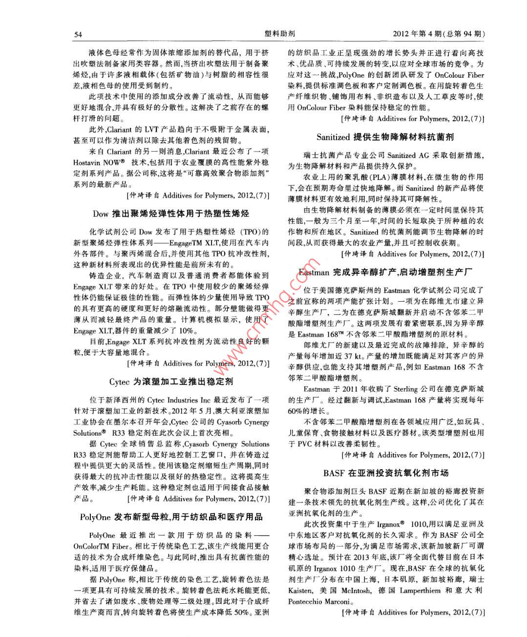 54塑料助劑2012年第4期(總第94期)液體色母經(jīng)常作為固體濃縮添加劑的替代品,用于擠的紡織品工業(yè)正呈現(xiàn)強勁的增長勢頭并正進行著向高技出吹塑法制備家用類容器。然而,當(dāng)擠出吹塑法用于制備聚術(shù)、優(yōu)品質(zhì)、可持續(xù)發(fā)展的轉(zhuǎn)變,以應(yīng)對全球市場的競爭。為烯烴,由于許多液相載體(包括礦物油)與樹脂的相容性很應(yīng)對這一挑戰(zhàn),PolyOne的創(chuàng)新團隊研發(fā)了OnColourFiber差,液相色母的使用受到制約。染料,提供標(biāo)準調(diào)色板和客戶定制調(diào)色板。在用旋轉(zhuǎn)著色生此項技 術(shù)中使用的添加成分改善了流動性,從而能夠產(chǎn)纖維織物、鋪飾用布料、非織造布以及人工草皮等時,使更好地混合,并具有極好的分散性。這解決了之前存在的螺.用OnColourFiber染料能保持穩(wěn)定的性能。桿打滑的問題。[仲琦譯自Aditives for Polymers, 2012,(7)]此外,Clariant的LVT產(chǎn)品趨向于不吸附于金屬表面,Sanitized提供生物降解材料抗菌劑甚至可以作為清潔劑以除去其他著色劑的殘留物。來自Clariant的另-則消息,Clariant最近公布了一項瑞士抗菌產(chǎn)品專業(yè)公司SanitizedAG采取創(chuàng)新措施,HostavinNOW9技術(shù),包括用于農(nóng)業(yè)覆膜的高性能紫外穩(wěn)為生物降解材料和產(chǎn)品提供持久保護。定劑系列產(chǎn)品。據(jù)公司稱,這將是“可靠高效聚合物添加劑”農(nóng)業(yè)上用的聚乳酸(PLA)薄膜材料,在微生物的作用系列的最新產(chǎn)品。下,會在預(yù)期壽命里過快地降解。而Sanitized的新產(chǎn)品將使薄膜材料更有效地利用,同時保持其可降解性。Dow推出聚烯烴彈性體用于熱塑性烯烴由生物降解材料制備的薄膜必須在一定時間里保持其性能,--般為三個月至一年,時間的長短取決于所種植的農(nóng)化學(xué)試劑公司Dow發(fā)布了用于熱塑性烯烴(TPO)的作物和所在地區(qū)。Sanitized的抗菌劑能調(diào)節(jié)生物降解的時新型聚烯烴彈性體系列一EngageTM XLT,使用在汽車內(nèi)間段,從而獲得最大的農(nóng)業(yè)產(chǎn)量,并且可控制收獲期。外各部件。與聚丙烯混合后,并使用其他TPO抗沖改性劑,[仲琦譯自Additives for Polymers, 2012,(7)]這種新材料所表現(xiàn)出的優(yōu)異性能是前所未有的。鑄造企業(yè),汽車制造商以及普通消費者都能體驗到Eastman完成異辛醇擴產(chǎn),啟動增塑劑生產(chǎn)廠EngageXLT帶來的好處。在TPO中使用較少的聚烯烴彈位于美國德克薩斯州的Eastman化學(xué)試劑公司完成了性體仍能保證極佳的性能。而彈性體的少量使用導(dǎo)致TPO之前宜稱的兩項產(chǎn)能擴張計劃。一項為在郎維尤市建立異的具有更高的硬度和更好的熔融流動性。部分壁能做得更辛醇生產(chǎn)廠,二為在德克薩斯城翻新并啟動不含鄰苯二甲薄從而減輕最終產(chǎn)品的重量。計算機模擬顯示,使用了酸酯增塑劑生產(chǎn)廠。這兩項發(fā)展有著緊密聯(lián)系,因為異辛醇Engage XLT,器件的重量減少了10%。是Eastman1687M不含鄰苯二甲酸酯增塑劑的原材料。目前,EngageXLT系列抗沖改性劑為流動性良好的顆郎維尤廠的新建以及最近完成的故障排除,異辛醇的粒,便于大容量地混合。產(chǎn)量每年增加近37kt。產(chǎn)量的增加既能滿足對其客戶的異辛醇供應(yīng),也能支持其增塑劑產(chǎn)品,例如Eastman 168 不含Cytec為滾塑加工業(yè)推出穩(wěn)定劑鄰苯二甲酸酯增塑劑。Eastman于2011年收購了Sterling公司在德克薩斯城位于新澤西州的CytecIndustriesInc最近發(fā)布了一項的生產(chǎn)廠。經(jīng)過翻新與調(diào)試,Eastman168產(chǎn)最將實現(xiàn)每年針對于滾塑加工業(yè)的新技術(shù)。2012年5月,澳大利亞滾塑加60%的增長。工業(yè)協(xié)會在墨爾本召開年會,Cytec公司的CyasorbCynergy不含鄰苯二甲酸酯增塑劑在各領(lǐng)域應(yīng)用廣泛,如玩具、Solutions R33 穩(wěn)定劑在此次會議上首次亮相。兒童保育、食物接觸材料以及醫(yī)療器材。該類型增塑劑也用據(jù)Cytec 全球銷售總監(jiān)稱,Cyasorb Cynergy Solutions于PVC材料以改善柔韌性。R33穩(wěn)定劑能幫助工人更好地控制工藝窗口,并在鑄造過程中提供更大的靈活性。使用該穩(wěn)定劑縮短生產(chǎn)周期,同時獲得最大的抗沖擊性能以及很好的熱穩(wěn)定性。這將提高生BASF在亞洲投資抗氧化劑市場產(chǎn)效率,減少生產(chǎn)耗能。這種穩(wěn)定劑也適用于間接食品接觸聚合物添加劑巨頭BASF近期在新加坡的裕廊投資新產(chǎn)品。建一條技術(shù)領(lǐng)先的抗氧化劑生產(chǎn)線。這樣,公司優(yōu)化了其在PolyOne發(fā)布新型母粒,用于紡織品和醫(yī)療用品亞洲抗氧化劑的生產(chǎn)。此次投資集中于生產(chǎn)Irganox 1010,用以滿 足亞洲及PolyOne最近推出一款用于紡織品的染料一中東地區(qū)客戶對抗氧化劑的長久需求。作為BASF公司全OnColorTM Fiber。 相比于傳統(tǒng)染色工藝,該生產(chǎn)線能用更合球市場布局的一部分,為滿足市場需求,該新加坡新廠可謂.適的技術(shù)為合成纖維染色。與此同時,推出具有抗菌性能的精心選址。預(yù)計在2013 年底,該廠將全面代替目前在日本染料,適用于醫(yī)療保健品。磯原的Iganox 1010生產(chǎn)廠。現(xiàn)在,BASF 在全球的抗氧化據(jù)PolyOne稱,相比于傳統(tǒng)的染色工藝,旋轉(zhuǎn)著色法是劑生產(chǎn)廠分布在中國上海,
