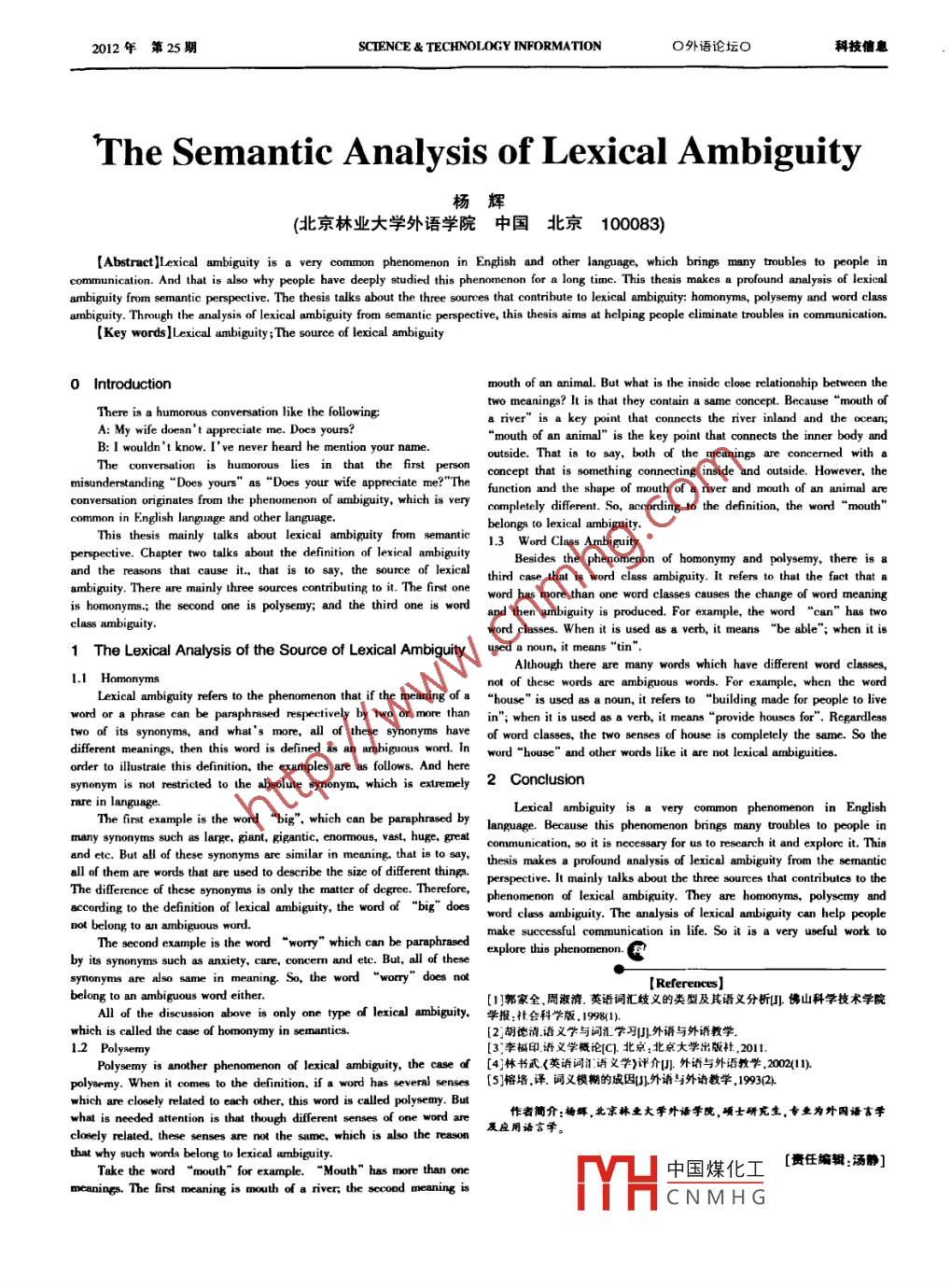 2012年第25期SCTENCE & TECHNOLOGY INFORMATIONO外語(yǔ)論壇O科技信息The Semantic Analysis of Lexical Ambiguity(北京林業(yè)大學(xué)外語(yǔ)學(xué)院中國(guó)北京100083)[Abstract]Lexical ambiguity is a very common phenomenon in English and other language, which brings many troubles to people inambiguity from semantic perspective. The thesis talks about the three sources that contribute to lexical ambiguity: homonyms, polysemy and word classambiguity. Through the analysis of lexical ambiguity from semantic perspective, this thesis aims at helping pecople eliminate troubles in communication.(Key words]Lexical ambiguity ;The source of lexical ambiguity0 Introductionmouth of an animal. But what is the inside close relationehip between thetwo meanings? It is that they contain a same concept. Because “ mouth ofThere is a humorous conversation like the following::r” is a key point that conneets the river inland and the ocean;A: My wife doesn' t appreciale me. Does yours?B: I wouldn't know. I've never heard he mention your name.outside. That is to say, both of the meanings are concemed with ahecomwrsation is humorouslies in thatconcept that is something connecting inside and outside. However, themisunderstanding “Does yours" as "Does your wife appreciate me?"Thefunetion and the shape of mouth of a river and mouth of an animal areconversation originates from the phenomenon of ambiguity, which is verycompletely different. So, according to the definition, the word“'mouth' ”common in English language and other language.belongs to lexical ambiguity.This thesis mainly talks about lexical ambiguity from semantic 1.3 Word Class Ambiguityperspective. Chapter two talks about the definition of lexical ambiguityand the reasons that cause it, that is to say, the source of lexicalthird case that is word class ambiguity. It refers to that the fact that aambiguity. There are mainly three sources contibuting to it. The first oneword has more than one word classes causes the change of word meaningis homonyms.; the second one is polysemy; and the third one is wordand then ambiguity is produced. For example, the word‘ 'can" has twoclass ambiguity.word classes. When it is used as a verb, it means "be able"; when it is1 The Lexical Analysis of the Source of Lexical Ambiguityused a noun, it means "tin' .Although there are many words which have different word classes,.1 Homonymsnot of these words arembiguous words. For example, when the wordI exical ambiguity refers to the phenomenon that if the meaning ofaword or a phrase can be paraphrased rspecively by two or more than in"; when it is used as : verb, it means“"provide houses for"." Regardlesstwo of its synonyms, and what's more, all of these synonyms haveof word classes. the two senses of house is completely the samne. So thediferent meanings. then this word is defined 鶴an ambiguous word. Inword“house" and other words like i are not lexical ambiguitics.order to ilustrale this definition, the examples are as fllows. And heresynonym is not retricted to the abeolule synonym, which is extremely 2 Conclusionrare in language.Lexical ambiguity is a very common phenomenonThe first example is the word“big", which can be paraphrased bylanguage. Because this phenomenon brings many troubles to people inmany synonyms such as large. giant, igantic, enormous, vast, huge, greatcommunication, so it is necessary for us to research it and explore it. Thisand etc. But all of these synonyms are similar in meaning. that is to say,thesis makes a profound analysis of lexical ambiguity from the semanticall of them are words that are used to describe the size of difterent things.perspective. I mainly talks about the hree sources that contributes to theThe dfference of these synonyms is only the matter of degree. Therefore,phenomenon of lexical ambiguity. They are homonyms, polysemy andaccording to the defintion of lexical ambiguity, the wordof“big" does word cless anbigity. The analysis of lexical ambiguity can help peopleDOt beclong to un ambiguous word.The second example is the word“worry" which can be paraphrasedmake successful compunication in life. So it is a very useful work toby is synonyms such as anxiety, care, concem and etc. But, all of theseexplore this phenonenon.和synonyms are also same in meaning. So, the word‘“ wory”does not(References]belong to an ambiguous word either.[1]郭家全.周淑清.英語(yǔ)詞匯歧義的類型及其語(yǔ)義分析J.佛山科學(xué)技術(shù)學(xué)院All of the discussion above is only one type of lexical ambiguity. 學(xué)報(bào):t 會(huì)科學(xué)版.9981.which is called the case of homonymy in semantics.[2j胡德清.語(yǔ)義學(xué)與詞匯學(xué)習(xí).外講與外語(yǔ)教學(xué).1.2 Polysemy[3;李福印.講義學(xué)概論[C.北京:北京大學(xué)出版社.2011.Palysemy is another phenomenon of lexical anmbiguity, the case of [4]林 書武.{英語(yǔ)詞門:請(qǐng)義學(xué))評(píng)介I外語(yǔ)與外語(yǔ)教學(xué)20201)1)my. When i comes to the definition. if a word has several senses [5]榕培,譯詞義模糊的成因小外語(yǔ)與外語(yǔ)教學(xué).9932.losely related to each other, thisd is called polysemy. But作者簡(jiǎn)介:楊輝,北京林業(yè)大學(xué)外語(yǔ)學(xué)院.項(xiàng)士研究生,專業(yè)為外網(wǎng)語(yǔ)言學(xué)what is needed attention is that though different senses of one word are及應(yīng)用語(yǔ)言學(xué)。closely related. these senses are not the same. which is also the reasonthat why such words belong to Jexical umbiguity.[責(zé)任編輯:湯靜]Take the word“mouth" for example. "Mouth" has more than one中國(guó)煤化工meanings. The first meaning is mouth ofa river, the second meaning isMYHCNM HG萬方魏據(jù)