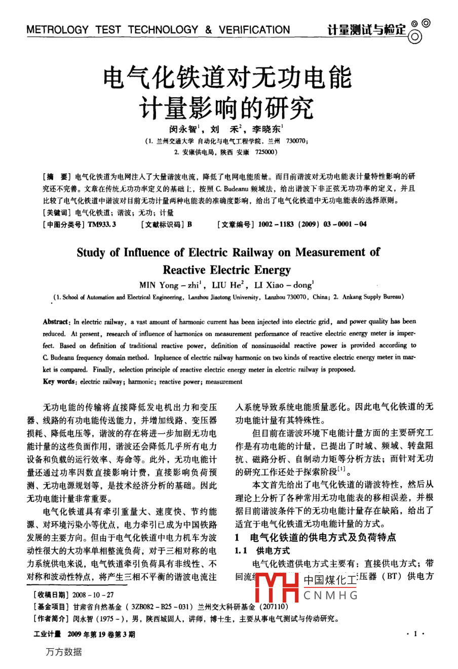 ETROLOGY TEST TECHNOLOGY VERIFICATION計(jì)量測(cè)試與輜定⊙電氣化鐵道對(duì)無(wú)功電能計(jì)量影響的研究閔永智,劉禾2,李曉東(1.蘭州交通大學(xué)自動(dòng)化與電氣工程學(xué)院,蘭州730070;2.安康供電局,陜西安康725000)[摘要]電氣化鐵道為電網(wǎng)注入了大量諧波電流,降低了電網(wǎng)電能質(zhì)量。而目前諧波對(duì)無(wú)功電能表計(jì)量特性影響的研究還不完善。文章在傳統(tǒng)無(wú)功功率定義的基礎(chǔ)上,按照 C Judean頻域法,給出諧波下非正弦無(wú)功功率的定義,并且比較了電氣化鐵道中諧波對(duì)目前無(wú)功計(jì)量?jī)煞N電能表的準(zhǔn)確度影響,給出了電氣化鐵道中無(wú)功電能表的選擇原則。[關(guān)鍵詞]電氣化鐵道;諧波;無(wú)功;計(jì)量中圖分類號(hào)]TM33[文獻(xiàn)標(biāo)識(shí)碼]B[文章編號(hào)]1002-1183(200)03-001-04Study of Influence of Electric Railway on Measurement ofReactive Electric energyMIN Yong-zhi, LIU He, LI Xiao-dong(1. School of Automation and Electrical Engineering, Lanzhou Jiaotong University, Lanzhou 730070, China; 2. Ankang Supply Bureau)Abstract: In electric railway, a vast amount of harmonic current has been injected into electric grid, and power quality has beenreduced. At present, research of influence of harmonics on measurement performance of reactive electric energy meter is imper-fect. Based on definition of traditional reactive power, definition of nonsinusoidal reactive power is provided according toC. Budeanu frequency domain method. Inpluence of electric railway harmonic on two kinds of reactive electric energy meter in mar-ket is compared. Finally, selection principle of reactive electric energy meter in elcetric railway is proposedKey words: electric railway harmonic; reactive power; measurement無(wú)功電能的傳輸將直接降低發(fā)電機(jī)出力和變壓系統(tǒng)導(dǎo)致系統(tǒng)電能質(zhì)量惡化。因此電氣化鐵道的無(wú)器、線路的有功電能傳送能力,并增加線路、變壓器功電能計(jì)量有其特殊性。損耗、降低電壓等,諧波的存在將進(jìn)一步加劇無(wú)功電但目前在諧波環(huán)境下電能計(jì)量方面的主要研究工能計(jì)量的這些負(fù)面作用,諧波還會(huì)降低幾乎所有電力作是有功電能的計(jì)量,已提出了時(shí)域、頻域、轉(zhuǎn)盤阻設(shè)備和負(fù)載的運(yùn)行效率、壽命等。此外,無(wú)功電能計(jì)抗、磁路分析、自制動(dòng)力矩等分析方法;而針對(duì)無(wú)功量還通過功率因數(shù)直接影響計(jì)費(fèi),直接影響負(fù)荷預(yù)的研究工作還處于探索階段。測(cè)、無(wú)功電源規(guī)劃等,是技術(shù)經(jīng)濟(jì)分析的基礎(chǔ)。因此本文首先給出了電氣化鐵道的諧波特性,然后從無(wú)功電能計(jì)量非常重要。理論上分析了各種常用無(wú)功電能表的移相誤差,并根電氣化鐵道具有牽引重量大、速度快、節(jié)約能據(jù)目前諧波條件下的無(wú)功電能計(jì)量存在缺陷,給出了源、對(duì)環(huán)境污染小等優(yōu)點(diǎn),電力牽引已成為中國(guó)鐵路適宜于電氣化鐵道無(wú)功電能計(jì)量的方式。發(fā)展的主要方向。但由于電氣化鐵道中電力機(jī)車為波1電氣化鐵道的供電方式及負(fù)荷特點(diǎn)動(dòng)性很大的大功率單相整流負(fù)荷,對(duì)于三相對(duì)稱的電1.1供電方式力系統(tǒng)供電來說,電氣鐵道牽引負(fù)荷具有非線性、不電氣化鐵道供電方式主要有:直接供電方式;帶對(duì)稱和波動(dòng)性特點(diǎn),將產(chǎn)生三相不平衡的諧波電流注回流中國(guó)煤化工壓器(BT)供電方[收稿日期]2008-10-27CNMHG[基金項(xiàng)目]甘肅省自然基金(3ZB082-B25-031)蘭州交大科研基金(20710)[作者簡(jiǎn)介]閔永智(1975-),男,陜西城固人,講師,博十生,主要從事電氣測(cè)試與傳動(dòng)研究工業(yè)計(jì)量200年第19卷第3期9g計(jì)量測(cè)試與定METROLOGY TEST TECHNOLOGY & VERIFICATION式;自耦變壓器(AT)供電方式;三相-兩相斯科特(Scot)變壓器接線;阻抗匹配平衡變壓器接74(2o)(-)d線等。近年來,我國(guó)電氣化鐵道多單相接線(多數(shù)為u(oi(t-t)de22l,0部分為1l0V)和三相V,V接線(1lyv)式中:a為角速度,T為電網(wǎng)周期,t為時(shí)間。進(jìn)行供電。其中單相接線以其容量利用率最高、接線測(cè)量時(shí):先通過采樣和AD轉(zhuǎn)換將電網(wǎng)的模擬簡(jiǎn)潔、有利于提速等因索成為優(yōu)先考慮的接線型式,電壓和電流信號(hào)采集到微處理器,然后進(jìn)行離散化處但其負(fù)序影響較大,往往需要采用更高電壓等級(jí)。當(dāng)理。這里假設(shè)對(duì)每個(gè)周期的電壓和電流采樣N次,則牽引負(fù)荷較重(如高速鐵路)時(shí),負(fù)序影響又較大,式(1)離散化得對(duì)電力系統(tǒng)供電能力要求較高,一般采用220kV供電(21。uAk+A1.2負(fù)荷特點(diǎn)式中:4是第k個(gè)電壓采樣值,讠,÷是第k+N4個(gè)由于電力機(jī)車的整流調(diào)速裝置采用晶閘管技術(shù),電流采樣值。這樣,只要對(duì)電流和電壓進(jìn)行較高頻率因而運(yùn)行中的電力機(jī)車在吸收電網(wǎng)功率的同時(shí)又將產(chǎn)的采樣,就能根據(jù)式(3)求得無(wú)功功率。生高次諧波并將諧波注入電網(wǎng),嚴(yán)重時(shí)遠(yuǎn)超過國(guó)家標(biāo)移相法在電壓電流諧波含量較低的情況下能達(dá)到準(zhǔn)規(guī)定的指標(biāo)。再者,為了減少牽引網(wǎng)單相供電的不較高的準(zhǔn)確度,最主要的缺點(diǎn)是在