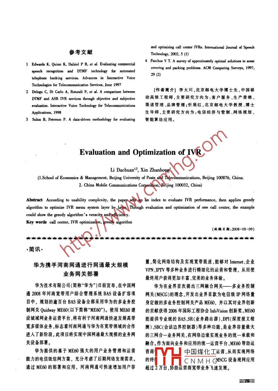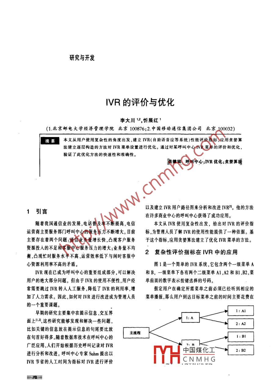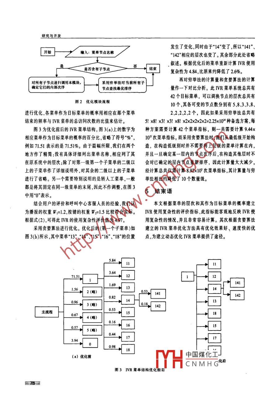研究與開發(fā)IVR的評價與優(yōu)化李大川12,忻展紅1(1.北京郵電大學(xué)經(jīng)濟管理學(xué)院北京100876;2.中國移動通信集團公司 北京100032)摘要本文從用戶使用復(fù)雜性的角度出發(fā),建立IVR(自助語音應(yīng)答系統(tǒng))性能評價指標,應(yīng)用貪婪算法建立逐層構(gòu)造的方法對IVR菜單設(shè)置進行優(yōu)化。通過對某呼叫中心IVR菜單的評價和優(yōu)化,驗證了此優(yōu)化方法的快速性和準確性。關(guān)鍵詞孵叫中心;IVR優(yōu)化;貪婪算端以及建立IVR用戶路徑圖來分析和改進IVR。他的方法1引言在許多商業(yè)中心的呼叫中心獲得了成功應(yīng)用。隨著我國通信業(yè)的發(fā)展,電話普及率不斷提高,電信本文從IVR使用復(fù)雜性出發(fā),給出對IVR的評價指運營商主要服務(wù)部門呼叫中心的服務(wù)壓力不斷增大。目前標,為管理人員了解IVR的使用性能提供了一種依據(jù)?;饕嬖谥鴥蓚€問題:通信業(yè)務(wù)量增長快,凸現(xiàn)客戶服務(wù)于這個指標,應(yīng)用貪婪算法建立了優(yōu)化IVR菜單的方法。資源投人的不足和客服中心服務(wù)壓力的增大;業(yè)務(wù)量不均2復(fù)雜性評價指標在IVR中的應(yīng)用衡,凸現(xiàn)忙時服務(wù)水平不高、運營效率低下與閑時客服中心資源利用率不高的矛盾。圖1是一個簡單的IVR系統(tǒng),它包含兩個一級菜單AIVR現(xiàn)在已成為呼叫中心的重要組成部分,可以解決和B,一級菜單下各有兩個二級菜單A1、A2和B1、B2,菜用戶的絕大部分問題。但由于IVR的使用不便性,用戶經(jīng)單前面的數(shù)字表示按鍵選撣的號碼。常需要跣過IVR轉(zhuǎn)入人工服務(wù),降低了IVR的利用率,增假定用戶在確定所需菜單之前必須已經(jīng)聽到相應(yīng)的加了人力需求。因此,如何對IVR進行改進成為管理人員菜 單播報,那么用戶到達目標菜單之前的時間主要花費在的一個重要課題。早期的研究主要集中在提示信息、交互界1: AI1: A面上2,這些研究能夠發(fā)現(xiàn)和解決一些問題,2: A2比如關(guān)鍵的信息放在提示信息的句尾要比放.主流程在句首好得多。隨著數(shù)據(jù)庫技術(shù)在呼叫中心的1:B1廣泛應(yīng)用,人們開始根據(jù)歷史呼叫記錄對IVR中國煤化工2: B2進行分析和改進。呼叫中心專家Suhm提出以IVR節(jié)省的人工時間為指標對IVR進行評價M.HCNMH G378聽系統(tǒng)播報菜單以及按鍵選擇上,而這些由目標菜單在整表1一個簡單的IVR菜單的層次和訪問概辜個IVR菜單結(jié)構(gòu)中的層次所決定。目標菜單的層數(shù)越多,在A1AB1B同一層中次序越靠后,那么用戶聽的播報次數(shù)就越多,按鍵層次劉) (例 (制劃 (街劃) (知劃 (x,劉)次數(shù)也越多;反之亦然。例如到達菜單B2,用戶需要聽播報訪問概率PP;“A請按1"、“B請按2" ,然后按鍵2,再聽播報“B1請按1”.“B2請按2" ,再按鍵2,-共聽播報4次,按鍵2次。Z=minF(X,P),X∈Q(3用向量x(nx,.. ,)表示一個菜單的層次。m表示此以圖1為例說明約束條件Q,設(shè)其各菜單作為目標菜菜單的總層數(shù),也即需要按鍵的次數(shù)。斯表示其經(jīng)過的第i單的概率以及層次如表1所示。則x(x)(.)(C,劃,(向,層菜單所在的次序,也即用戶在第i層時確定相應(yīng)菜單所,(,()2),)P-(p:pP2,p3,pa),其中 X需要滿足限制條需聽的播報次數(shù)。如圖1中A1的層次為(1,1),B2的層次件:(m,劃∈(1,2), (2,1), (的,知)∈({(1,2), (2,1)}, (5s,為(2,2)。a)(1.2),(2,1)]。因此Q中- -共有8個元素,也即菜單設(shè)-般來說聽播報和按鍵對使用復(fù)雜性的影響具有不置有8種方案。同的權(quán)重,并且隨著播報次數(shù)和按鍵次數(shù)的增加,相應(yīng)的3.1窮舉法影響急劇增加。因此將播報和按鍵的影響權(quán)重設(shè)置為呈指在尋找最優(yōu)的IVR菜單配置方案時,窮舉法是一種最數(shù)增長,設(shè)聽播報的權(quán)重為w,按鍵的權(quán)重為Wz,則定義容易提到的方法。 其主要思路為:獲得所有可能的配置方單個菜單的復(fù)雜性評價為:案,計算每一種方案的評價指標,通過比較找出其中的最優(yōu)配置。這種方法對于規(guī)模較小的IVR菜單系統(tǒng)是可行)=zwi! .(1)的,例如上面的例子中備選方案-共有8種,計算量并不其中X=(na“x2),n 為到達目標菜單之前的所有播大。實際的IVR菜單系統(tǒng)非常龐大,窮舉法在理論上是可行的,但是計算量非常大,優(yōu)化速度很慢。報次數(shù),n=x,W,W7>1。3.2貪婪算法下面建立對整個IVR系統(tǒng)的復(fù)雜性評價。為了解決窮舉法的缺陷,我們應(yīng)用貪婪算法來尋找最設(shè)IVR -共有n個目標菜單,它們的層次記為X=(X,優(yōu)解。貪婪算法是一種直觀的問題求解方法,采用逐步構(gòu)x*",.,)",其中X;表示一個菜單的層次,以它們?yōu)槟繕瞬嗽熳顑?yōu)解的過程,在優(yōu)化方法上有著廣泛的應(yīng)用。在構(gòu)造單的慨率為P=(p>". ,p)",單個菜單的評價指標為A),過程的每個階段,都作出一個在一定標準下最優(yōu)的決策,則對整個IVR復(fù)雜性評價的函數(shù)為:作出決策的依據(jù)稱為貪婪準則。由于子節(jié)點的次序會影響父節(jié)點的排列次序,采用從FX,P= ZAxp. .(2)最低級節(jié)點向前逐層構(gòu)造菜單配置的方法。貪婪準則為在當前可選的所有配置方案中選擇最優(yōu)配置。它的含義為用戶使用IVR的平均復(fù)雜性。在實際編程過程中采用遞歸的方式,其優(yōu)化模塊流程3對IVR菜單的優(yōu)化見圖2。在確定