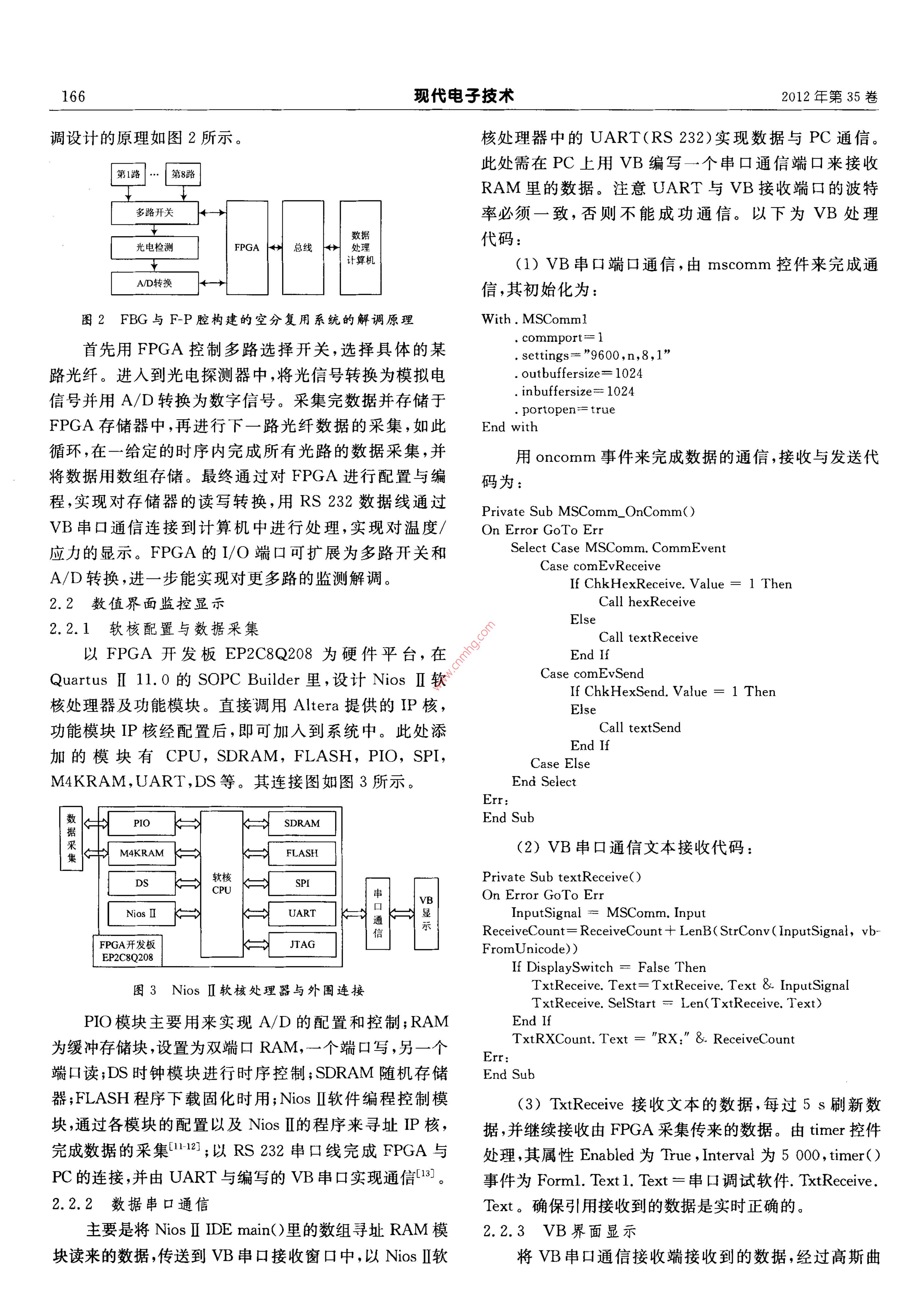 2012年12月1日現(xiàn)代電子技術(shù)Dec.2012第35卷第23期Modern Electronics TechniqueVo.35No.23光纖傳感空分復(fù)用下多點溫度與應(yīng)力的監(jiān)測顯示王明波,惠小強酉安郵電大學(xué)理學(xué)院,陜西西安710121)摘要:多參量多點實時監(jiān)測顯示是傳感研究領(lǐng)琙的一項重要技術(shù)。以光纖 Fabry-Perot(F-P)腔與光纖Brag光柵(FBG)傳感器的串聯(lián)復(fù)用結(jié)構(gòu)為單元構(gòu)建空分復(fù)用(SDM)系統(tǒng),設(shè)計了溫度、應(yīng)力多點實時顯示的方案。由FPGA構(gòu)建的SOPC與iosⅡ完成對多監(jiān)測點的數(shù)據(jù)采集,由VB串口通信接收FPGA存儲器存儲的采集數(shù)據(jù),再把此數(shù)據(jù)由高斯曲線擬合方程處理得到溫度和應(yīng)力的參數(shù)值,最后用VB實現(xiàn)監(jiān)測顯示。結(jié)果表明F-P腔與FBG串聯(lián)能有效克服溫度與應(yīng)力的交叉敷感,FPGA結(jié)合VB能很方便的實現(xiàn)多麥量多點的實時監(jiān)測顯示。關(guān)鍵詞:光纖傳感;空分復(fù)用;溫度與應(yīng)力顯示;FPGA;VB中圖分類號:TN911-34文獻(xiàn)標(biāo)識碼:A文章編號:1004373X(2012)23-0164-05Display of multi-point temperature and strain in space division multiplexing of fiber sensorsWANG Ming-bo, XI Xiao-qiangSchool of Science, Xi'an University of Posts and Telecommunications, Xi'an 710121, China)Abstract: The real-time display of multi-parameter and multi-point monitoring is an important technology in the researchield of sensors. For the space division multiplexing constituted by the multiplexing of fiber Fabry-Perot(F-P) cavity in seriesith fiber bragg grating(FBG) sensor, a real-time display proposal of multi- point temperature and strain is designed. Theprogrammable system on chip(SOPC)constituted by FPga and Nios f are adopted for data acquisition on multiple pointsand then VB serial communication is used to receive and process data from FPGA memorizer. Third, the data are processed byGaussian curve fitting equation to obtain temperature and strain parameter values. Finally the real-time monitoring is realizedwith VB. The results show that the design method of fiber Fabry-Perot(F-P) cavity in series with fiber Bragg grating(FBG)sensor can overcome the cross-sensitivity of temperature and strain, and FPga with the combination of vb can realize the display of multi-parameter and multi-point convenientlyKeywords: fiber sensor; space division multiplexing; display of temperature and strain; FPGA; VB本文主要完成了對多監(jiān)測點雙參數(shù)監(jiān)控顯示的研0引言究。FBG能通過反射或透射波長實現(xiàn)對溫度的測近年來,光纖光柵傳感技術(shù)的應(yīng)用在各行各業(yè)中得量;F-P可用做可調(diào)諧FP腔、濾波器、傳感器等,調(diào)到了快速的發(fā)展叫。人們對待測物理量在精度、性能、節(jié)腔長與電壓的關(guān)系能實現(xiàn)對應(yīng)力解調(diào)°。故首先設(shè)容量以及多參數(shù)等方面提出了更高的要求。這極大地計了一種基于FBG與FP腔傳感器串聯(lián)復(fù)用,并對其促進(jìn)了光纖光柵傳感復(fù)用類型相關(guān)理論和技術(shù)的研究,進(jìn)行空分復(fù)用,構(gòu)建成能實現(xiàn)多監(jiān)測點雙參數(shù)高精度解而解調(diào)顯示技術(shù)正是其中的一個重要環(huán)節(jié),現(xiàn)常以調(diào)的系統(tǒng)。分析FP腔與FBG串聯(lián)復(fù)用的光譜,可知能ARM,DSP,FPGA等芯片為核心控制多路數(shù)據(jù)信號的實現(xiàn)待測信號的高精度解調(diào):即FP腔長(應(yīng)力)和FBG采集、存儲和處理,并用 LabVIew,VB, Matlab及其混反射中心波長(溫度)的同時測量。并使用FBG和合使用等做界面顯示處理241。FP腔分別對溫度與應(yīng)力進(jìn)行測量,進(jìn)而與FP腔和文中FPGA與VB結(jié)合實現(xiàn)多參量的監(jiān)測顯示,FBG串聯(lián)復(fù)用所得結(jié)果進(jìn)行比較,通過實驗對該方法進(jìn)得益于FGA高度集成、內(nèi)部資源豐富、功能強大、時行了驗證。而空分復(fù)用就能實現(xiàn)多個監(jiān)測點的雙參數(shù)高序控制精確、支持并行處理、編程靈活等優(yōu)點;VB簡潔精度解調(diào)。此后由FPGA構(gòu)建的SOPC與Nos完成對易懂、界面設(shè)計簡單多監(jiān)測點雙參數(shù)的數(shù)據(jù)采集;由VB串口通信進(jìn)行數(shù)據(jù)接收,并把采集到的數(shù)據(jù)帶入高斯曲線擬合方程屮,求收稿日期:20120724出具體的溫度與應(yīng)力,并用VB界面實現(xiàn)了監(jiān)控顯示?;痦椖?國家自然科學(xué)基金資助(11174165)第23期王明波,等:光纖傳感空分復(fù)用下多點溫度與應(yīng)力的監(jiān)測顯示1651原理分析與理論模型形成最終的輸出光譜Io。其數(shù)學(xué)表達(dá)式為:Iout=I +14=In[fBG+(1-fFBG)2fE-PJ (4)1.1FBG的應(yīng)變和溫度響應(yīng)式中:fFBG=R·exp[-(λ-AB)2/C2],即用高斯分布來根據(jù)光纖耦合模型理論可知,滿足 Bragg條件的反表示FBG的反射譜,R為光柵峰值反射率;λB為 Bragg射光波長為:反射中心波長;c值的大小用于表征反射峰的寬度;AB= nera(1)fp=2r[1+cos(4πL/λ+x)],其中r為光纖端面反射式中:A為光柵周期;nf為有效折射率。當(dāng)A和nd因外率,L為FP腔的腔長,為光波長界同時引起較小的變化△A和△n時,由 Bragg條件可由式(4)可知,由傳感器返回的光譜并不是FBG傳知,反射波長會發(fā)生移位△B?!鰽B可表示為:感器與FP腔傳感器各自反射光譜的簡單疊加。此△AB=2△n4+2n:△A(2)時,若直接采集光譜信號中的FBG反射峰值波長作為若溫度、應(yīng)變共同作用時,產(chǎn)生的 Bragg