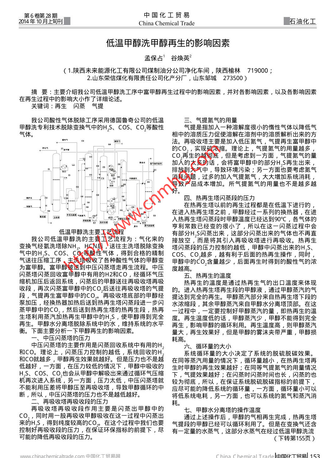 第6卷第28期中國(guó)化工貿(mào)易2014年10月上旬刊China Chemical Trade石油化工低溫甲醇洗甲醇再生的影響因素孟保占’谷煥英?( 1.陜西未來(lái)能源化工有限公司煤制油分公司凈化車間,陜西榆林719000 ;2.山東榮信煤化有限責(zé)任公司化產(chǎn)分廠, 山東鄒城273500 )摘要:主要介紹我公司低溫甲醇洗工序中富甲醇再生過(guò)程中的影響因素,并對(duì)各影響因素,以及各影響因素在再生過(guò)程中的影響大小作了詳細(xì)論述。關(guān)鍵詞:再生閃蒸氣提我公司酸性氣體脫除工序采用德國(guó)魯奇公司的低溫三、氣提氮?dú)獾挠昧考状枷磳@夹g(shù)脫除變換氣中的H,S、COS、 CO,等酸性氣提是指加入一種溶解度很小的惰性氣體以降低氣氣體。相中的溶質(zhì)壓力促使溶解在溶劑中的溶質(zhì)解析出來(lái)的方法。再吸收塔主要是加入低壓氮?dú)?氣提再生富甲醇中的CO,,實(shí)現(xiàn)硫濃縮。理論上,氣提氮?dú)獾挠昧吭蕉?,CO,再生的越徹底,但是考慮到一方面,氣提氮?dú)獾牧? ..加入的太多的話 ,會(huì)將富甲醇中的部分H,S再生出來(lái),排放到大氣中,導(dǎo)致環(huán)境污染;另一方面也要考慮氮?dú)庀膯?wèn)題,過(guò)多的加入氣提氮?dú)?大大增加系統(tǒng)消耗,導(dǎo)致產(chǎn)品成本增加。所氣提氮?dú)獾挠昧恳膊皇窃蕉嘣胶谩K?、熱再生塔閃蒸段的壓力在熱再生塔以前的再生過(guò)程都是在低溫下進(jìn)行的,在進(jìn)入熱再生塔之前,甲醇經(jīng)過(guò)一系列的換熱器,在進(jìn)入熱再生塔閃蒸段時(shí)甲醇溫度已經(jīng)達(dá)到90°C ,各氣體的亨利常數(shù)已經(jīng)變的很小了,所以在這-閃蒸過(guò)程中會(huì)低溫甲醇洗主要工藝流程有部分H,S閃蒸出來(lái),這部分閃蒸出來(lái)的氣體也不再直我公司低溫甲醇洗的主要工藝流程為:氣化來(lái)的接放空 ,而是將其引入再吸收塔進(jìn)行再吸收。熱再生變換氣經(jīng)氨洗塔除NHg、HCN后,送往主洗塔脫除變換塔閃蒸段的壓力控制的越低,甲醇中閃蒸出來(lái)的H,S、氣中的H,S、COS、CO,等酸性氣體,得到合格的精制CoS、 CO,越多,越有利于后面的熱再生操作,同時(shí)氣送往壓縮工序,主洗塔吸收了各種酸性氣體的甲醇變甲醇中的CO,含 量越少,后面再生時(shí)得到的酸性氣的濃為富甲醇。富甲醇被送到中壓閃蒸塔走再生流程。中壓度越高。閃蒸塔閃蒸回收富甲醇中有用的H2和CO ,經(jīng)循環(huán)氣壓五、熱再生的溫度縮機(jī)加壓后返回系統(tǒng),閃蒸后的甲醇送往再吸收塔再吸熱再生的溫度是通過(guò)熱再生氣的出口溫度來(lái)體現(xiàn)收段,再次閃蒸富甲醇中的CO,后送往再吸收塔的氣提.的。進(jìn)入熱再生塔再生段的甲醇液,通過(guò)甲醇蒸汽的氣段,氣提再生富甲醇中的CO。再吸收塔底部的甲醇經(jīng)提達(dá)到完全的再生。 甲醇蒸汽部分來(lái)自熱再生塔下段的泵加壓,經(jīng)換熱器加熱后送到熱再生塔閃蒸段進(jìn)一步閃水濃縮段,其余甲醇蒸汽來(lái)自甲醇水分離塔頂部。在這蒸甲醇中的CO, ,然后送到熱再生塔的熱再生段,熱再.一過(guò)程中,-定要控制好甲醇蒸汽的量,即熱再生的溫生塔利用蒸汽加熱再生甲醇中的HS ,使甲醇得到完全度。 再生溫度低的話,甲醇蒸汽少,甲醇不能得到完全再生。甲醇水分離塔脫除系統(tǒng)中的水,維持系統(tǒng)的水平再生 ,影響甲醇的循環(huán)利用。再生溫度高,則甲醇蒸汽衡。 下面主要分析一下甲醇再生的影響因素。量大,再生效果好,但是甲醇的霧沫夾帶嚴(yán)重,甲醇損一、中壓閃蒸塔的壓力耗高中壓閃蒸塔的主要作用是閃蒸回收系統(tǒng)中有用的H2六、循環(huán)量的大小.和CO。理論.上,閃蒸壓力控制的越低,系統(tǒng)回收的H,系統(tǒng)循環(huán)量的大小決定了系統(tǒng)的脫硫脫碳效果。和CO就越多,甲醇再生效果就越好。但是壓力也不是越在同等蒸汽用量的情況下,循環(huán)量越小,在熱再生塔再低越好, - -方面,在壓力較低的情況下, 甲醇中吸收的生時(shí) 甲醇的再生效果越好;在同等氣提氮?dú)獾挠昧壳闆rH,S、COS、CO,也會(huì)從甲醇中解吸出來(lái)通過(guò)循環(huán)氣壓縮下,氣提效果越好;在閃蒸時(shí)閃蒸時(shí)間也長(zhǎng),閃蒸的也機(jī)再次進(jìn)入系統(tǒng).另一方面,壓力太低,中壓閃蒸塔就較為徹底 ,所以,在保證系統(tǒng)脫硫脫碳指標(biāo)的前提下,不能利用壓差將甲醇?jí)褐猎傥账? 導(dǎo)致甲醇循環(huán)的中應(yīng)盡可 能的降低系統(tǒng)的循環(huán)量,一方面,循環(huán)量小可以斷,所以,中壓閃蒸塔的壓力也不是越低越好。將低系統(tǒng)電耗,另一方面,也可以系統(tǒng)的氮?dú)夂驼羝?、再吸收塔再吸收段的壓力耗。再吸收塔再吸收段作用主要是閃蒸出甲醇中的七、甲醇水分離塔的操作溫度02,同時(shí)用一股再吸收甲醇吸收在這一過(guò)程中閃蒸出通過(guò).上述操作后,甲醇的氣相再生完成,熱再生塔來(lái)的HS ,得到純度較高的CO。在這個(gè)過(guò)程中我們也要?dú)馓?段的甲醇已經(jīng)可以循環(huán)利用了。但是在變換氣還含控制好再吸收段的壓力。 在保證環(huán)保指標(biāo)的前提下,盡有一定量的水蒸氣 ,這部分水蒸氣在經(jīng)過(guò)低溫甲醇洗流可能的降低再吸收段的壓力。(下轉(zhuǎn)第155頁(yè))China C hemical Trade |中國(guó)化工貿(mào)易| 153第6卷第28期中國(guó)化工貿(mào)易2014年10月上旬刊China Chem