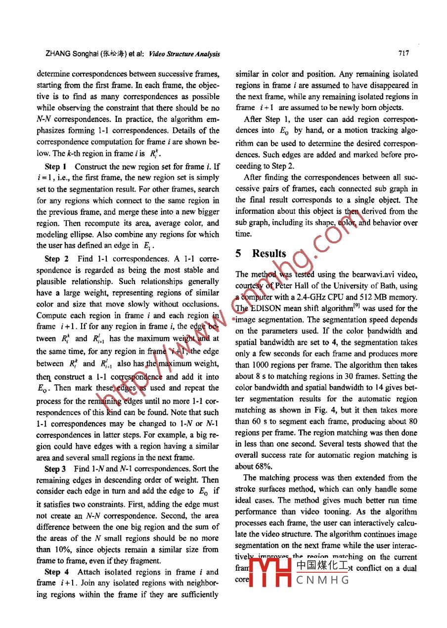 TSINGHUA SCIENCE AND TECHNOLOGYISSN 1007-0214 14/20 pp714-718Volume 12, Number 6, December 2007Video Structure Analysis*ZHANG Songhai (張松海)"”, ZHANG Yifei (張一飛), CHEN Tao (陳韜>,Peter M. Halr, Ralph Martin'1. Department of Computer Science and Technology, Tsinghua University, Beijing 100084, China;2. Department of Computer Science, University of Bath, Bath BA2 7AY, United Kingdom;3. School of Computer Science, Cardiff University, Wales CF24 3AA, United KingdomAbstract: Video structure analysis is a basic requrement for most content-based video editing and process-ing systems. This paper presents a fast video structure analysis method based on image segmentation ineach frame, with region matching between frames. The structure analysis decomposes the video into sev-eral moving objects, including information about their colors, positions, shapes, movements, and lifetimnes.The method also supports user interactions to improve the results. The result shows that this method is fastand stable and can complete video analyzing interactively.Key words: video structure analysis; video segmentation; image segmentation; region matchingpublications. For example, a video-tooning approach"'Introductionpays particular attention to providing coherent segmen-tation in the space-time space to re-render the video asVideo editing is widely used not only in professionala cartoon animation. A recent paper on motion layer-movie making, but also in many other areas such asbased object removal in videos'- also proposed a mo-home vidcos, educational videos, and marketing videos.tion-based video segmentation method as a preparatoryWith the popularization of video cameras, even morestep to object removal.potential applications are developing, Even relativelyIn many appications, this video analysis and seg-straightforward applications may wish to edit the videomentation step is the most time consuming step in the(for example, to remove an unwanted object from aapplication. For example, video tooning may take sev-scene) to process it in some other way (for example, toeral hours to segment a short video clip. This paperre-render it as a cartoon). In general, such tasks needpresents a fast video structure analysis method basedan understanding of the structure of the video content,on image segmentation in each frame, with regionas a basis both for editing and for more advanced andmatching between frames,complex video processing operations.The need to treat the whole video in a coherent1 Related Workmaner has been emphasized in several previousThe two main kinds of information in any video are theReceived: 2007-06-25color appearance and the visual motion, which leads to* Supported by the National Key Basic Research and Developmentthree approaches to video analysis. (1) The first is(973) Program of China (No. 2006CB303 106), the SpecializedResearch Fund for the Doctoral Program of Higher Education ofbased on motion tracking') as in the method used inMOE, P.R.C. No.20003057), and the Basic Ressearch Foun-中國煤化工moval4. Such ap-dation of Tsinghua National Laboratory for Information Scienceproac1 many highly tex-and Technology (TNList)tured:TYTHC N M H Gons, where trackers* * To whom corespondence should be adresse.:an readily follow moving objects and describe theirE-mail: zhangsh@gnail.com; Tel: 86 10-62797001-807ZHANG Songhai (張松海) et al: Video Structure Analysis715motion with a simple model. (2) Another approach isbodies and motions as in Fig. 1, whereas histogram-based on color and appearance. Such approaches arebased methods, i.e., color quantizaion, work wellmore suited to videos with relatively lttle texture andfor videos containing non-igid motion, for examplesimple scenes. They can, to a certain extent, cope withmoving liquids, fire, and clouds as shown in Fig. 2.various changes in objects, including deformation,splitting, and color changes. Such approaches can befurther subdivided into space-time segmentation, suchas performed by the anisotropic kermnel mean shift algo-rithm'", and segmentation in each frame separately fo]-lowed by matching regions between frames, as in thestroke surfaces approach!. Space-time segmentationFig, 1 Mean shift segmentationhas the advantage that it identifies the entire object byobservations throughout the video, which can, for ex-ample, help solve issues of occlusion, but such ap-proaches generally have long-run times and can besensitive to the speed of the object's motion and tovariations in the object shape, color, and lighting, sincethis is a global approach. The stroke surfaces method isfaster and can generally cope quite well with objectsFig.2 Histogram-based segmentationwhose appearance changes, but its object matchingability needs to improve. The method described hereEven when using the most suitable algorithm for afollows a similar scheme of image segmentation ingiven video, the segmentation result for each frameeach frame, with region matching between frames. Themay typically have hundreds of regions, which is still agreedy algorithm quickly matches regions betweenvery complex representation. A higher level resultframes quickly, and combines motion tracking andneeds to merge these regions in an appropriate way andsimple user interaction to improve the results. (3) The .to find associations between regions in adjacent framesthird approach is based on both color and motion in-of the video. Regions belonging to the same object areformation. Such approaches often introduce a statis-connected to derive a three-dimensional object intics-based model16-8J and use an expectation maximumspace-time. A given region may, for example, occluded(EM) algorithm to solve the optimization problem.by some other object in any given frame, in which caseSuch approaches lose the efficiency and the conven-the region is split in that frame with the space-timeience for user interaction, and are not suitable to fastrepresentation branching at that frame. Conversely,video struc
