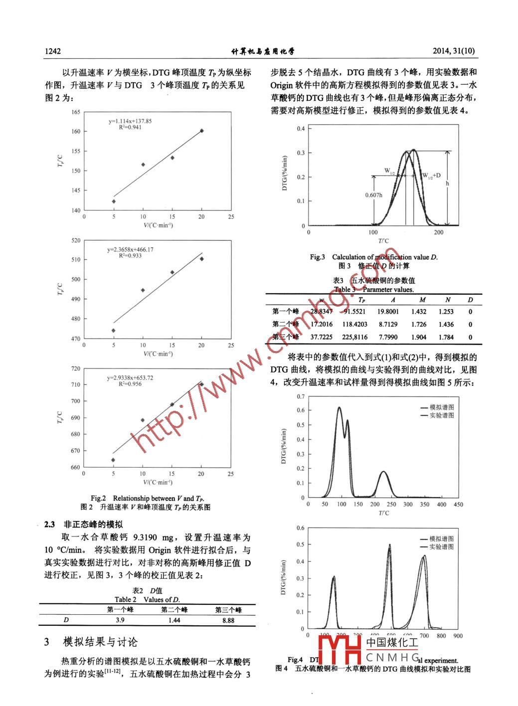 第31卷第10針?biāo)銠C(jī)用化嚳Vol31. No 102014年10月28日Computers and Applied ChemistryOctober 28. 2014熱重分析虛擬實驗室的模擬算法研究張永策,崔桃,劉志廣,陳珂君,曲曉琳(大連理工大學(xué)化工學(xué)院,遼寧,大連,116024)摘要:基于熱重分析原理,以五水硫酸銅及水合草酸鈣的熱重分析實驗數(shù)據(jù)為參考,建立了熱重分析虛擬實驗室中程序模型,實現(xiàn)了試樣量、升溫速率等參數(shù)條件下的熱重曲線模擬。通過 zlimsX虛擬實驗平臺提供的參數(shù)接口,擴(kuò)展分析樣品參數(shù)數(shù)據(jù)庫實現(xiàn)了虛擬實驗的開放以及擴(kuò)展功能,這樣以來可以將科研實驗快速的轉(zhuǎn)化為虛擬實驗,實驗教學(xué)可以做到“常做常新”,充分的體現(xiàn)了虛擬實驗室的巨大優(yōu)勢和潛力。關(guān)鍵詞:虛擬實驗室;TGA:模擬中圖分類號:TQ0159;TP391906-3文獻(xiàn)標(biāo)識碼:A文章編號:1001-41602014)10-1240-1244DOI: 10. 11719/com. app. chem201410211引言2程序模型的構(gòu)建2013年諾貝爾化學(xué)獎評選委員會在聲明中說“現(xiàn)熱分析過程往往伴隨非常復(fù)雜的物理化學(xué)變化,要在,對化學(xué)家來說,計算機(jī)是同試管一樣重要的工具”,明確其中的所有機(jī)理并進(jìn)行動力學(xué)和熱力學(xué)的計算是非化學(xué)模擬實驗的“真實性”得到了進(jìn)一步的肯定?;瘜W(xué)常困難的。當(dāng)我們觀察五水硫酸銅的TG(試樣的質(zhì)量W虛擬實驗室不是計算化學(xué)軟件,虛擬環(huán)境下的操作體驗對溫度T)曲線和DTG(TG對時間的一階導(dǎo)數(shù))曲線,和實時的化學(xué)信息反饋更多的要放到系統(tǒng)設(shè)計的首位,我們會發(fā)現(xiàn)后者與色譜曲線有許多相似之處。TGA與色然而其“化學(xué)”實質(zhì)又決定了模擬“真實”的復(fù)雜性和譜的工作原理完全不相關(guān),那么DTG與色譜曲線的相似重要性。我們知道“真實”的計算是非?!鞍嘿F”的,性是否偶然。從唯象的系統(tǒng)來分析,如果將分析樣品作瞬間完成的化學(xué)反應(yīng)需要巨大的機(jī)時和資源,此時虛為整體來看,TGA是通過加熱來分解,色譜是通過色譜擬世界中的“停滯”是難以容忍的,況且這還是在“機(jī)柱來分離,分解或分離都是將樣品拆分成若干部分,每理”清楚的情況下才能夠進(jìn)行的。因此,目前所謂的化部分還都比較接近正態(tài)分布。進(jìn)一步分析深層機(jī)理,學(xué)虛擬實驗室中絕大多數(shù)照搬實驗數(shù)據(jù),少量的能夠基我們知道色譜分離是因為同一組分兩相分配系數(shù)相同或于唯象‘模擬,完全的理論計算模擬并沒有應(yīng)用到虛擬接近于概率分布的相近,熱分析中特定基團(tuán)其分解所需實驗室中能量或者說鍵能是固定的,兩者都需要動態(tài)平衡的前提熱重分析( Thermogravimetry Analysis,縮寫為TGA)條件。是在程序控制溫度下測量物質(zhì)質(zhì)量與溫度關(guān)系的一種熱我們知道只有在優(yōu)化條件下,色譜曲線才能達(dá)到比分析方法,應(yīng)用非常廣泛,尤其是在材料表征中5。虛擬較好的分離度,同樣不是所有的熱分解過程都可以有熱重分析實驗室應(yīng)用價值不言而喻,其中的模擬程序同“完美”的DTG峰,一步一個臺階的過程似乎更容易描樣具有理論探索的價值。升溫速率、試樣的量等對于熱述和進(jìn)一步的模擬。許多教學(xué)實驗之所以經(jīng)典就在于其重曲線的影響方面的相關(guān)文獻(xiàn)很多,但并無系統(tǒng)性的理可重復(fù)性以及近似條件下的“完美”,這已經(jīng)為相應(yīng)的虛論模型提出。本文重點在于通過實驗總結(jié)一定的規(guī)律,擬實驗鋪平了快捷的道路。五水硫酸銅和水合草酸鈣都建立模型程序和相應(yīng)的參數(shù)數(shù)據(jù)庫,通過虛擬實驗平臺是比較經(jīng)典的熱重分析實例(圖1為五水硫酸銅的熱重曲拓展可分析的樣品庫以完善系統(tǒng)性上的欠缺。本系統(tǒng)從線),其DTG峰分的非常開,鮮明的TGA臺階說明每嚴(yán)格意義上更近于唯象模擬,唯象本身就是“實驗到理階段都沒有交叉或夾雜其他反應(yīng)。我們完全可以假設(shè)類論的橋梁”,只是缺乏一定的系統(tǒng)性,而這種模擬在保證似這樣的熱重過程可以等同于色譜分離過程,色譜的前“及時”前提下同樣可以達(dá)到“真實”的效果,這也是提是不分解,即每個組分的量都是恒定的,其峰面積不目前虛擬實驗67中模擬算法的最佳實現(xiàn)途徑變,當(dāng)然許多色譜條件下會發(fā)生重疊。那么我們對于熱重的要求是分其田不眾壯二步分解或者與中國煤化工收稿日期:201404-24;修回日期:201406-16CNMHG作者簡介:崔桃(986),女,河北人,碩土研究生,Emai:1aozi6329@163com聯(lián)系人:劉志廣(1956-),男,河南人,碩士,教投,碩士生導(dǎo)師,E-mail:analab@dlut.edu.com2014,31(10)張永策,等:熱重分析虛擬實驗室的模擬算法研究1241結(jié)合氣氛原子,這樣的系統(tǒng)模型可以完全參考色譜虛擬多數(shù)峰形都是非正態(tài)分布,因此需要對模型進(jìn)行修正,室中的模型算法。作為唯象系統(tǒng),熱重實驗中的可控條式(3)中D表示非正態(tài)峰的修正值件比較少只有氣氛、試樣量和升溫速率,那么這些條件氣相色譜中t會受到如載氣流速、柱溫等因素的影都有哪些影響,隨后我們將逐步展開討論響。塔板理論就是近似的熱力學(xué)平衡理論,速率理論就是動力學(xué)的作用,