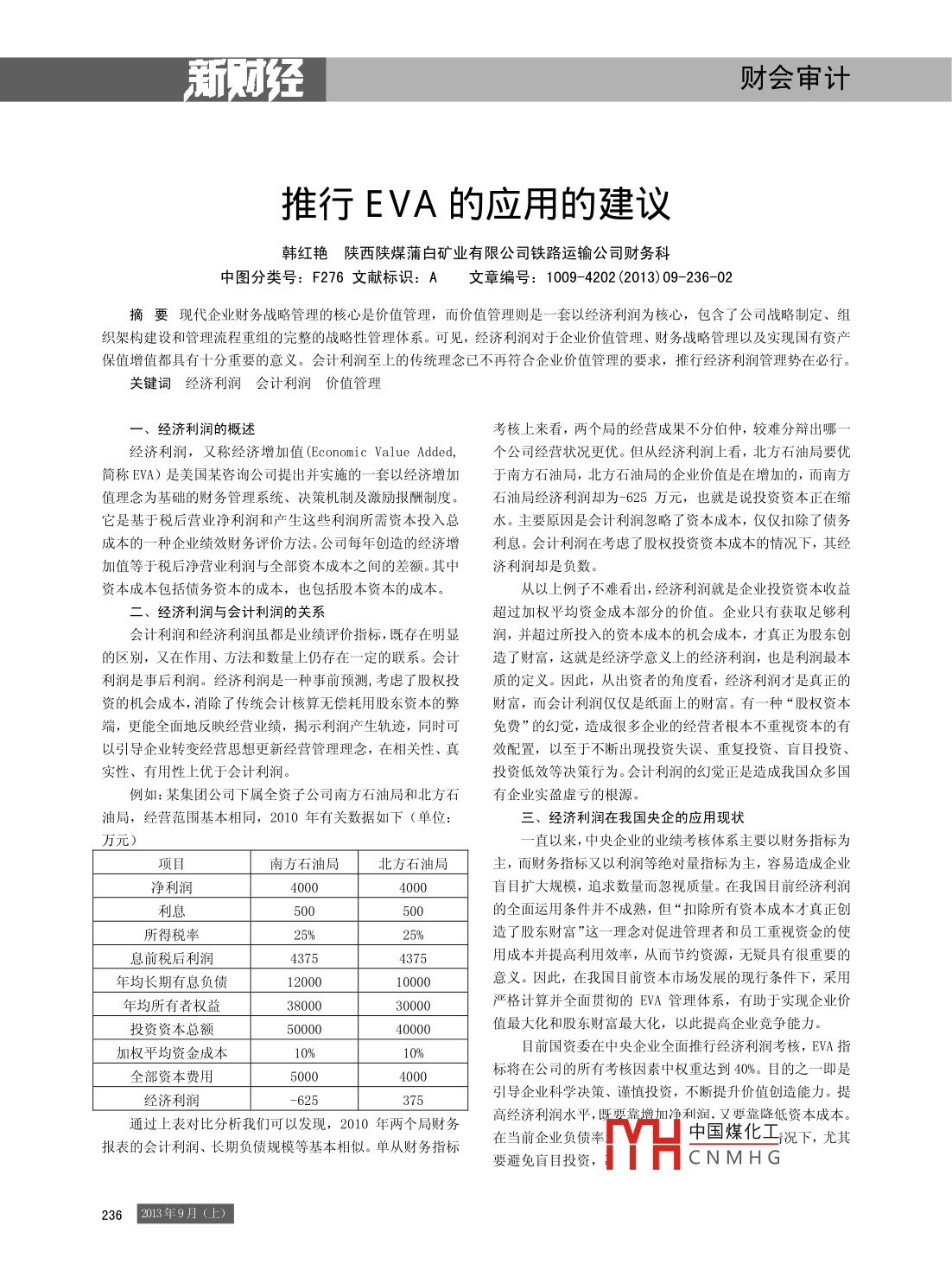 新斯財(cái)會(huì)審計(jì)推行EVA的應(yīng)用的建議韓紅艷陜西陜煤蒲白礦業(yè)有限公司鐵路運(yùn)輸公司財(cái)務(wù)科中圖分類號(hào):F276文獻(xiàn)標(biāo)識(shí):A文章編號(hào):1009-4202(2013)09-236-02摘要現(xiàn)代企業(yè)財(cái)務(wù)戰(zhàn)略管理的核心是價(jià)值管理,而價(jià)值管理則是一套以經(jīng)濟(jì)利潤為核心,包含了公司戰(zhàn)略制定、組織架構(gòu)建設(shè)和管理流程重組的完整的戰(zhàn)略性管理體系??梢?經(jīng)濟(jì)利潤對(duì)于全業(yè)價(jià)值管理、財(cái)務(wù)戰(zhàn)略管理以及實(shí)現(xiàn)國有資產(chǎn)保值增值都具有十分重要的意義。會(huì)計(jì)利潤至上的傳統(tǒng)理念已不再符合企業(yè)價(jià)值管理的要求,推行經(jīng)濟(jì)利潤管理勢(shì)在必行。關(guān)鍵詞經(jīng)濟(jì)利潤會(huì)計(jì)利潤價(jià)值管理經(jīng)濟(jì)利潤的概述考核上來看,兩個(gè)局的經(jīng)營成果不分伯仲,較難分辯出哪經(jīng)濟(jì)利潤,又稱經(jīng)濟(jì)增加值( Economic Value Added,個(gè)公司經(jīng)營狀況更優(yōu)。但從經(jīng)濟(jì)利潤上看,北方石油局要優(yōu)簡稱EVA)是美國某咨詢公司提出并實(shí)施的一套以經(jīng)濟(jì)增加于南方石油局,北方石油局的企業(yè)價(jià)值是在增加的,而南方值理念為基礎(chǔ)的財(cái)務(wù)管理系統(tǒng)、決策機(jī)制及激勵(lì)報(bào)酬制度石油局經(jīng)濟(jì)利潤卻為-625萬元,也就是說投資資本正在縮它是基于稅后營業(yè)凈利潤和產(chǎn)生這些利潤所需資本投入總水。主要原因是會(huì)計(jì)利潤忽略了資本成本,僅僅扣除了債務(wù)成本的一種企業(yè)績效財(cái)務(wù)評(píng)價(jià)方法。公司每年創(chuàng)造的經(jīng)濟(jì)增利息。會(huì)計(jì)利潤在考慮了股權(quán)投資資本成本的情況下,其經(jīng)加值等于稅后凈營業(yè)利潤與全部資本成本之間的差額。其中濟(jì)利潤卻是負(fù)數(shù)。資本成本包括債務(wù)資本的成本,也包括股本資本的成本從以上例子不難看出,經(jīng)濟(jì)利潤就是企業(yè)投資資本收益二、經(jīng)濟(jì)利潤與會(huì)計(jì)利潤的關(guān)系超過加權(quán)平均資金成本部分的價(jià)值。企業(yè)只有獲取足夠利會(huì)計(jì)利潤和經(jīng)濟(jì)利潤雖都是業(yè)績?cè)u(píng)價(jià)指標(biāo),既存在明顯潤,并超過所投入的資本成本的機(jī)會(huì)成本,才真正為股東創(chuàng)的區(qū)別,又在作用、方法和數(shù)量上仍存在一定的聯(lián)系。會(huì)計(jì)造了財(cái)富,這就是經(jīng)濟(jì)學(xué)意義上的經(jīng)濟(jì)利潤,也是利潤最本利潤是事后利潤。經(jīng)濟(jì)利潤是一種事前預(yù)測(cè),考慮了股權(quán)投質(zhì)的定義。因此,從出資者的角度看,經(jīng)濟(jì)利潤才是真正的資的機(jī)會(huì)成本,消除了傳統(tǒng)會(huì)計(jì)核算無償耗用股東資本的弊財(cái)富,而會(huì)計(jì)利潤僅僅是紙面上的財(cái)富。有一種“股權(quán)資本端,更能全面地反映經(jīng)營業(yè)績,揭示利潤產(chǎn)生軌跡,同時(shí)可免費(fèi)”的幻覺,造成很多企業(yè)的經(jīng)營者根本不重視資本的有以引導(dǎo)企業(yè)轉(zhuǎn)變經(jīng)營思想更新經(jīng)營管理理念,在相關(guān)性、真效配置,以至于不斷岀現(xiàn)投資失誤、重復(fù)投資、盲目投資實(shí)性、有用性上優(yōu)于會(huì)計(jì)利潤投資低效等決策行為。會(huì)計(jì)利潤的幻覺正是造成我國眾多國例如:某集團(tuán)公司下屬全資子公司南方石油局和北方石有企業(yè)實(shí)盈虛虧的根源油局,經(jīng)營范圍基本相同,2010年有關(guān)數(shù)據(jù)如下(單位:三、經(jīng)濟(jì)利潤在我國央企的應(yīng)用現(xiàn)狀直以來,中央企業(yè)的業(yè)績考核體系主要以財(cái)務(wù)指標(biāo)為項(xiàng)目南方石油局北方石油局主,而財(cái)務(wù)指標(biāo)又以利潤等絕對(duì)量指標(biāo)為主,容易造成企業(yè)凈利潤40004000盲目擴(kuò)大規(guī)模,追求數(shù)量而忽視質(zhì)量。在我國目前經(jīng)濟(jì)利潤利息的全面運(yùn)用條件并不成熟,但“扣除所有資本成本才真正創(chuàng)所得稅率造了股東財(cái)富”這一理念對(duì)促進(jìn)管理者和員工重視資金的使息前稅后利潤43754375用成本并提高利用效率,從而節(jié)約資源,無疑具有很重要的「年均長期有息負(fù)債10000意義。因此,在我國目前資本市場(chǎng)發(fā)展的現(xiàn)行條件下,采用年均所有者權(quán)益8000嚴(yán)格計(jì)算并全面貫徹的EVA管理體系,有助于實(shí)現(xiàn)企業(yè)價(jià)「投資資本總額5000040000值最大化和股東財(cái)富最大化,以此提高企業(yè)競(jìng)爭能力加權(quán)平均資金成本目前國資委在中央企業(yè)全面推行經(jīng)濟(jì)利潤考核,EVA指全部資本費(fèi)用500006將在公司的所有考核因素中權(quán)重達(dá)到40%,日的之一即是引導(dǎo)企業(yè)科學(xué)決策、謹(jǐn)慎投資,不斷提升價(jià)值創(chuàng)造能力。提通過上表對(duì)比分析我們可以發(fā)現(xiàn),2010年兩個(gè)局財(cái)務(wù)高經(jīng)濟(jì)利潤水平利潤,又要靠降低資本成本報(bào)表的會(huì)計(jì)利潤、長期負(fù)債規(guī)模等基本相似。單從財(cái)務(wù)指標(biāo)在當(dāng)前企業(yè)負(fù)債率中國煤化工況下,尤其要避免盲目投